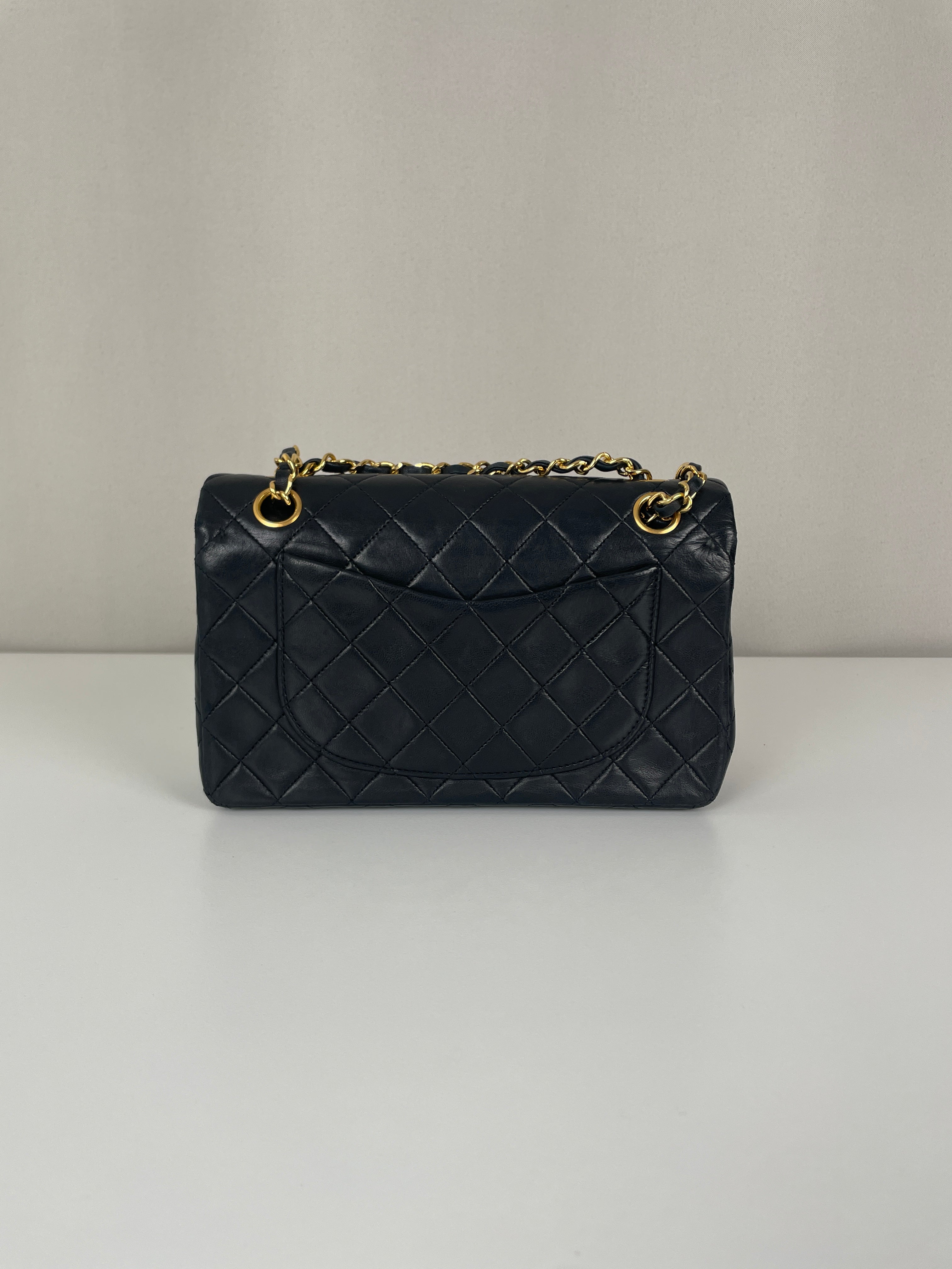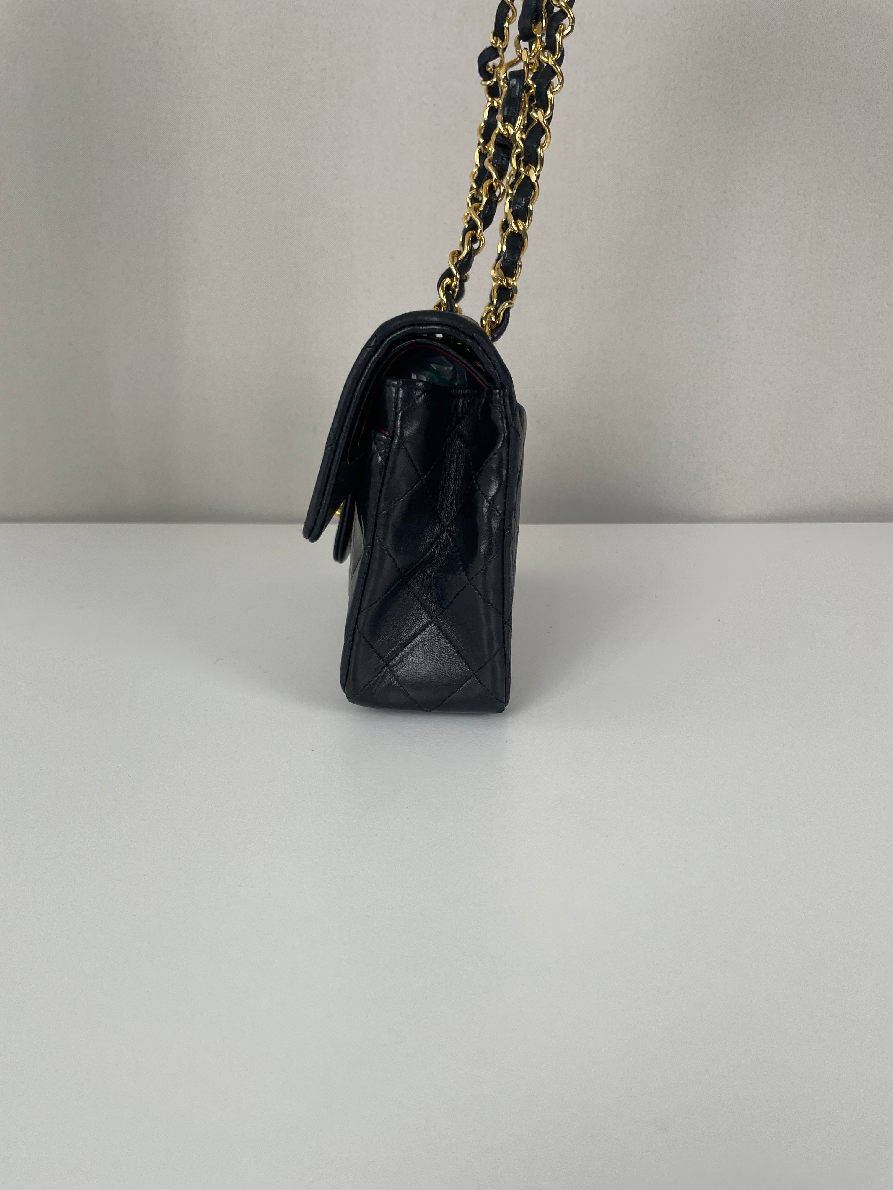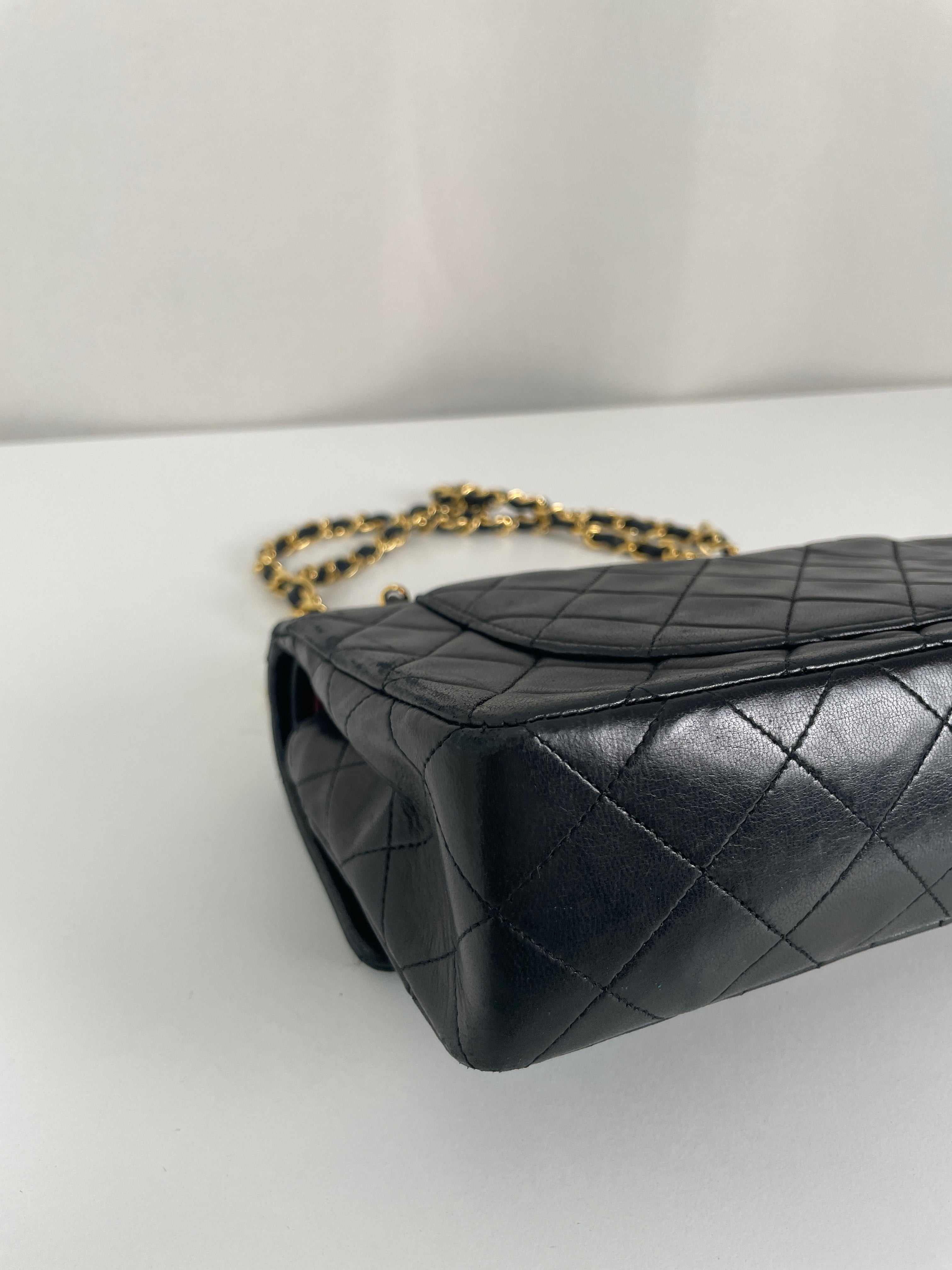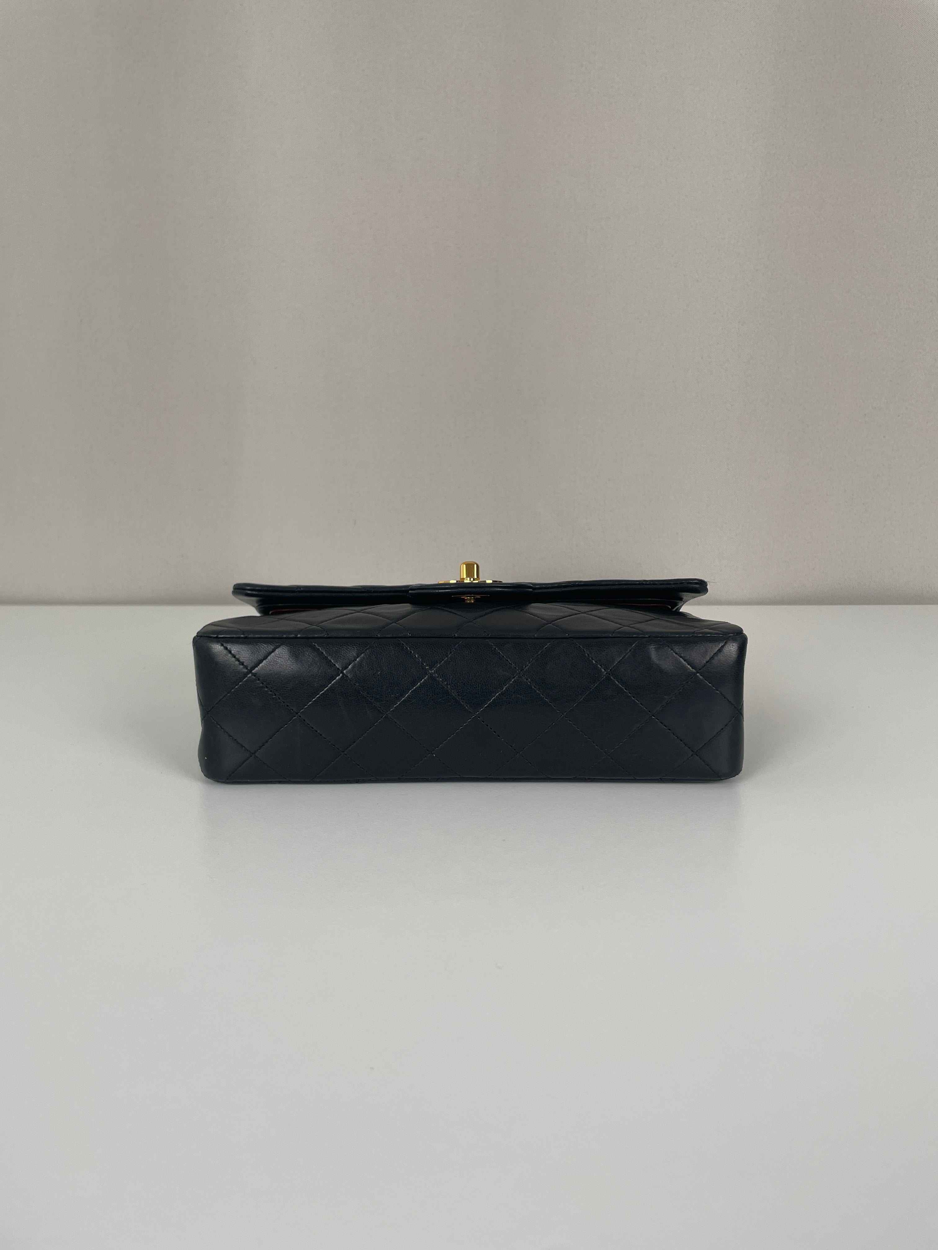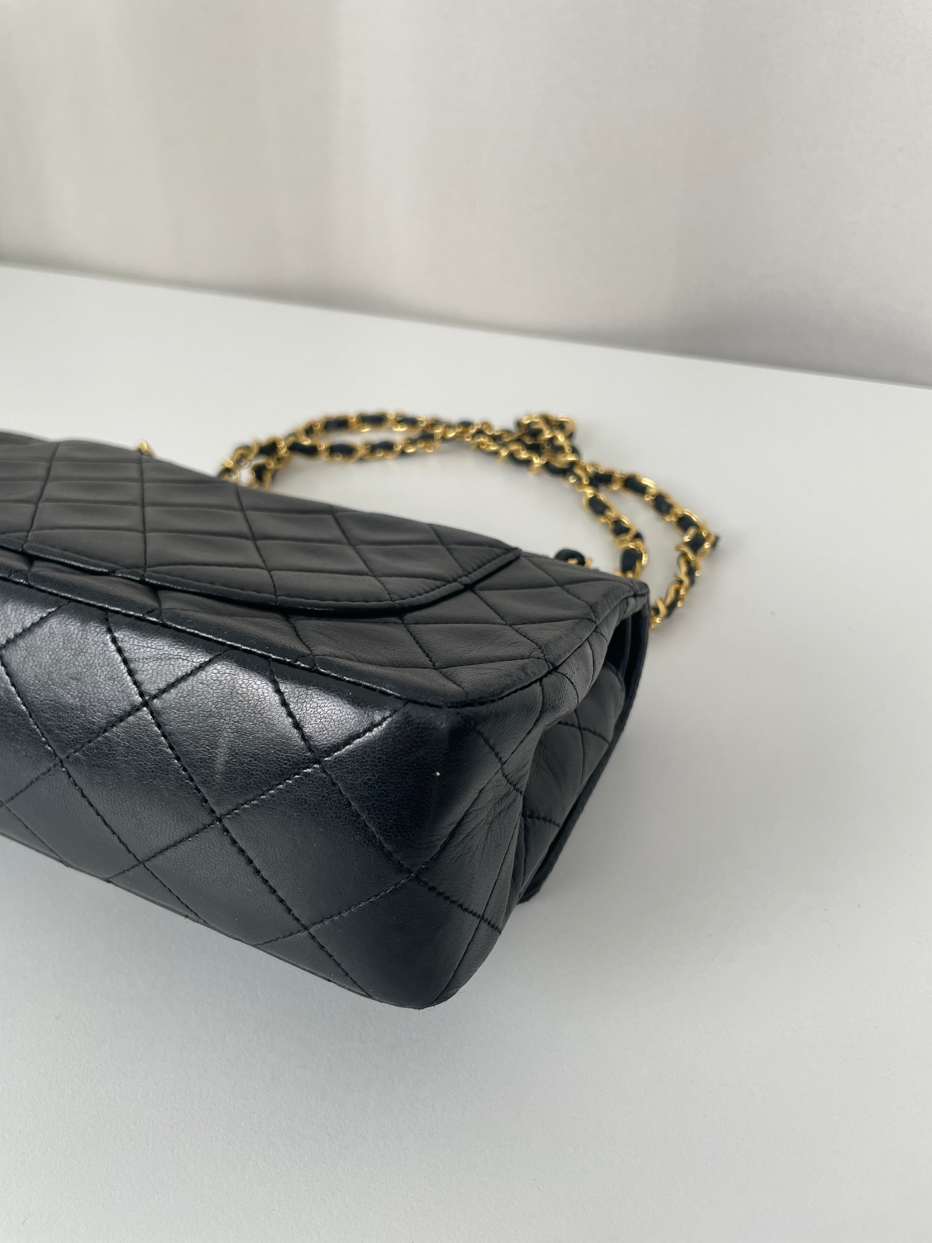 This Chanel Timeless Small from the late '80s to early '90s is a true vintage classic. Crafted in smooth black leather with gold-tone hardware, it features the iconic CC turn-lock and leather-woven chain. Its compact silhouette makes it perfect for both day and evening. The structure remains solid and the vintage charm is unmistakable, a collector’s piece that holds its value. A beautiful bag to have in the collection.