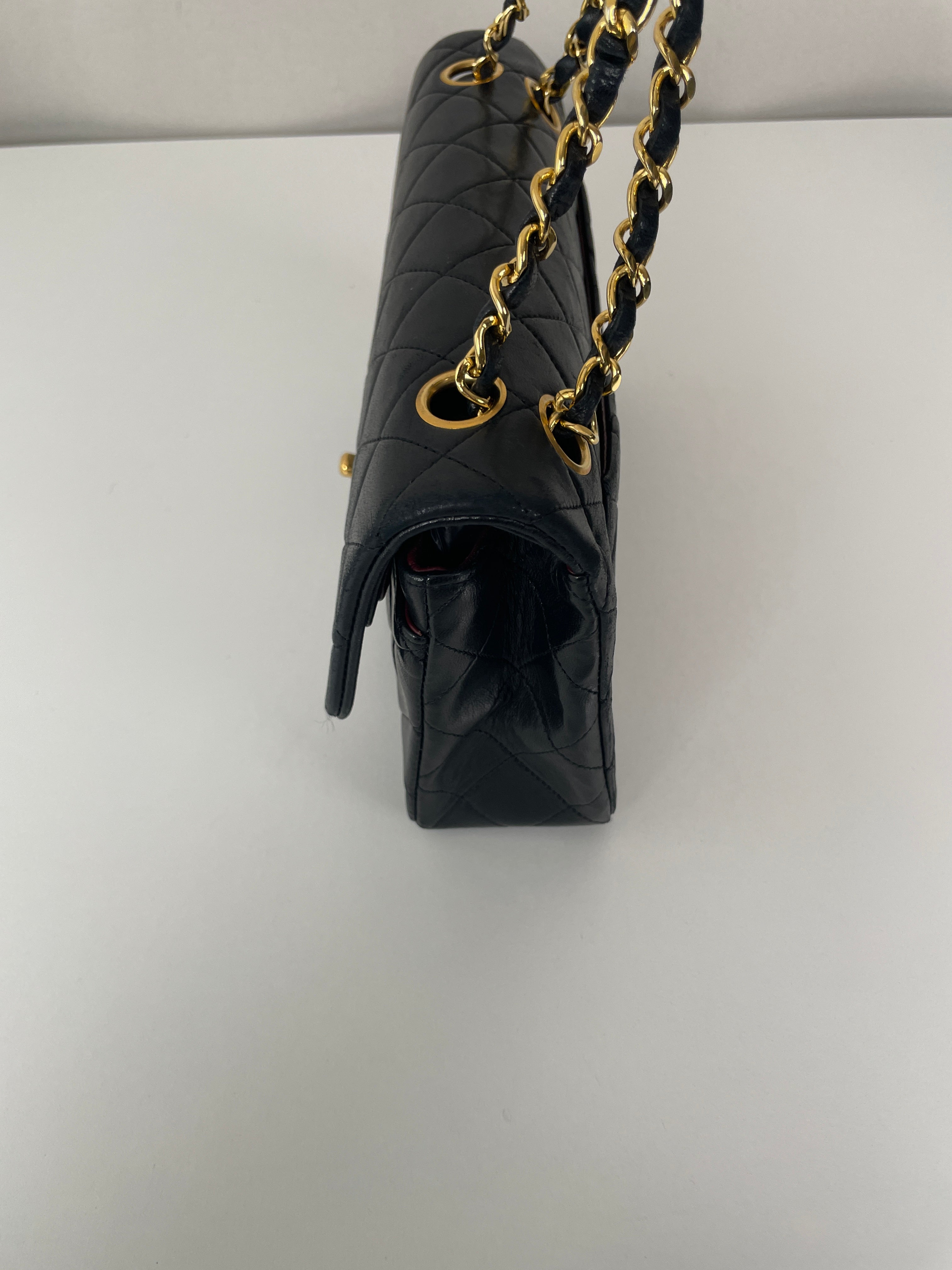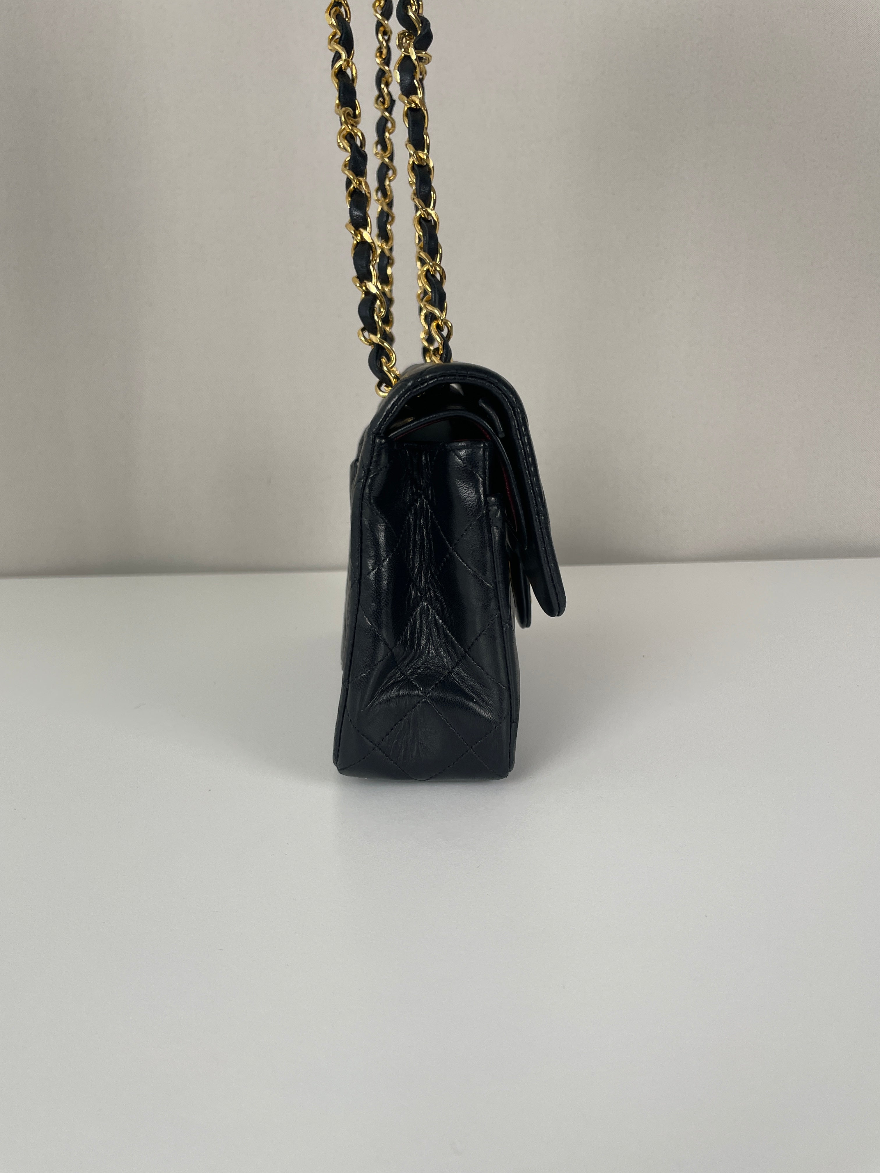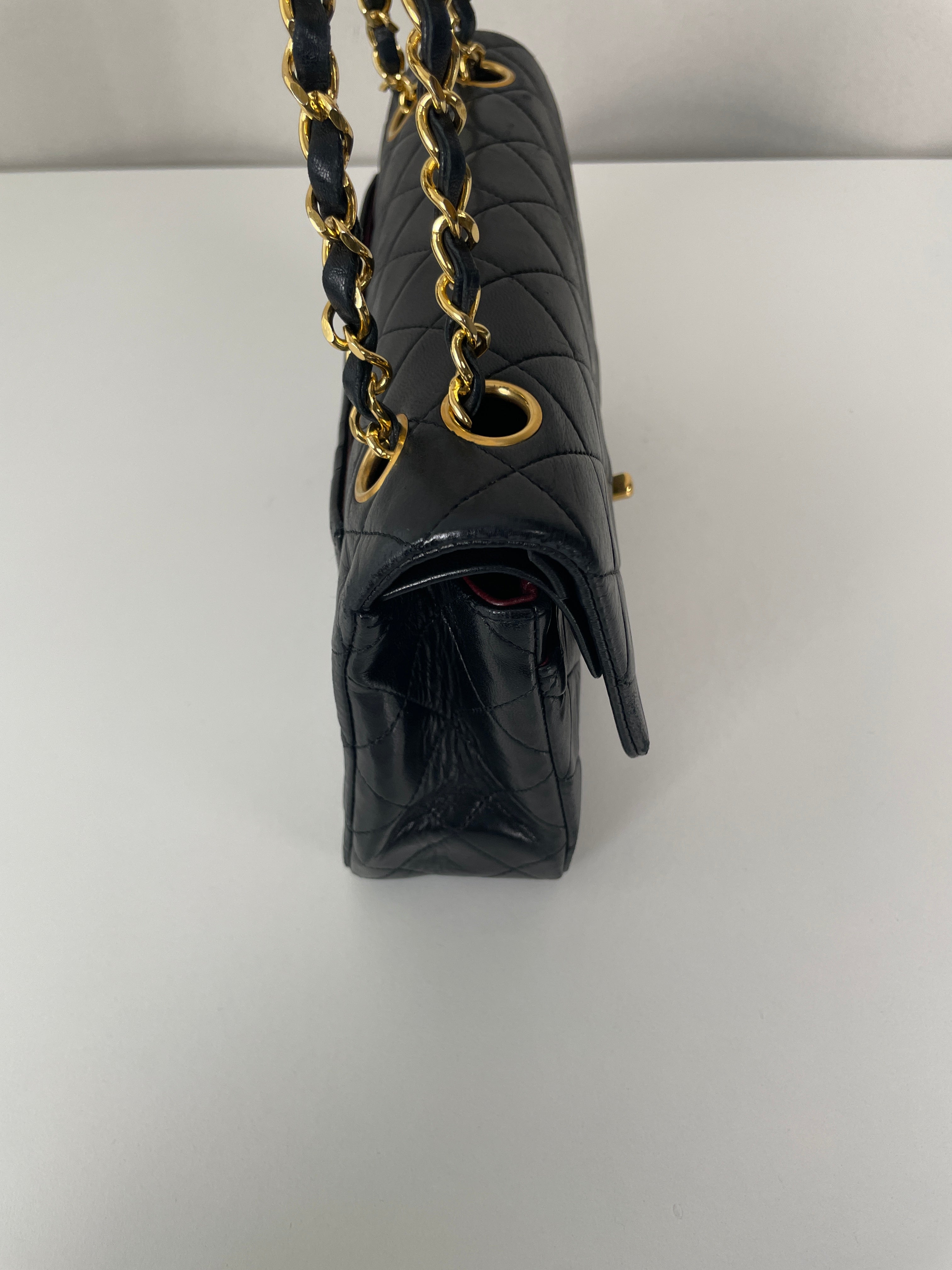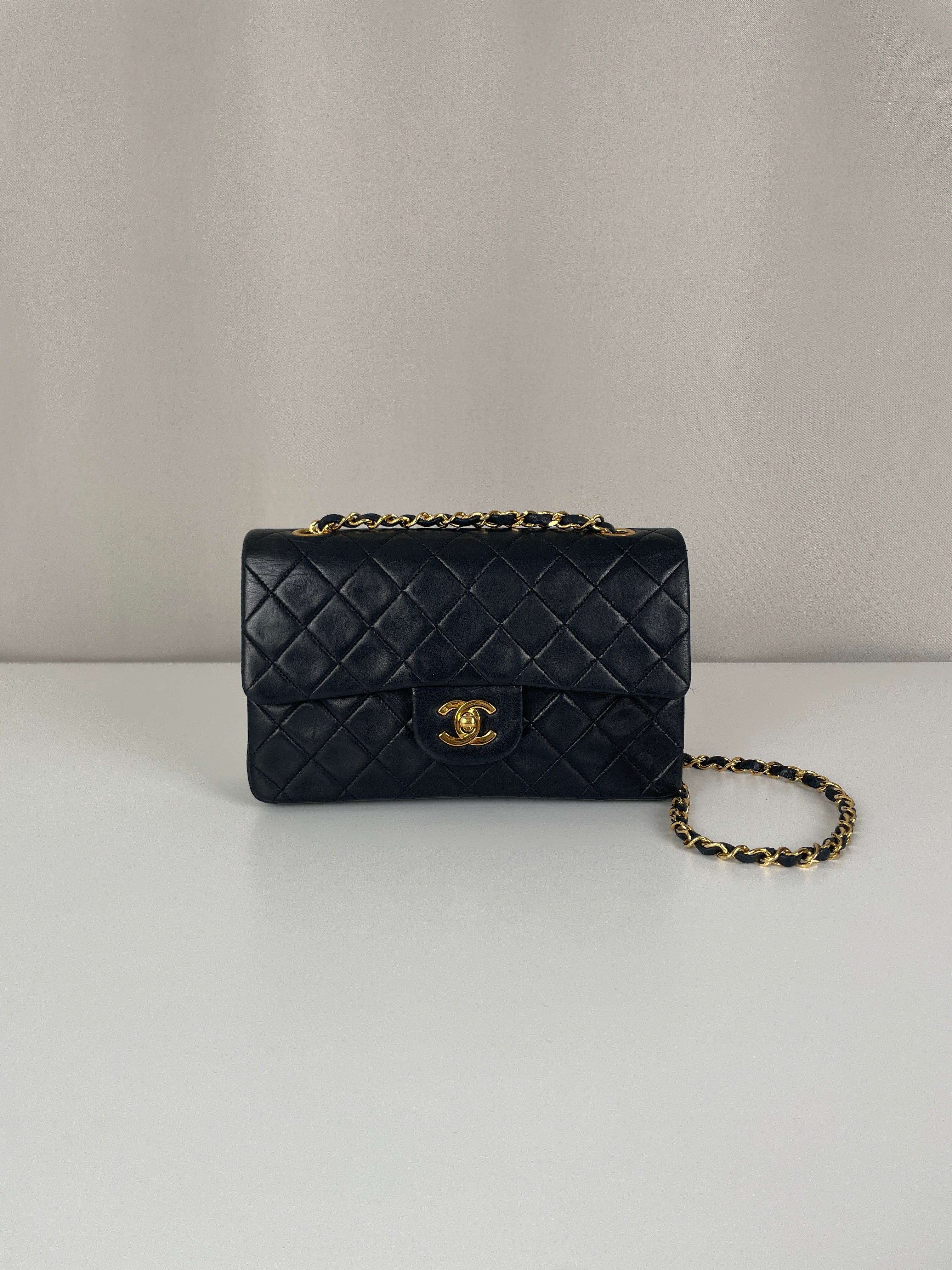 This Chanel Timeless Small from the late '80s to early '90s is a true vintage classic. Crafted in smooth black leather with gold-tone hardware, it features the iconic CC turn-lock and leather-woven chain. Its compact silhouette makes it perfect for both day and evening. The structure remains solid and the vintage charm is unmistakable, a collector’s piece that holds its value. A beautiful bag to have in the collection.