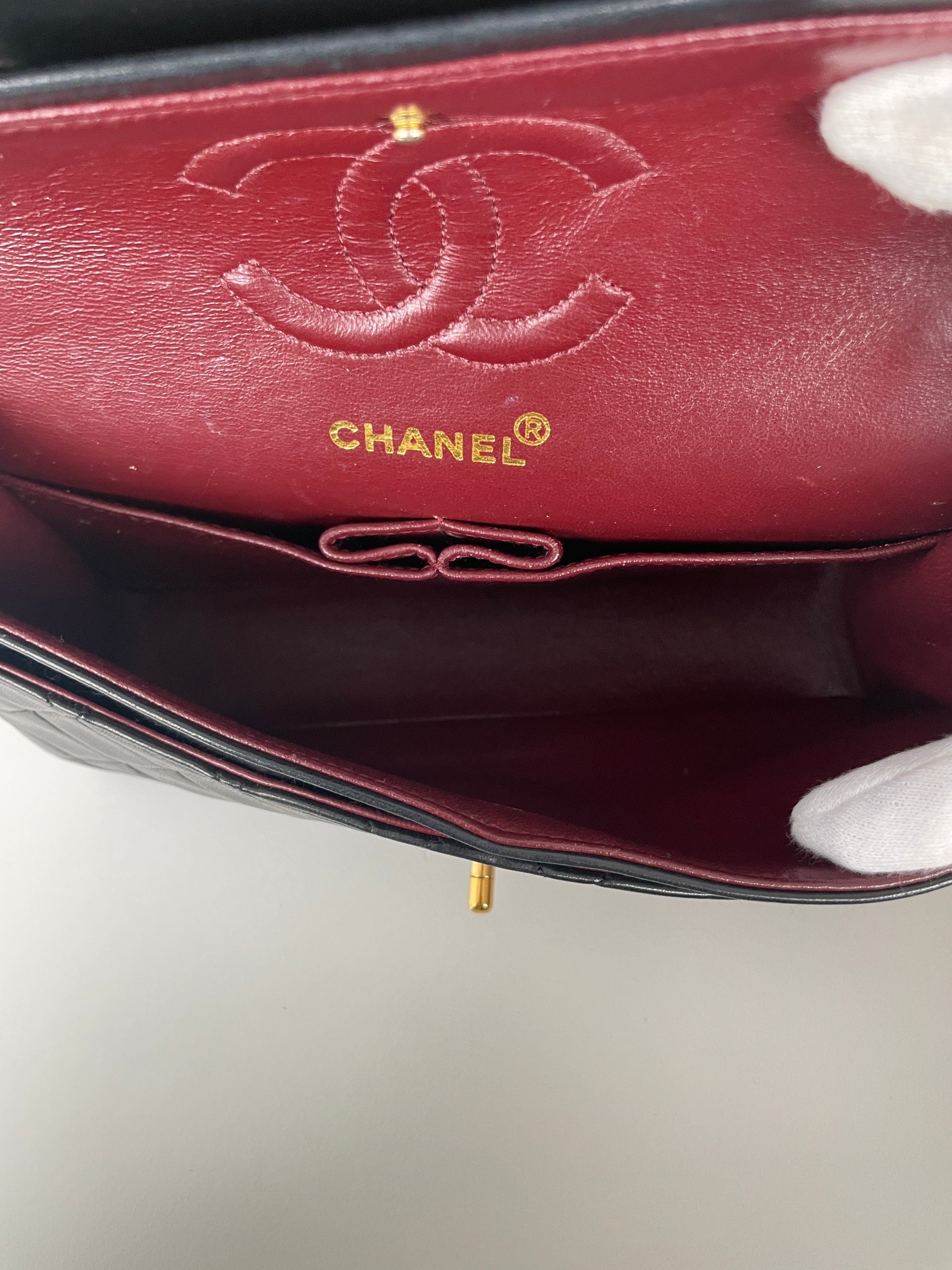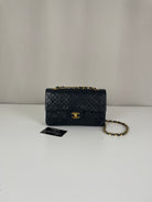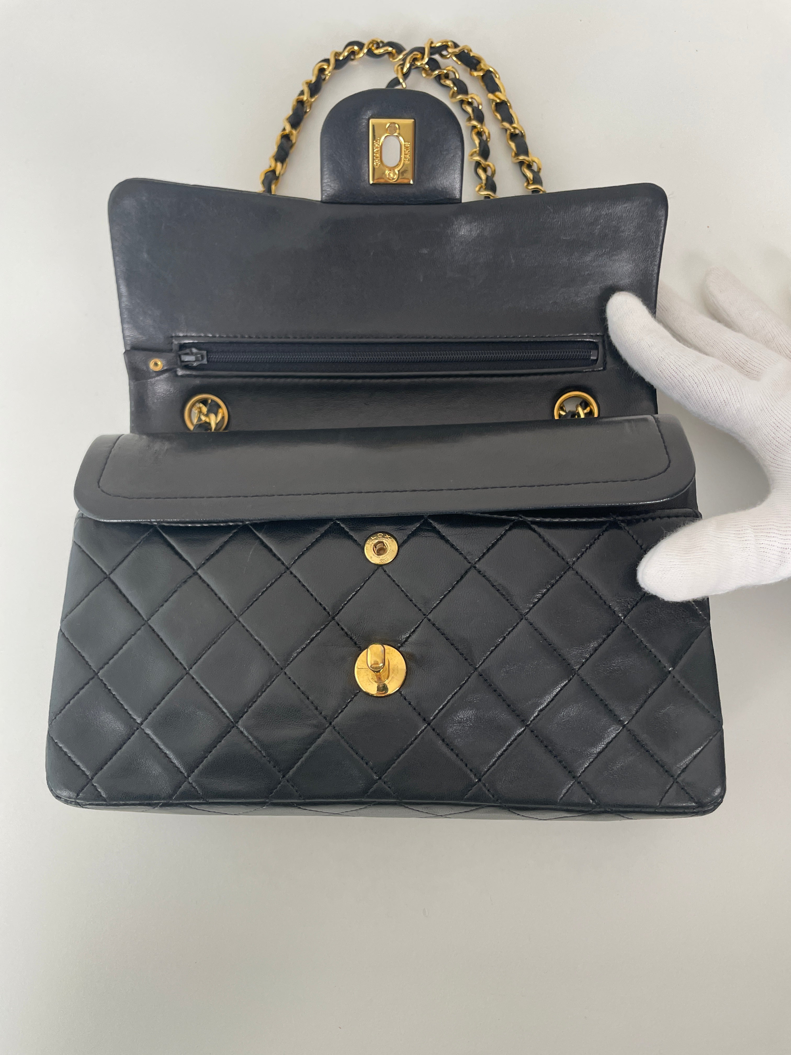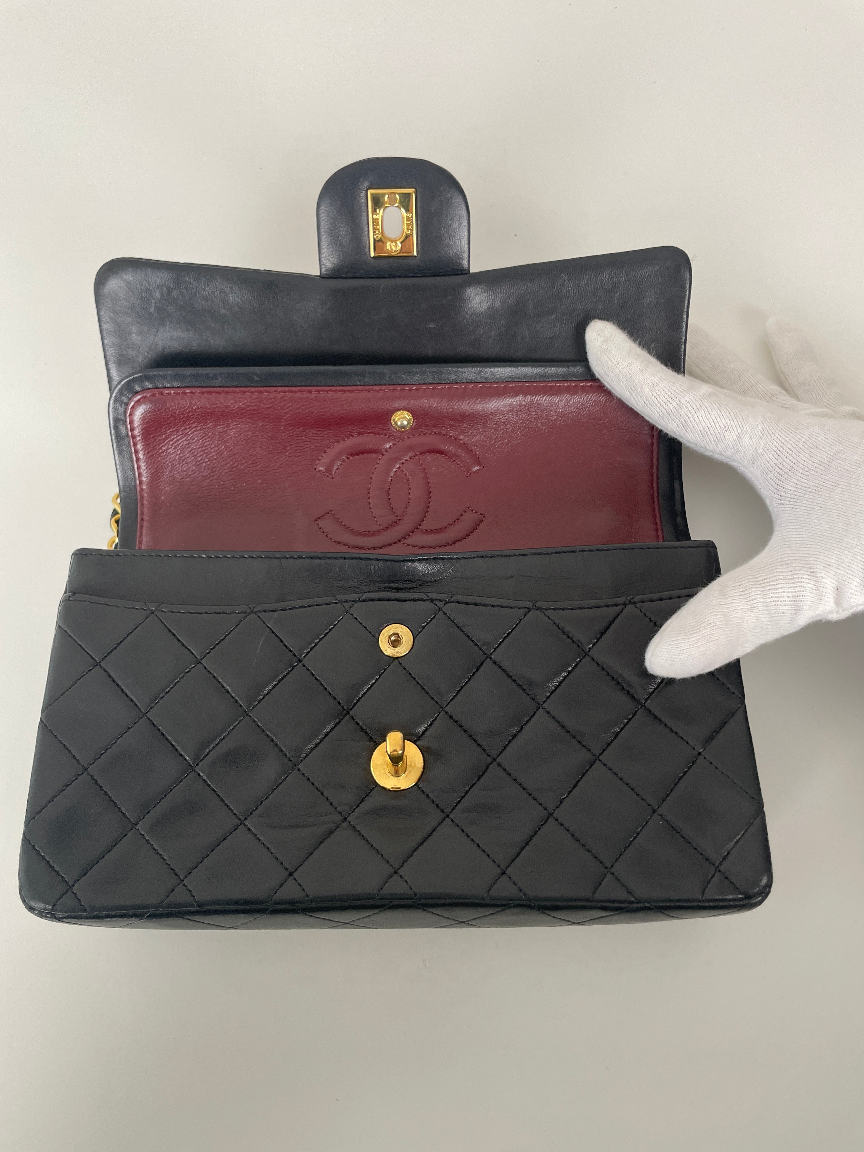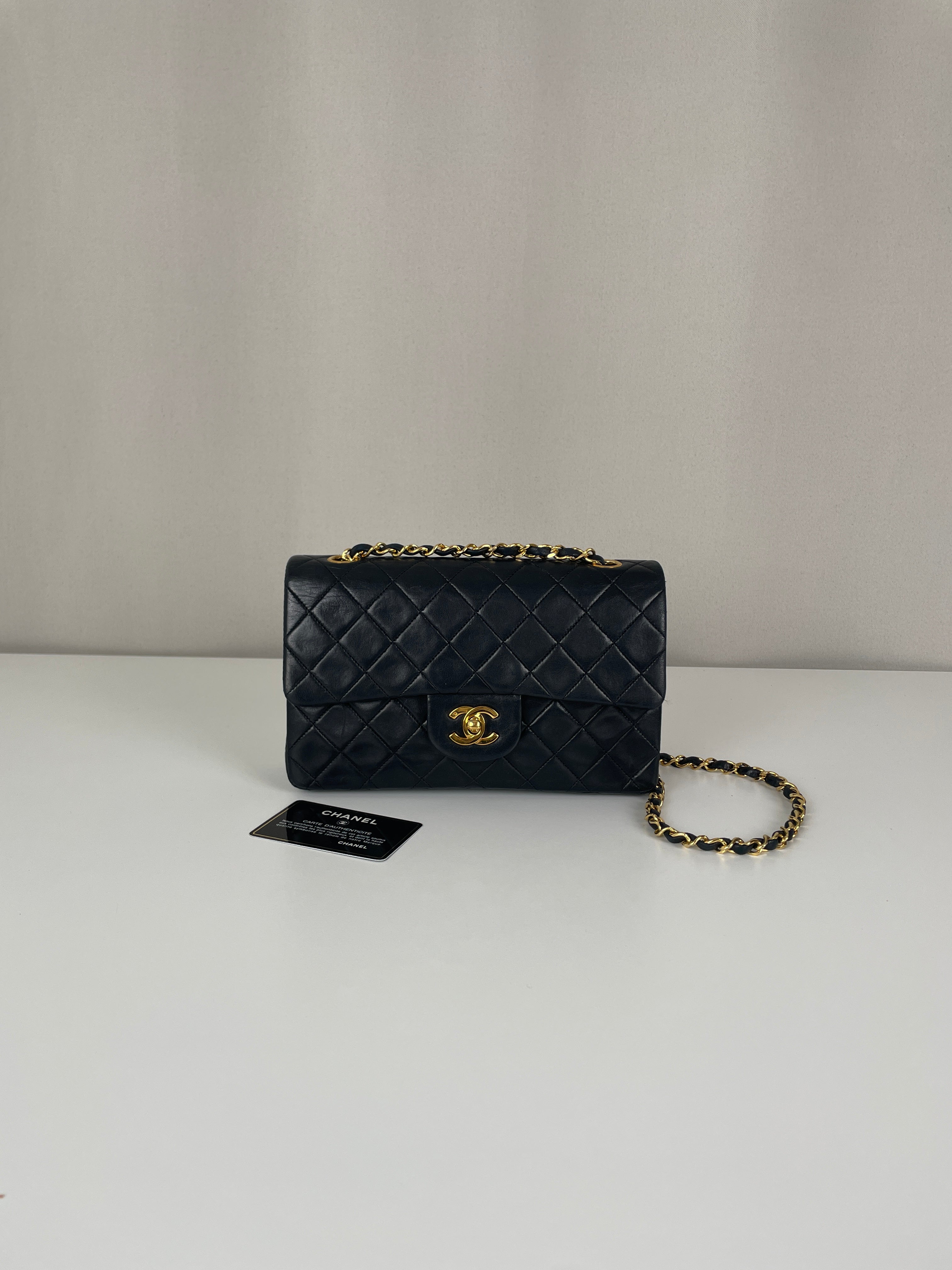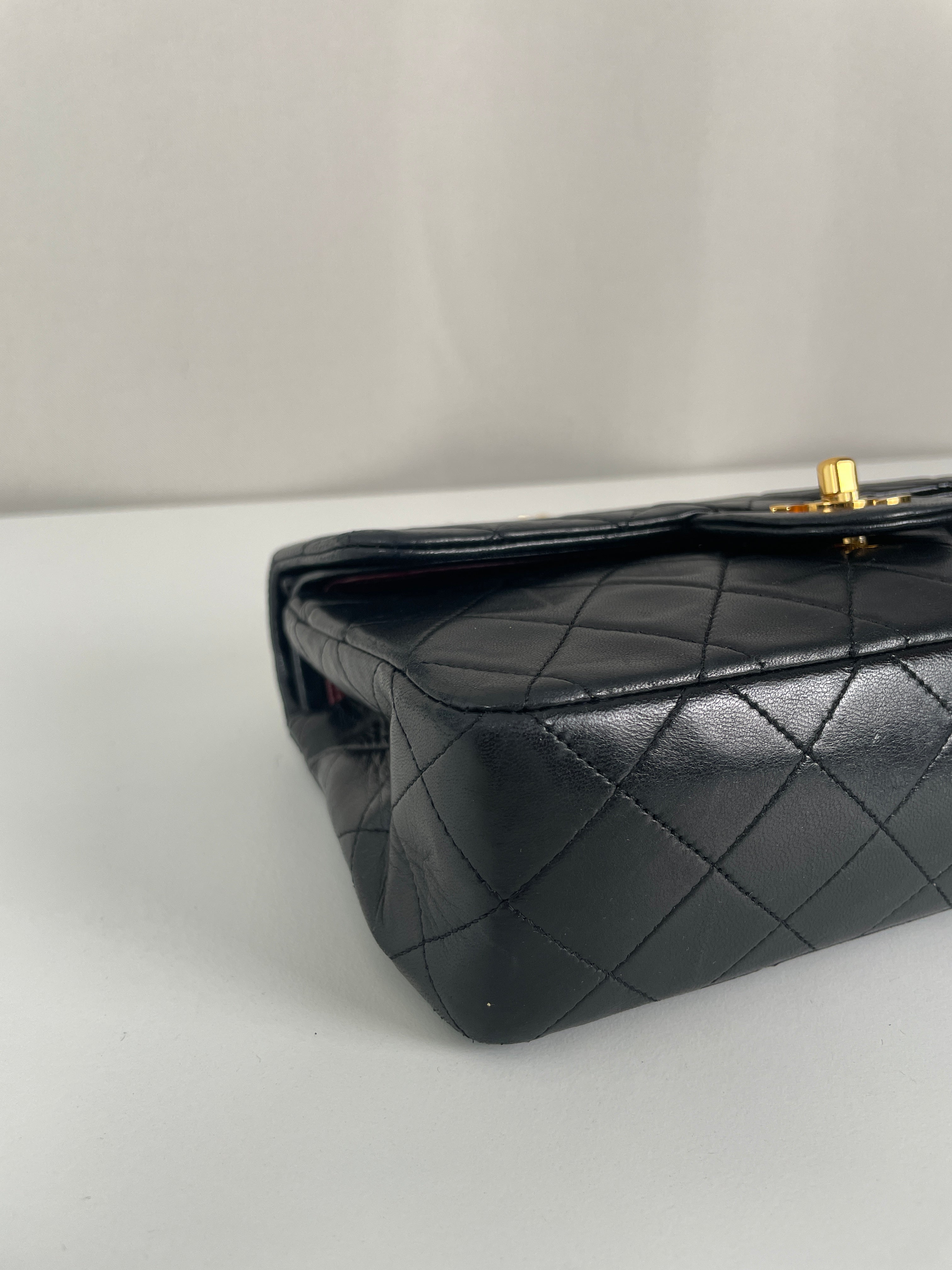 This Chanel Timeless Small from the late '80s to early '90s is a true vintage classic. Crafted in smooth black leather with gold-tone hardware, it features the iconic CC turn-lock and leather-woven chain. Its compact silhouette makes it perfect for both day and evening. The structure remains solid and the vintage charm is unmistakable, a collector’s piece that holds its value. A beautiful bag to have in the collection.