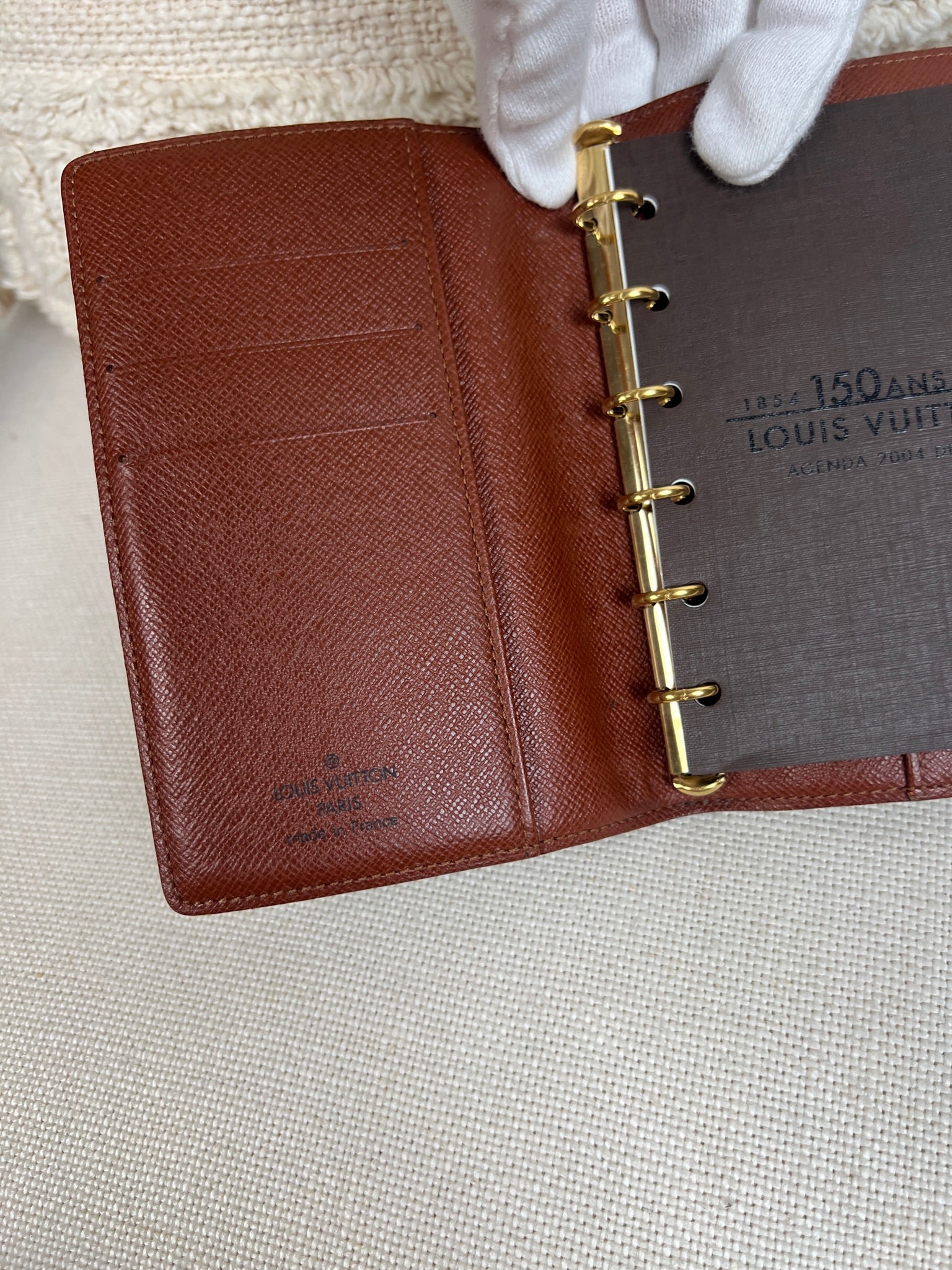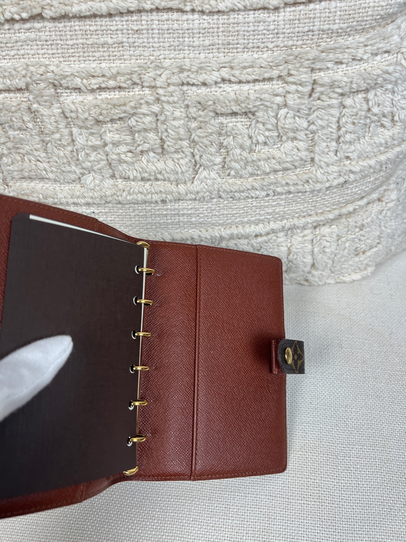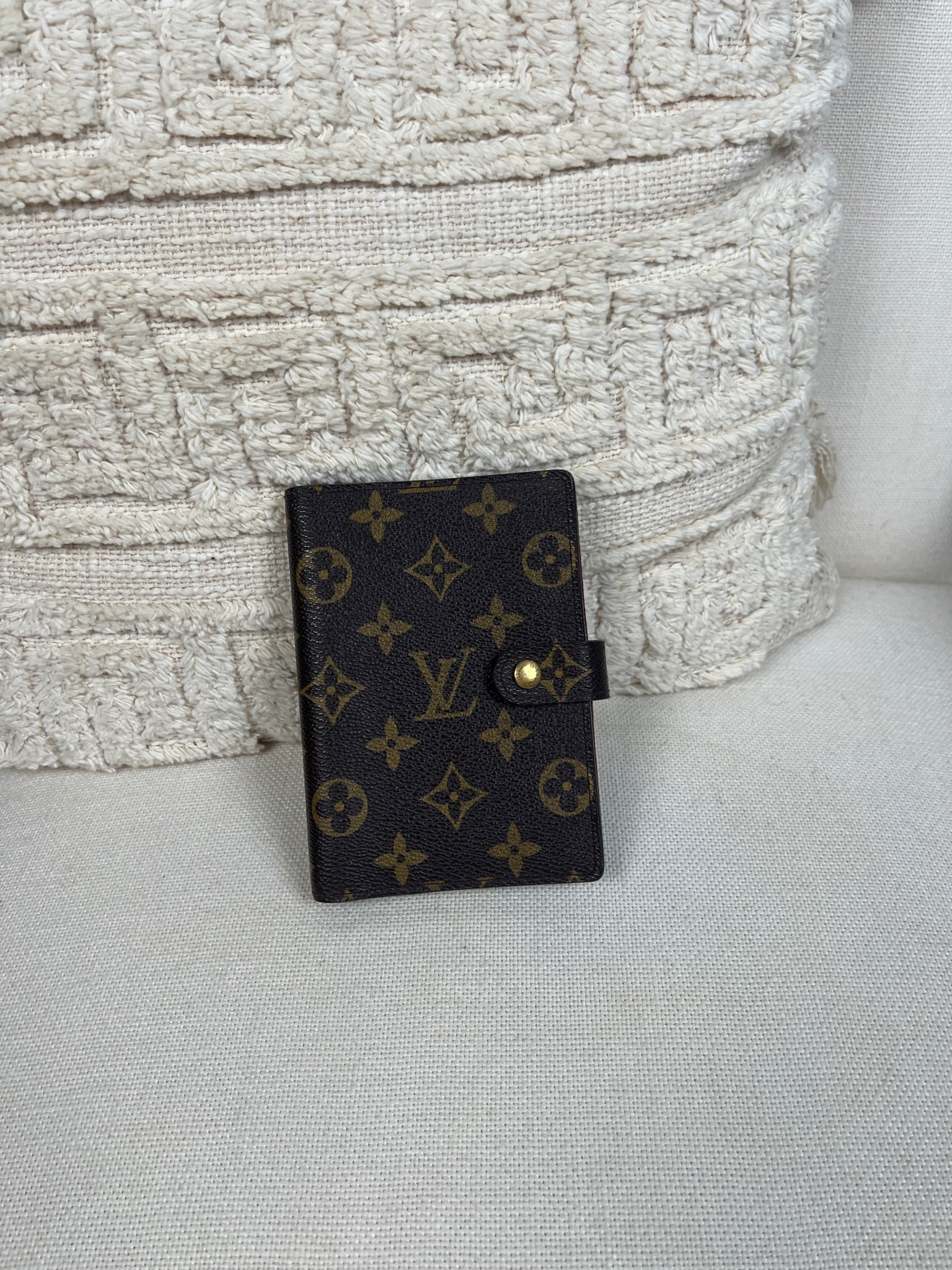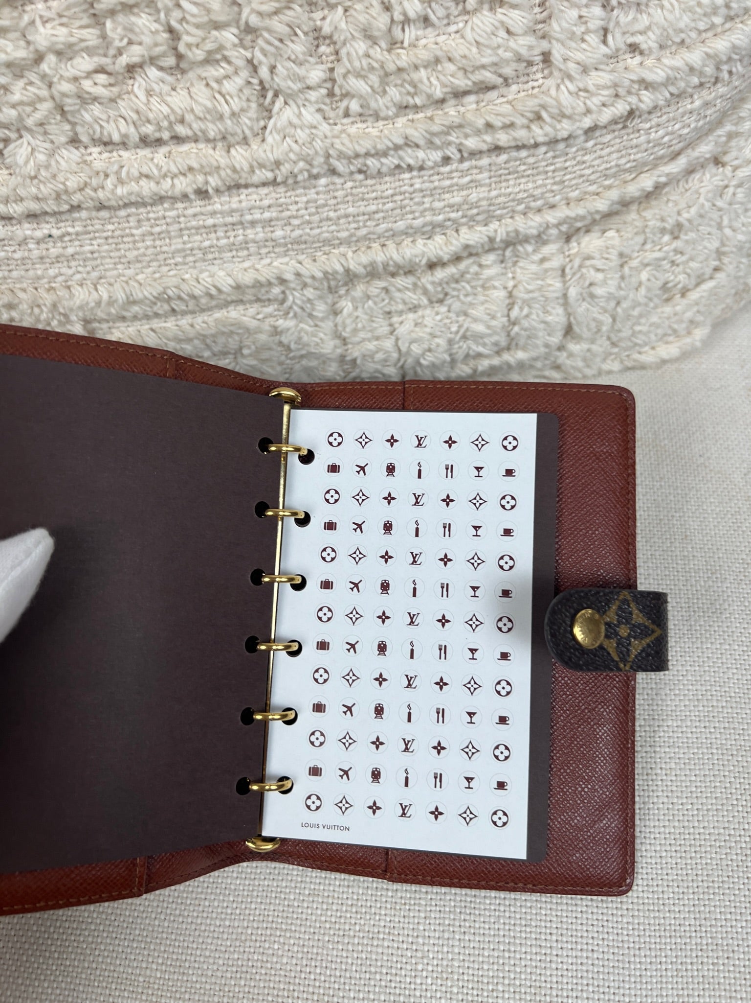 This Louis Vuitton Small Ring Agenda Cover is in very good condition. The canvas is in very good condition. The corners are in very good condition. The interior is also in very good condition. Comes with stickers and papers. The button has little scratches from normal use.