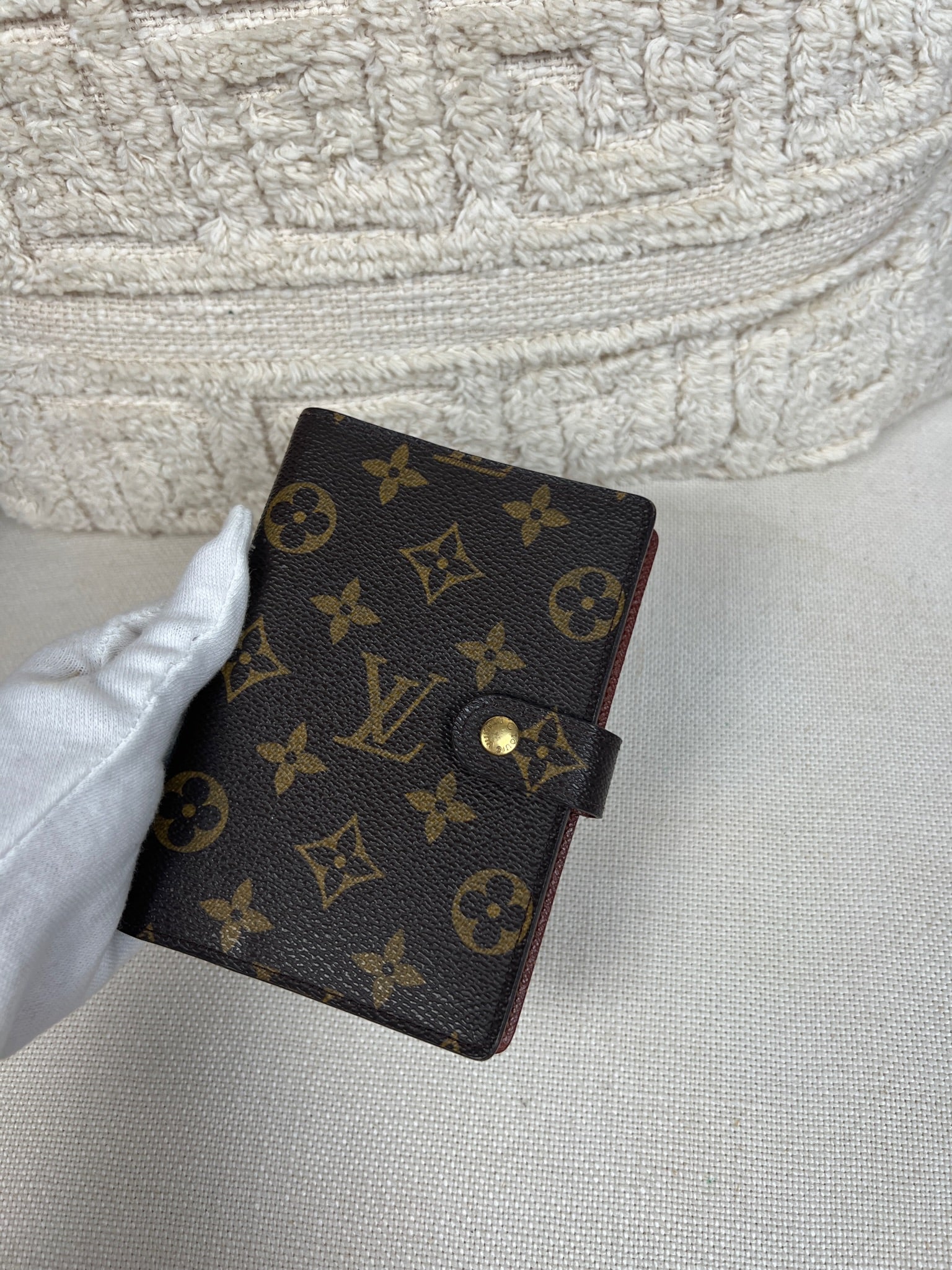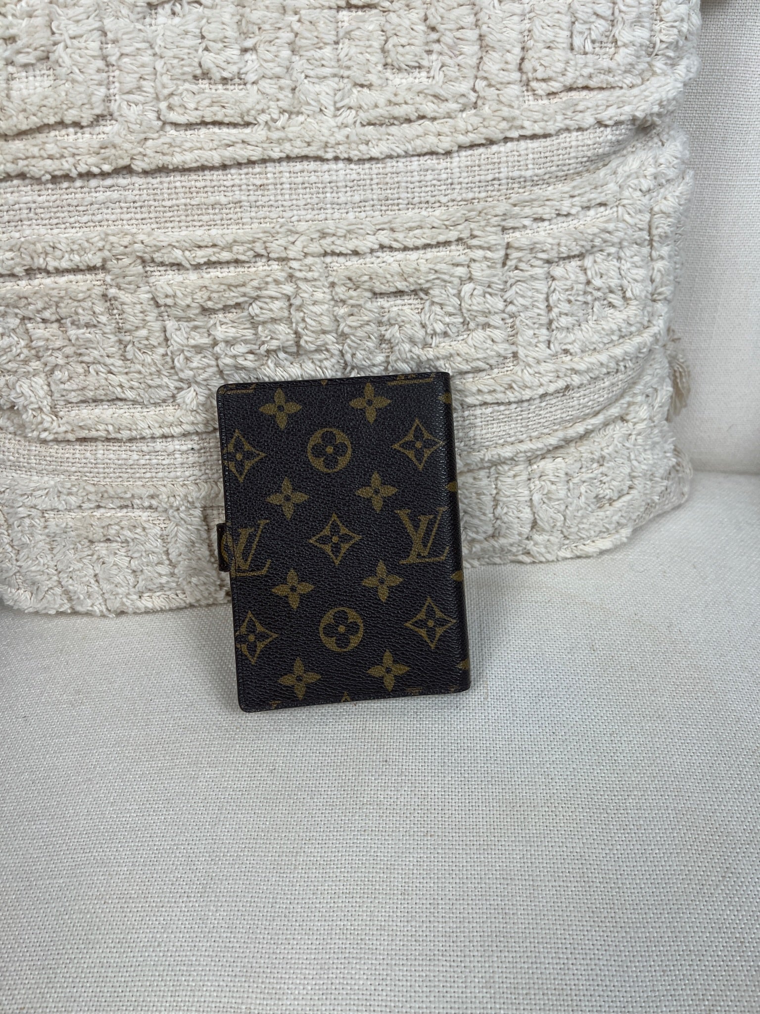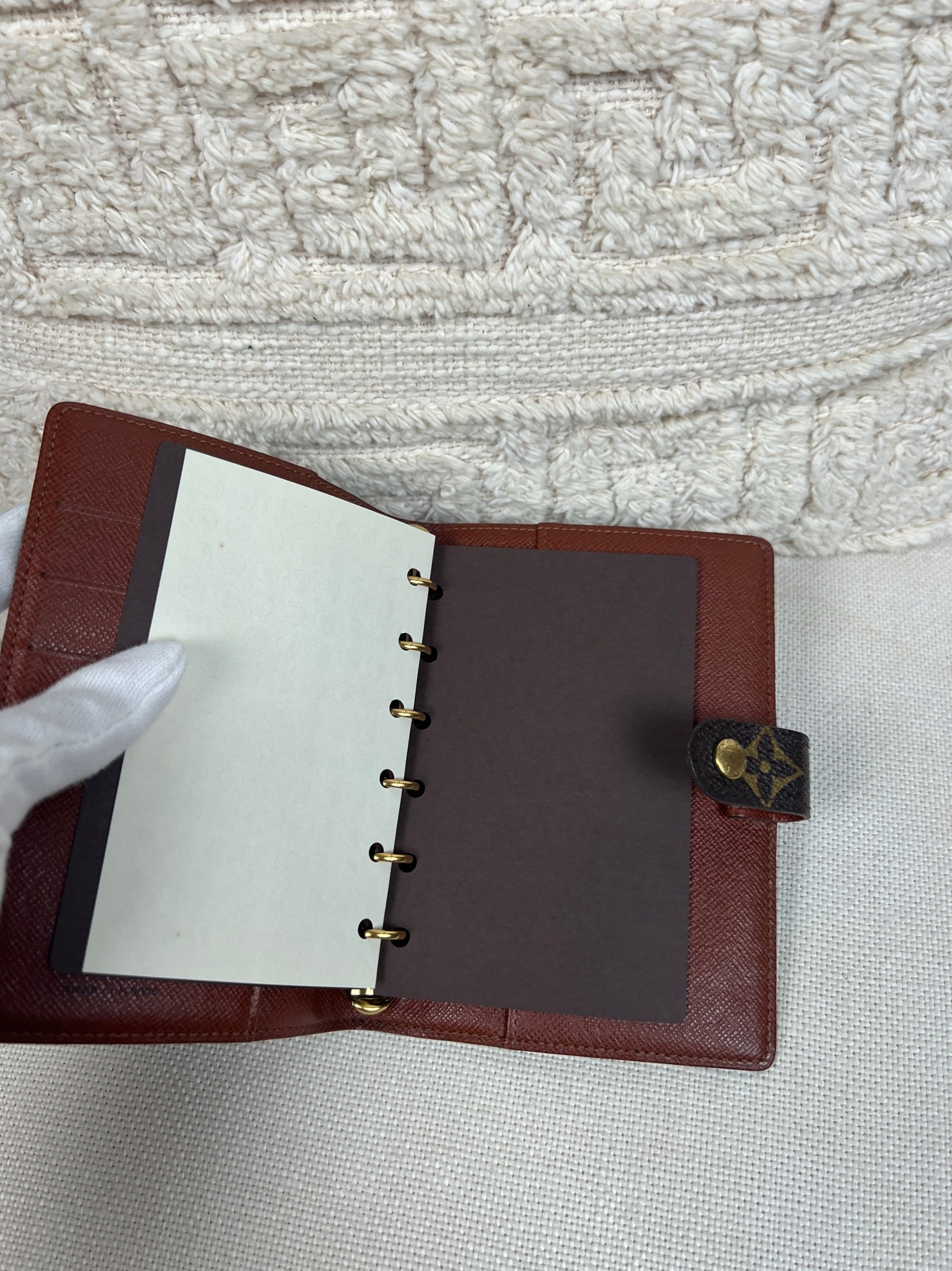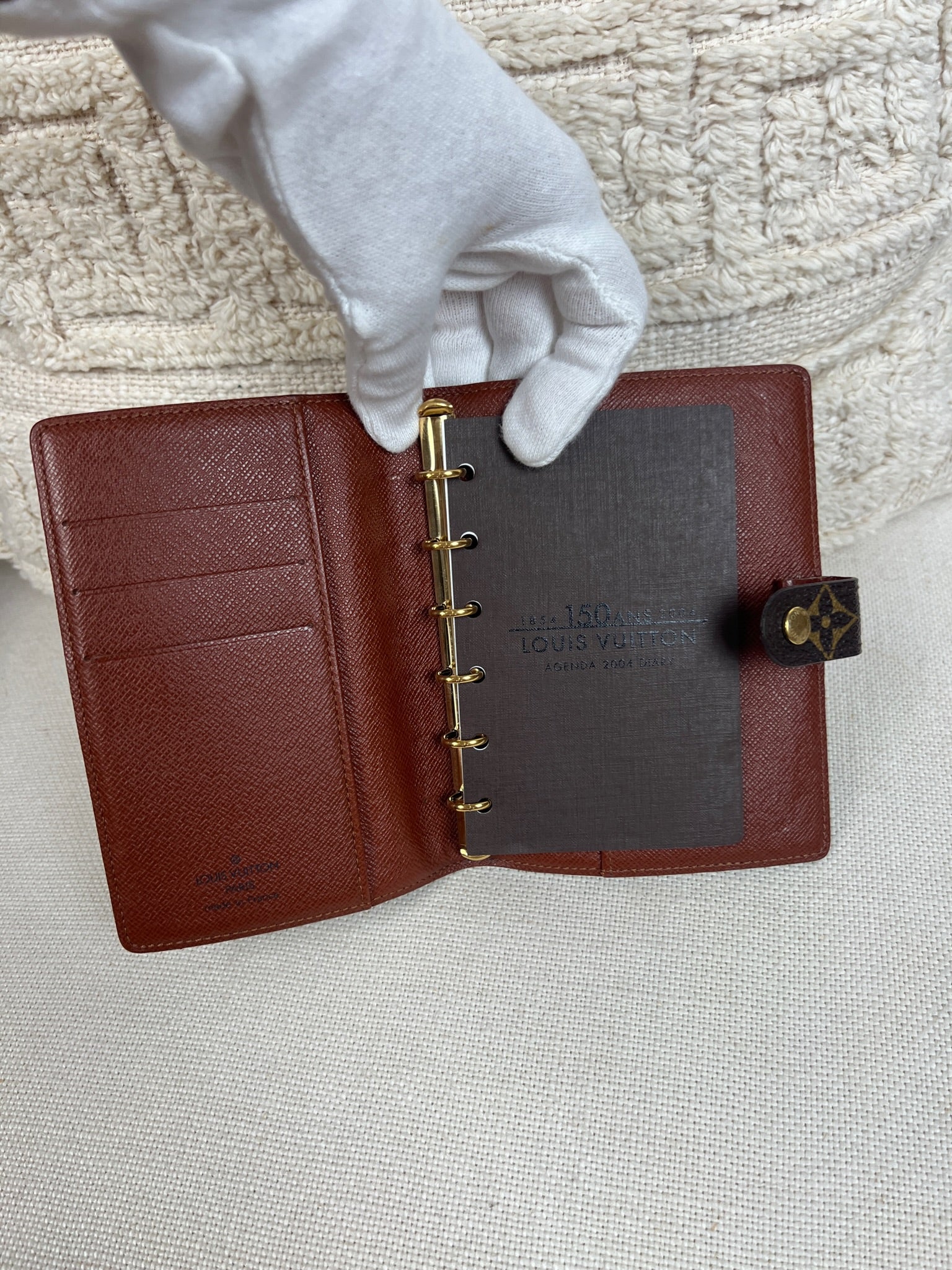 This Louis Vuitton Small Ring Agenda Cover is in very good condition. The canvas is in very good condition. The corners are in very good condition. The interior is also in very good condition. Comes with stickers and papers. The button has little scratches from normal use.