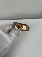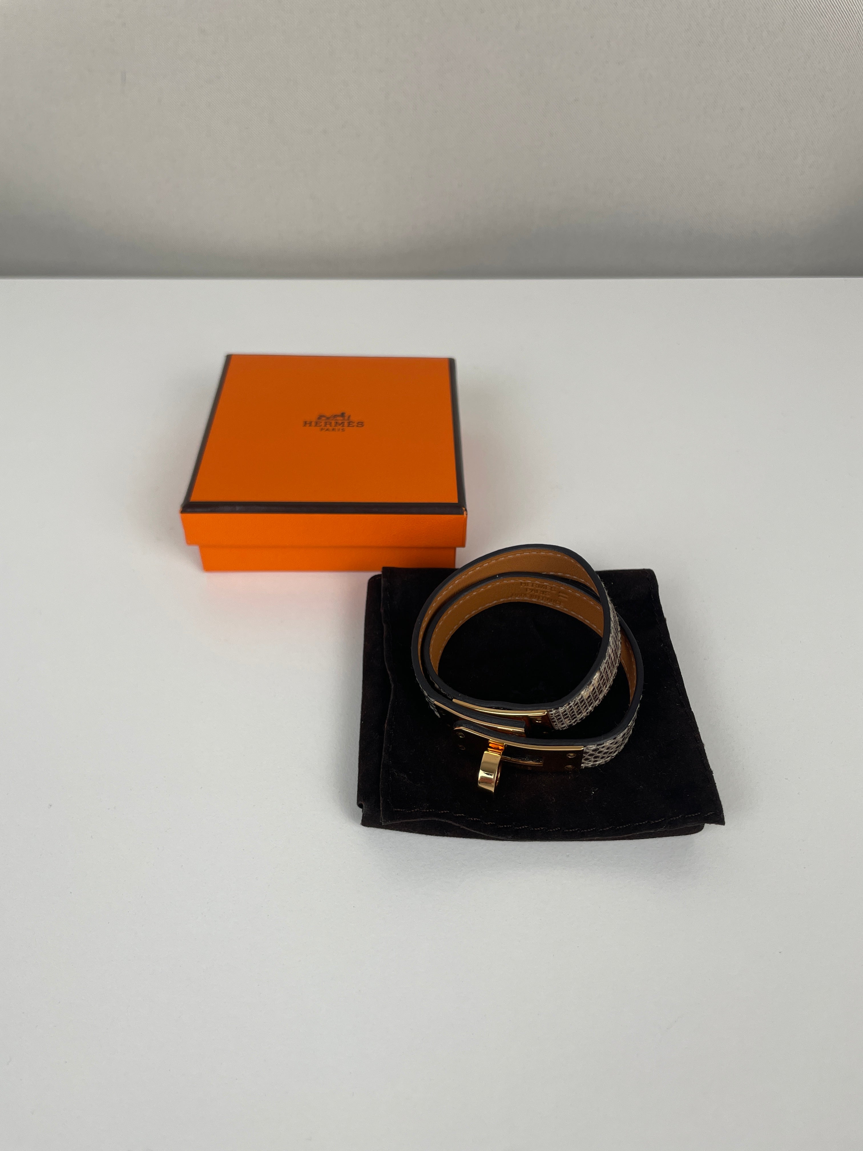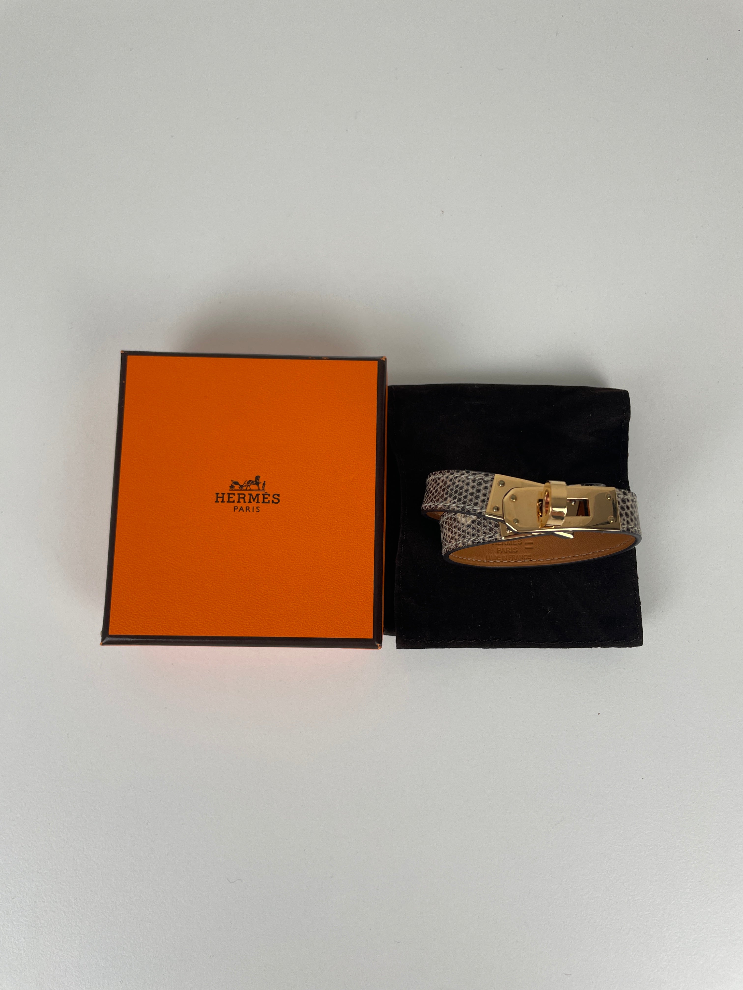 This Kelly Double Tour Bracelet is in very good condition. Lizard exotic leather. The leather is in very good condition it was used a little bit almost not. The hardware is in good condition with scratches due to normal use. It's a size 2.