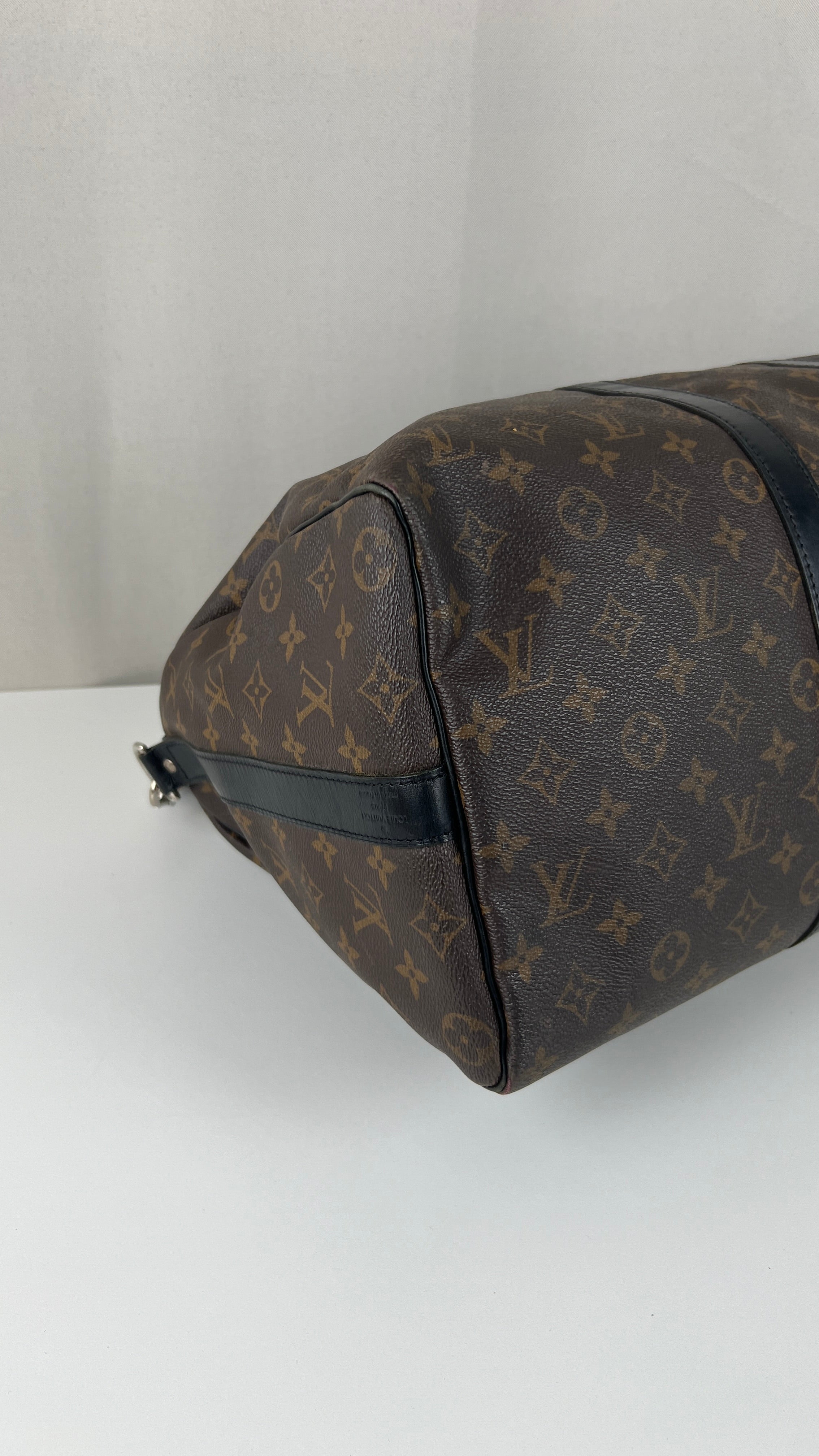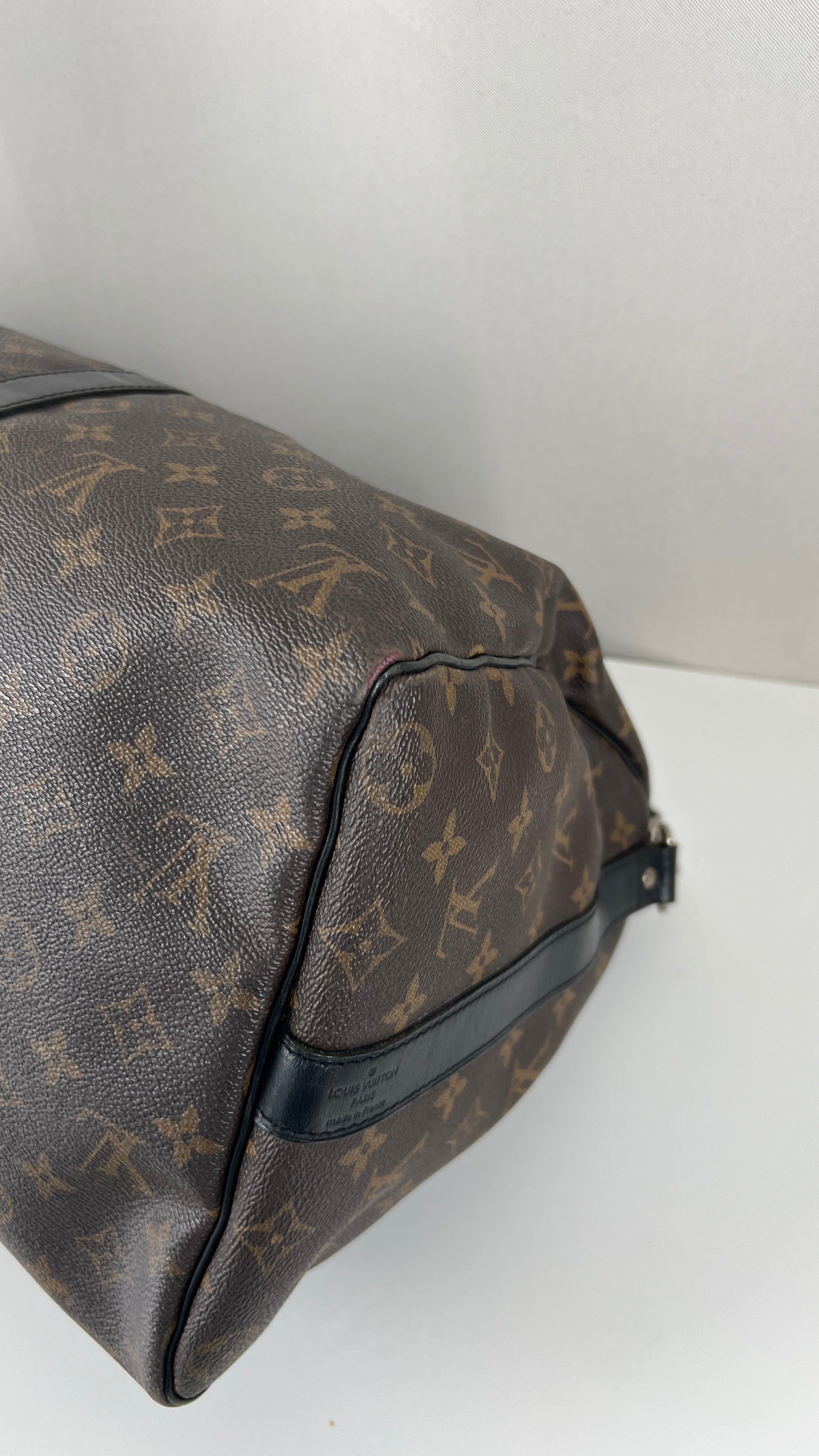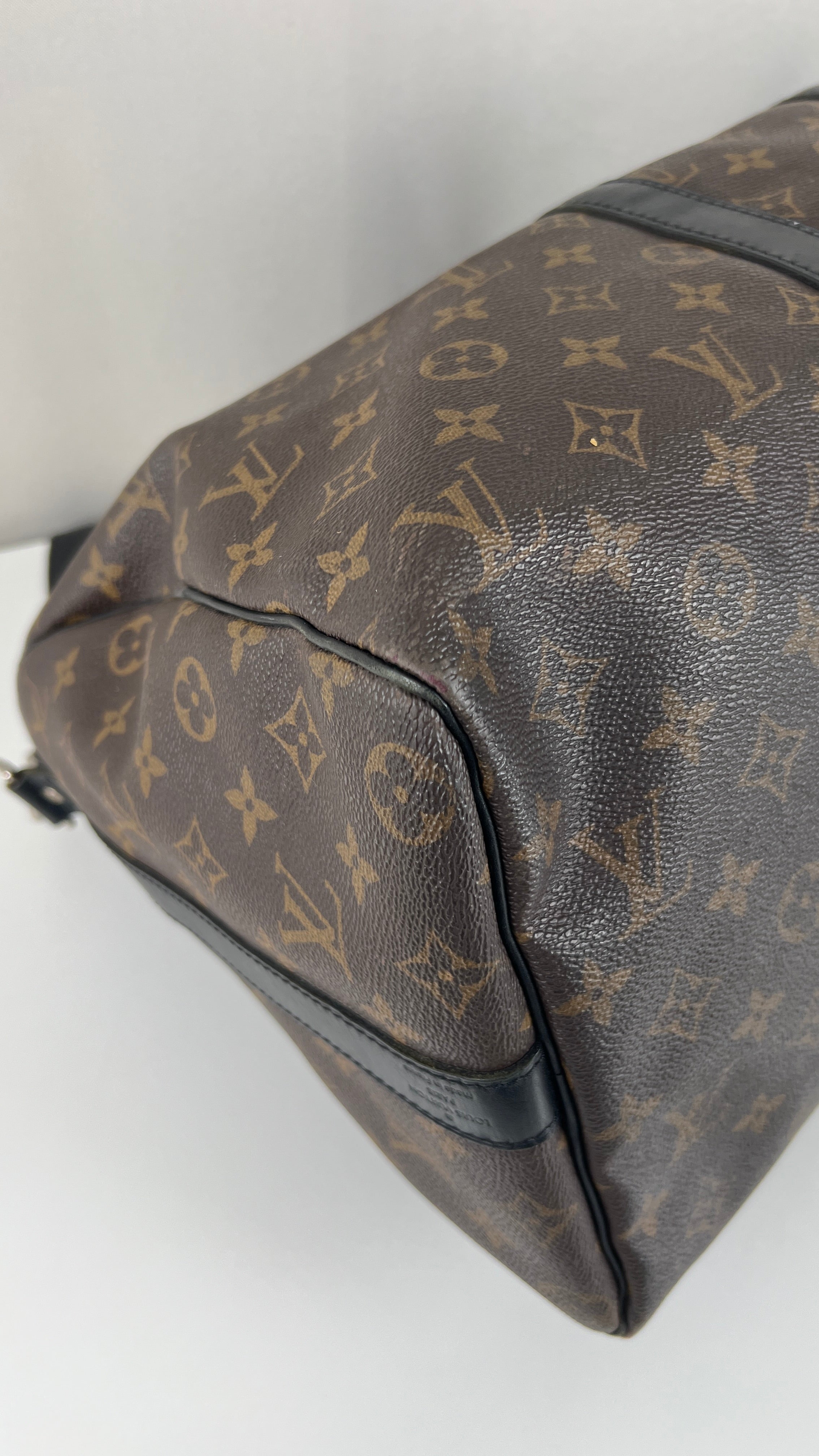 This Louis Vuitton Keepall 45 Macasar is in good condition. The corners are a little bit rubbed and used. The canvas is in very good condition. The leather parts have some trace of wear. The handles are in good condition. The strap has some mark of wear. The inside is in very good condition.