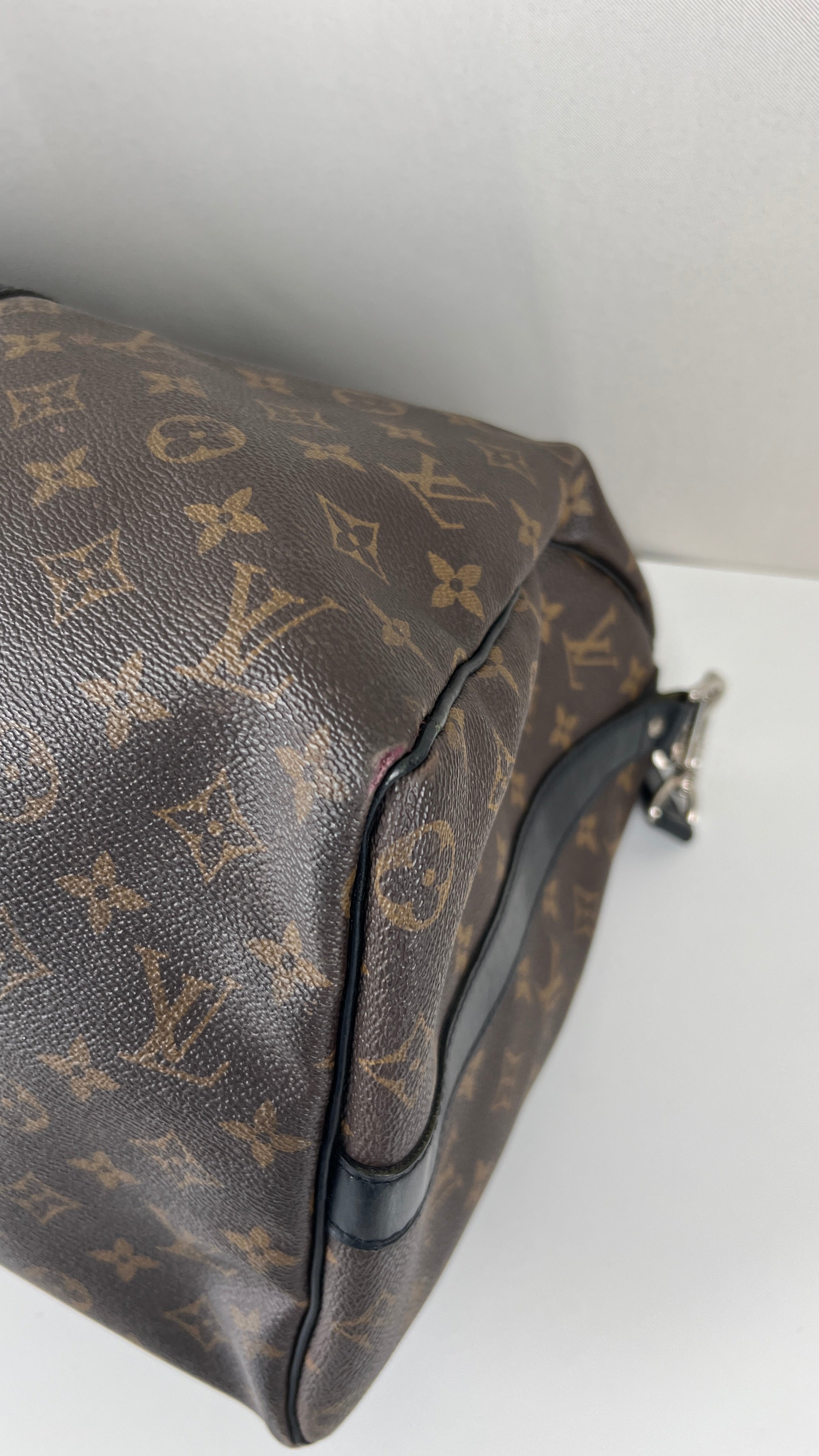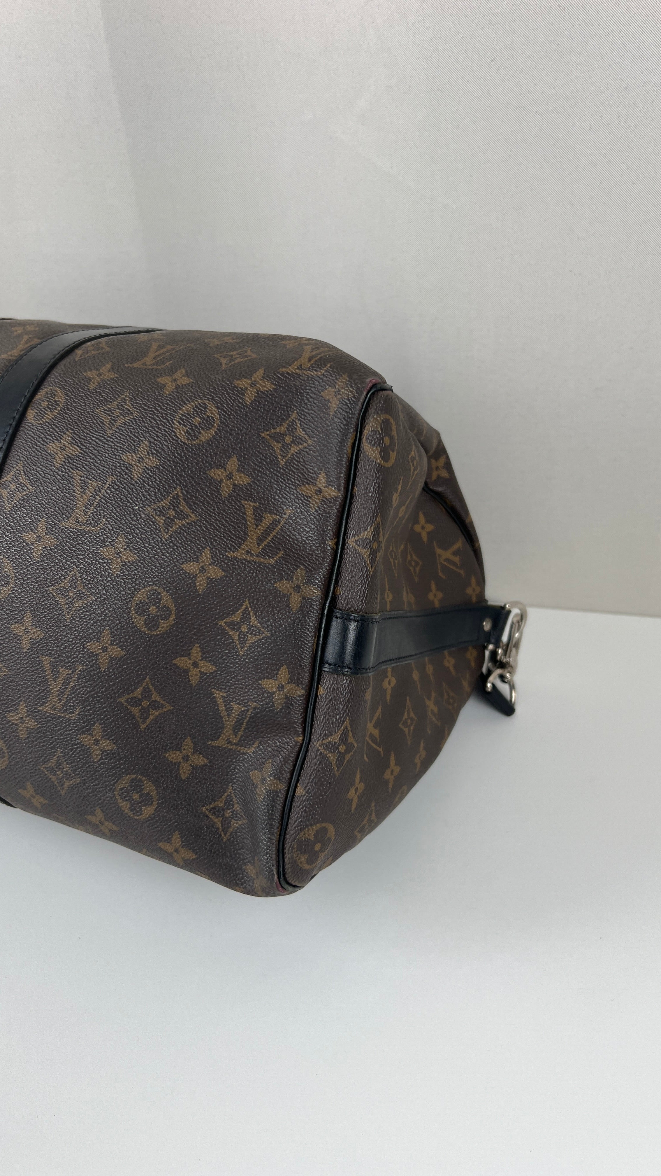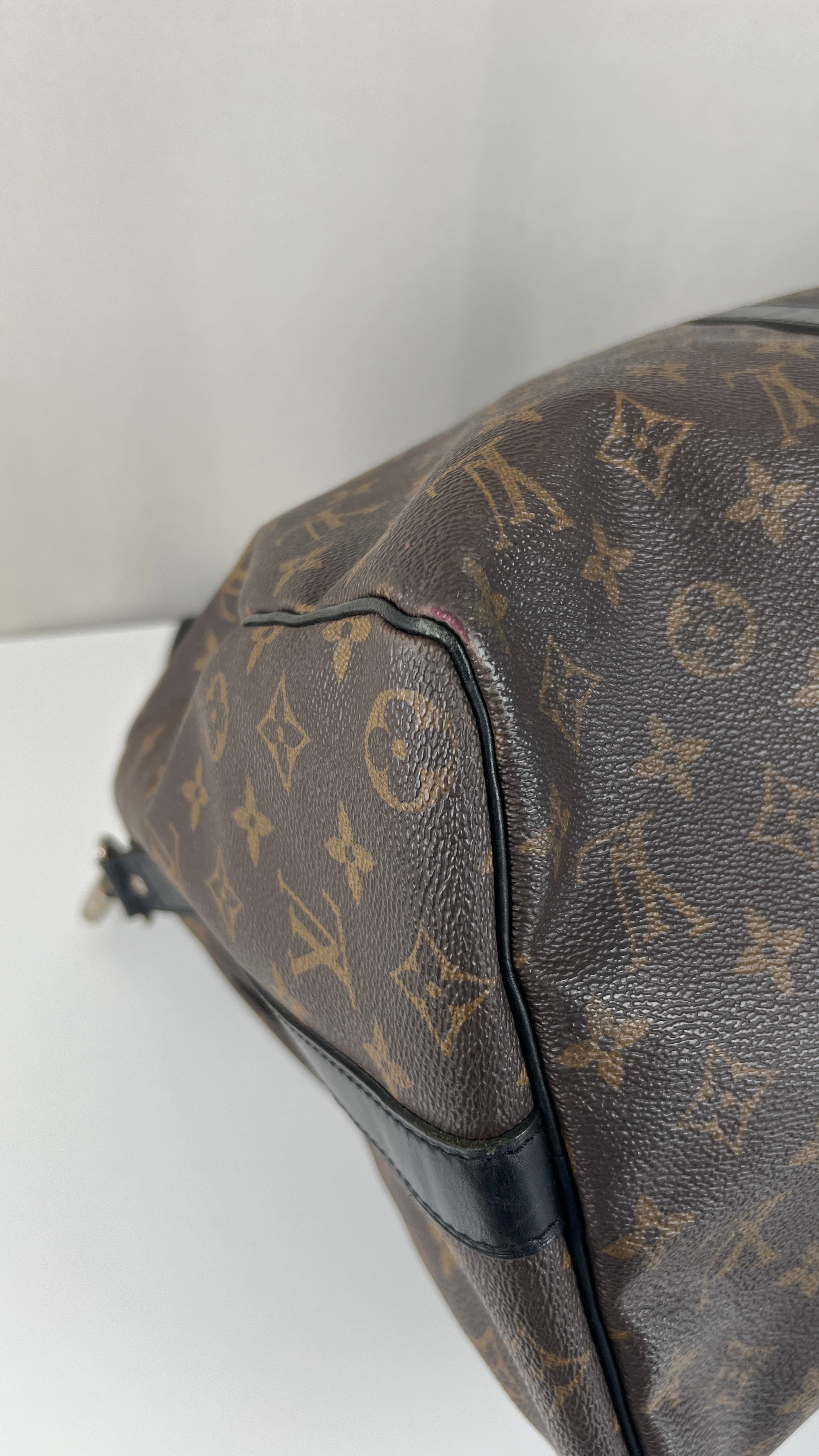 This Louis Vuitton Keepall 45 Macasar is in good condition. The corners are a little bit rubbed and used. The canvas is in very good condition. The leather parts have some trace of wear. The handles are in good condition. The strap has some mark of wear. The inside is in very good condition.