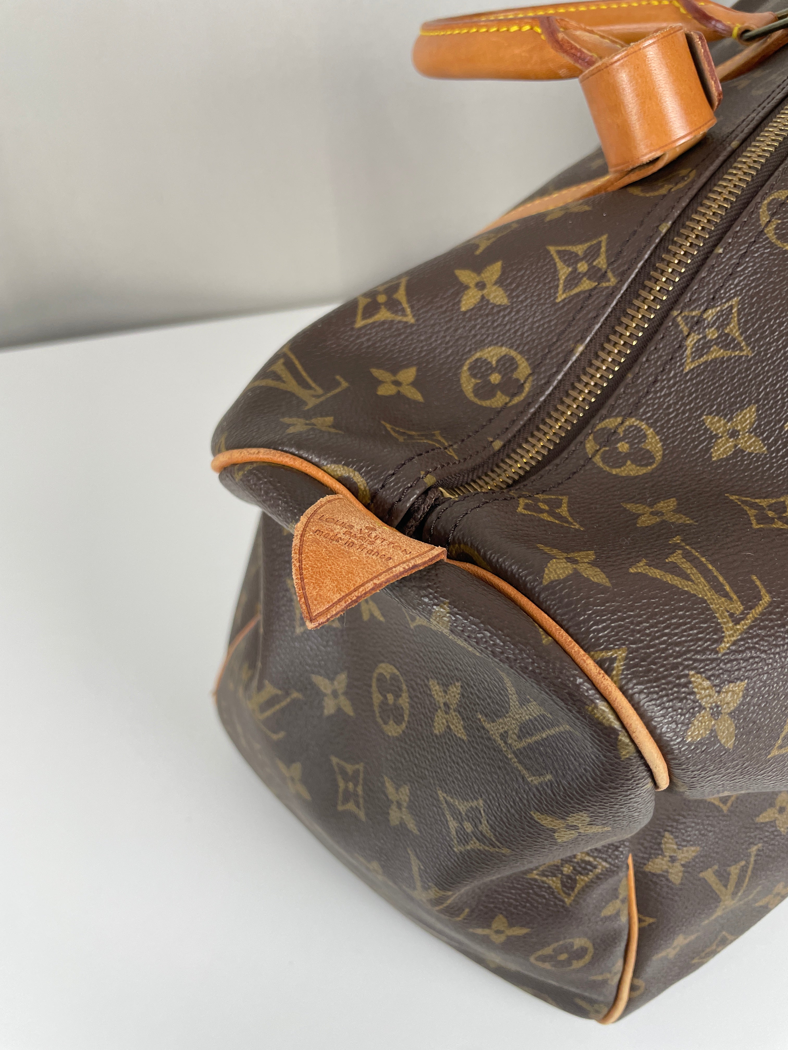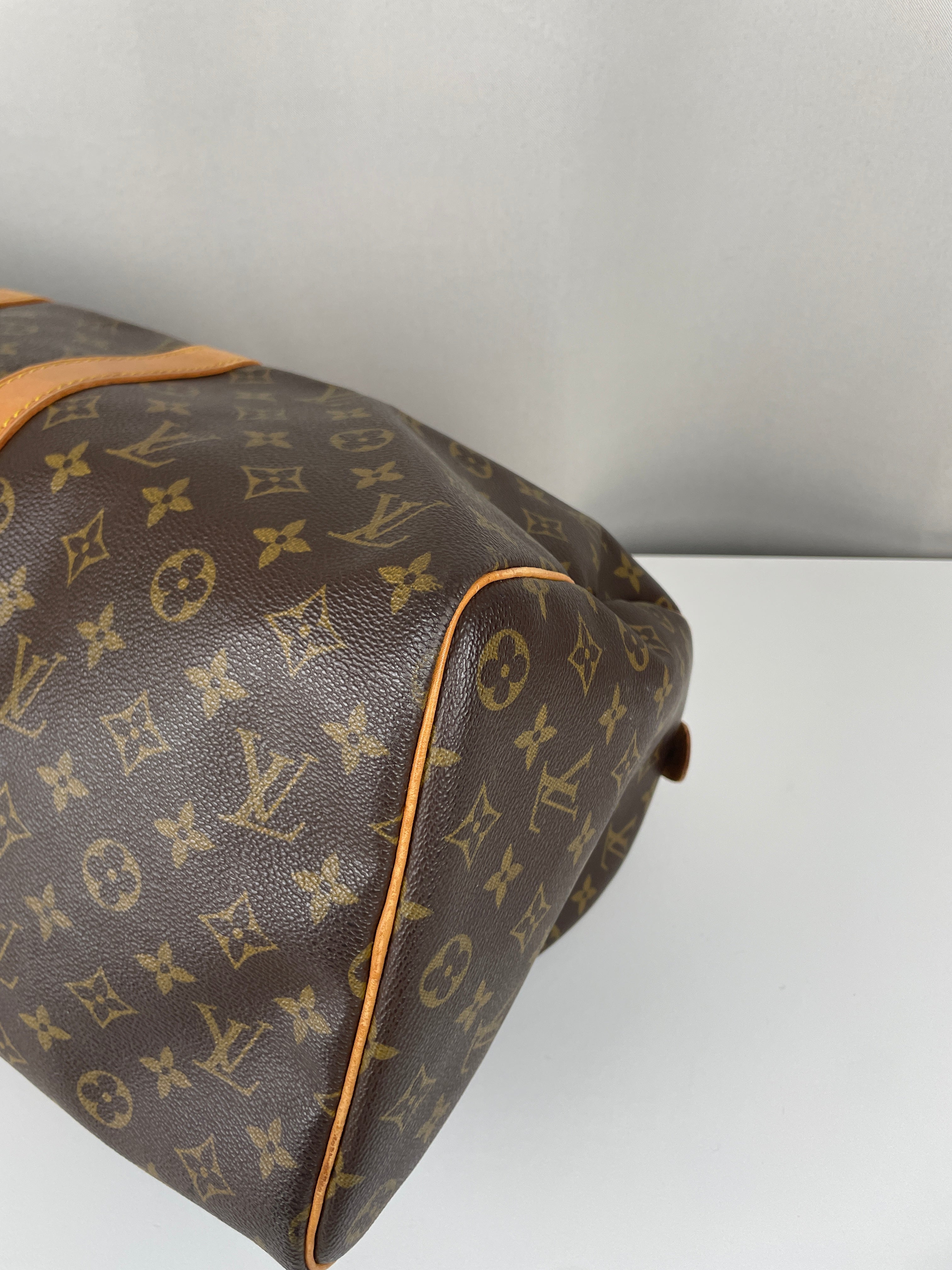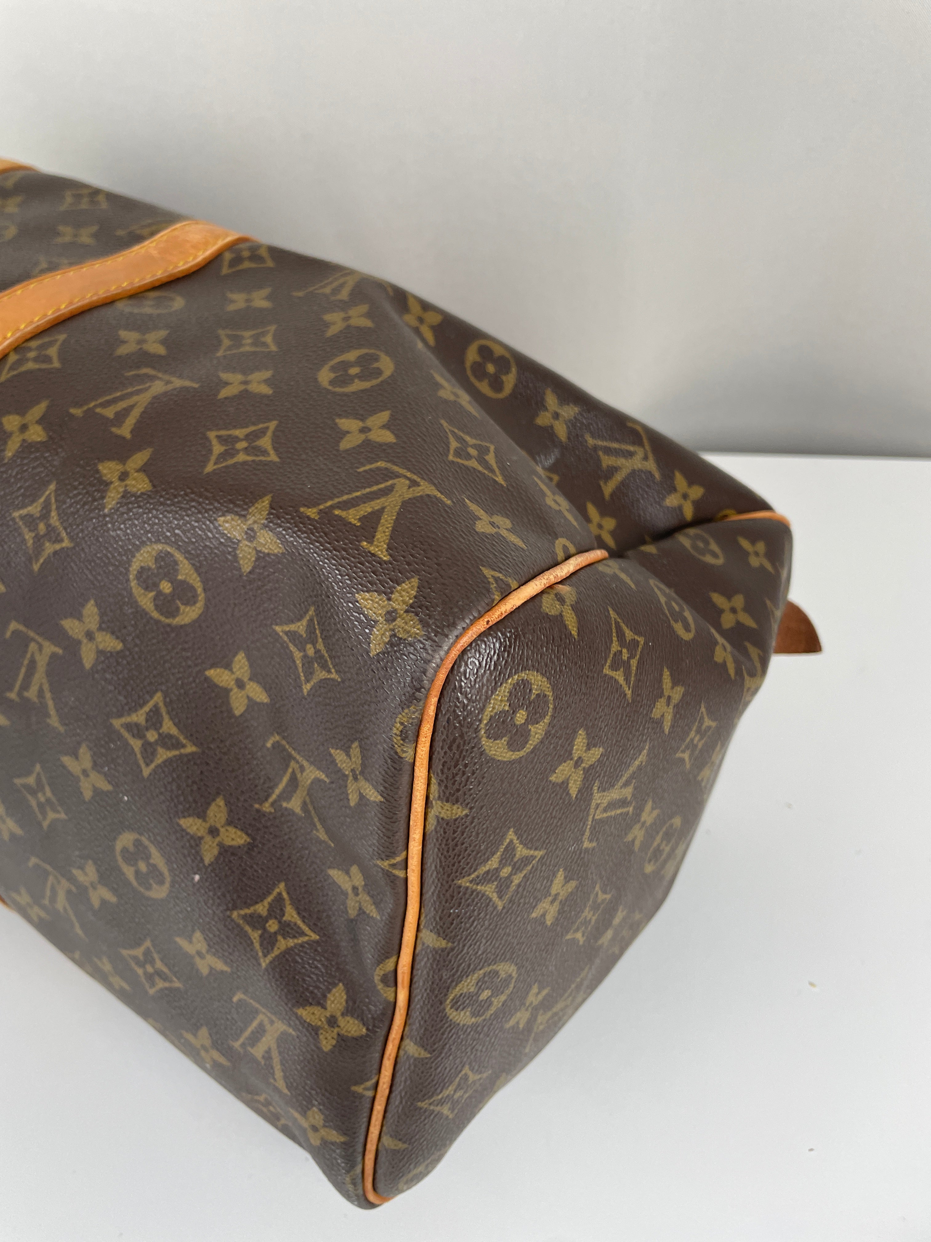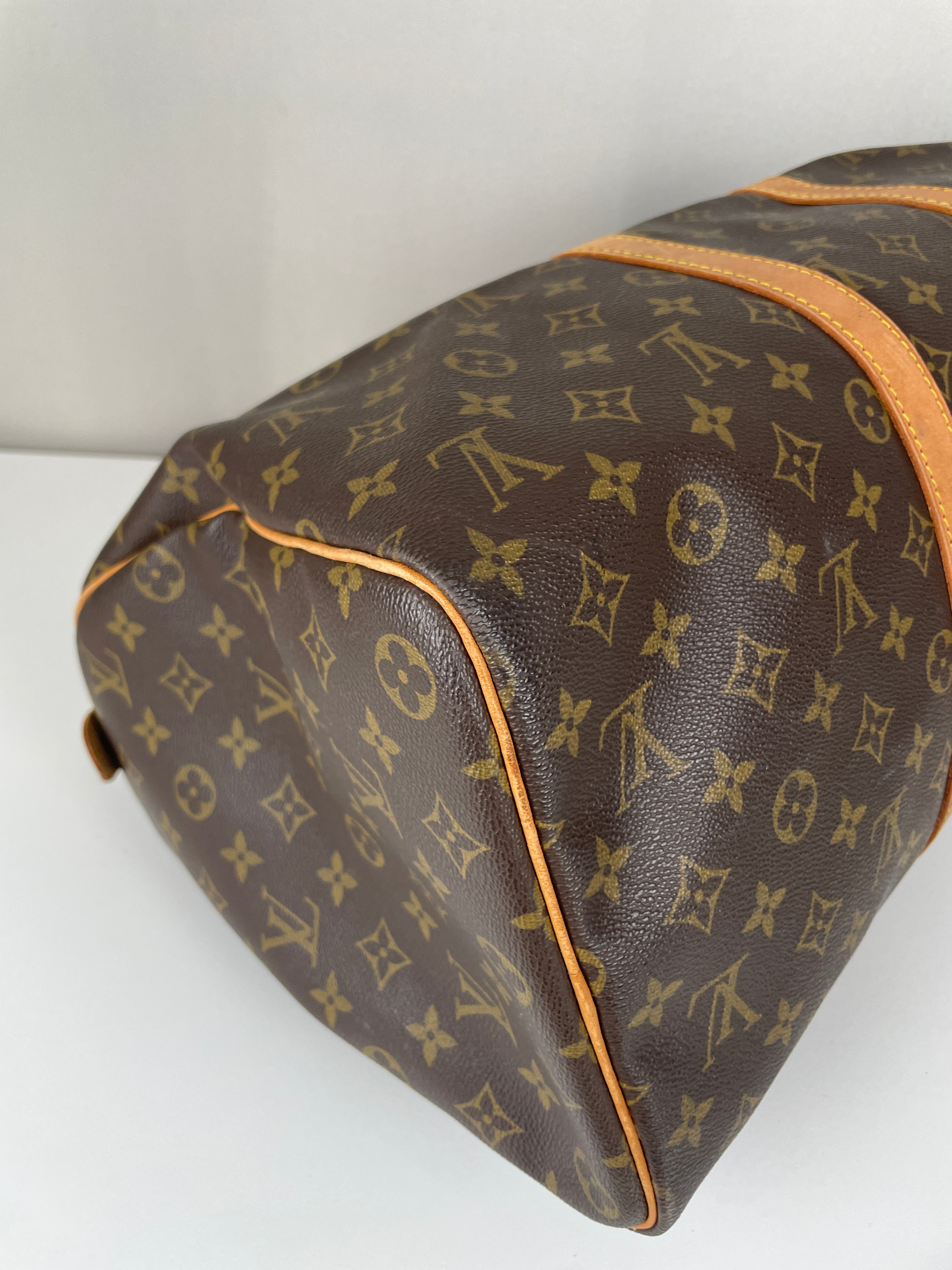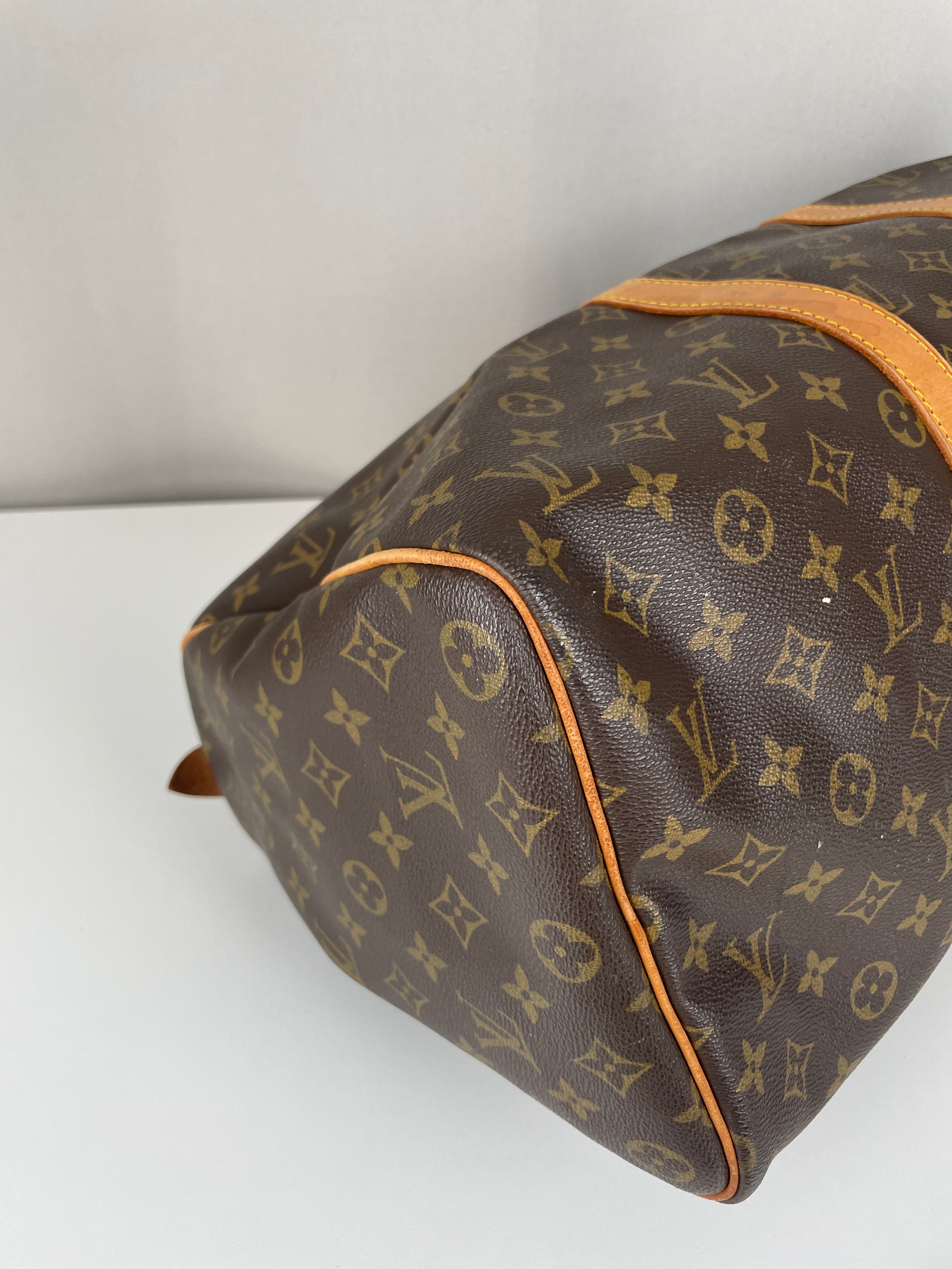 This Louis Vuitton Keepall is in very good condition. The canvas is great because it's in good shape, it's the perfect travel bag, you can use it as a cabin bag for plane trips. The interior is very good condition, the fabric inside is a little bit darker due to the year of the bag. The hardware has little traces. Corners are a little bit rubbed and the leather parts have some little trace of natural wear. One trace on the bottom of the bag.