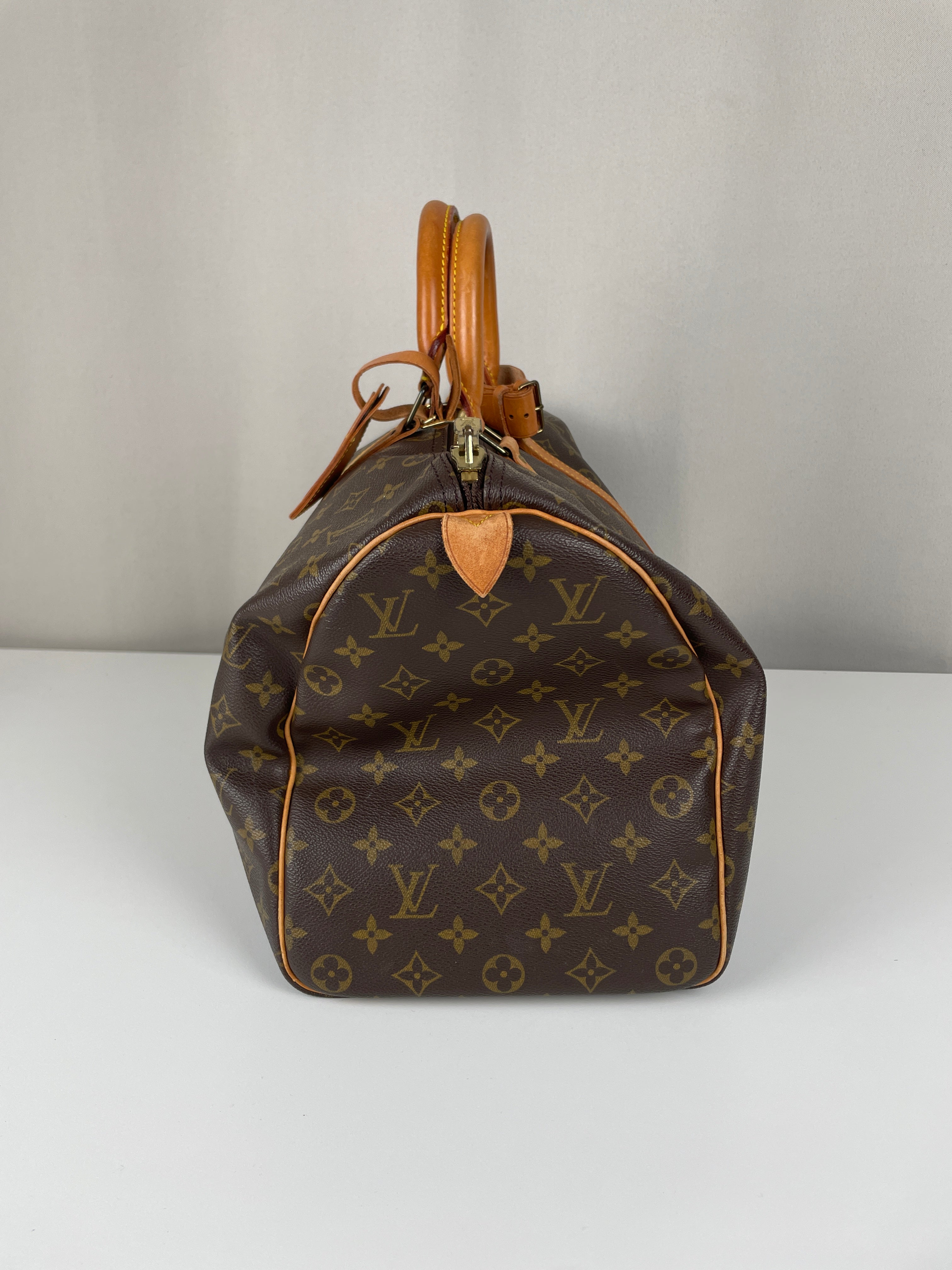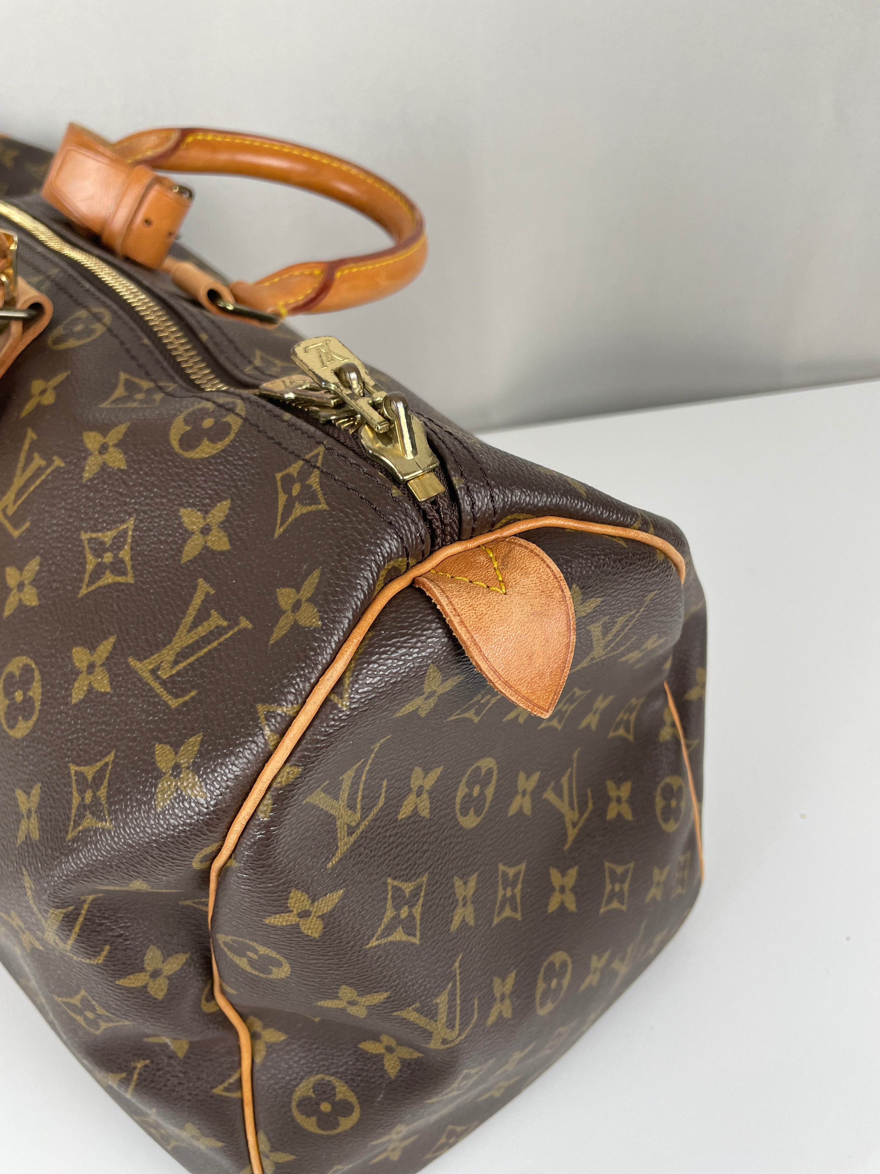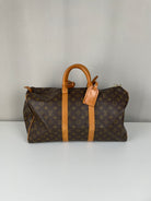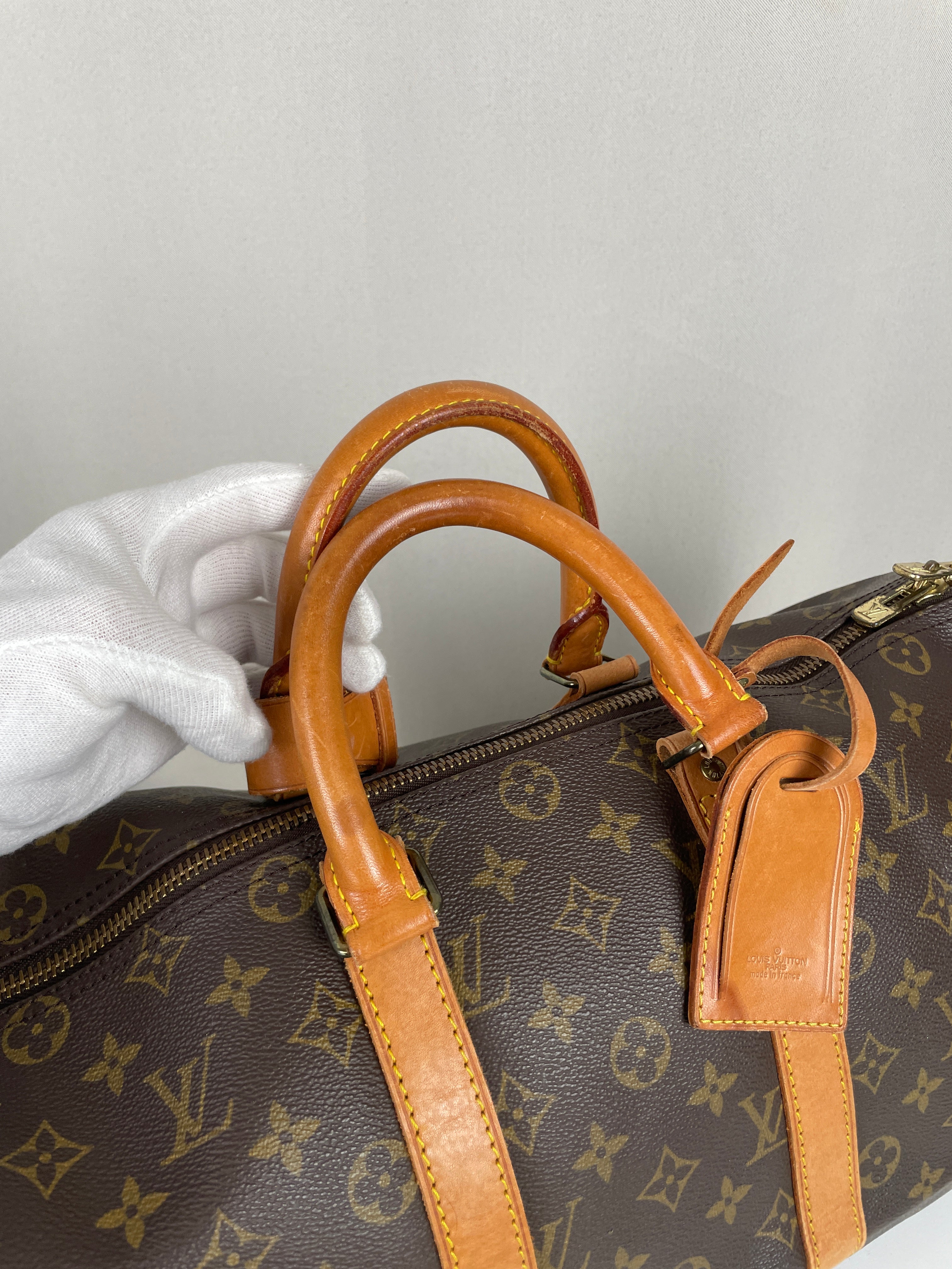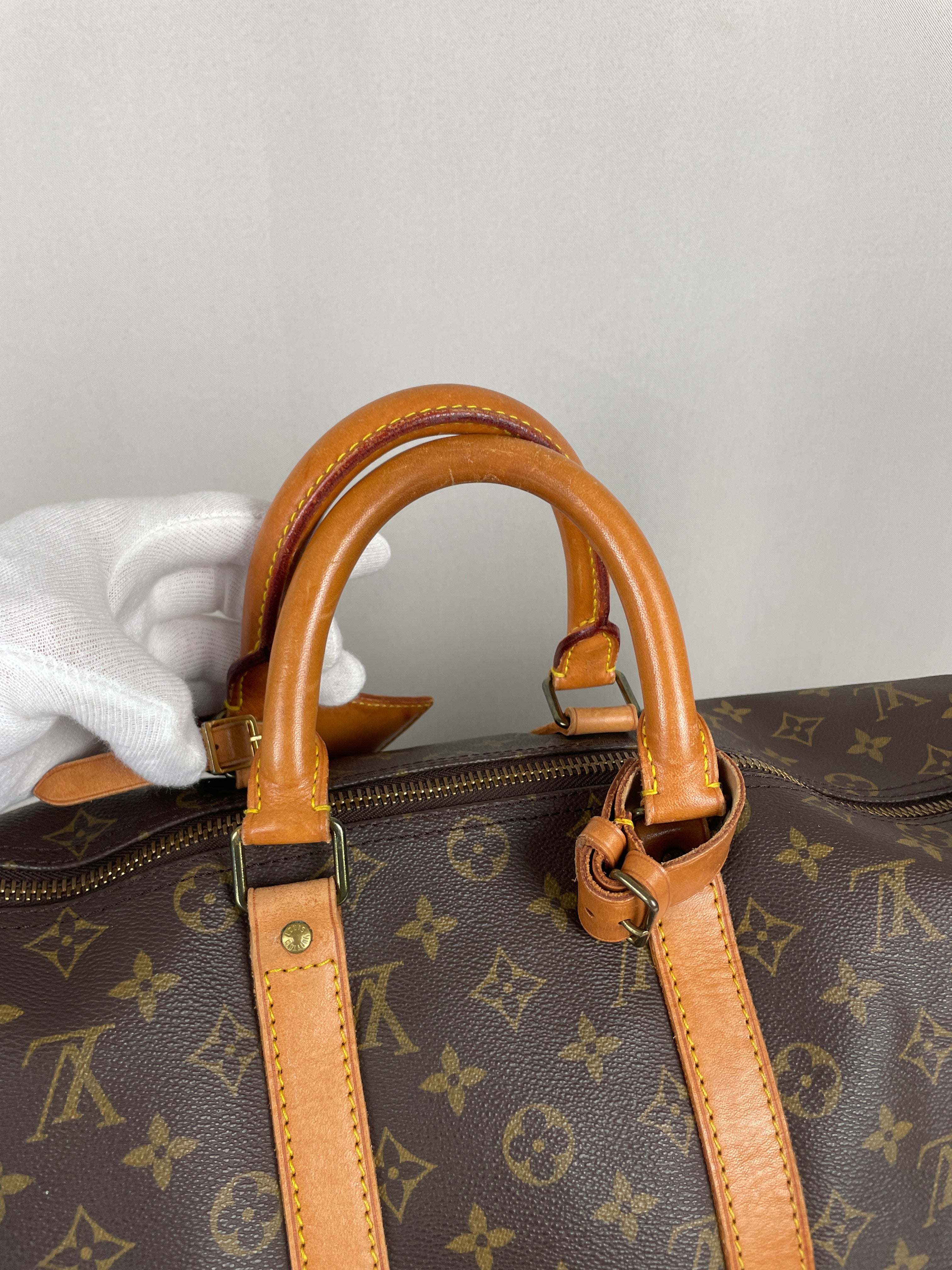 This Louis Vuitton Keepall is in very good condition. The canvas is great because it's in good shape, it's the perfect travel bag, you can use it as a cabin bag for plane trips. The interior is very good condition, the fabric inside is a little bit darker due to the year of the bag. The hardware has little traces. Corners are a little bit rubbed and the leather parts have some little trace of natural wear. One trace on the bottom of the bag.