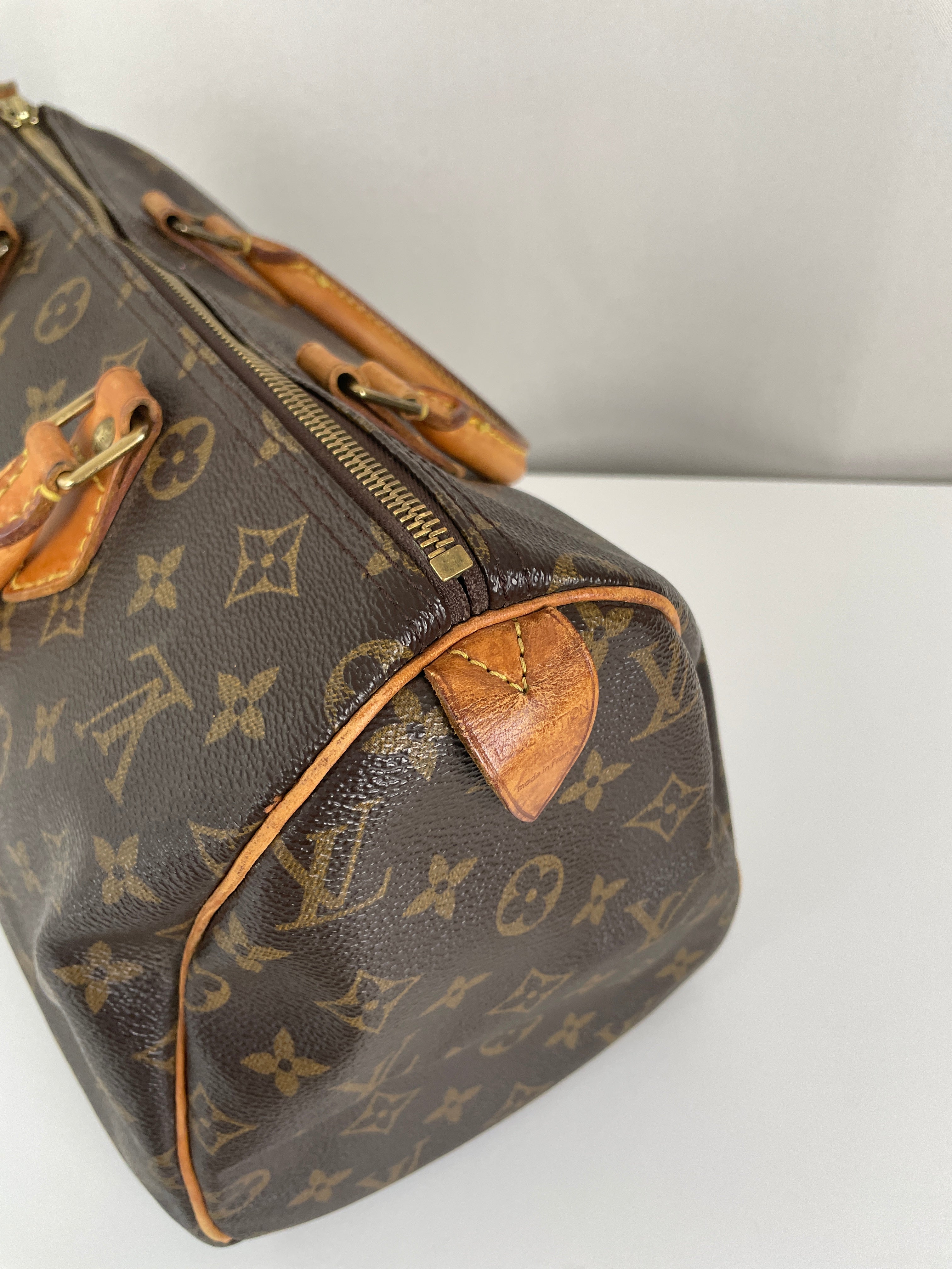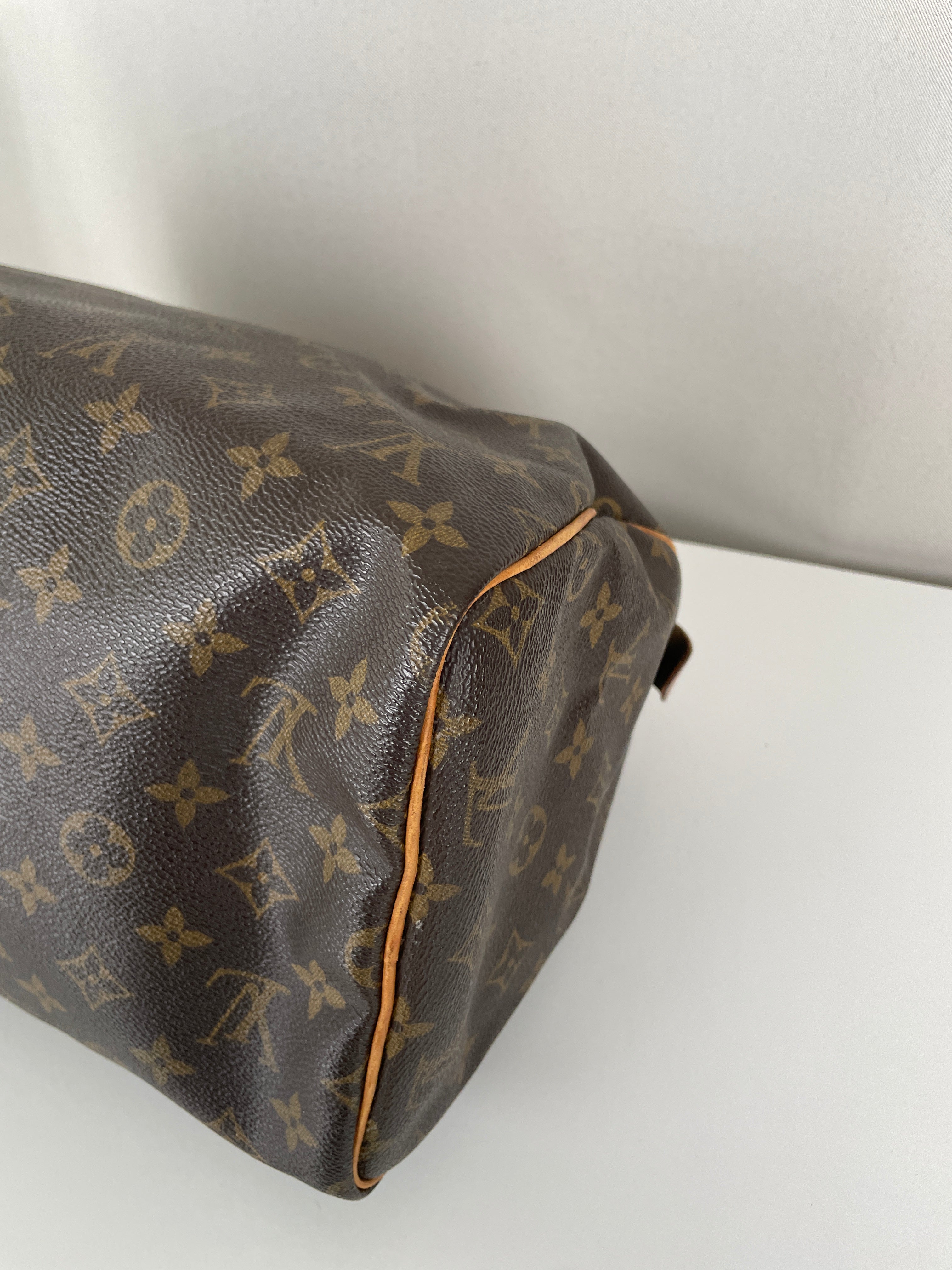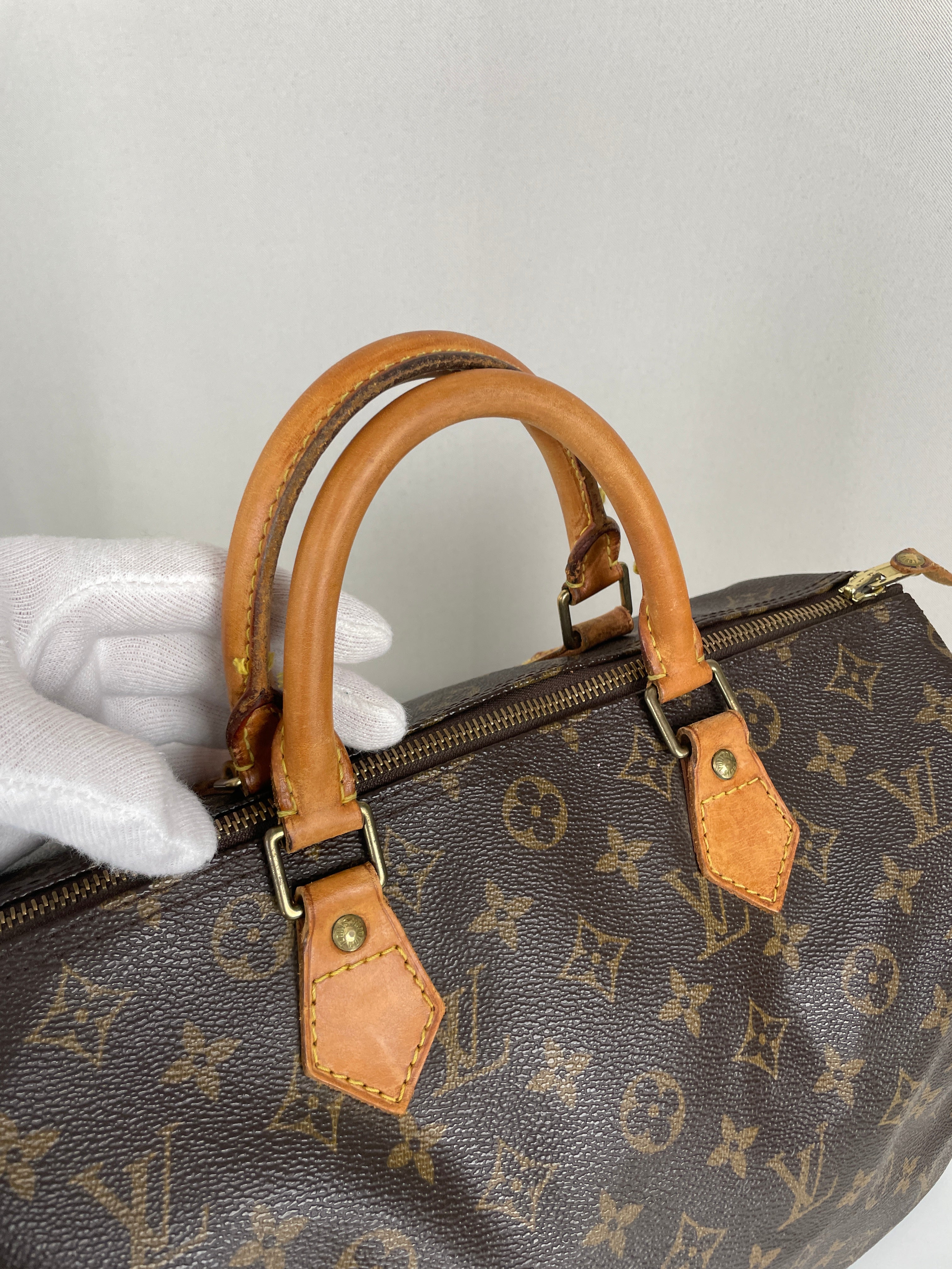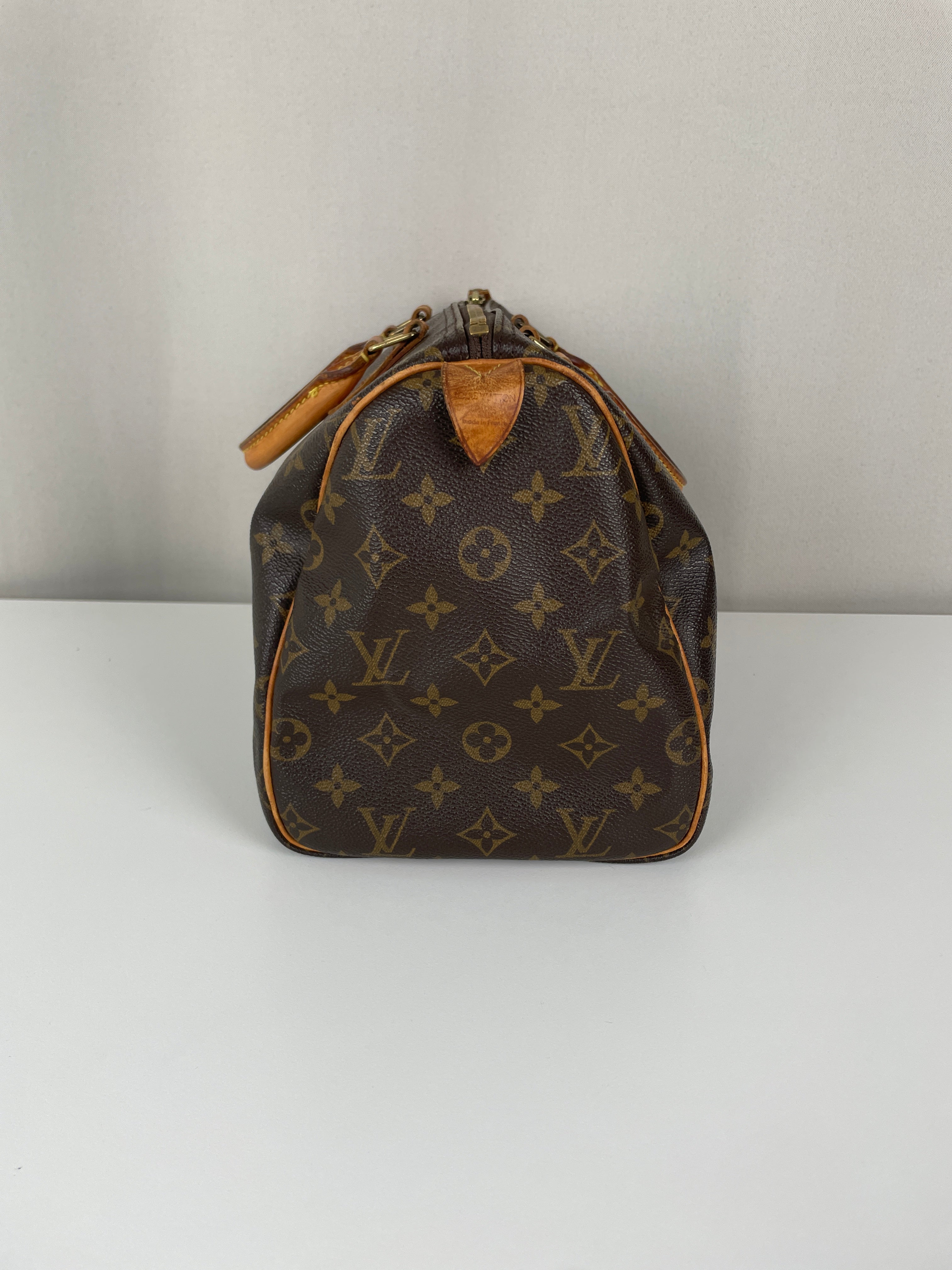 The Louis Vuitton Speedy 30 in Monogram canvas is an icon of luxury. Lightweight, spacious, and durable, it is ideal for everyday wear. This vintage piece remains beautifully preserved, with natural leather patina adding unique charm. A must-have for any luxury handbag collection.