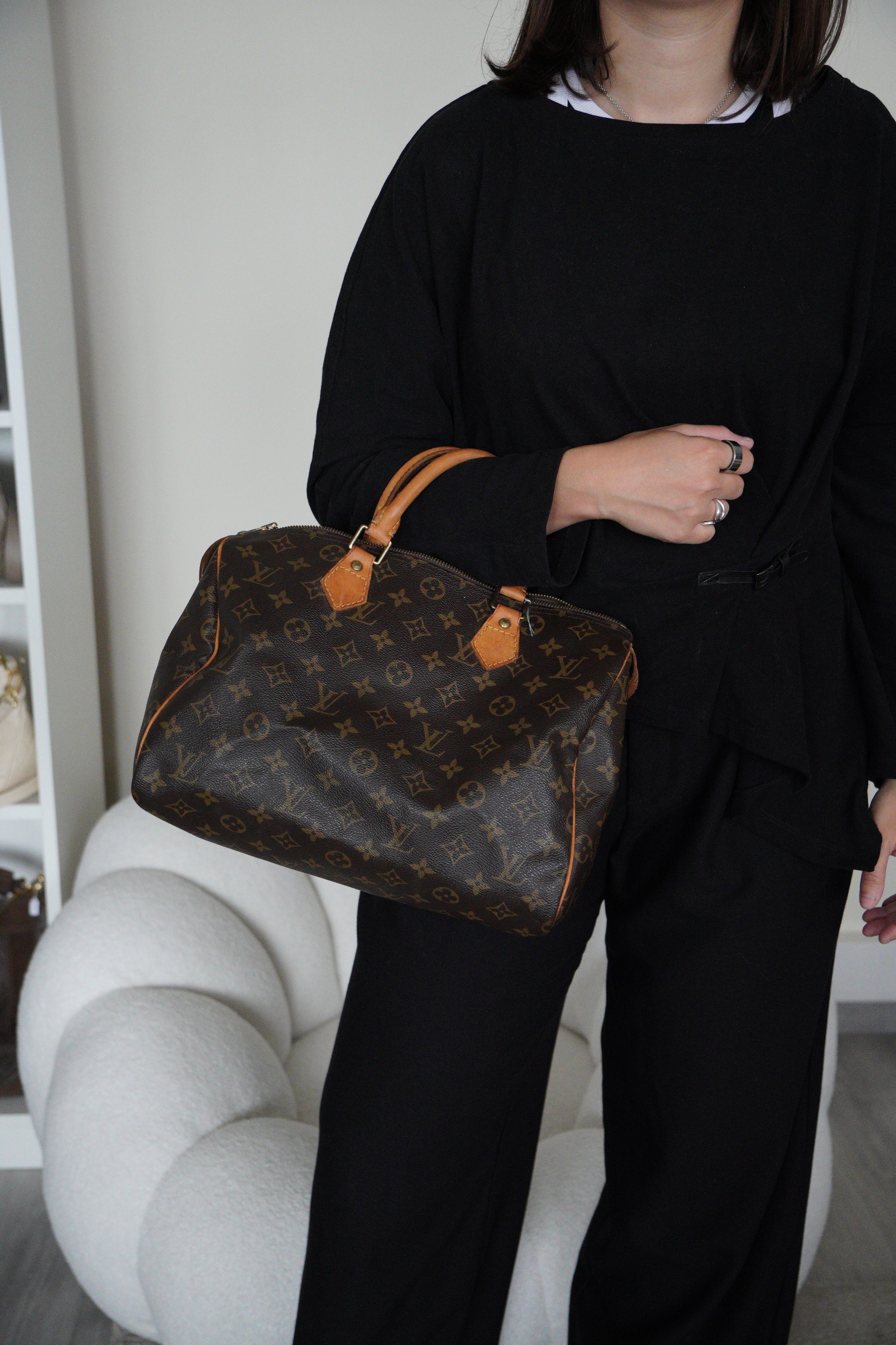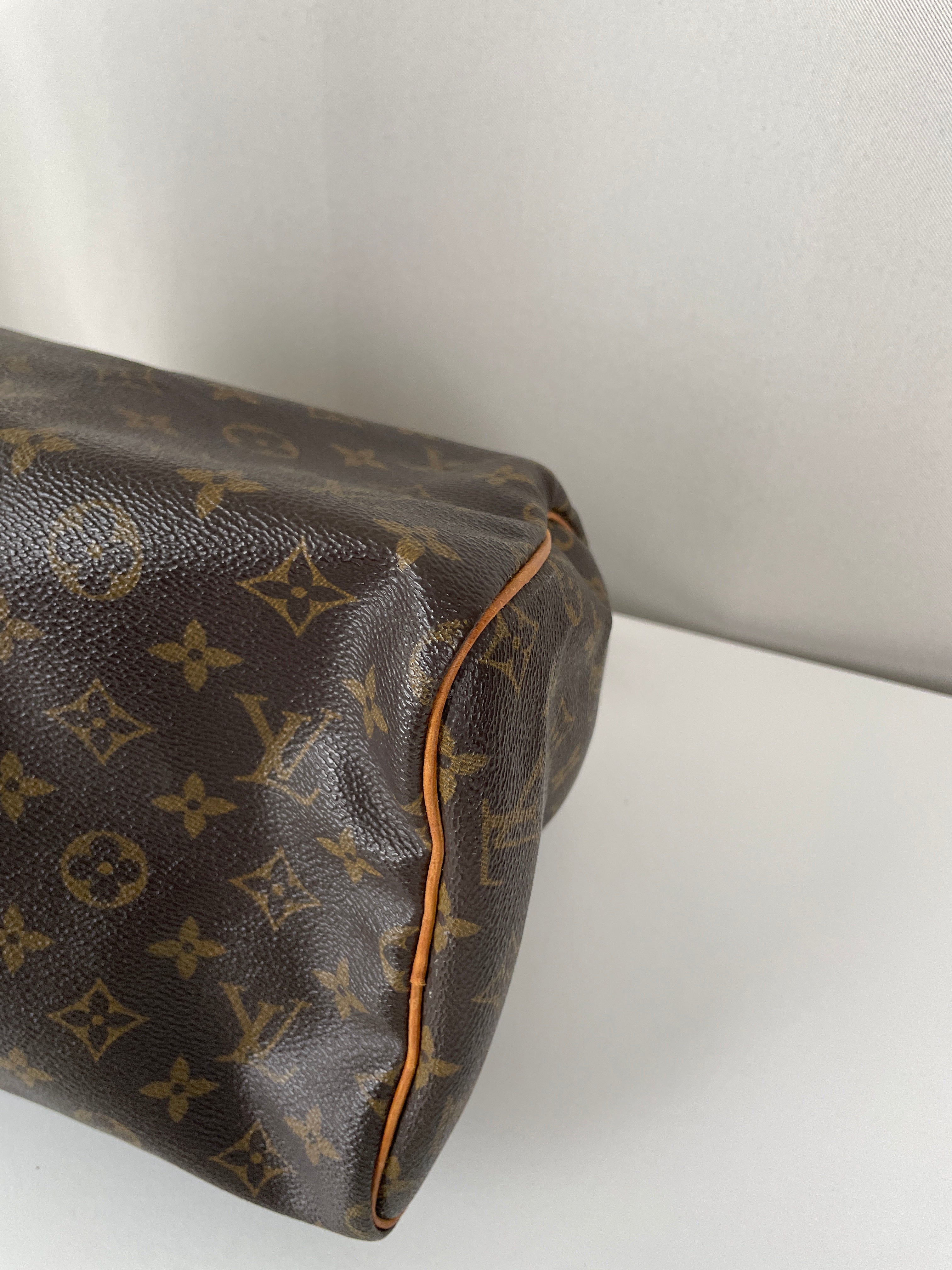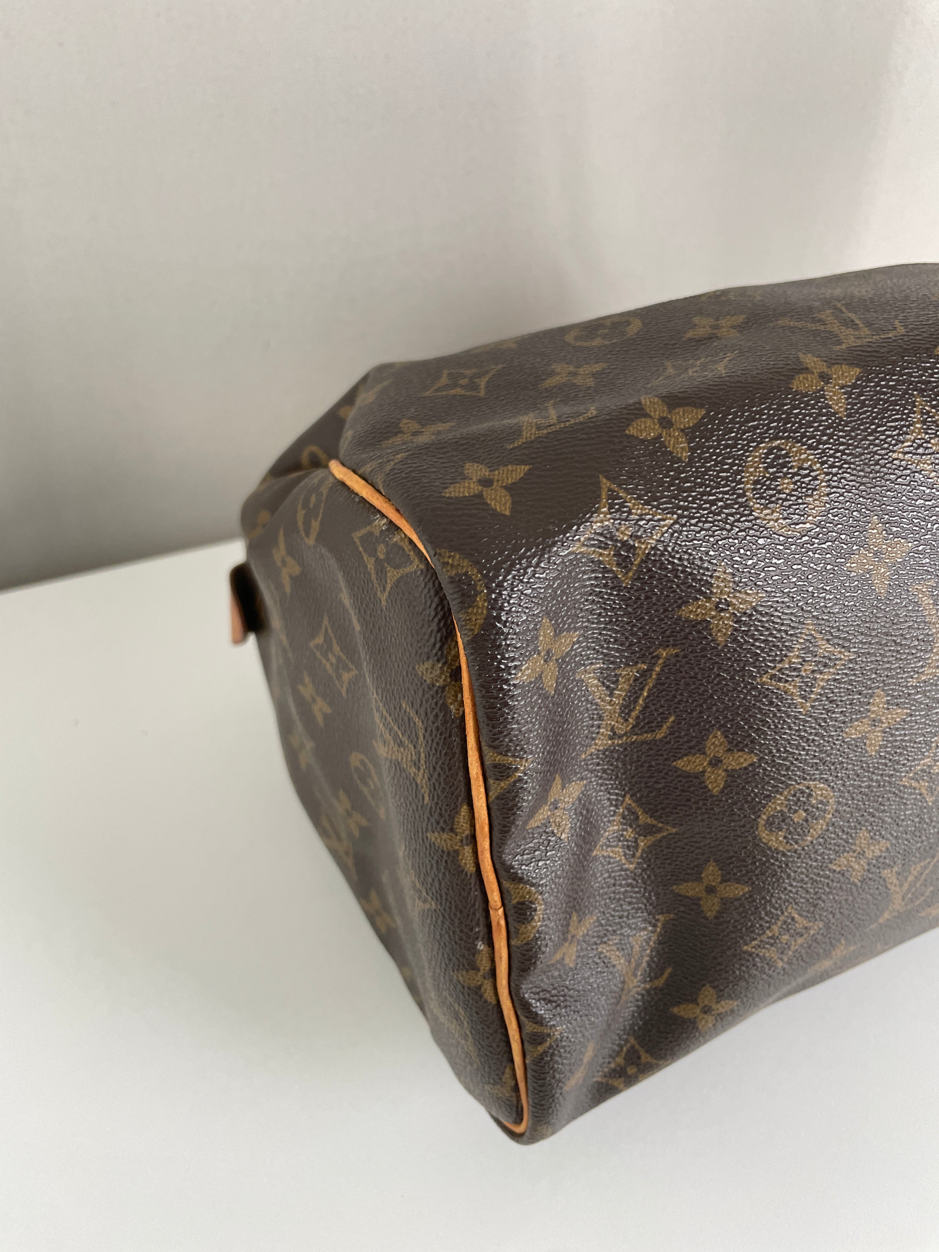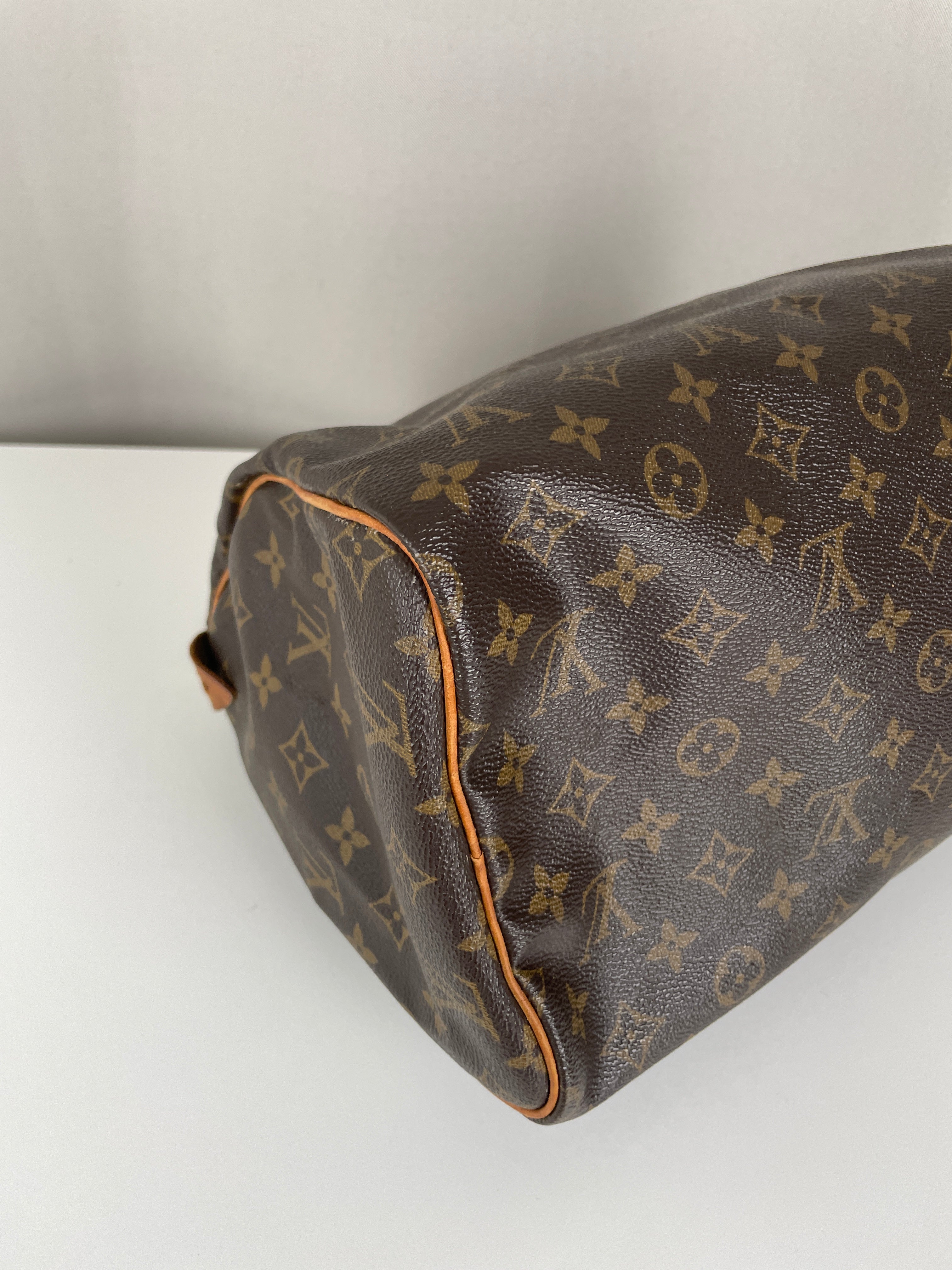 The Louis Vuitton Speedy 30 in Monogram canvas is an icon of luxury. Lightweight, spacious, and durable, it is ideal for everyday wear. This vintage piece remains beautifully preserved, with natural leather patina adding unique charm. A must-have for any luxury handbag collection.