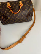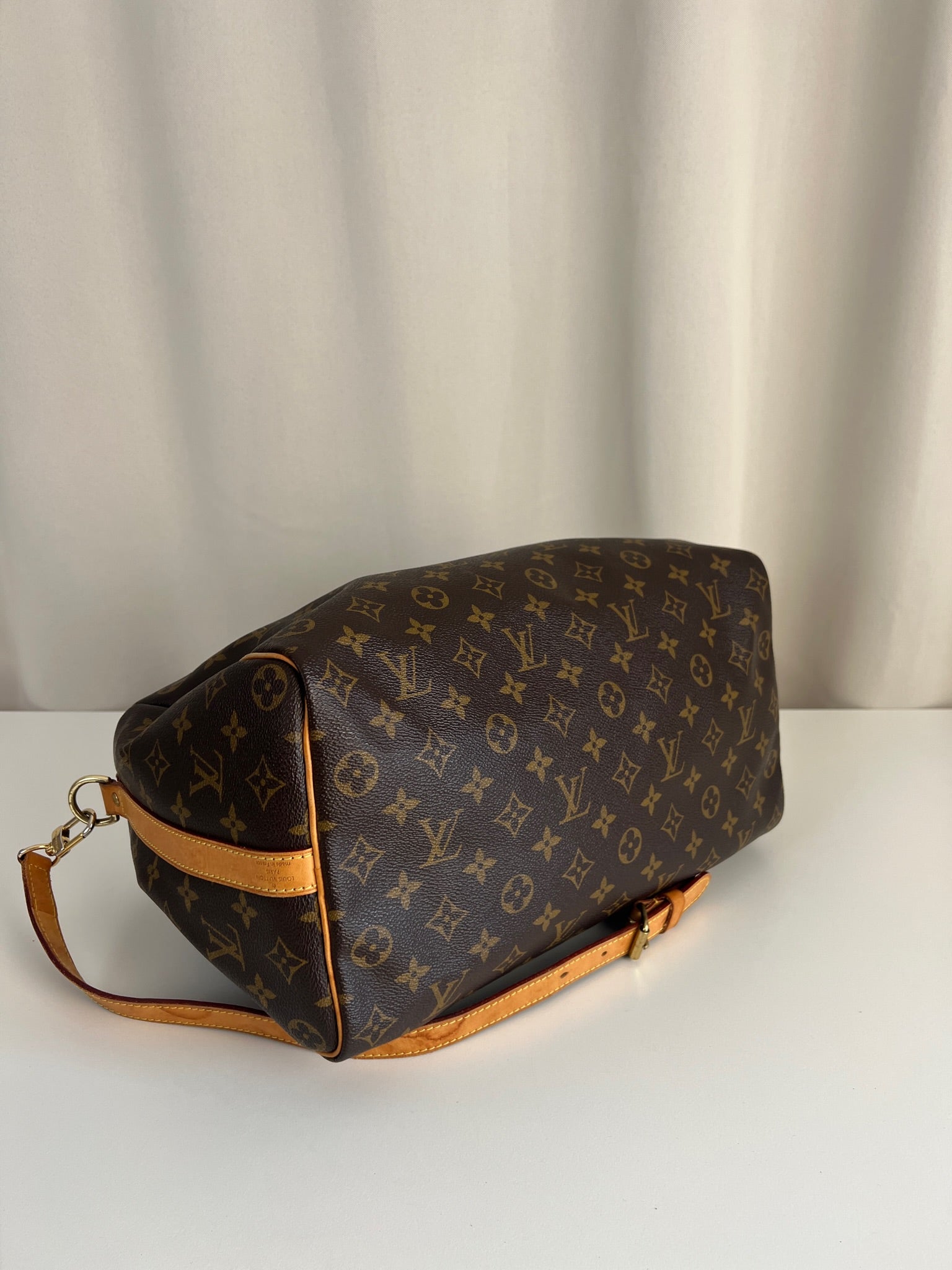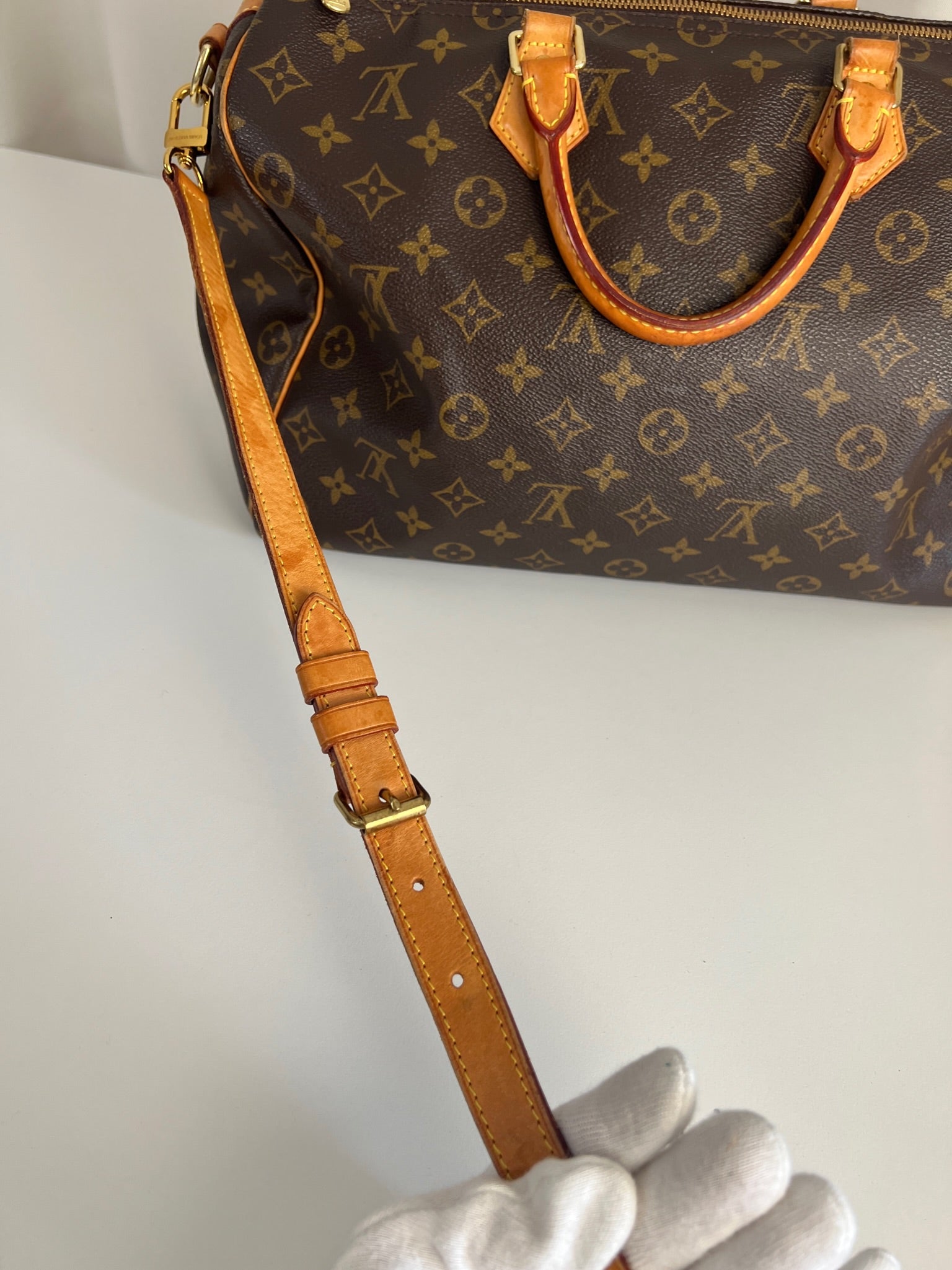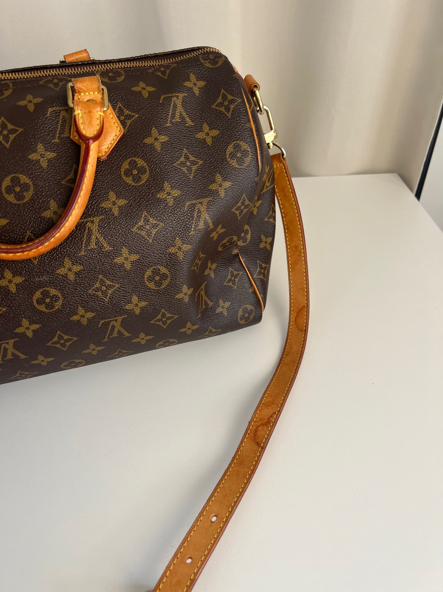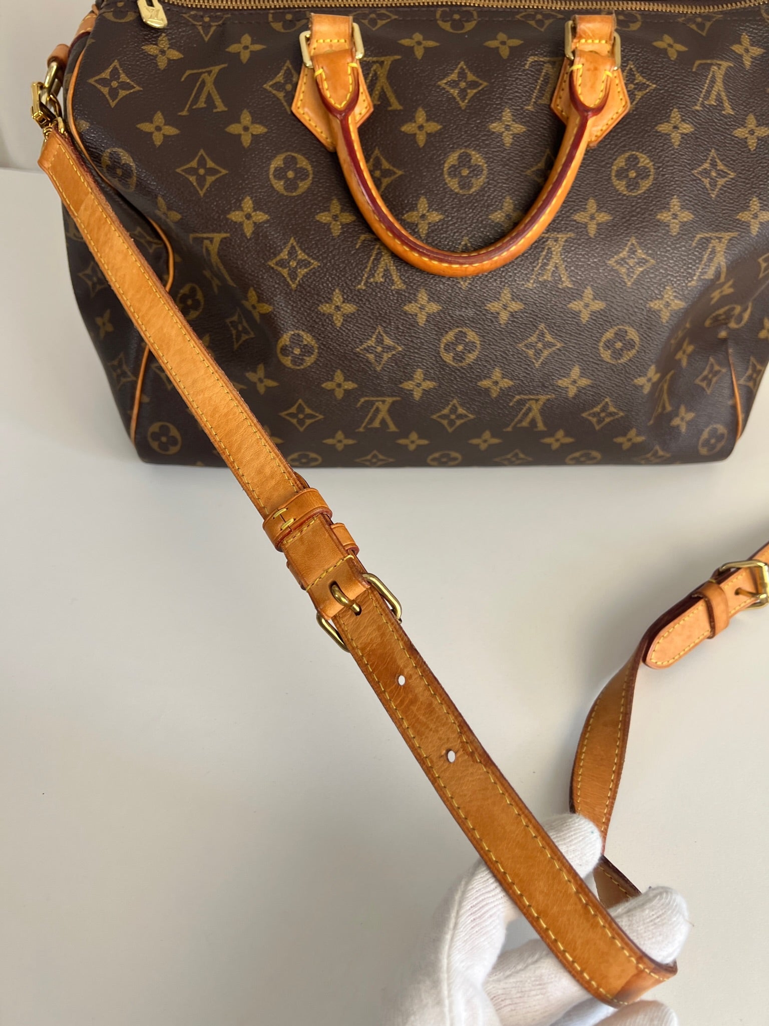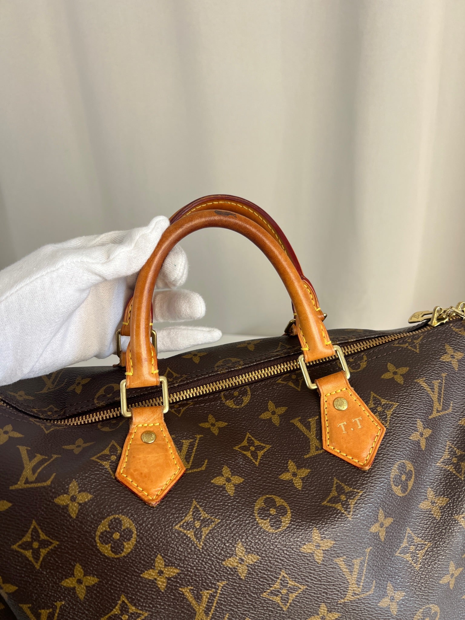This Louis Vuitton Speedy 35 Monogram with strap is in good condition. The corners are little bit rubbed. The leather parts have some stains. There are initial on the leather parts (T.T) but the gold is removed. The handles have some stains and trace of wear. the hardware is a little bit used. There are some little stains inside.