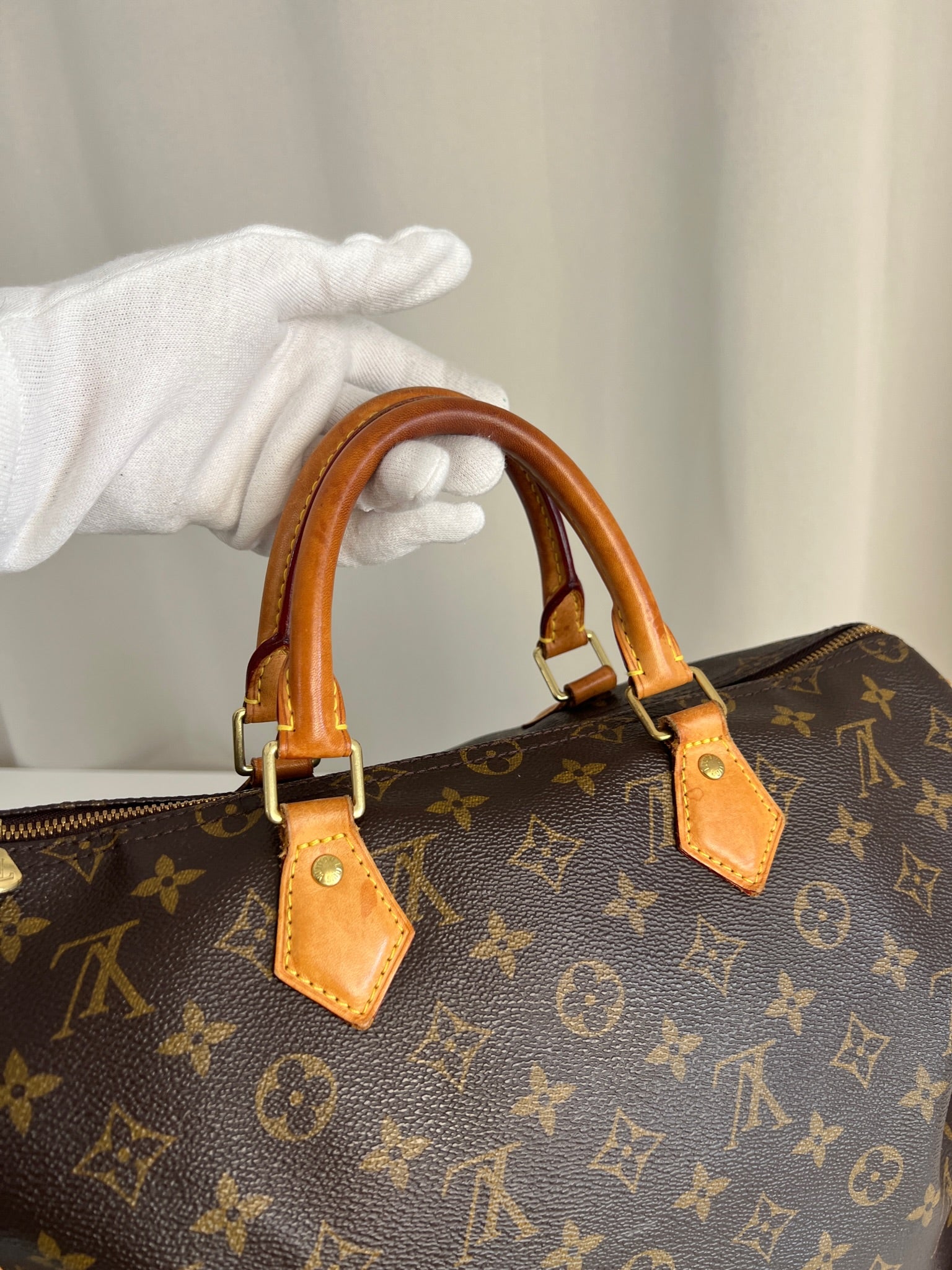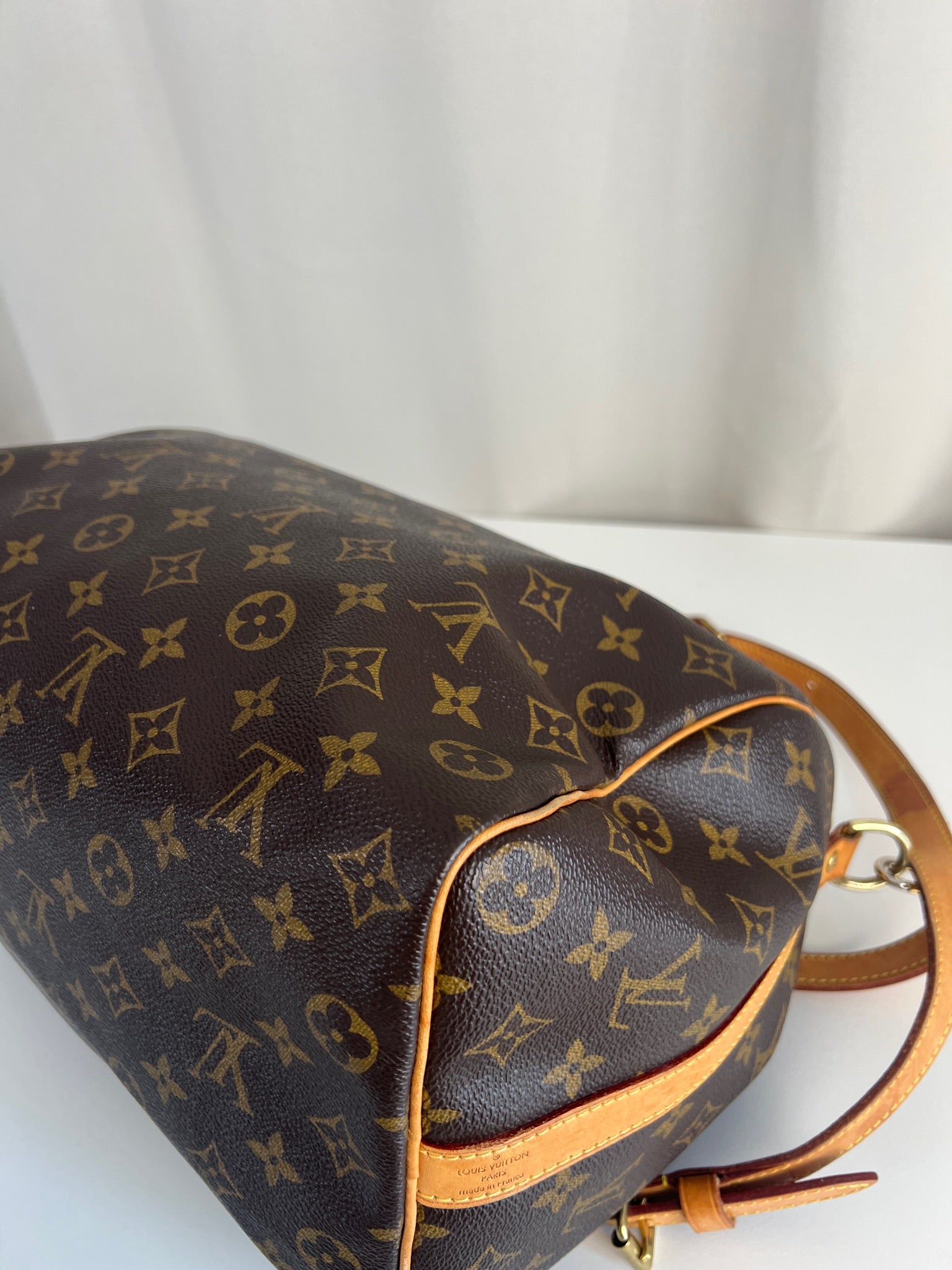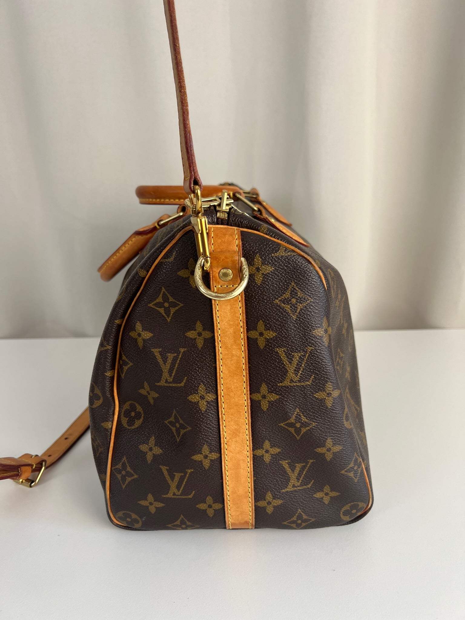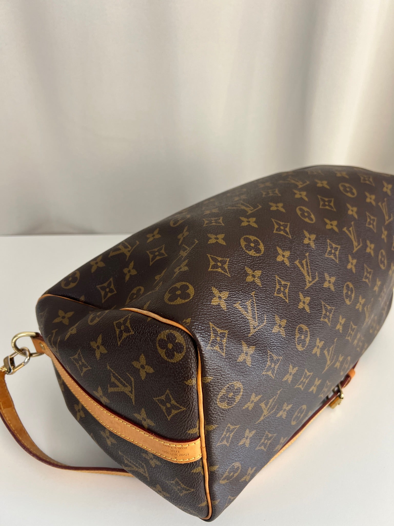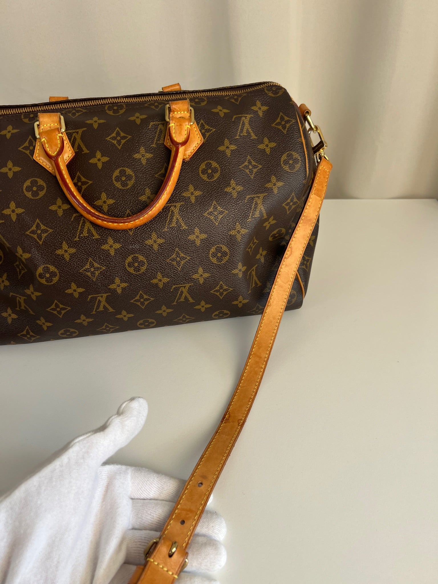 This Louis Vuitton Speedy 35 Monogram with strap is in good condition. The corners are little bit rubbed. The leather parts have some stains. There are initial on the leather parts (T.T) but the gold is removed. The handles have some stains and trace of wear. the hardware is a little bit used. There are some little stains inside.