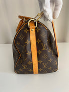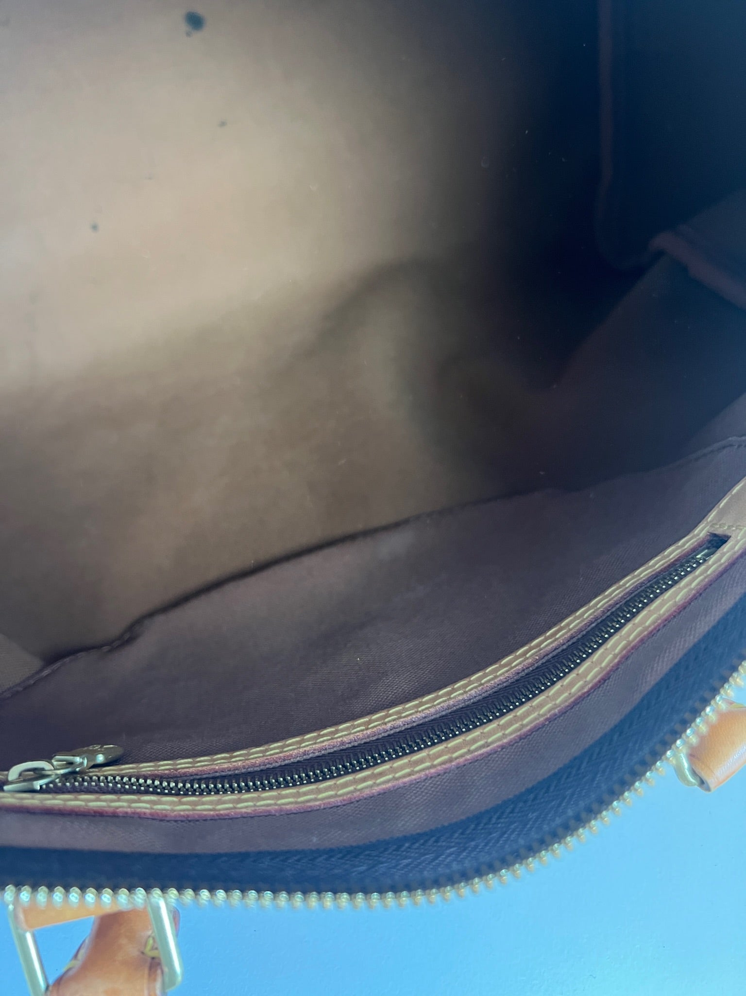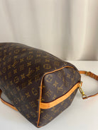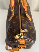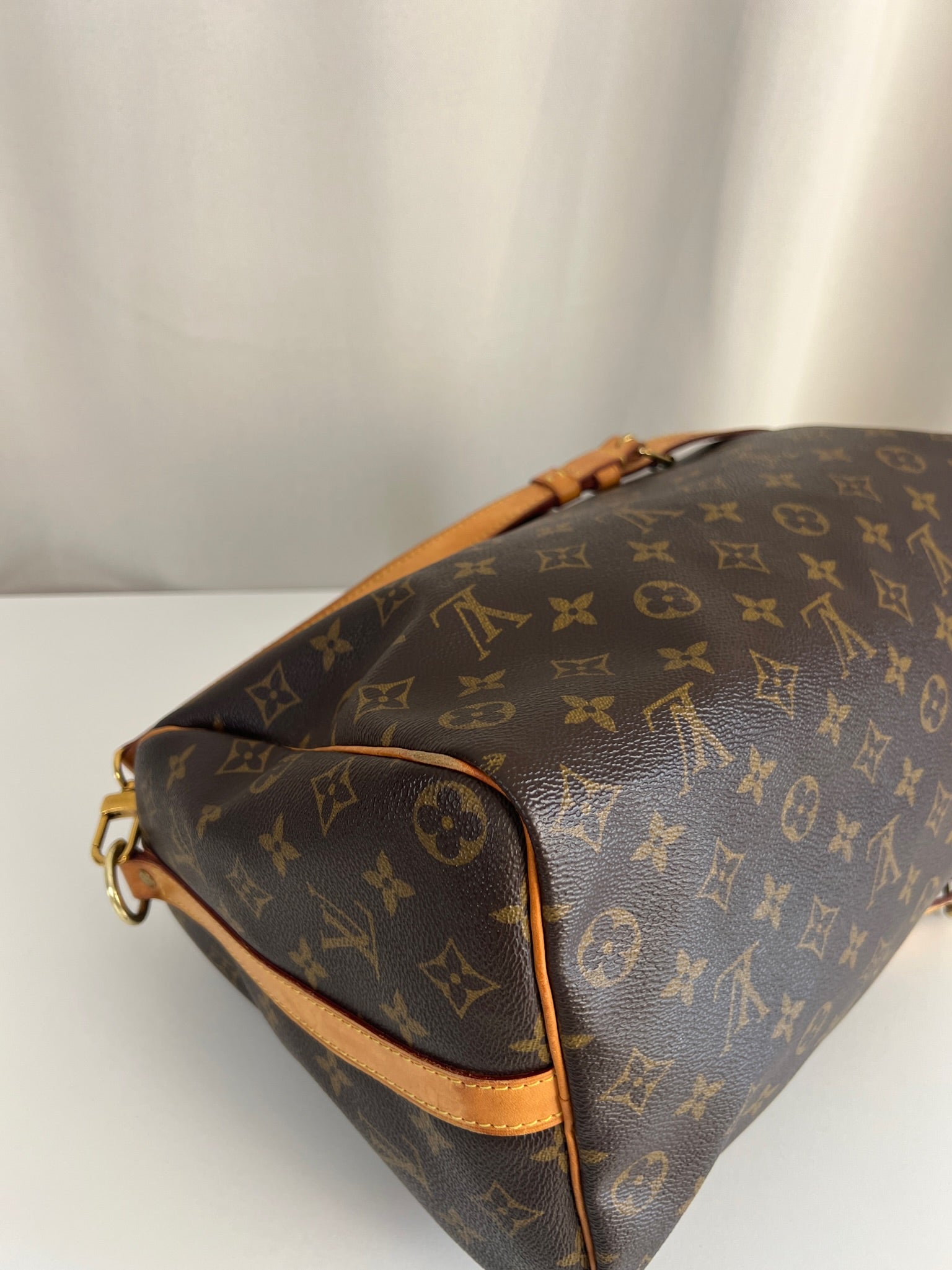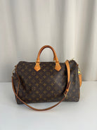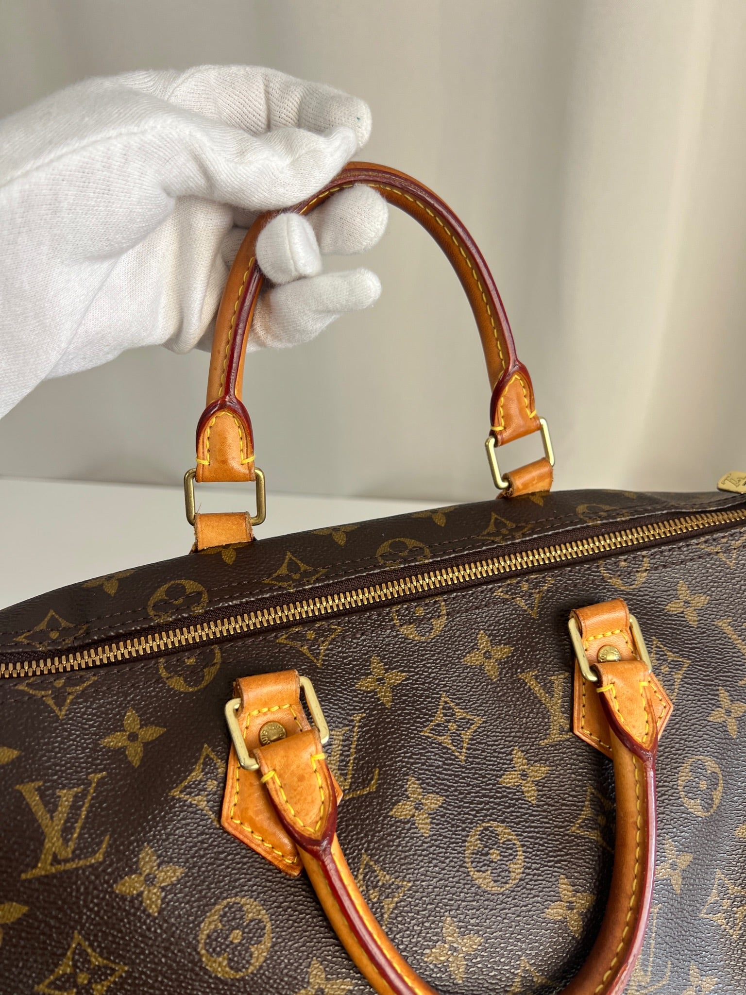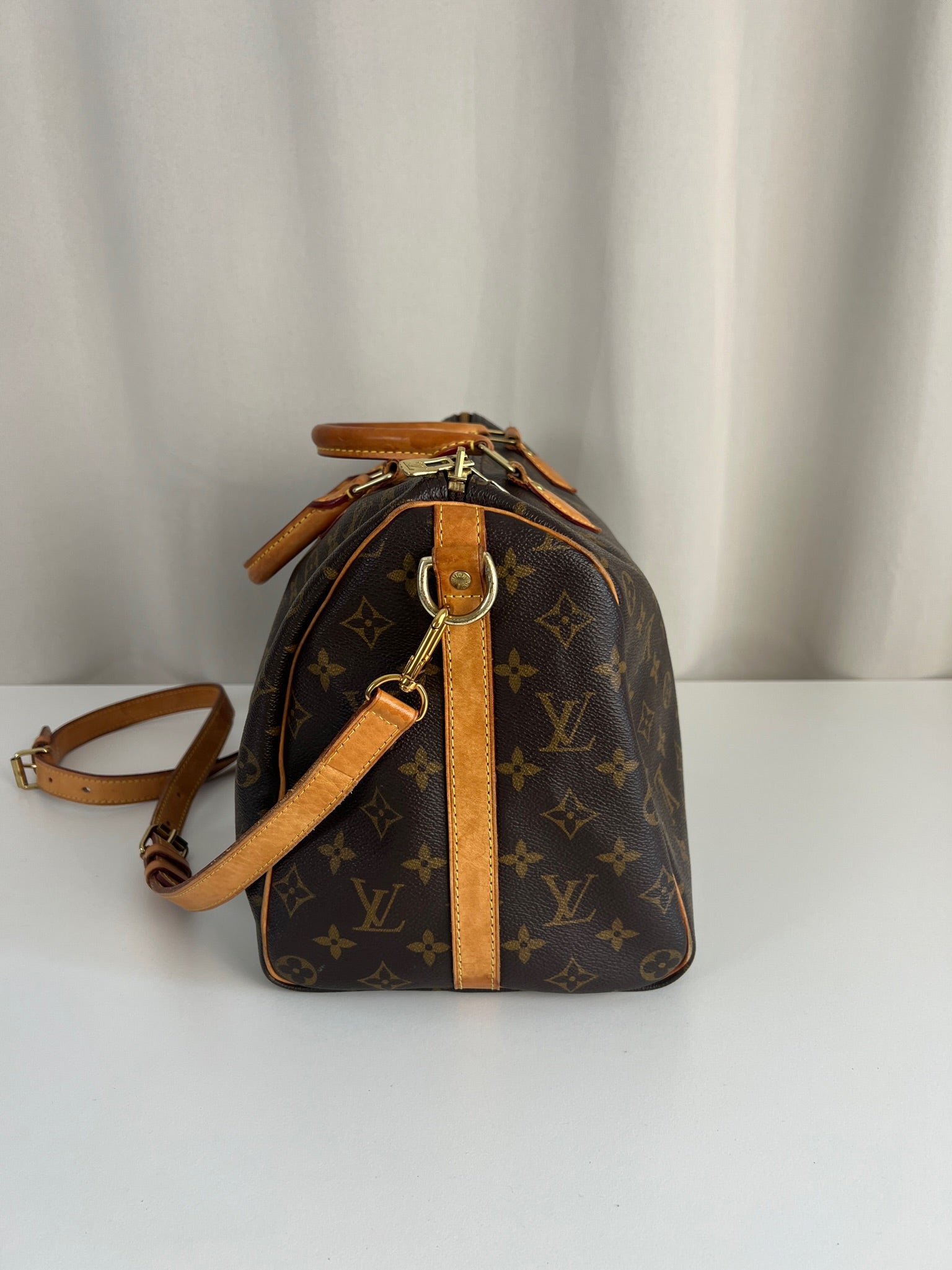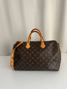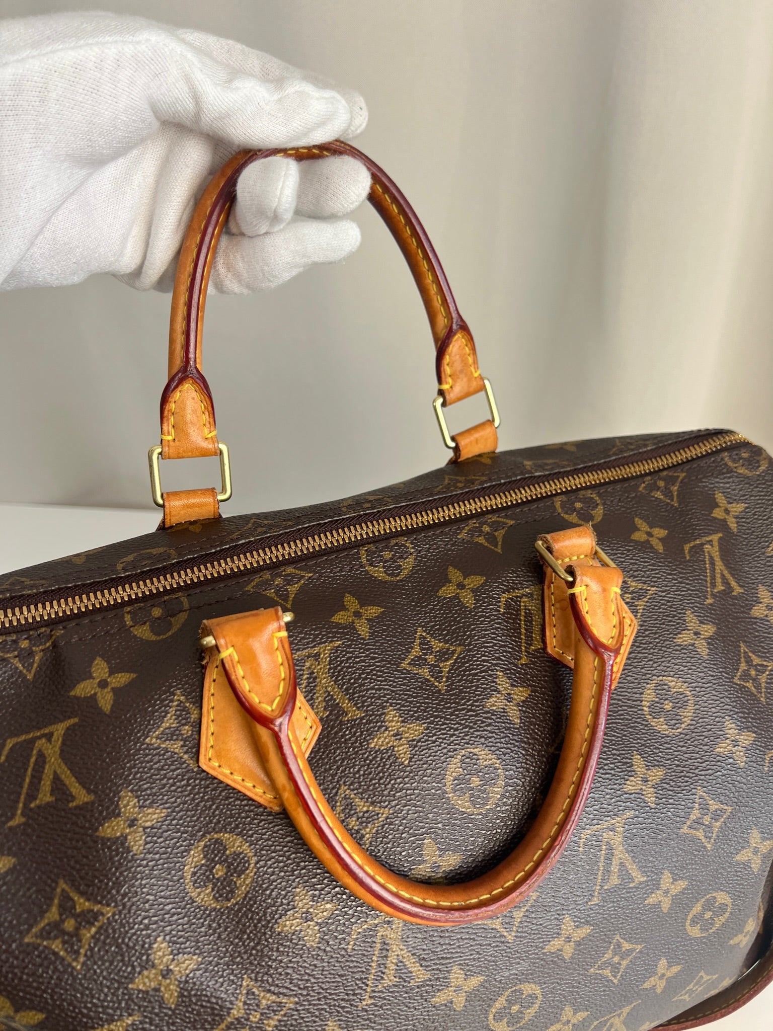 This Louis Vuitton Speedy 35 Monogram with strap is in good condition. The corners are little bit rubbed. The leather parts have some stains. There are initial on the leather parts (T.T) but the gold is removed. The handles have some stains and trace of wear. the hardware is a little bit used. There are some little stains inside.