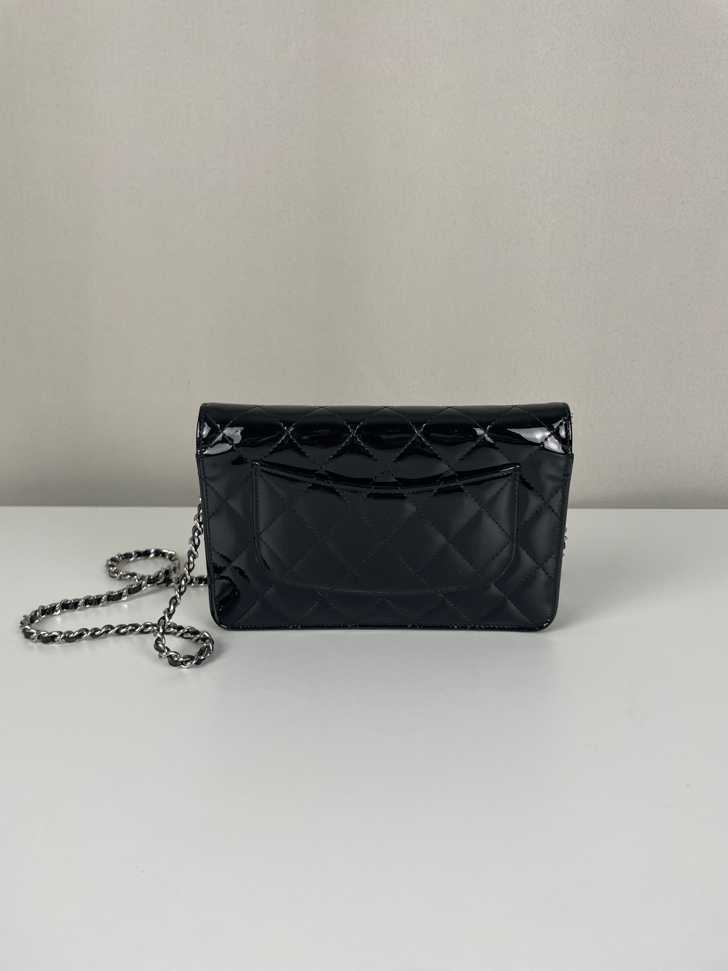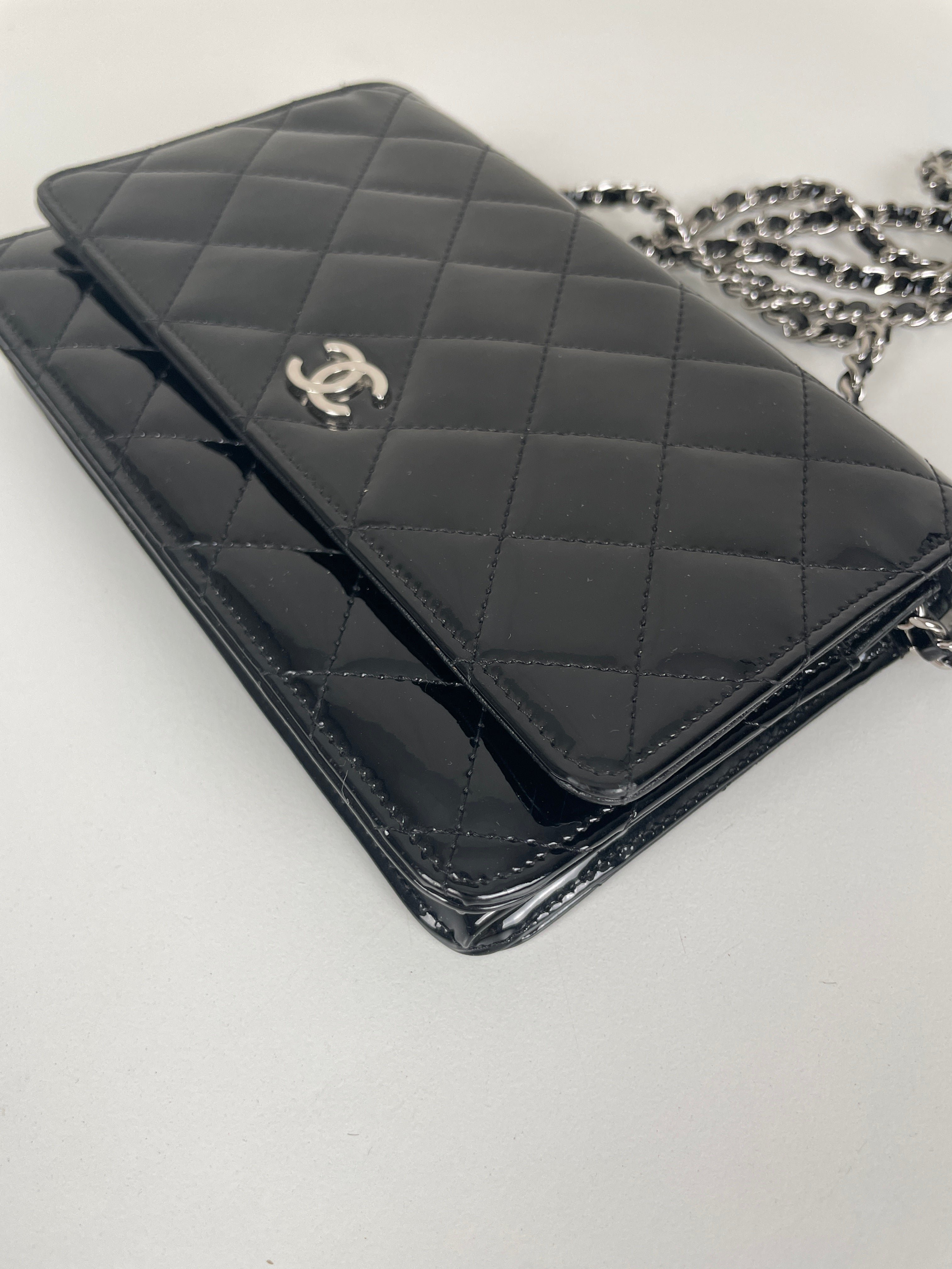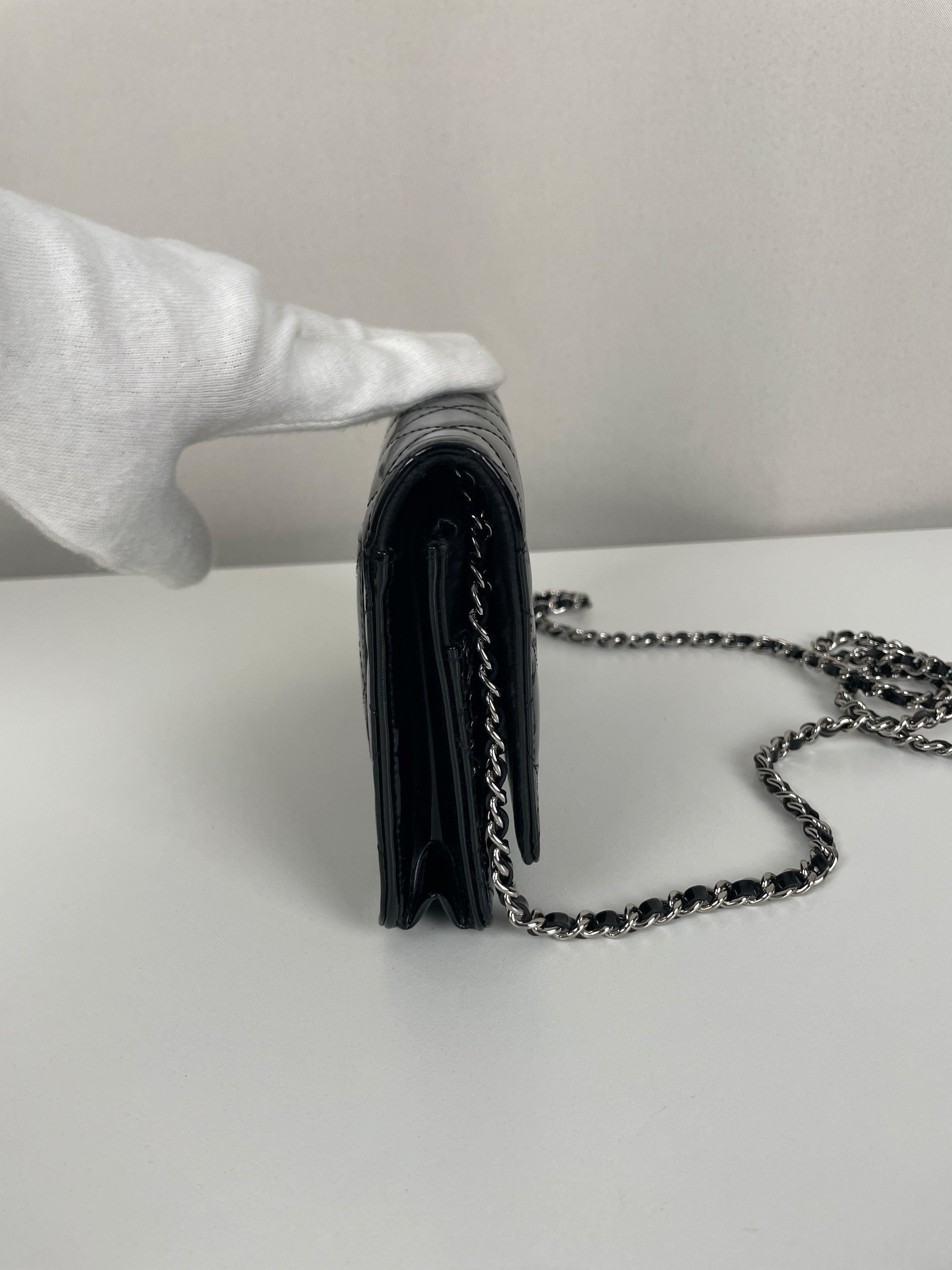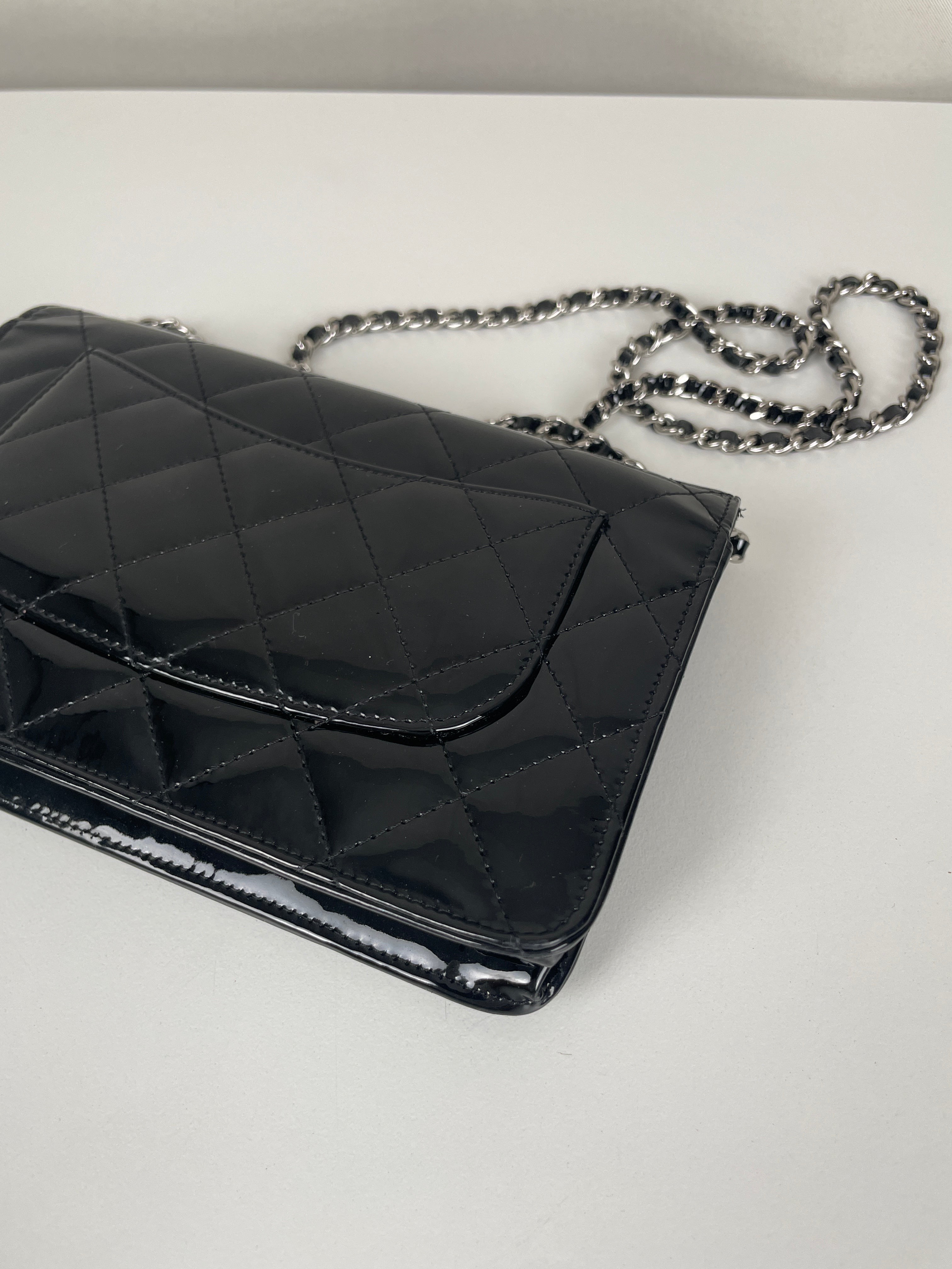 Chanel WOC black patent leather wallet on chain silver hardware