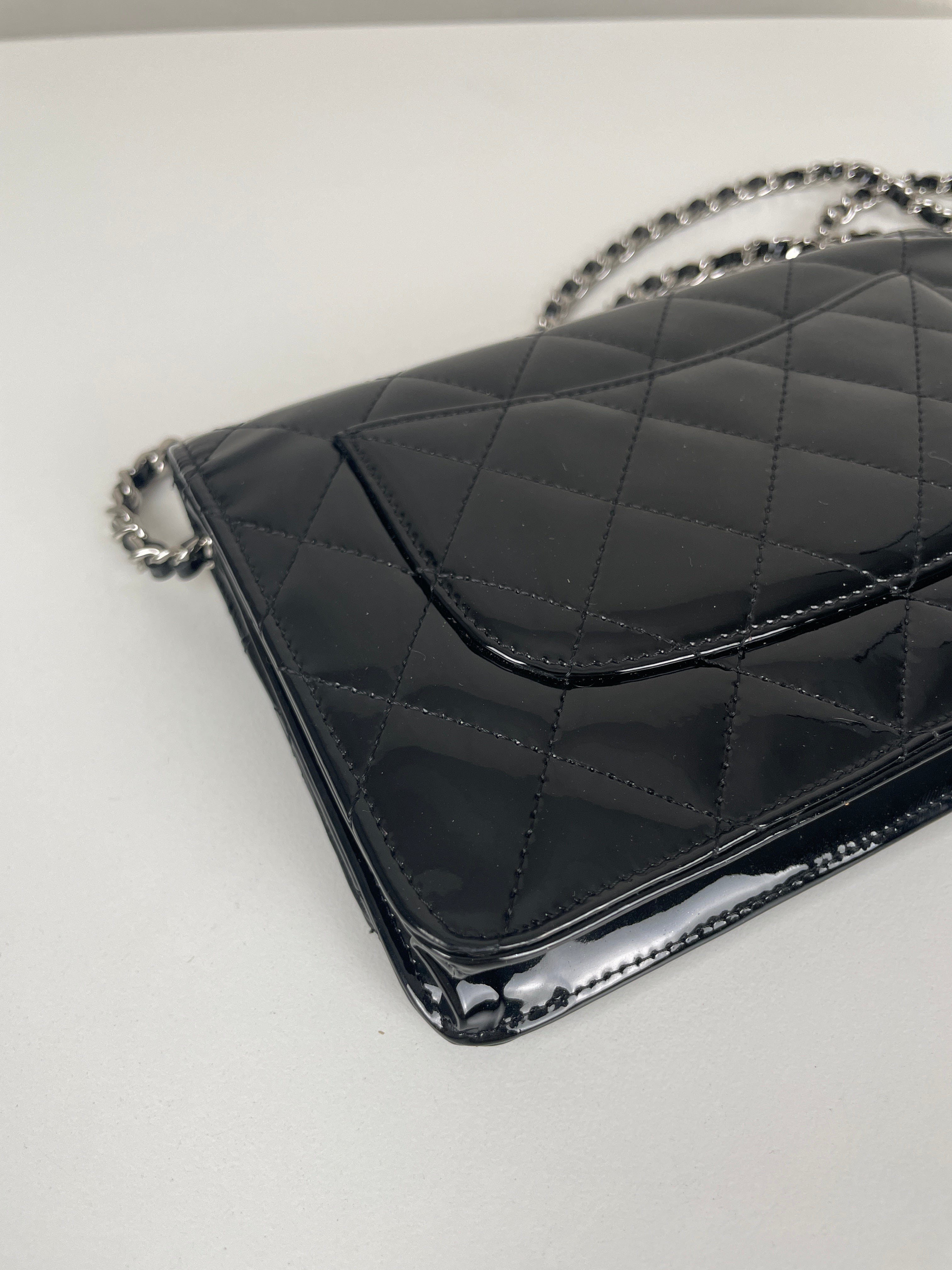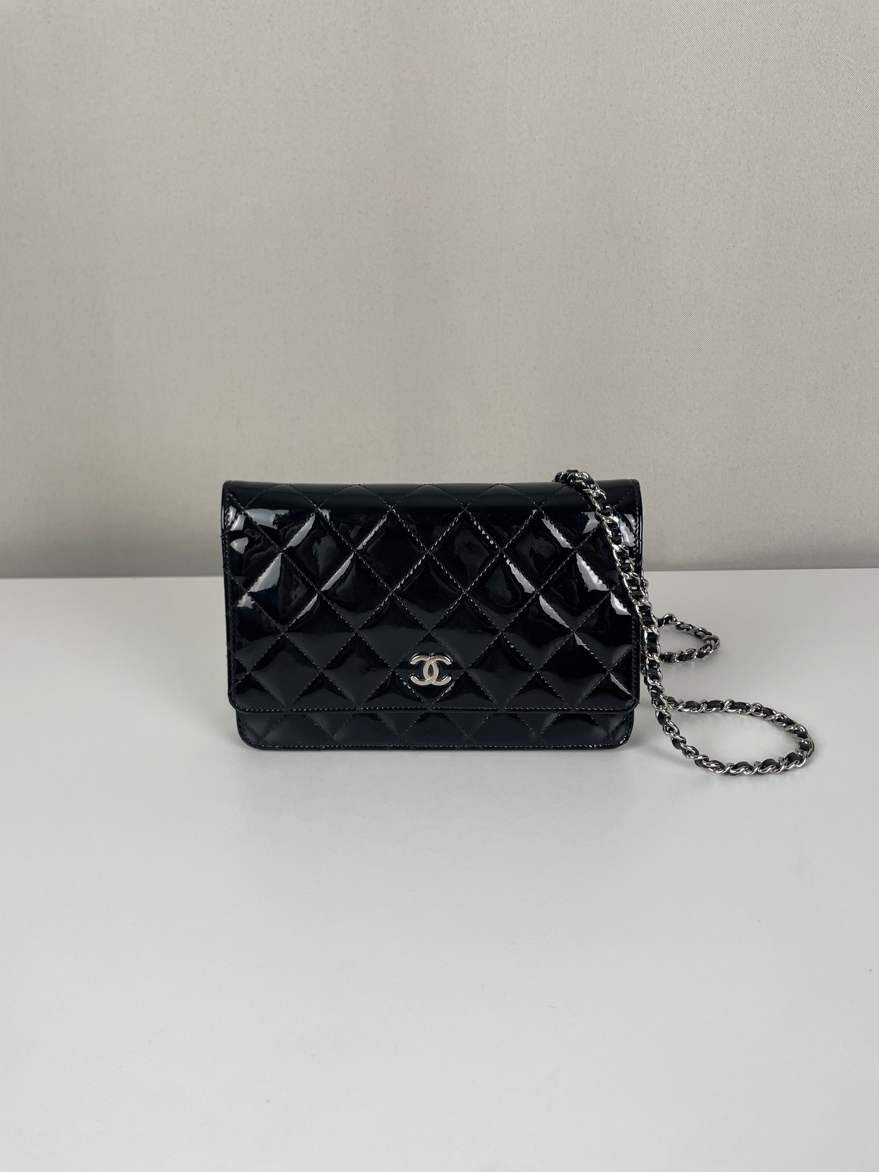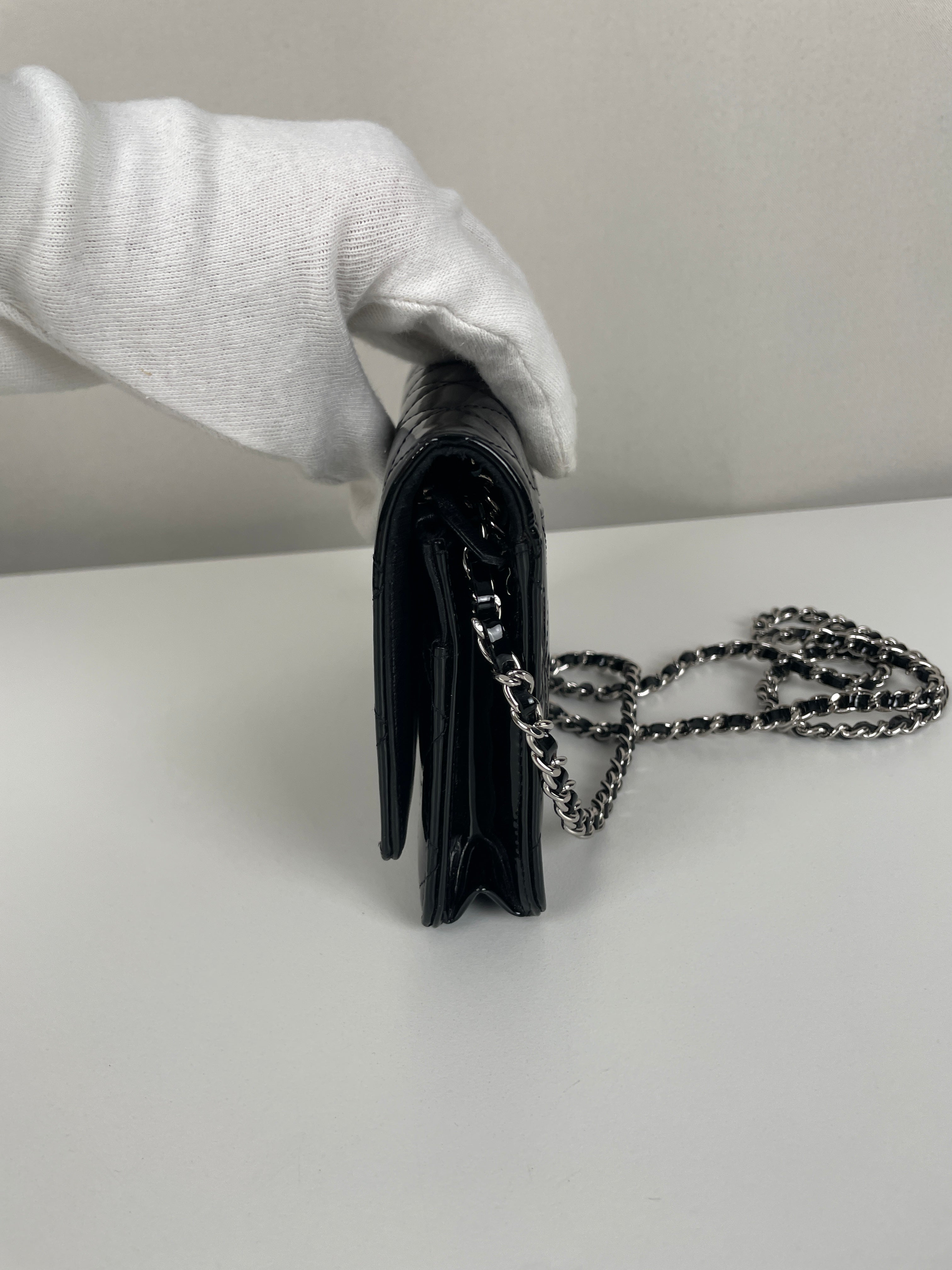 Chanel WOC black patent leather wallet on chain silver hardware