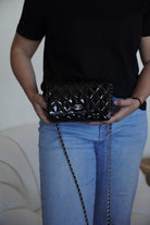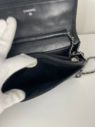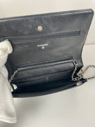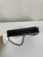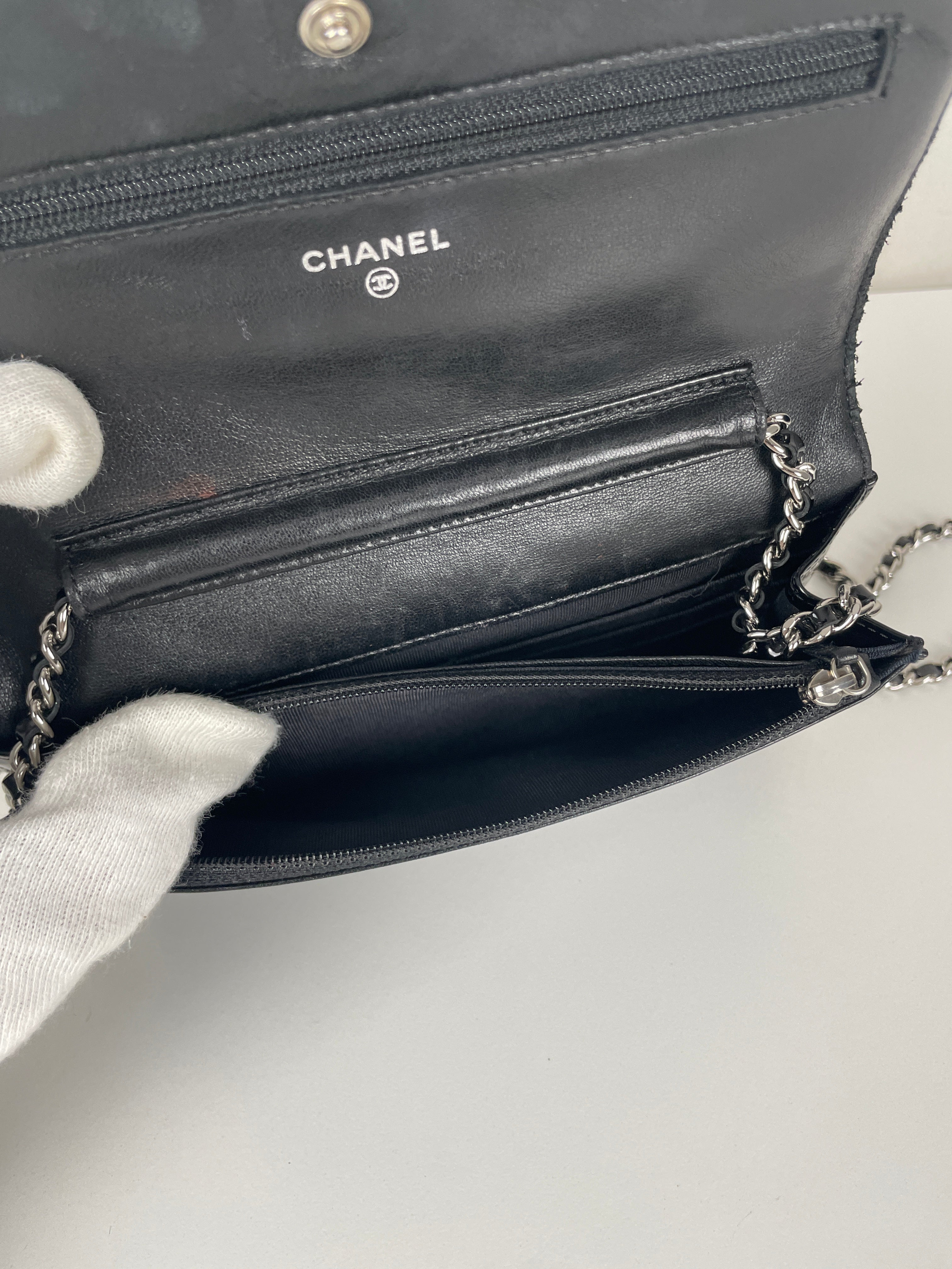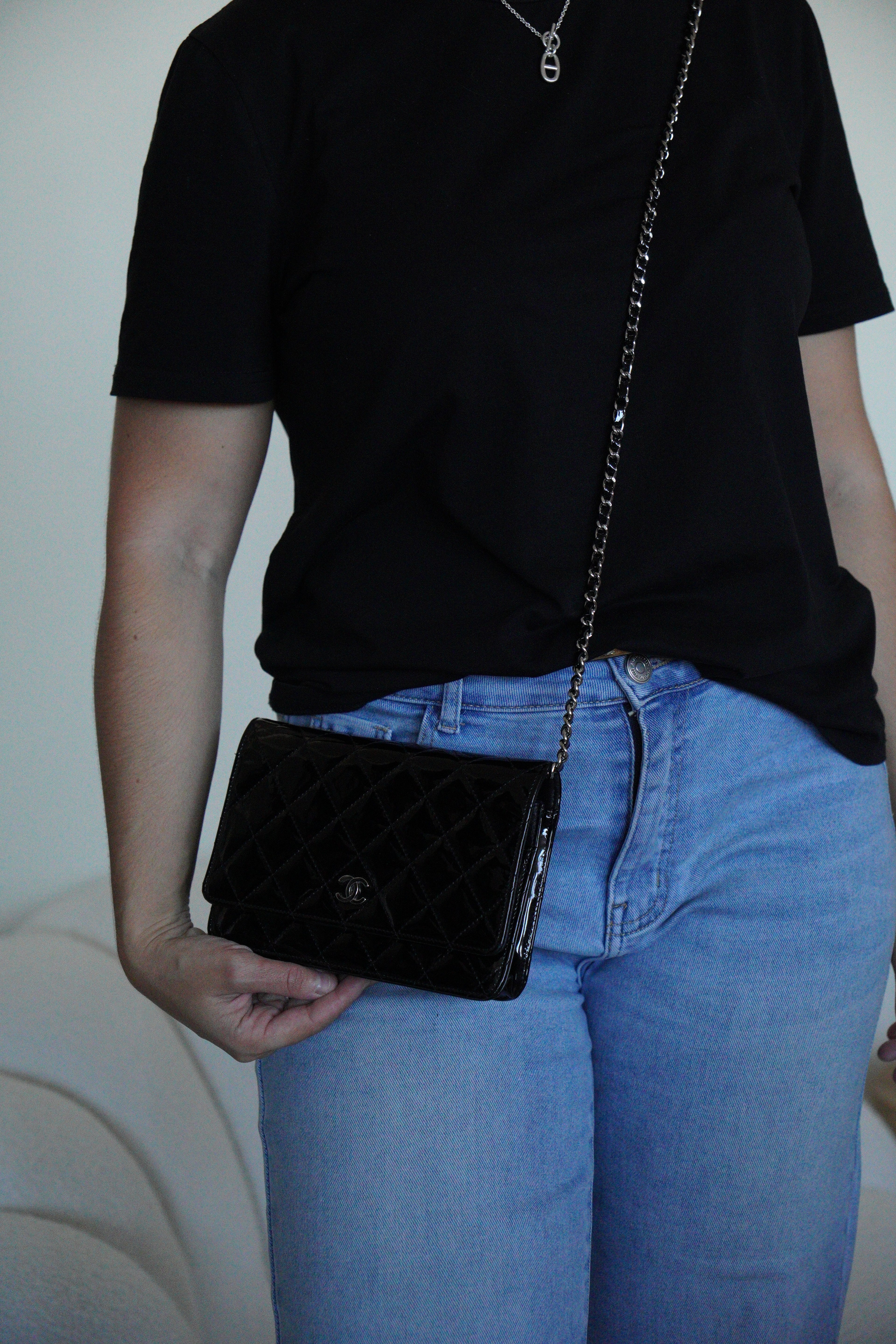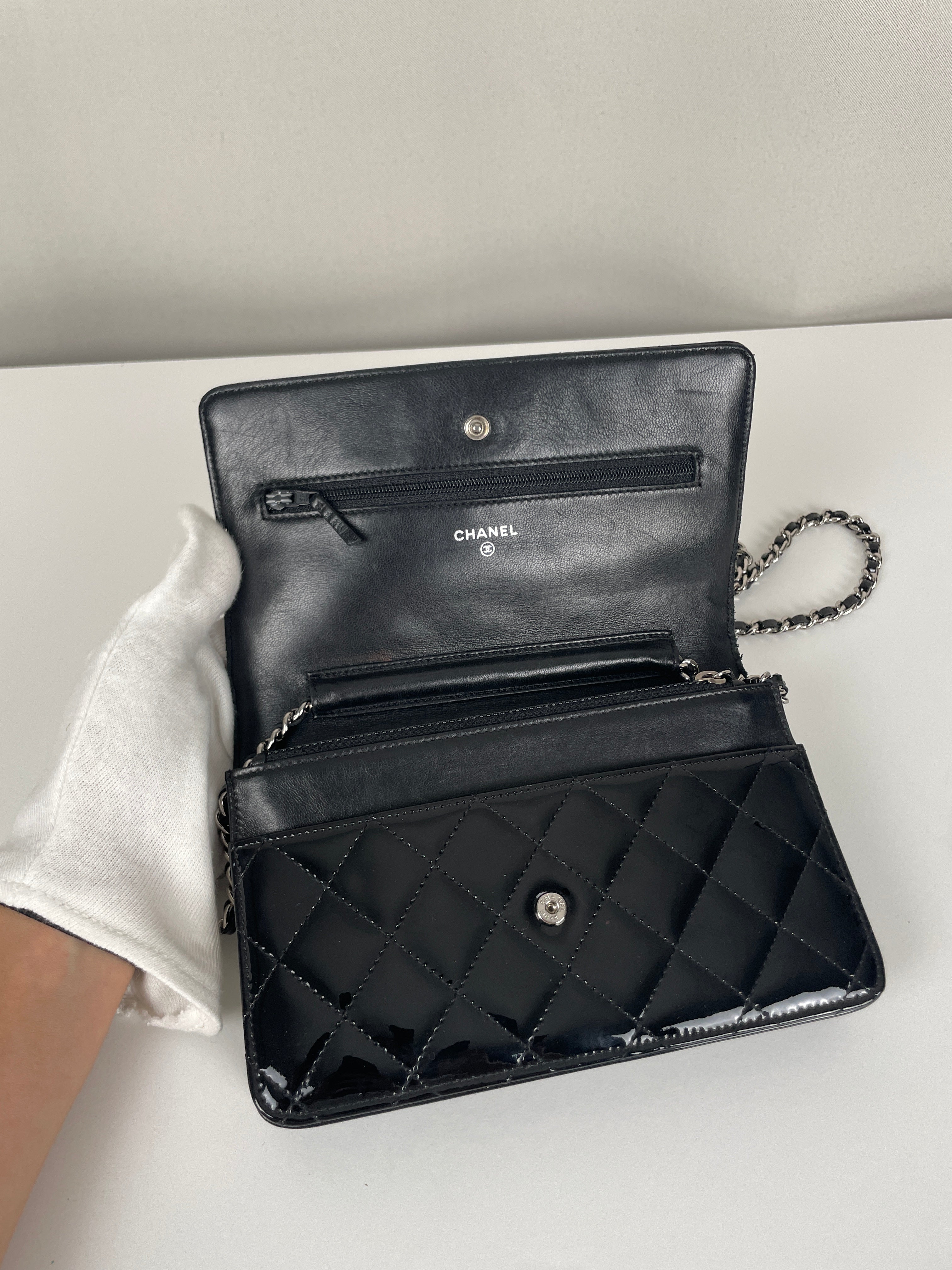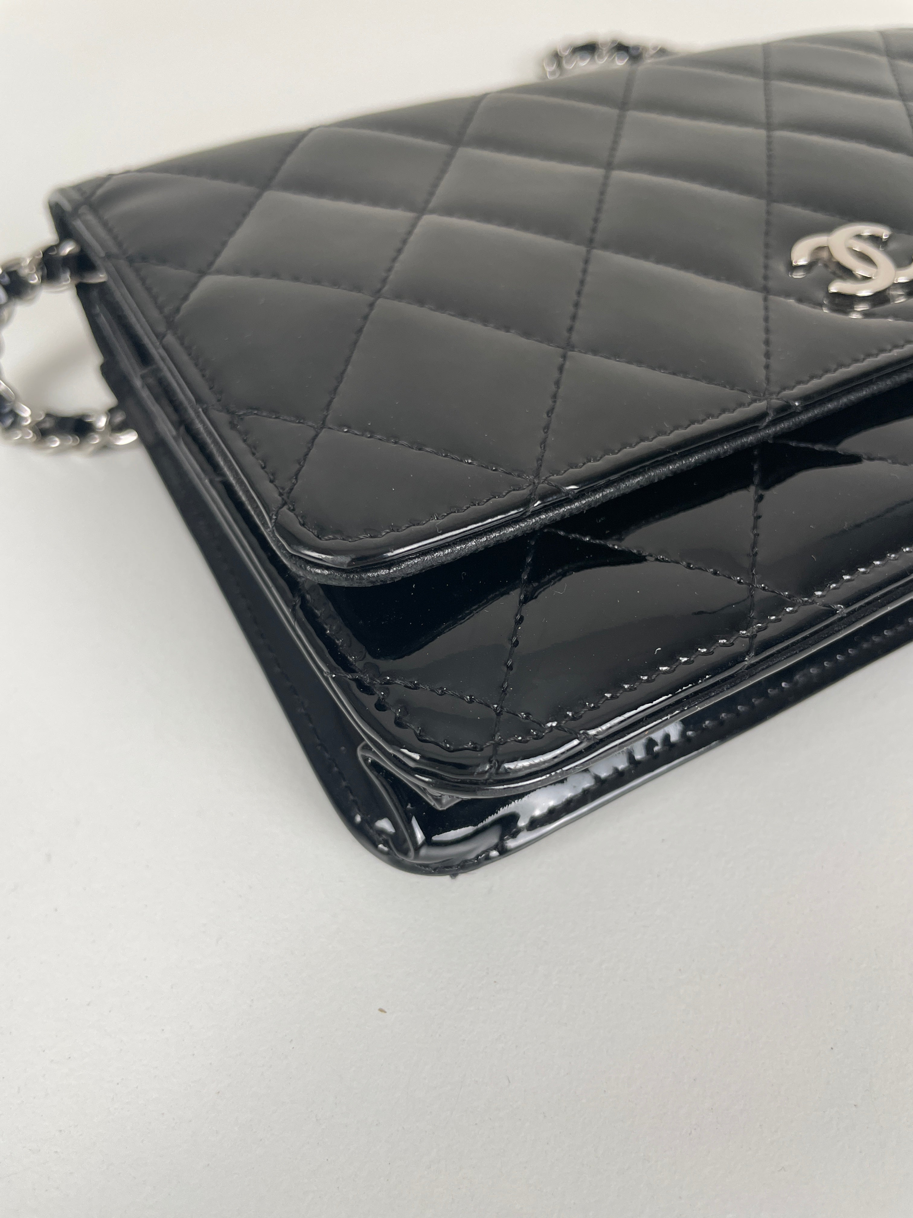 Chanel WOC black patent leather wallet on chain silver hardware