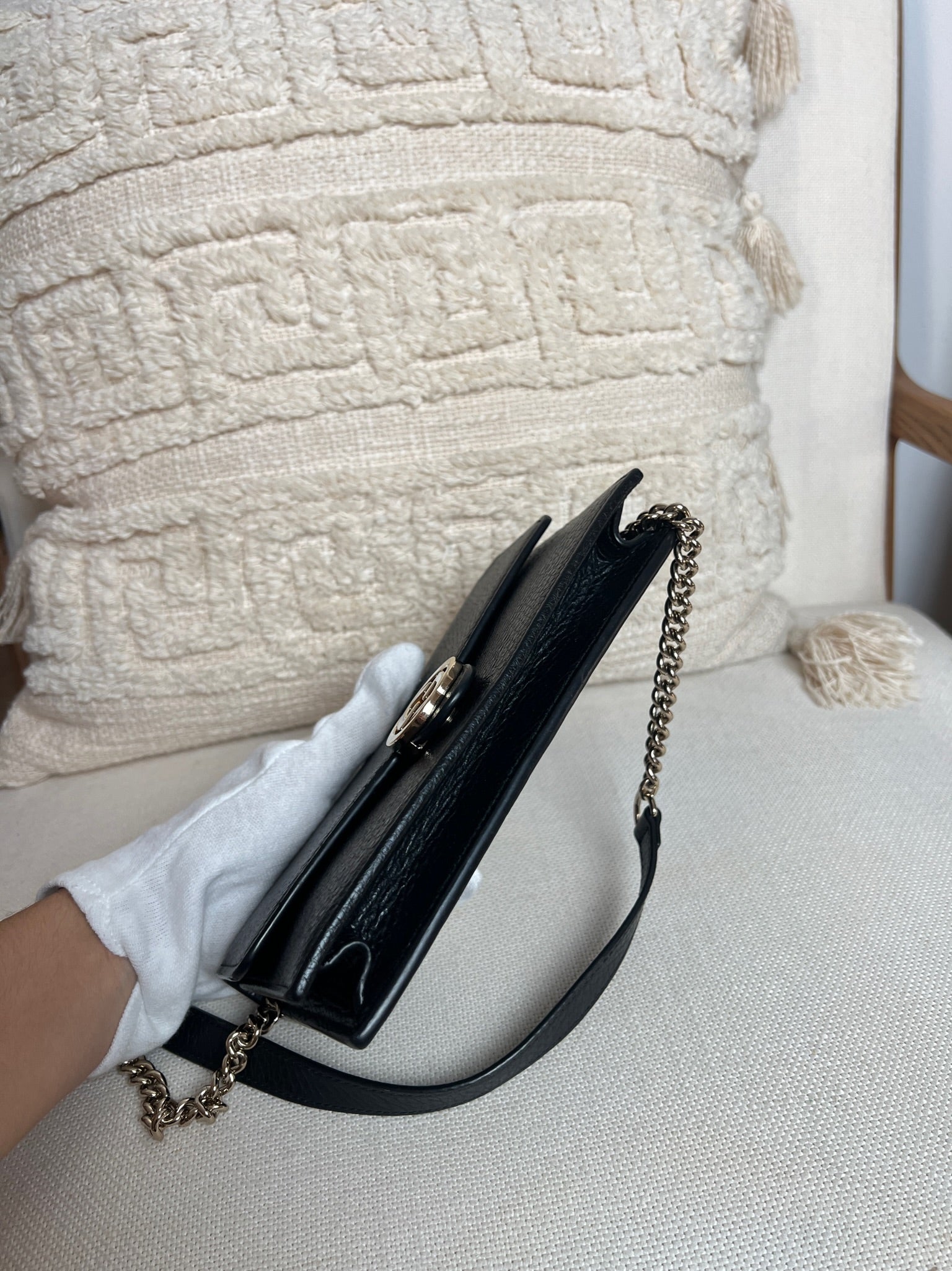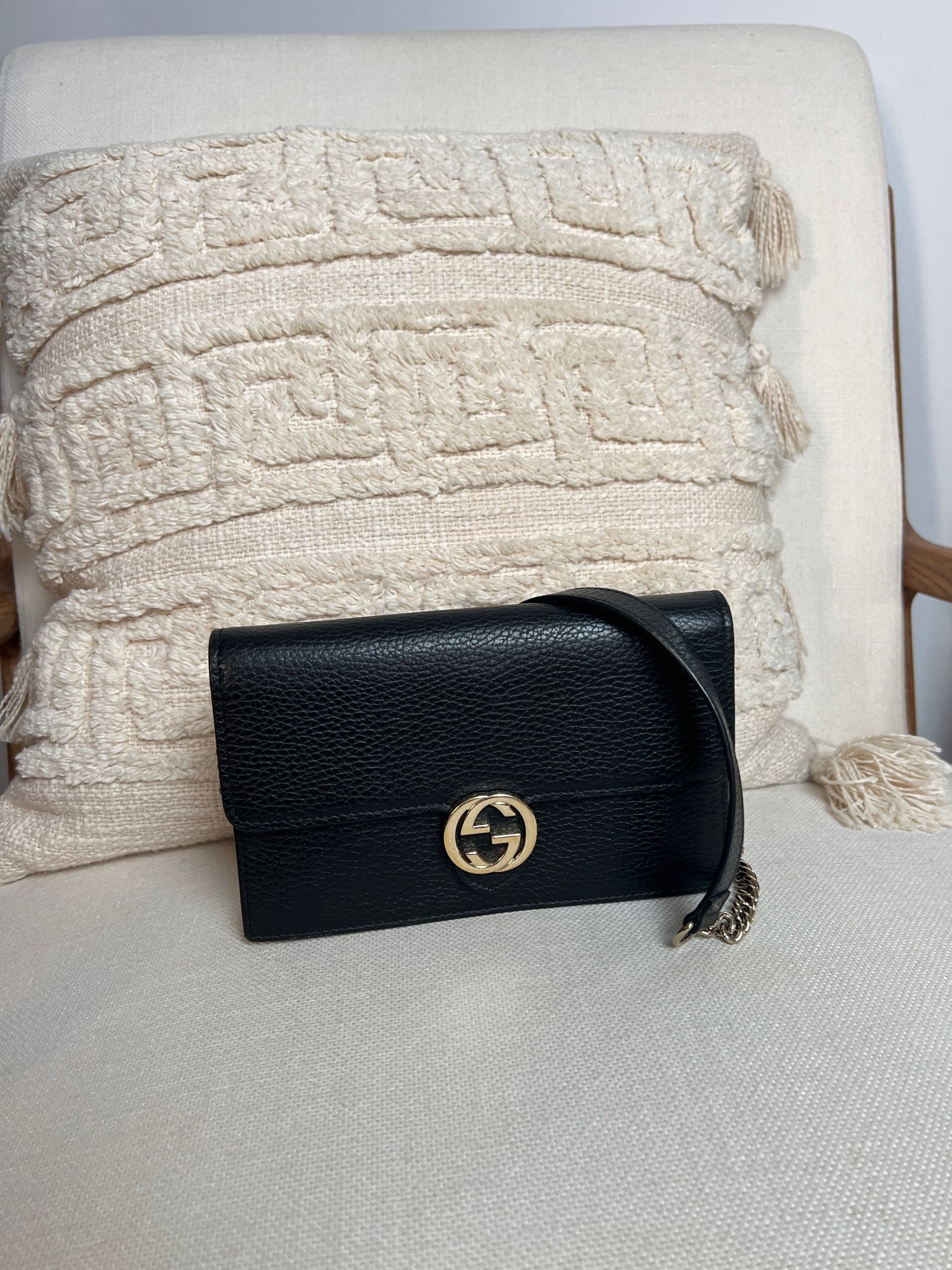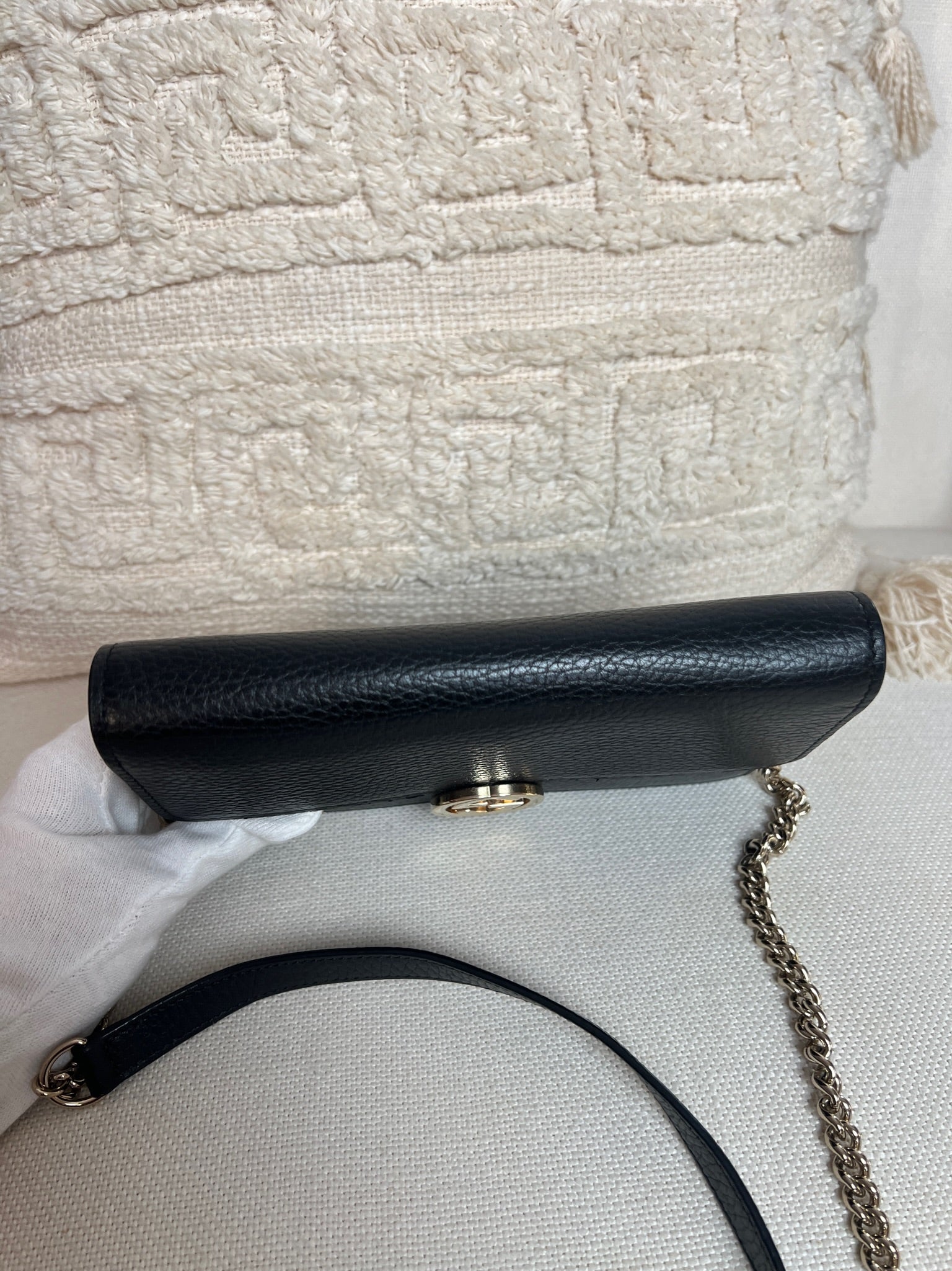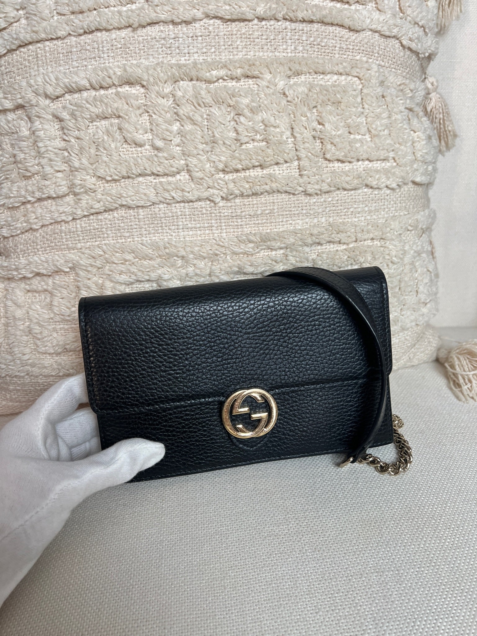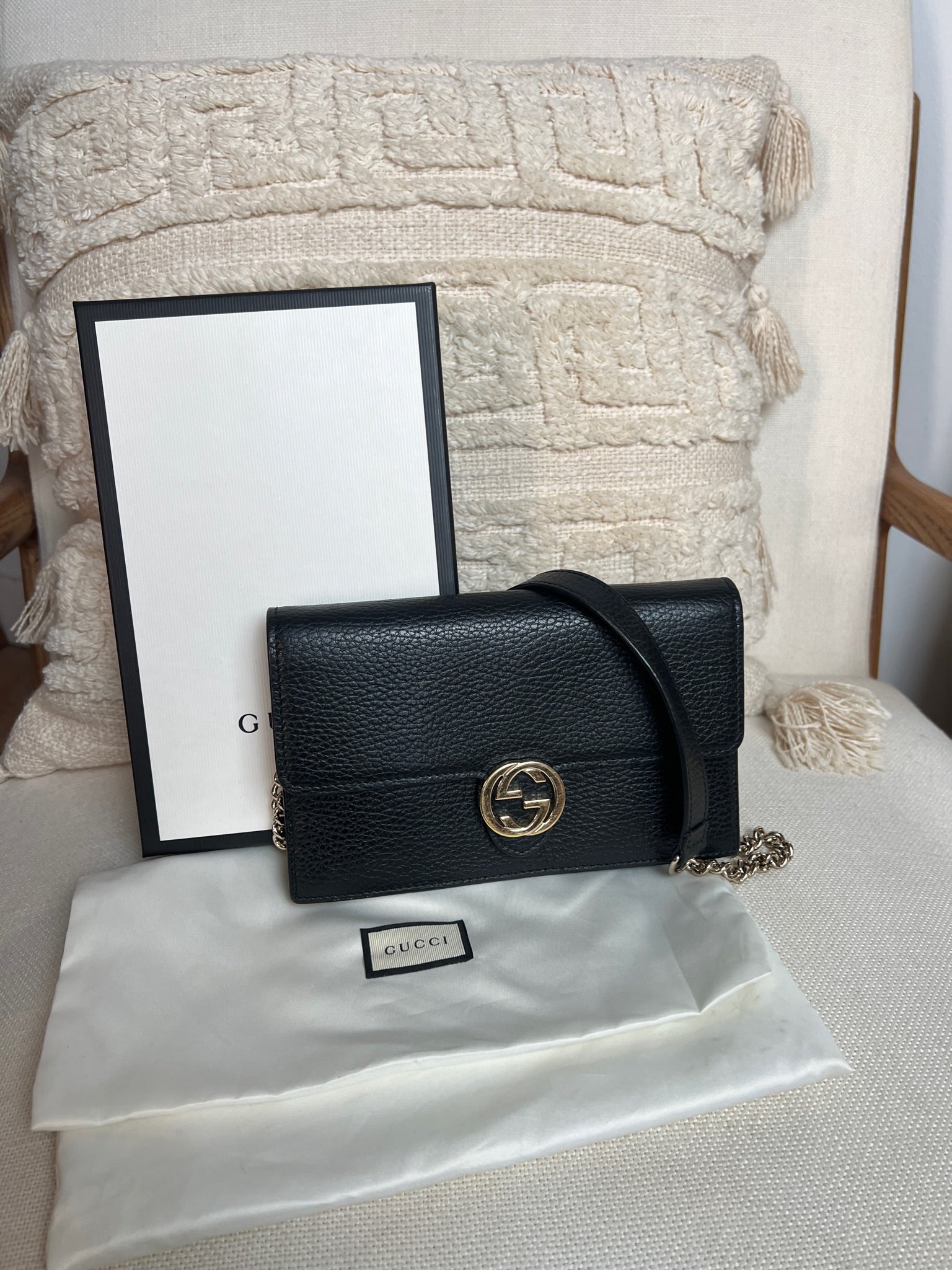This Gucci bag wallet on chain interlocking g chain is in very good condition almost as new. The leather is in very good condition. The inside of the bag is also in perfect condition. The chain and metal parts are also in very good condition. This bag comes with box and its own dust bag.