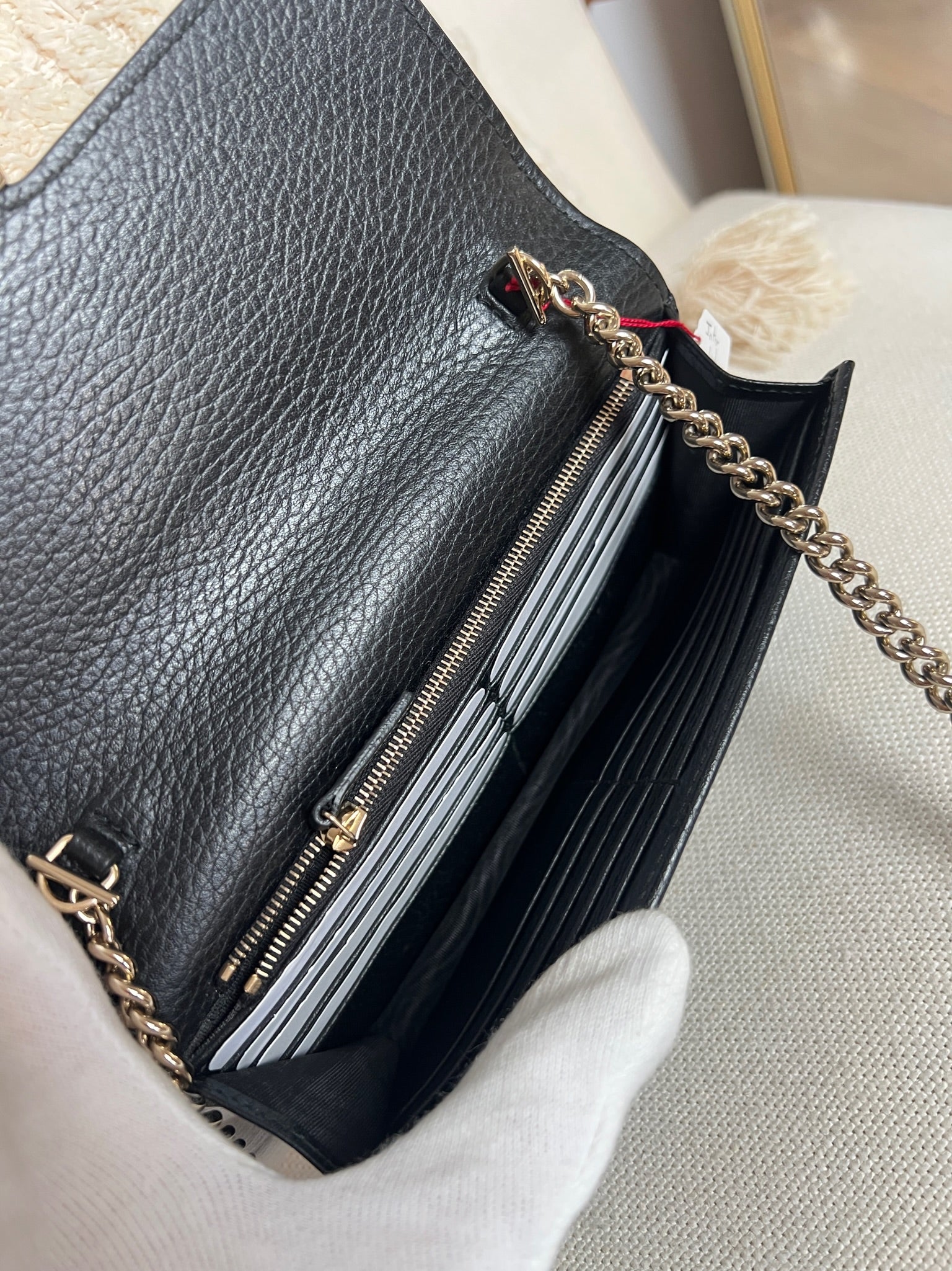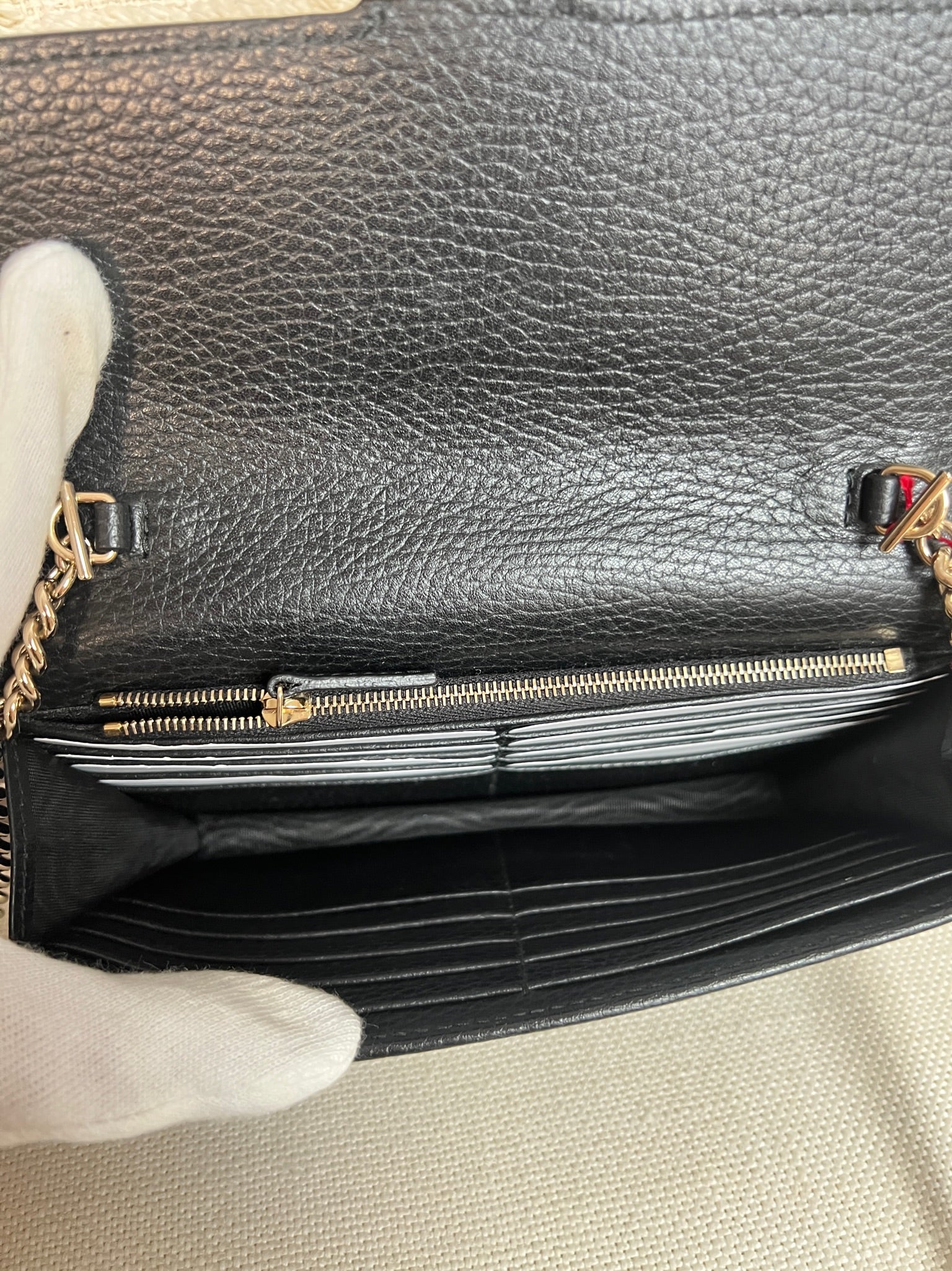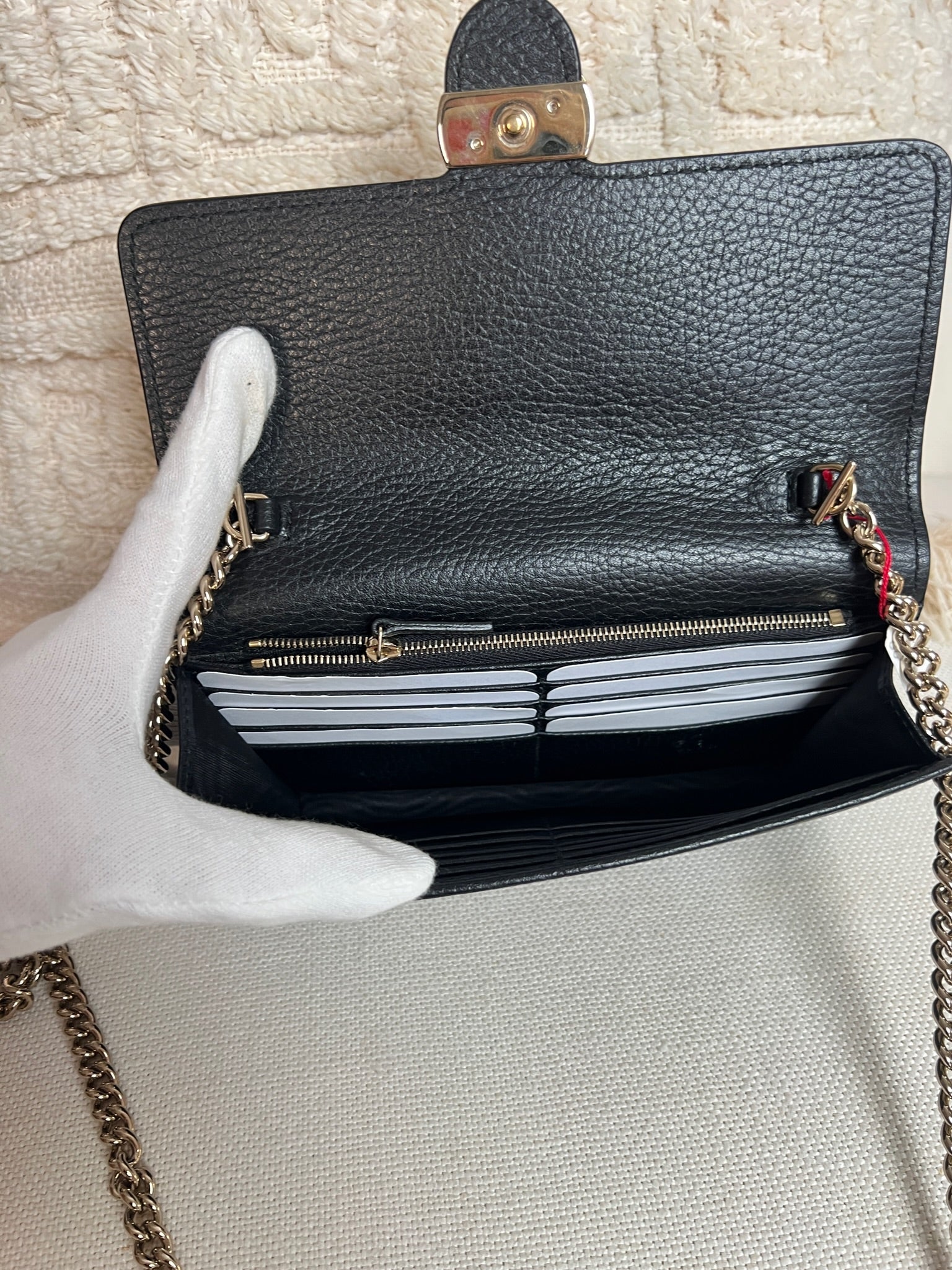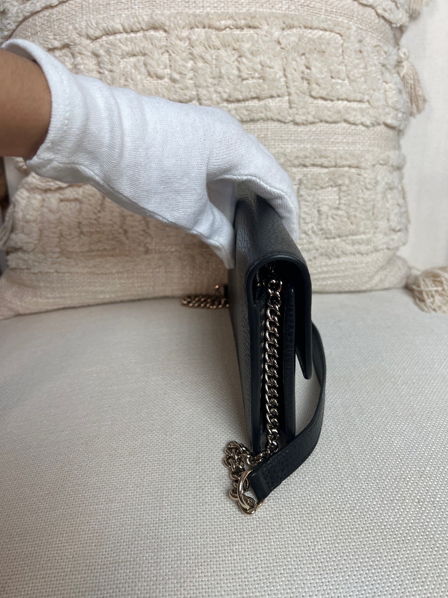This Gucci bag wallet on chain interlocking g chain is in very good condition almost as new. The leather is in very good condition. The inside of the bag is also in perfect condition. The chain and metal parts are also in very good condition. This bag comes with box and its own dust bag.