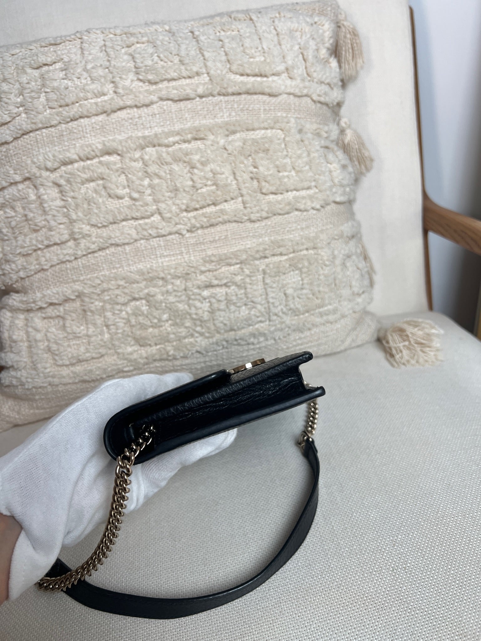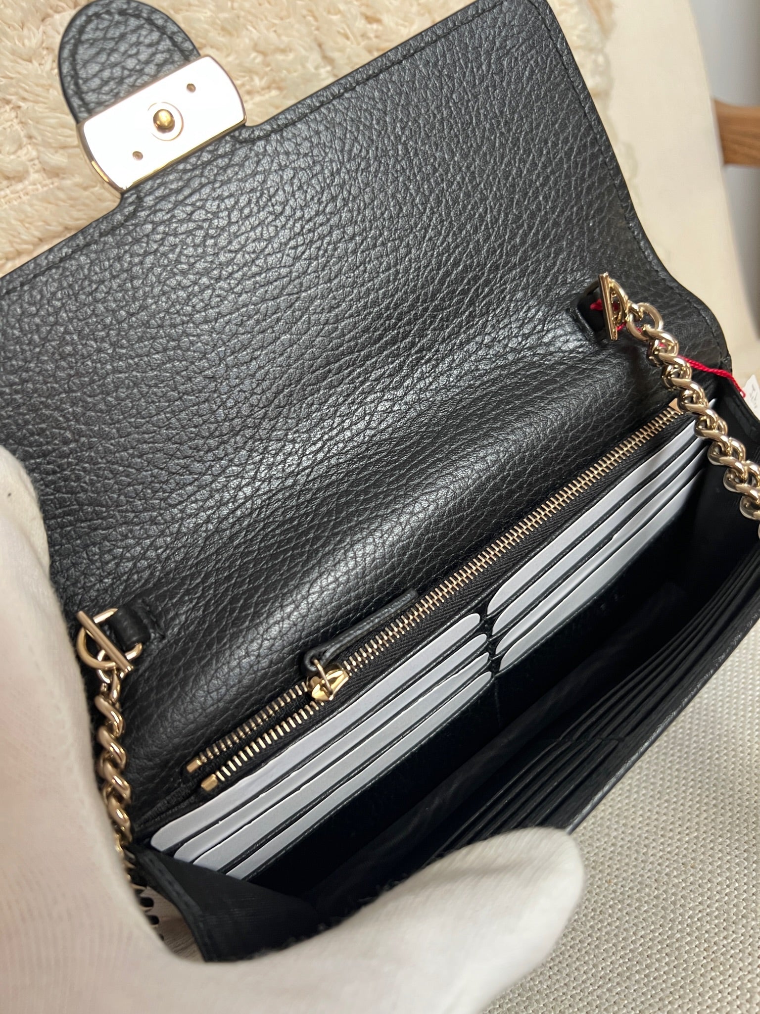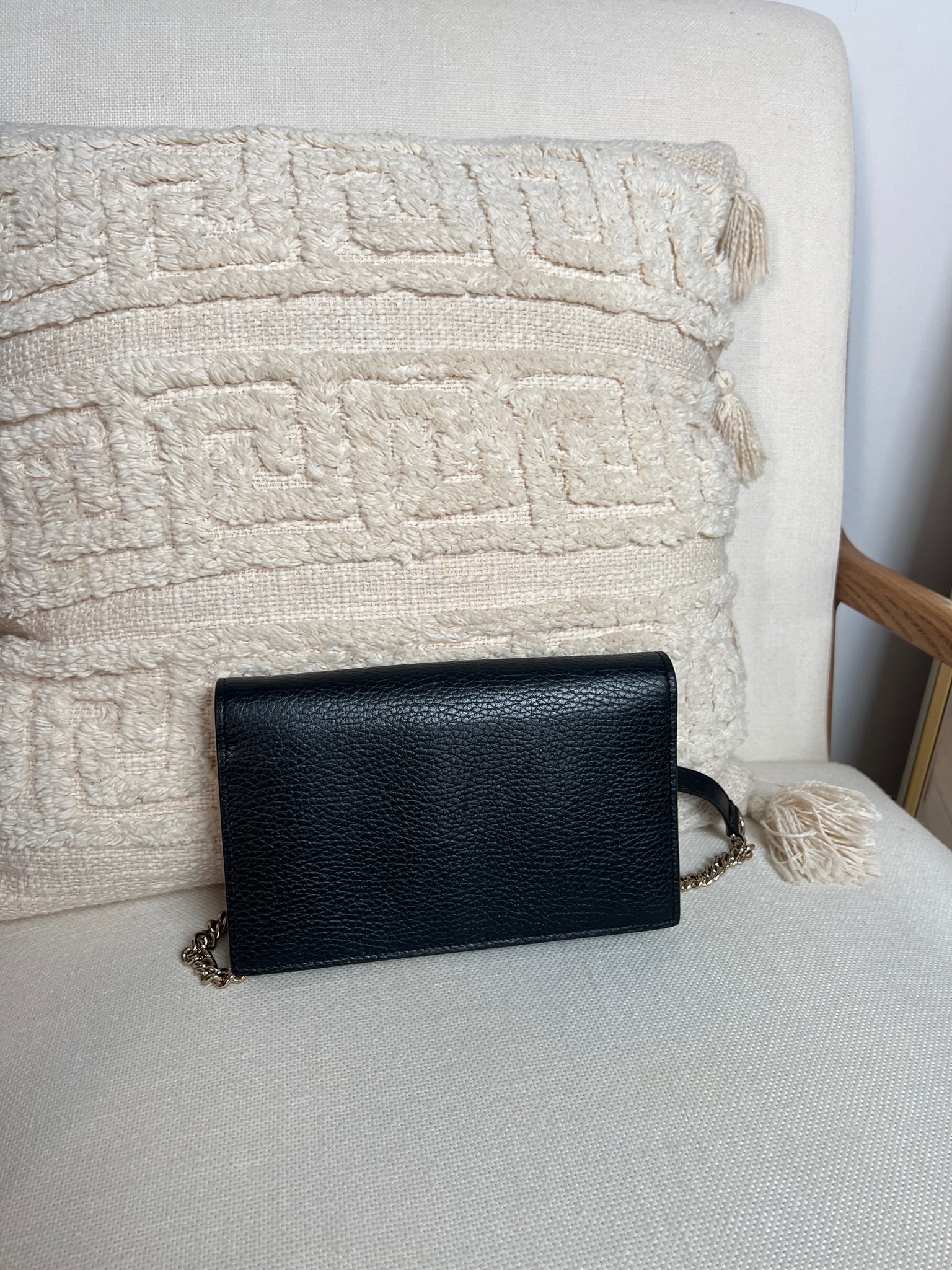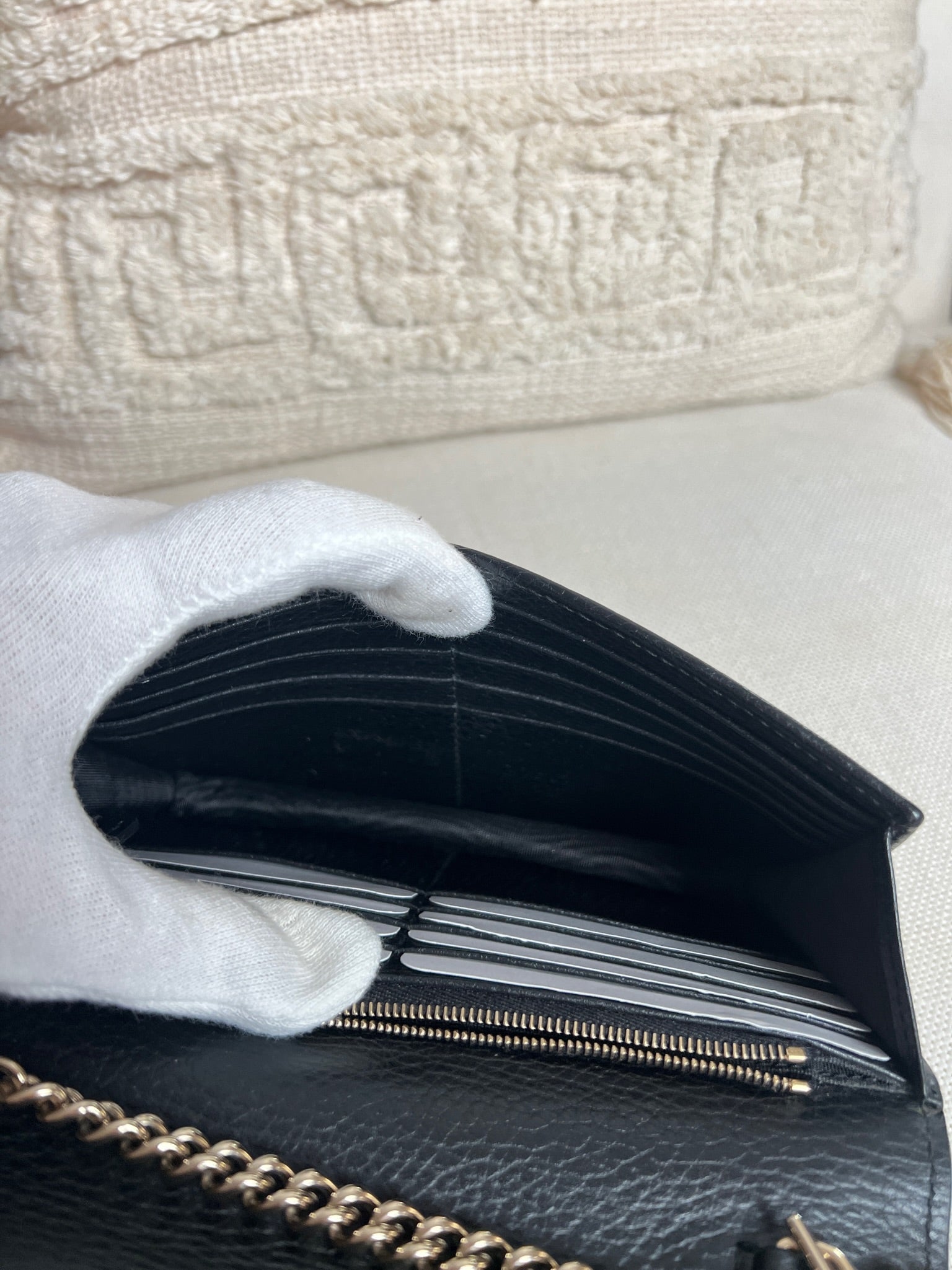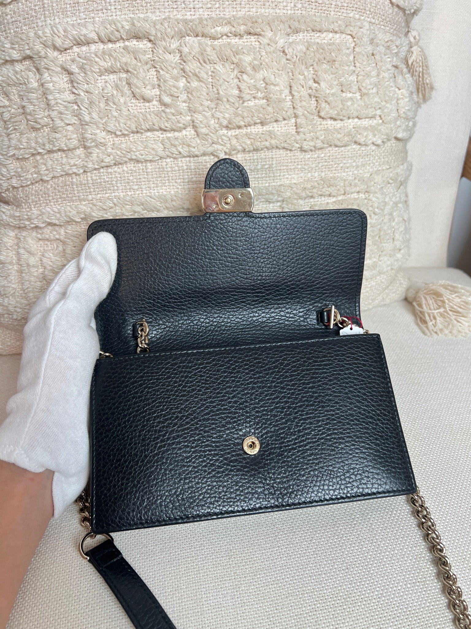 This Gucci bag wallet on chain interlocking g chain is in very good condition almost as new. The leather is in very good condition. The inside of the bag is also in perfect condition. The chain and metal parts are also in very good condition. This bag comes with box and its own dust bag.