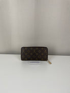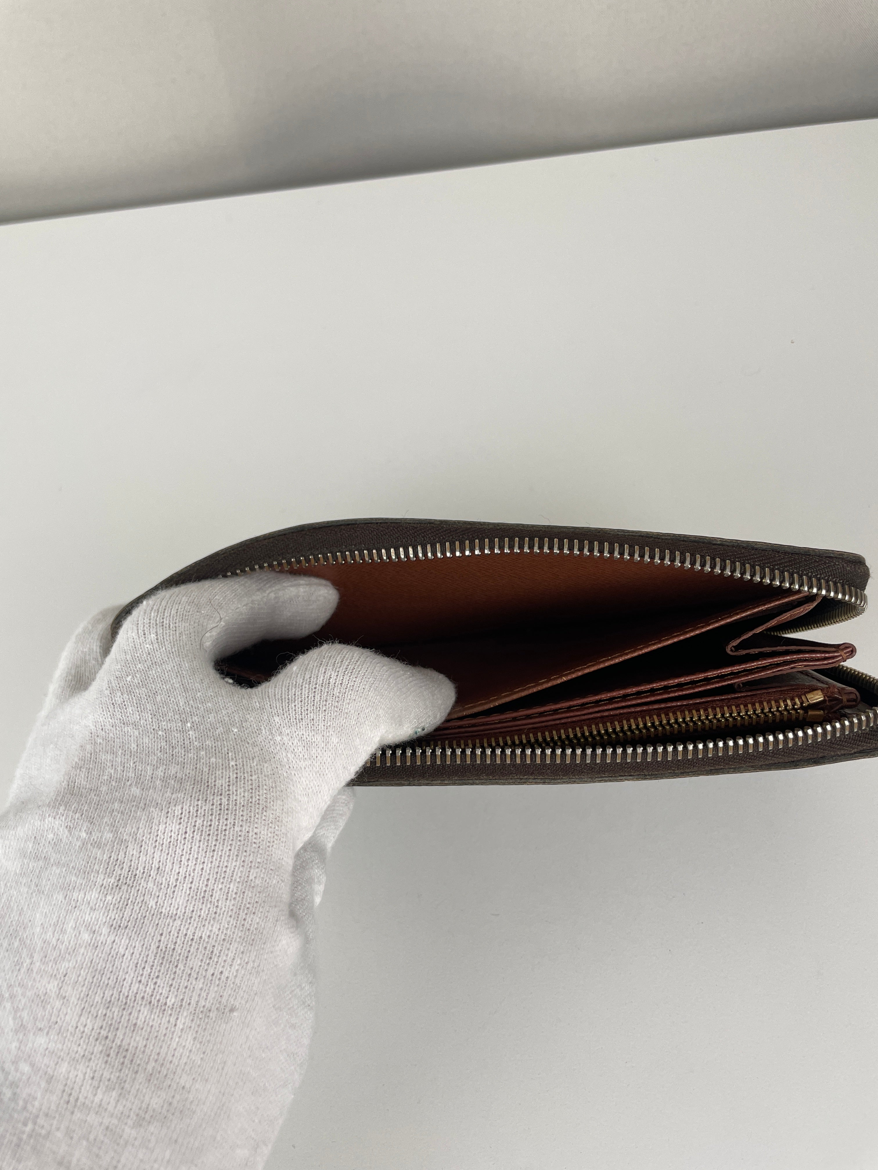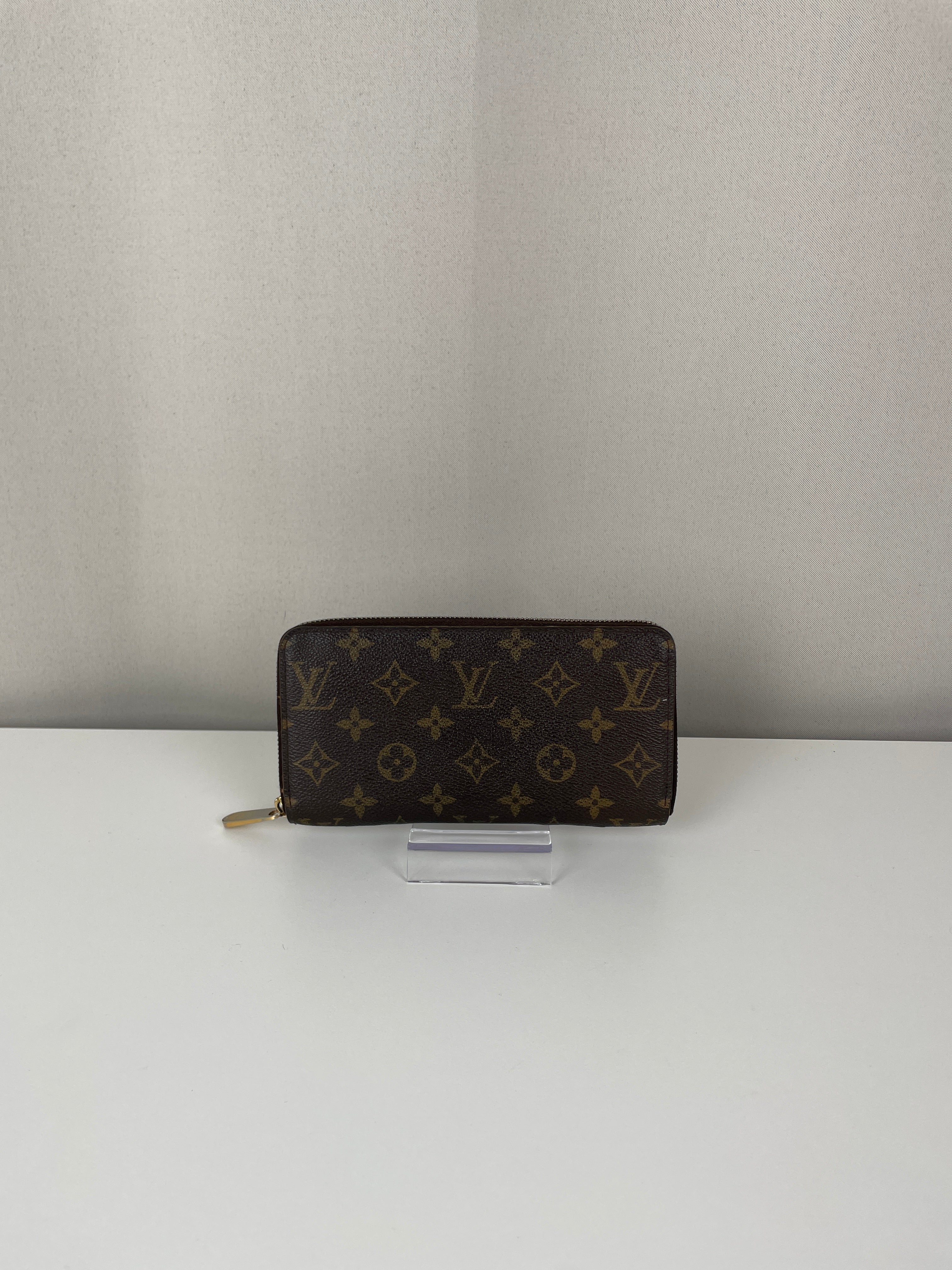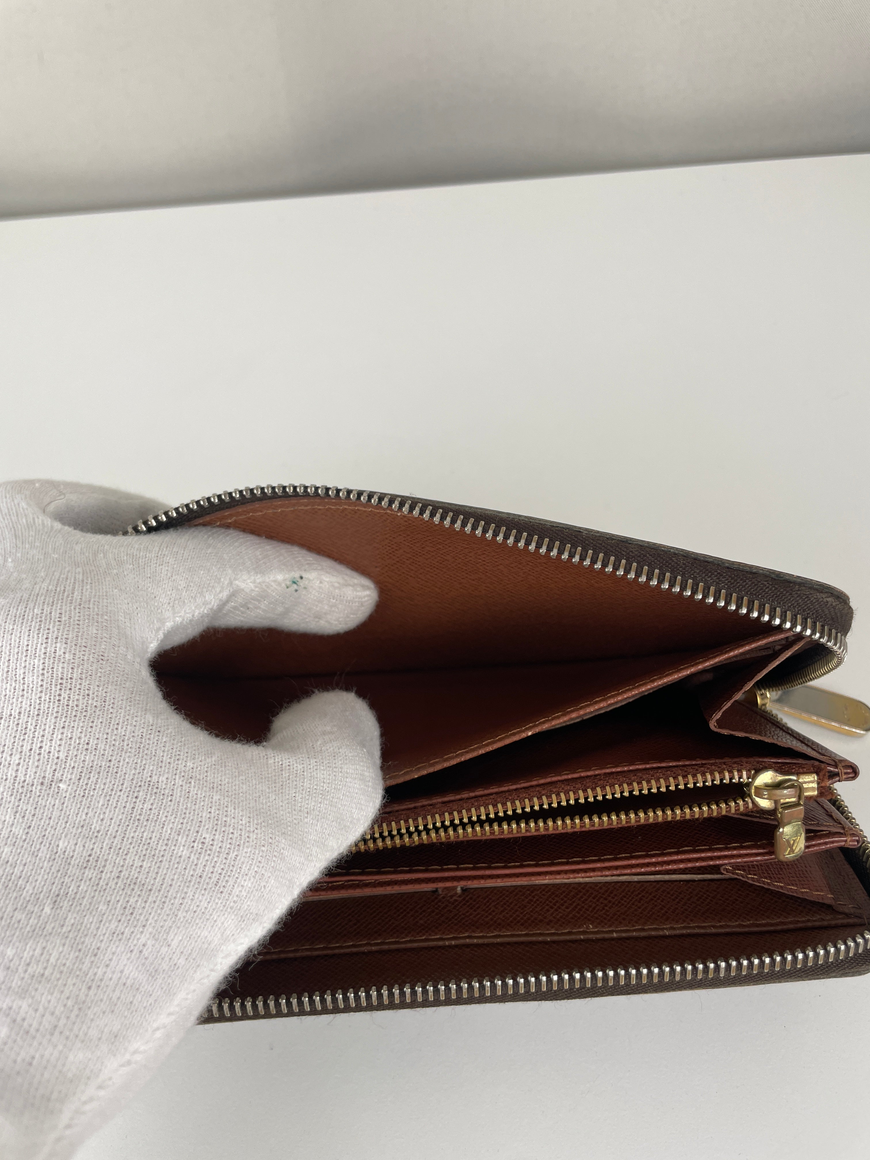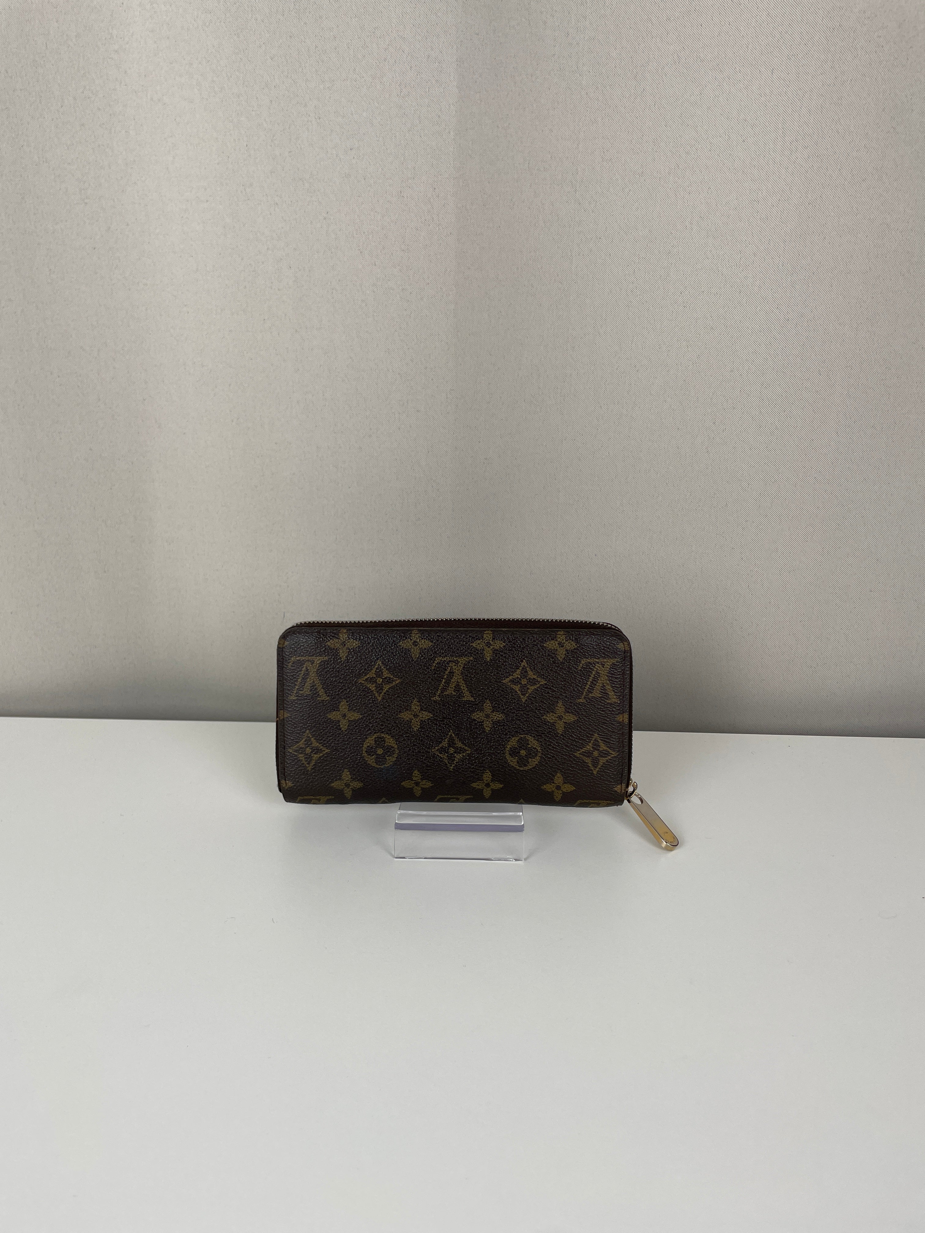 - Monogram canvas: Good condition with a faint blue stain on the back of the wallet