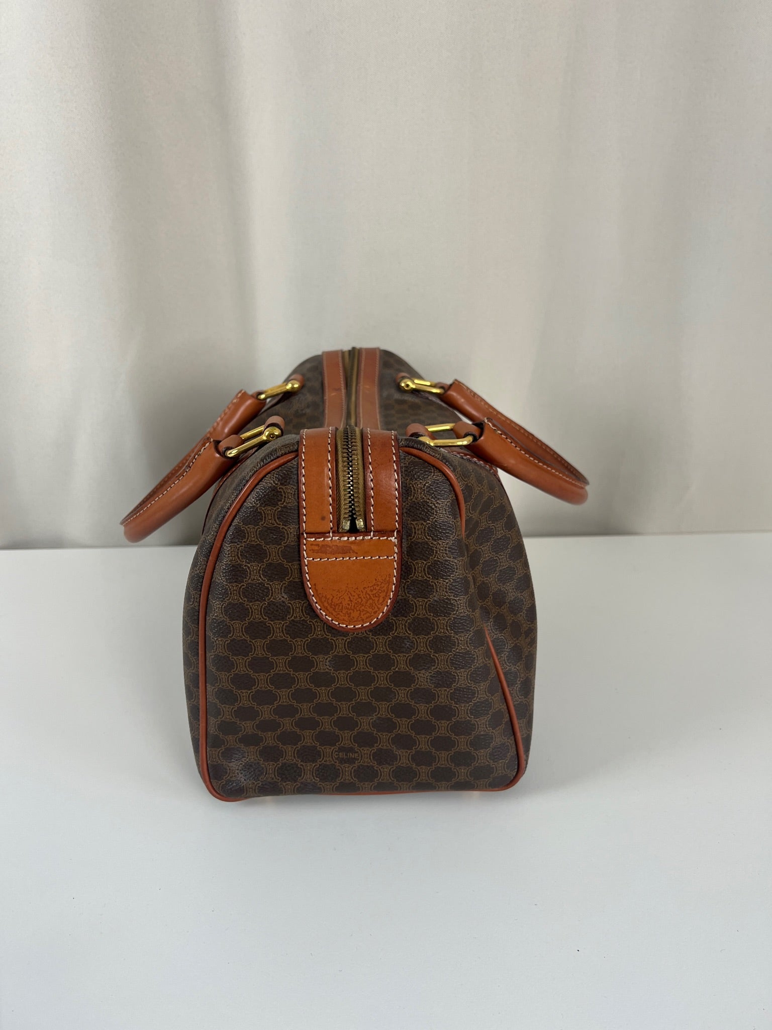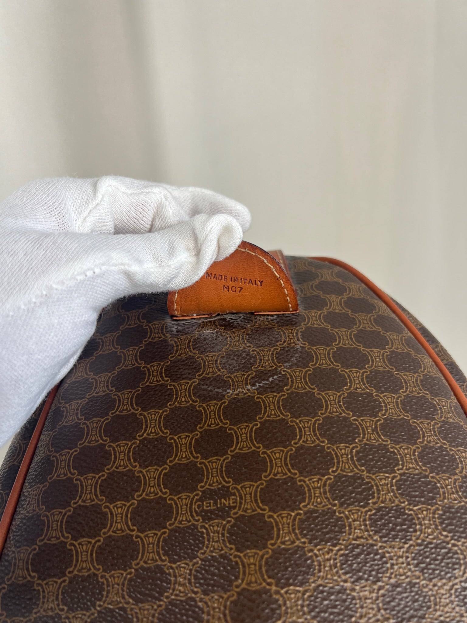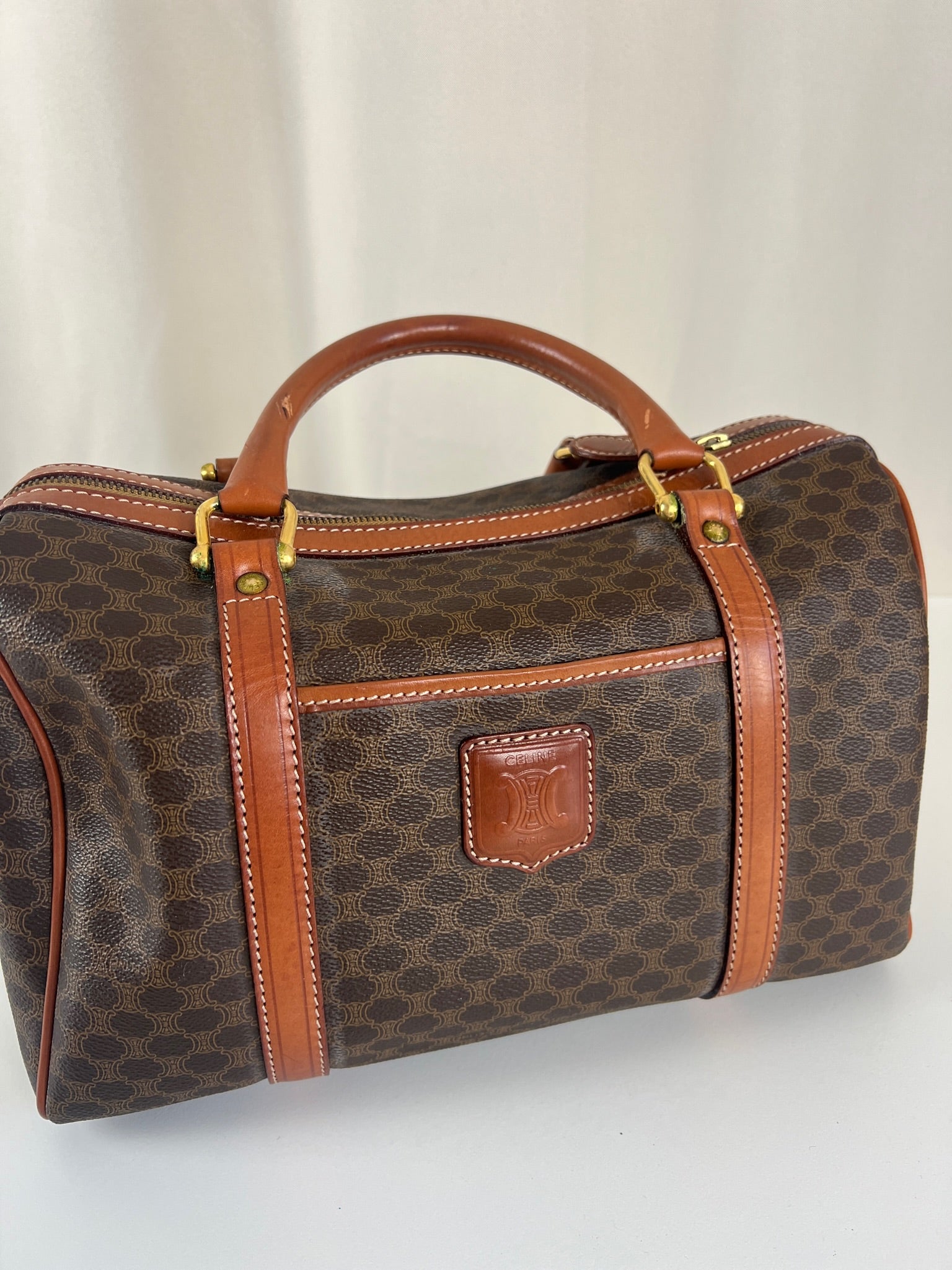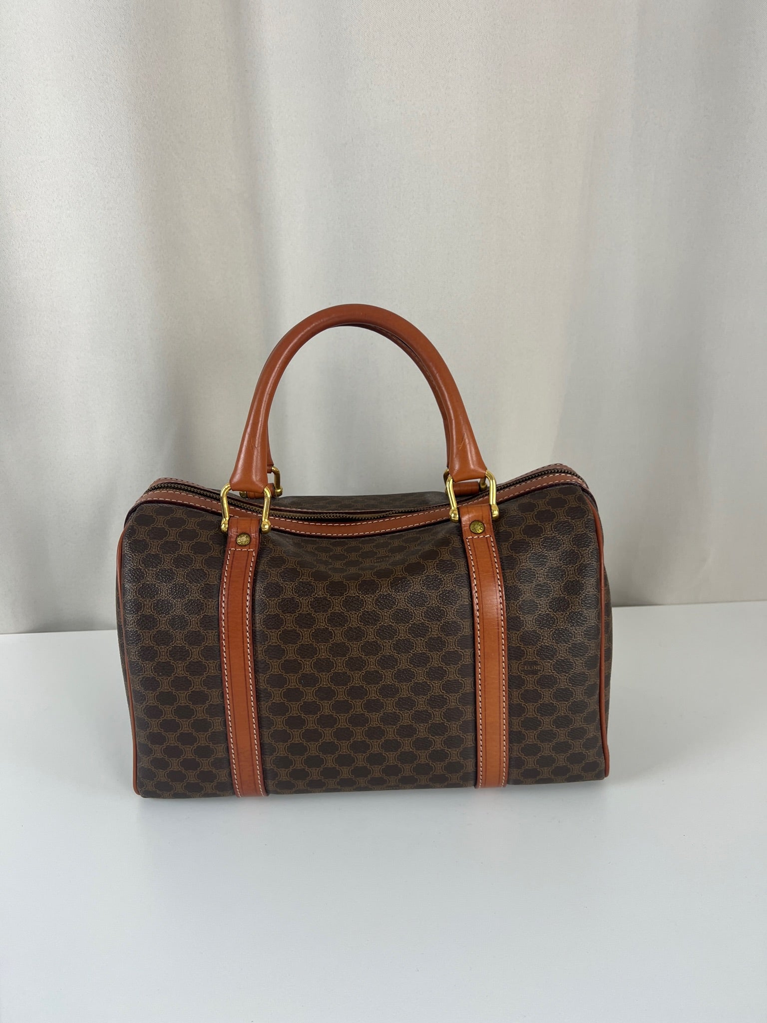 This Celine Boston Bag is in very good condition. The canva is in very good condition. The corners are in very good condition. The leather is in very good condition, only few little stains. The interior is in very good condition too ! You have a zipper pocket on the inside.