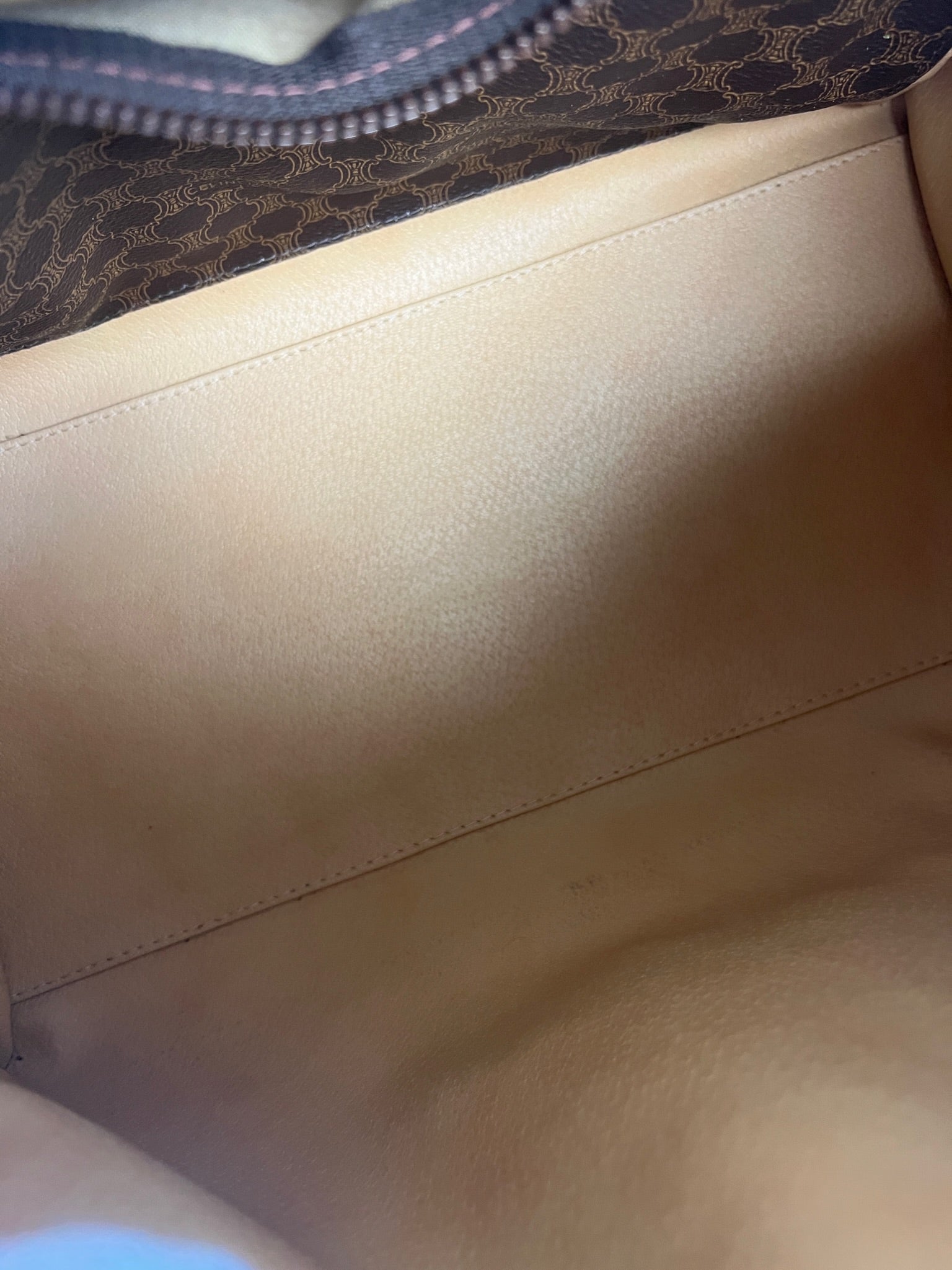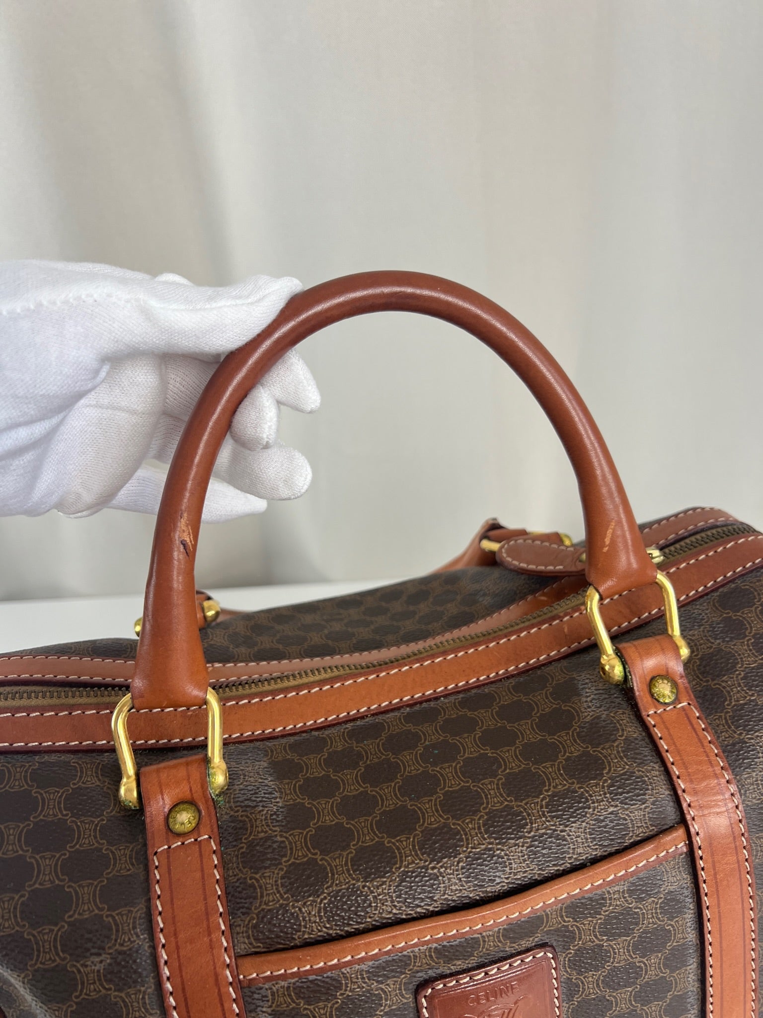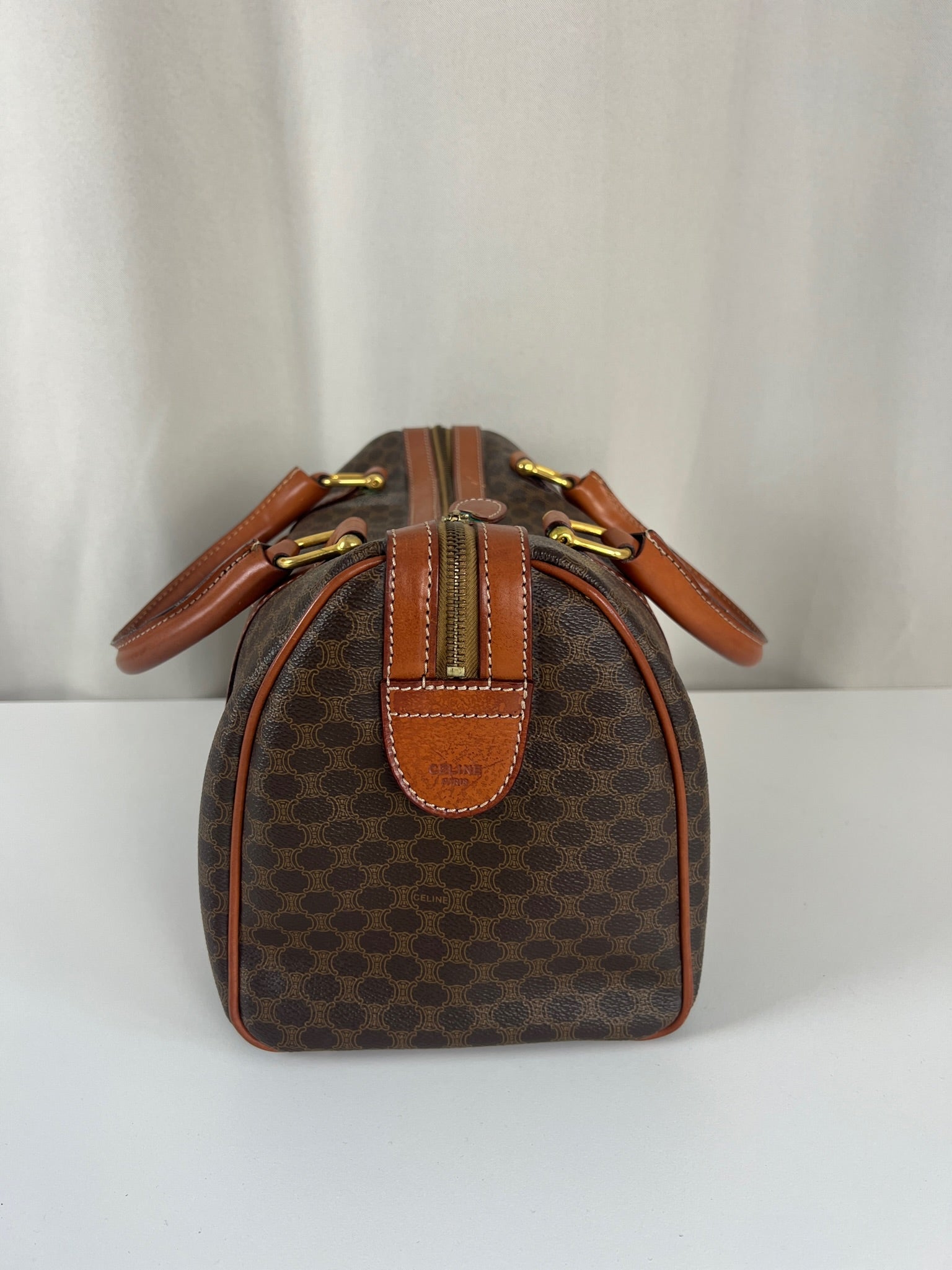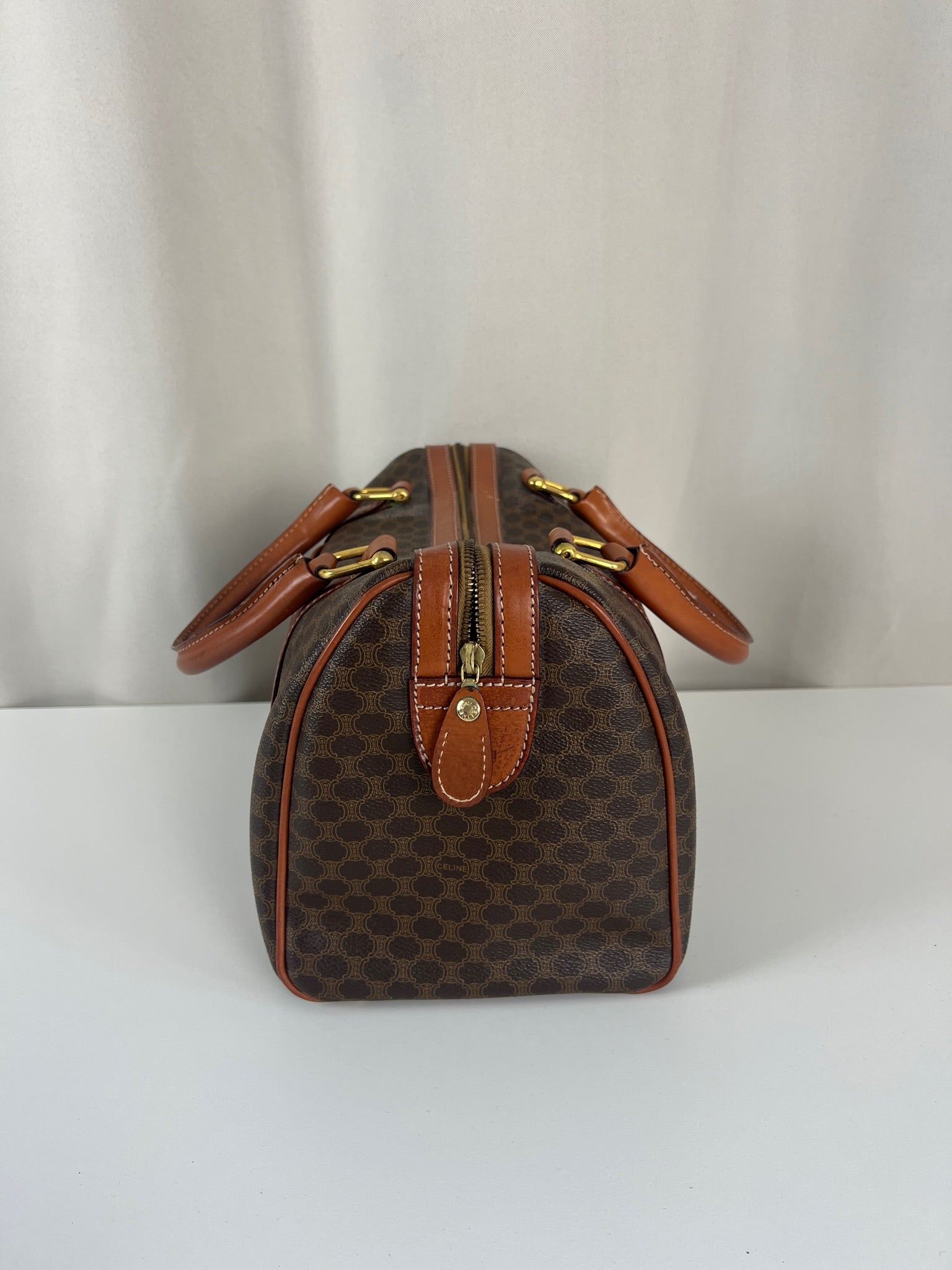 This Celine Boston Bag is in very good condition. The canva is in very good condition. The corners are in very good condition. The leather is in very good condition, only few little stains. The interior is in very good condition too ! You have a zipper pocket on the inside.