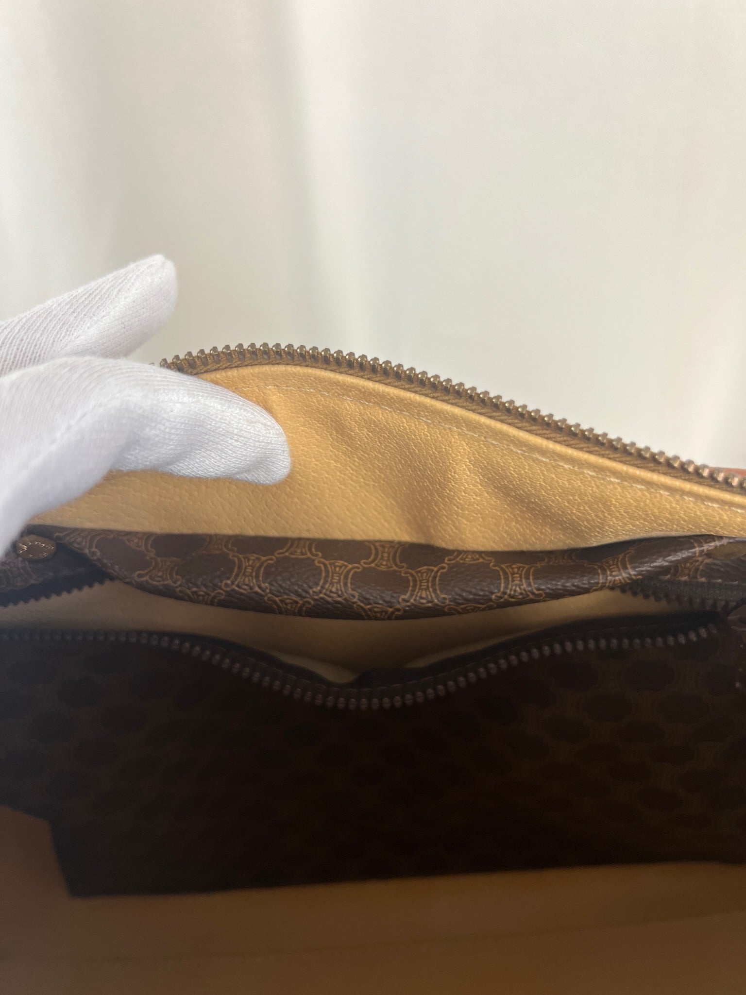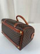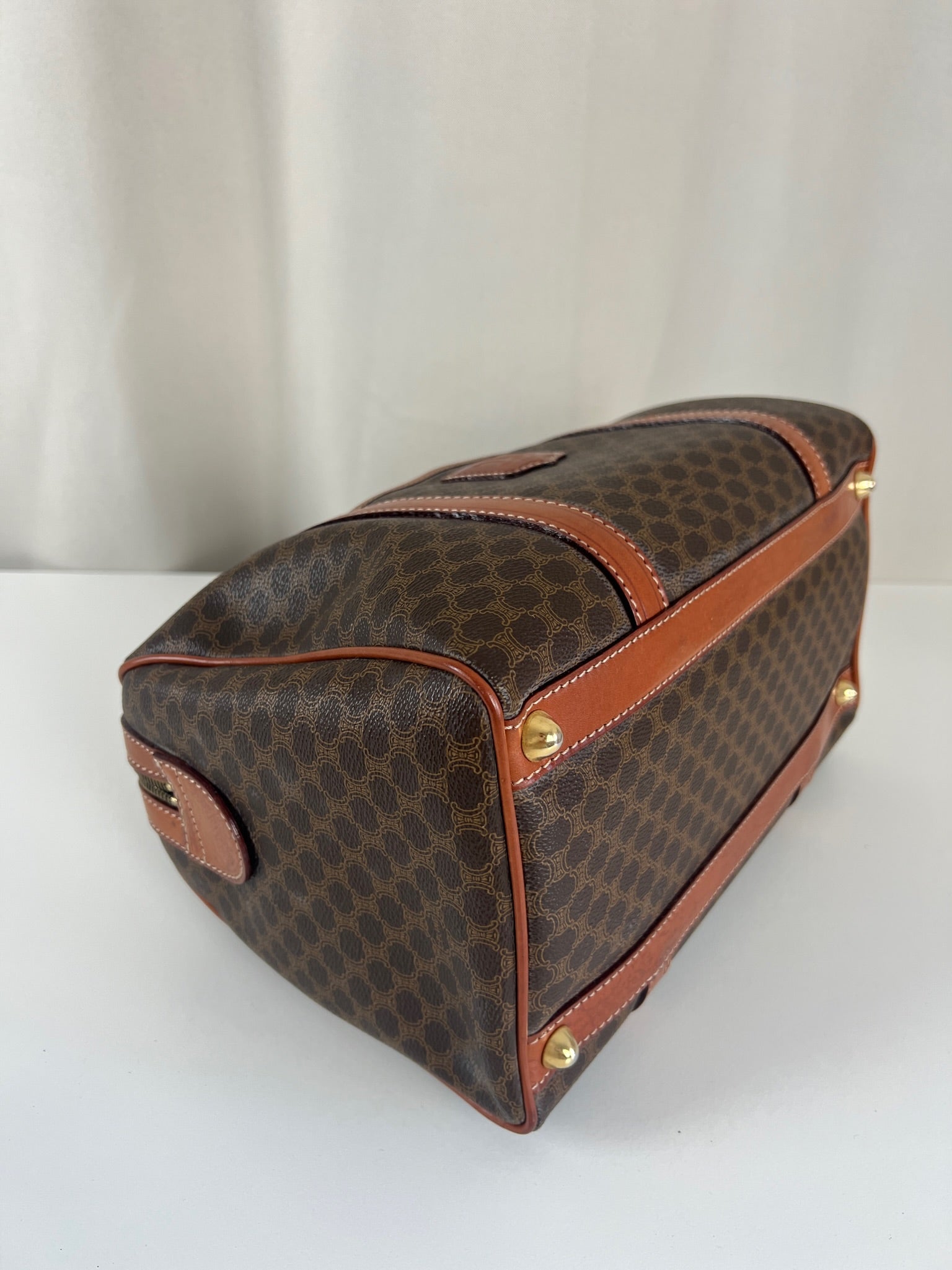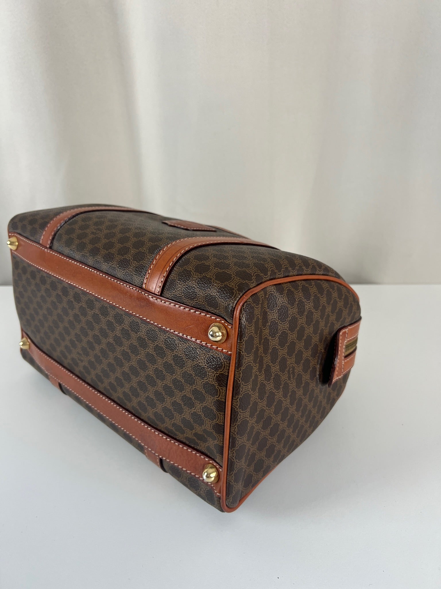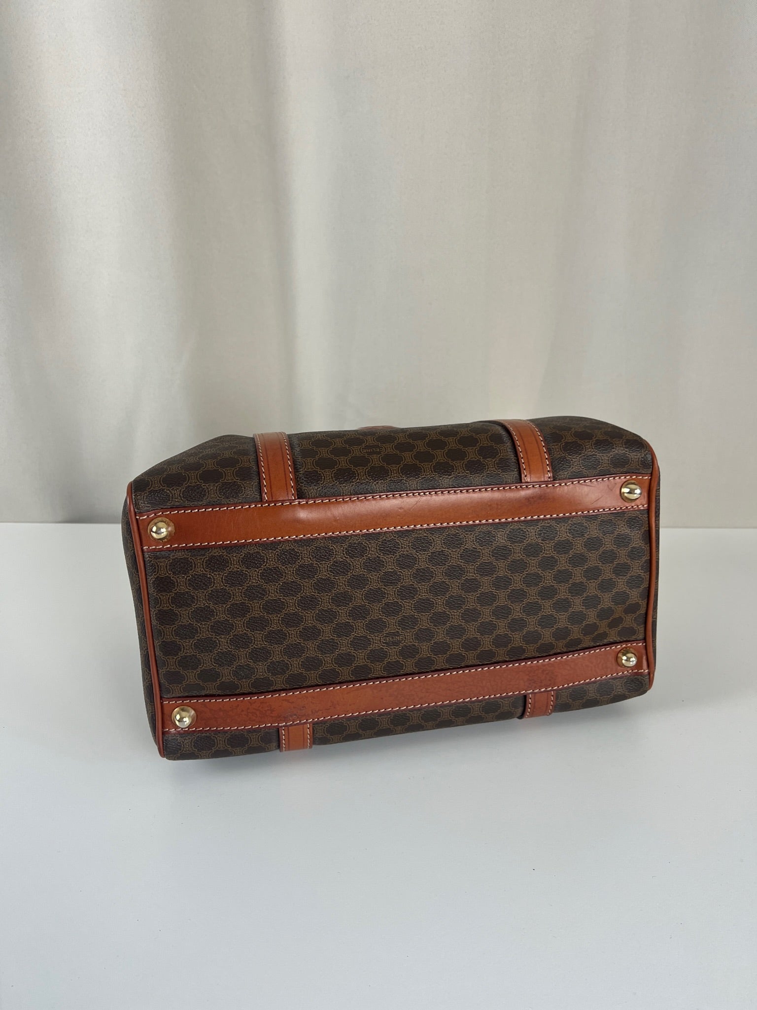 This Celine Boston Bag is in very good condition. The canva is in very good condition. The corners are in very good condition. The leather is in very good condition, only few little stains. The interior is in very good condition too ! You have a zipper pocket on the inside.