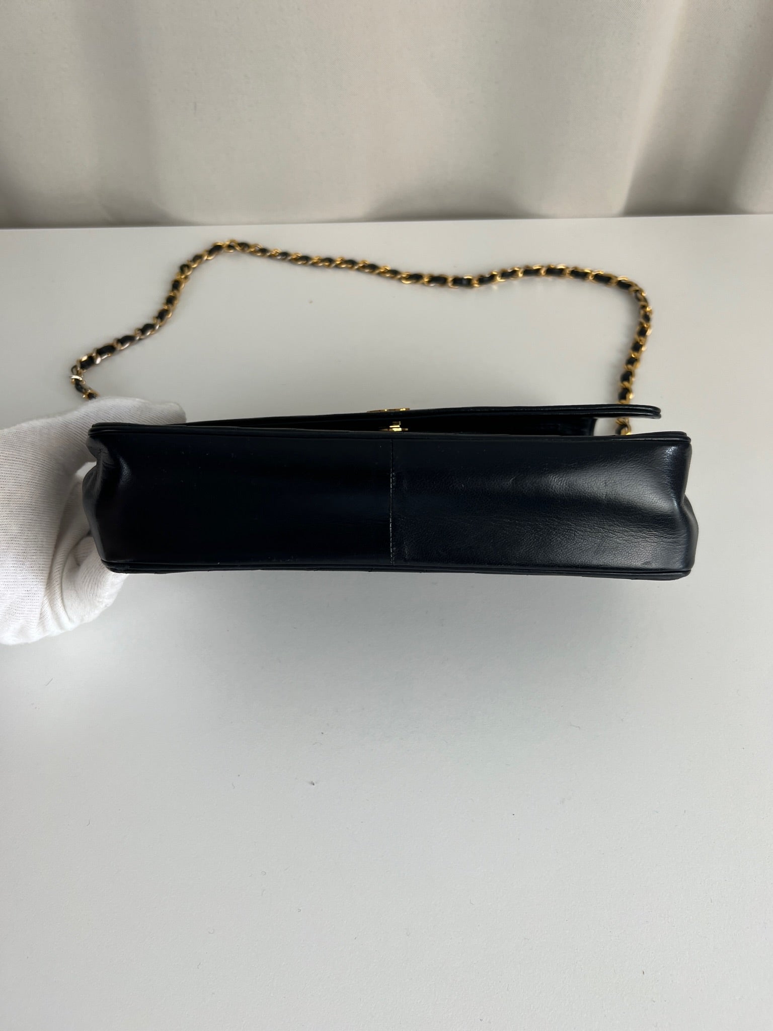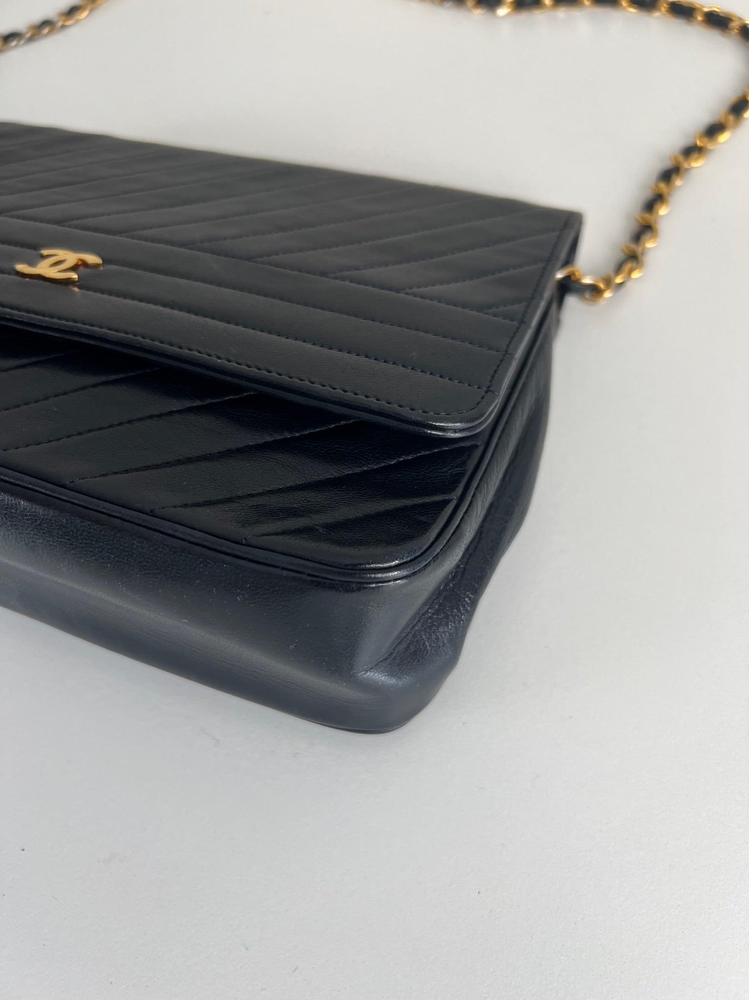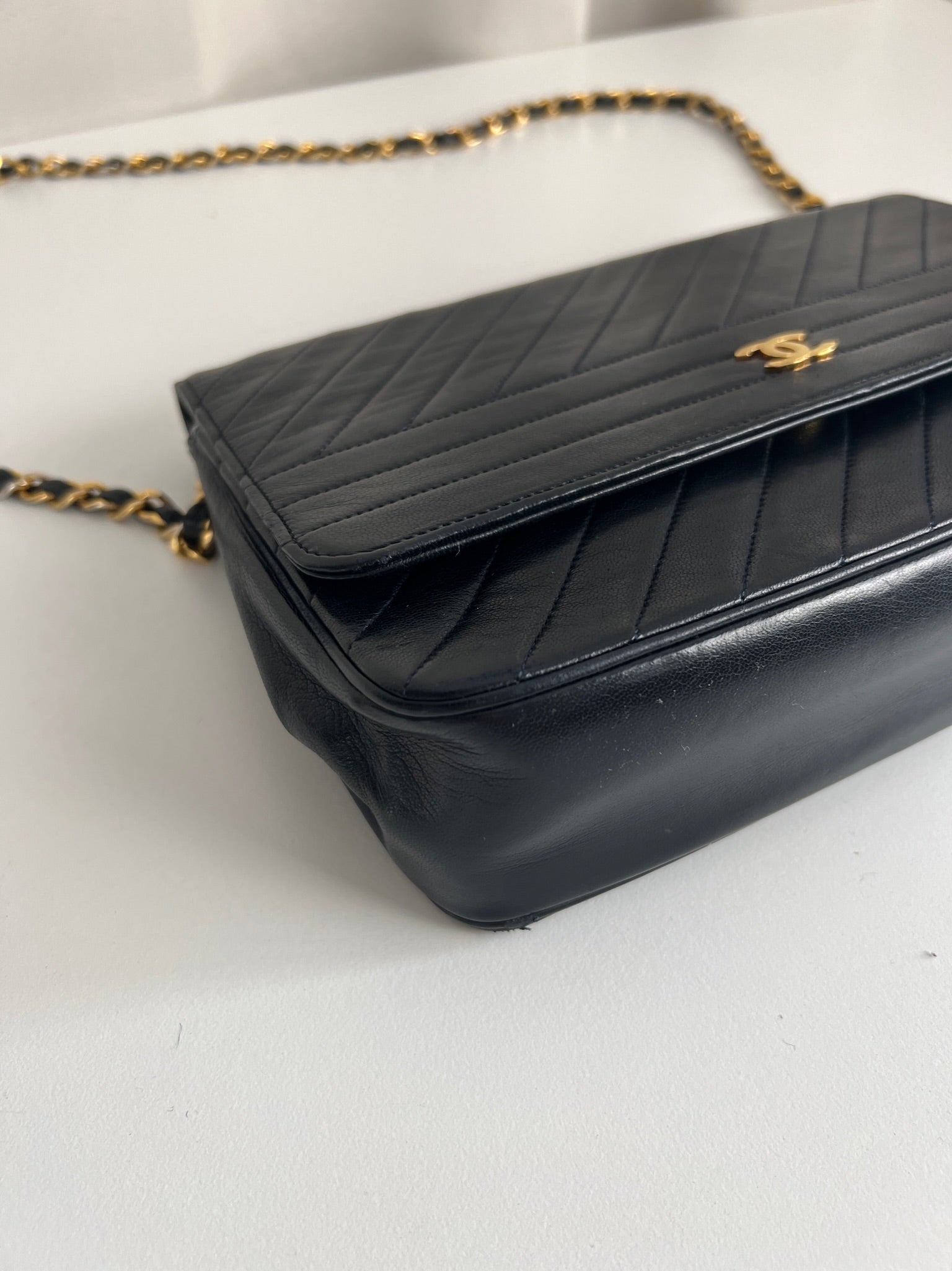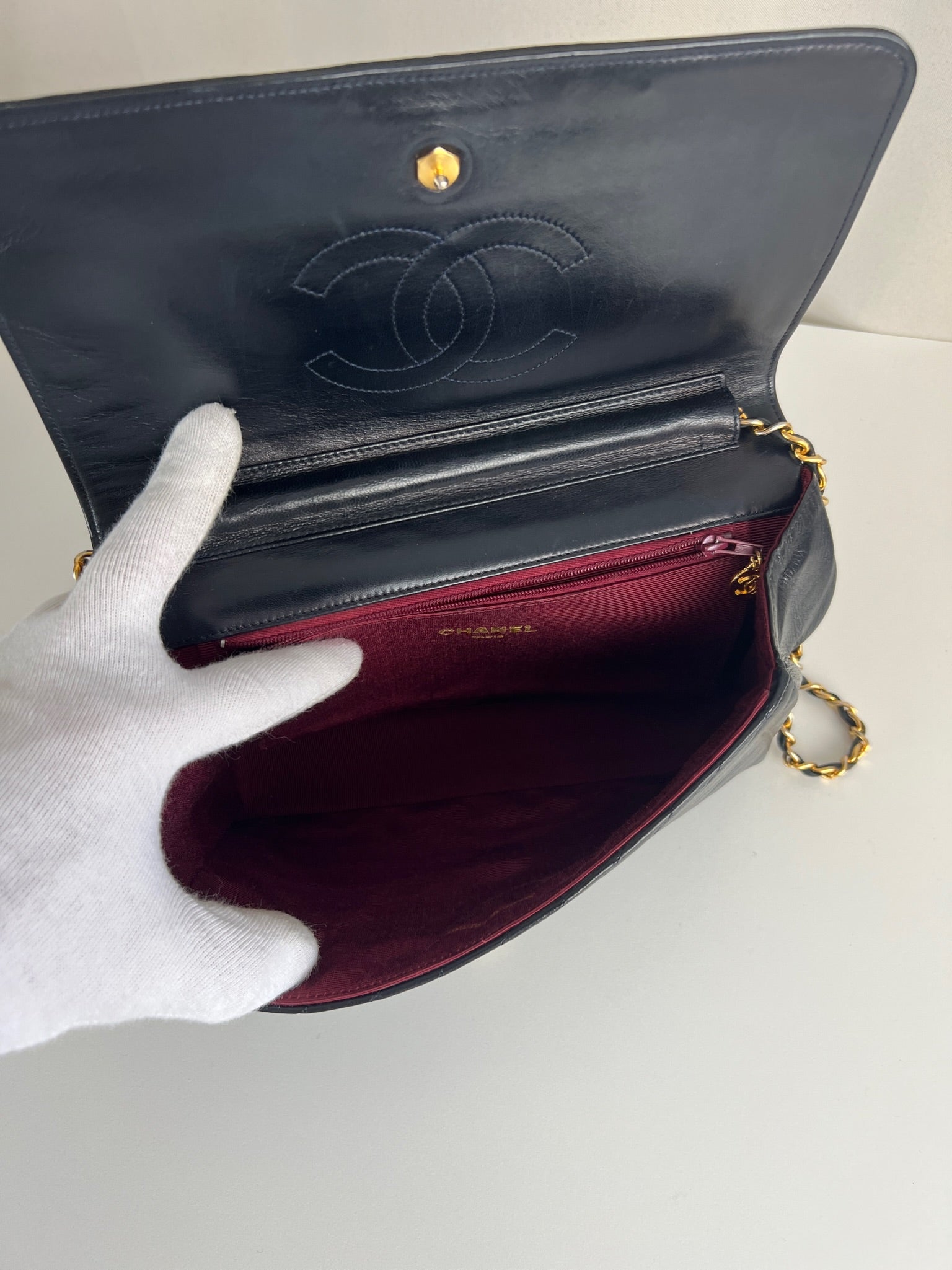 This Chanel VIntage bag is in very good condition. The leather and the corners are in very good condition. There is one corner that is a little bit rubbed. The hardware is a little bit scratched, it's a vintage bag. The strap is in very good condition. The interior is in very good condition. The bag has no sticker on this one.