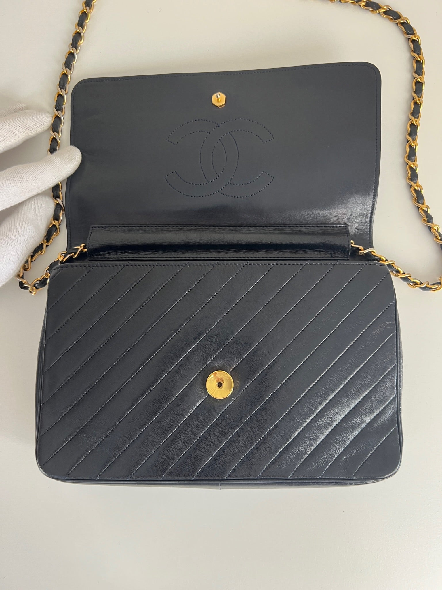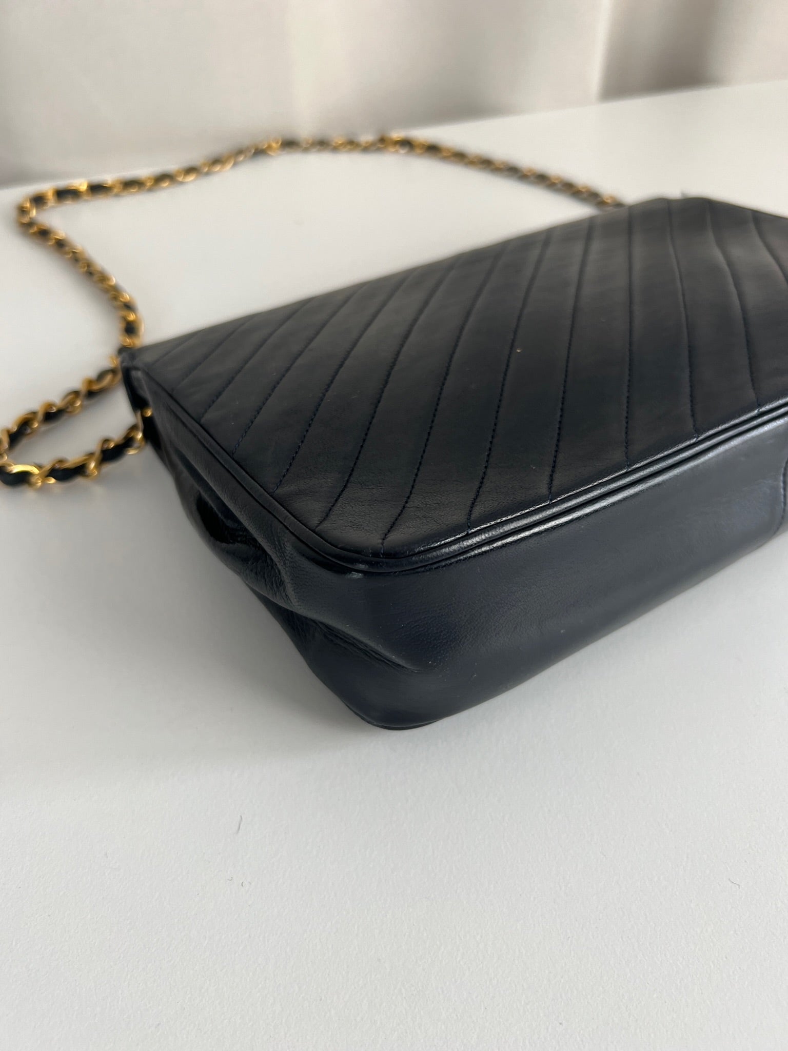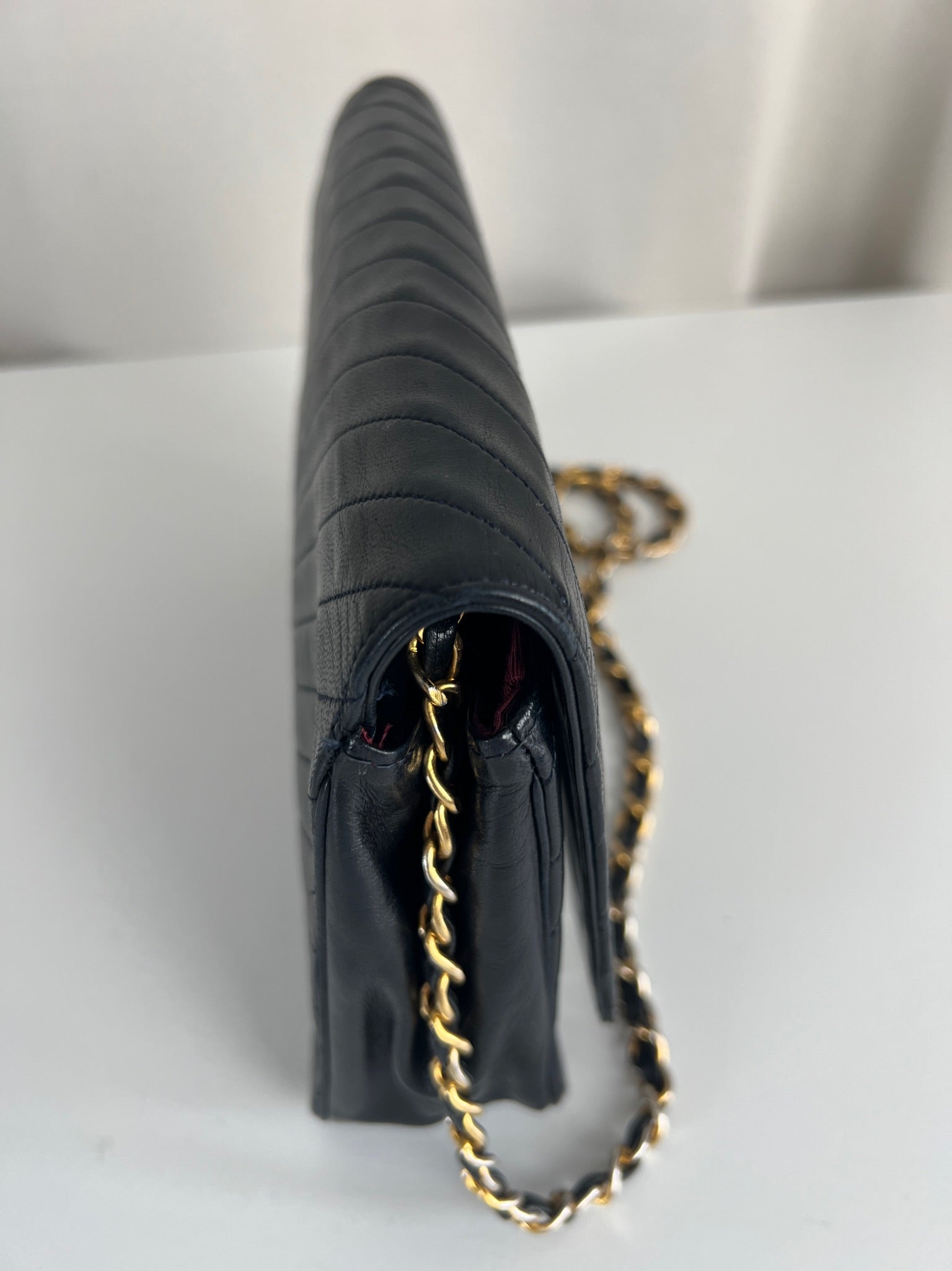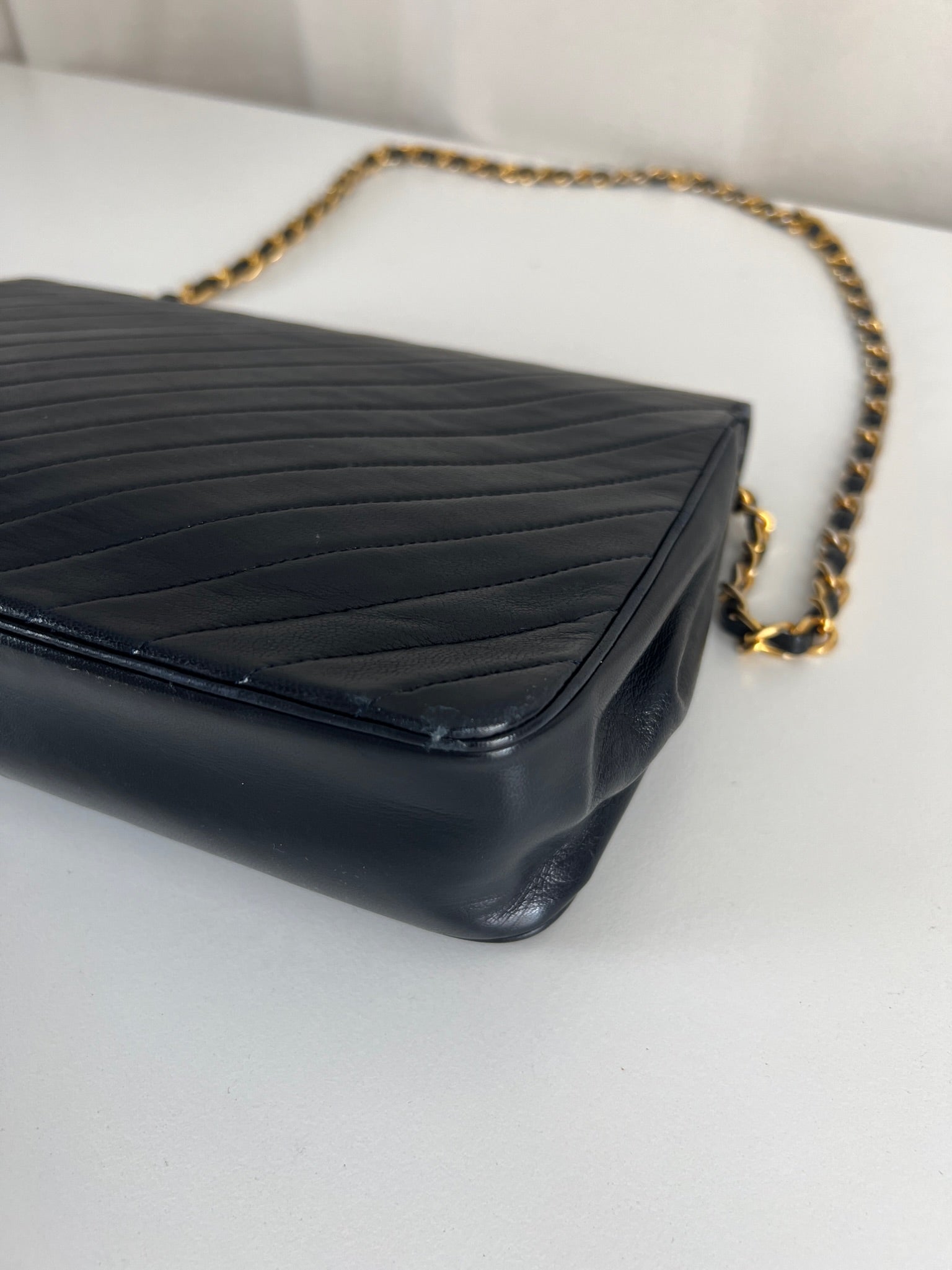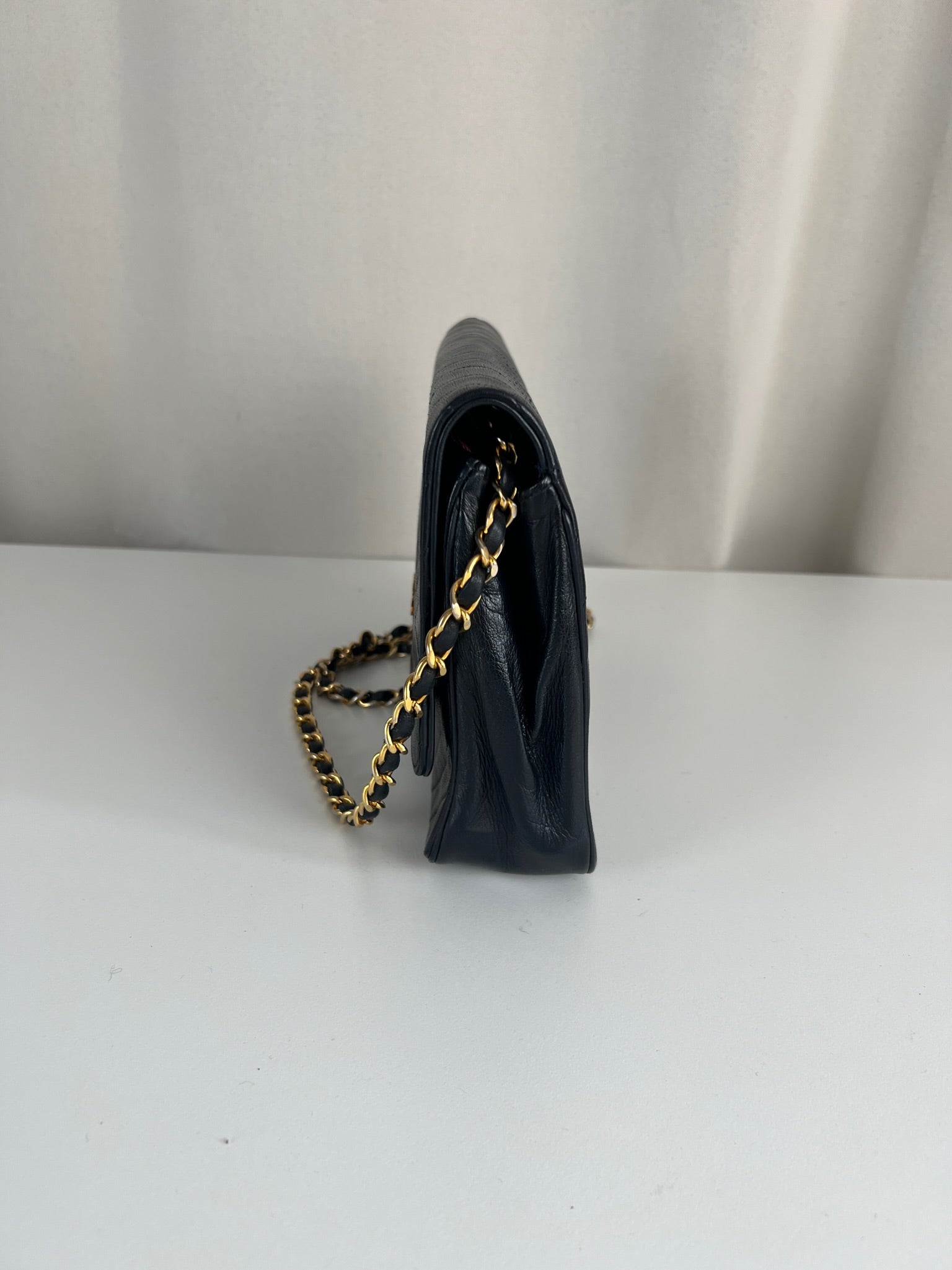 This Chanel VIntage bag is in very good condition. The leather and the corners are in very good condition. There is one corner that is a little bit rubbed. The hardware is a little bit scratched, it's a vintage bag. The strap is in very good condition. The interior is in very good condition. The bag has no sticker on this one.