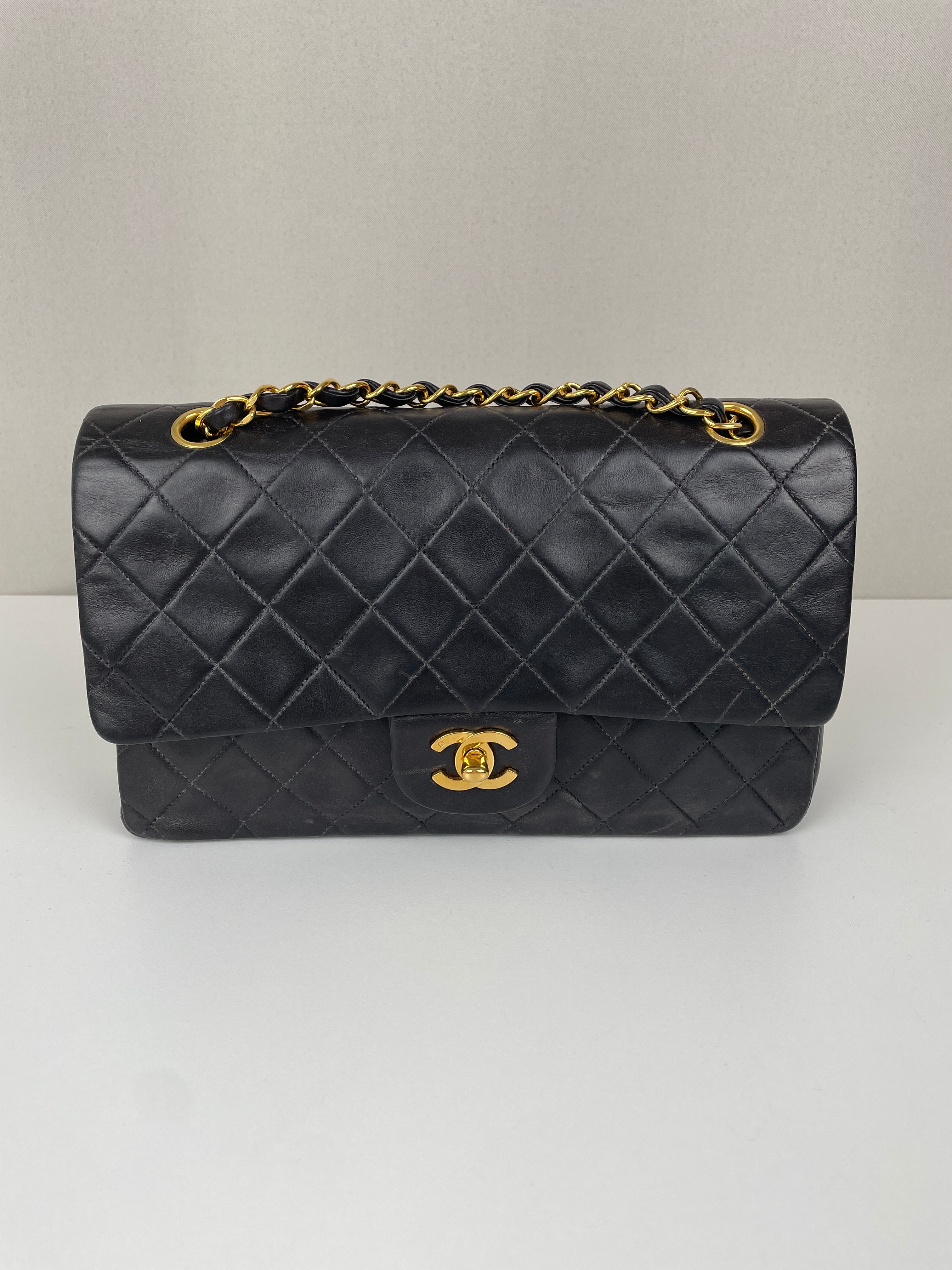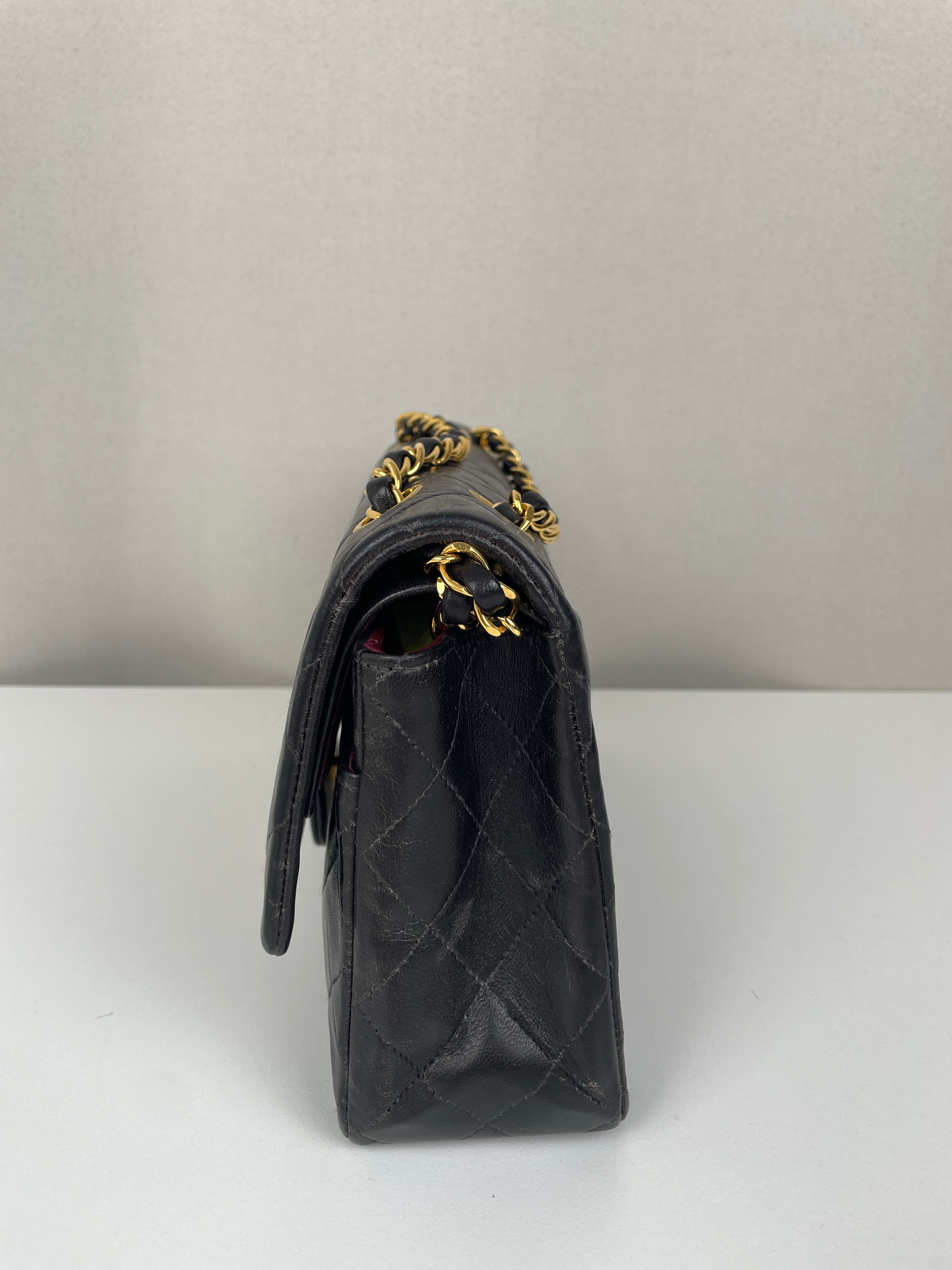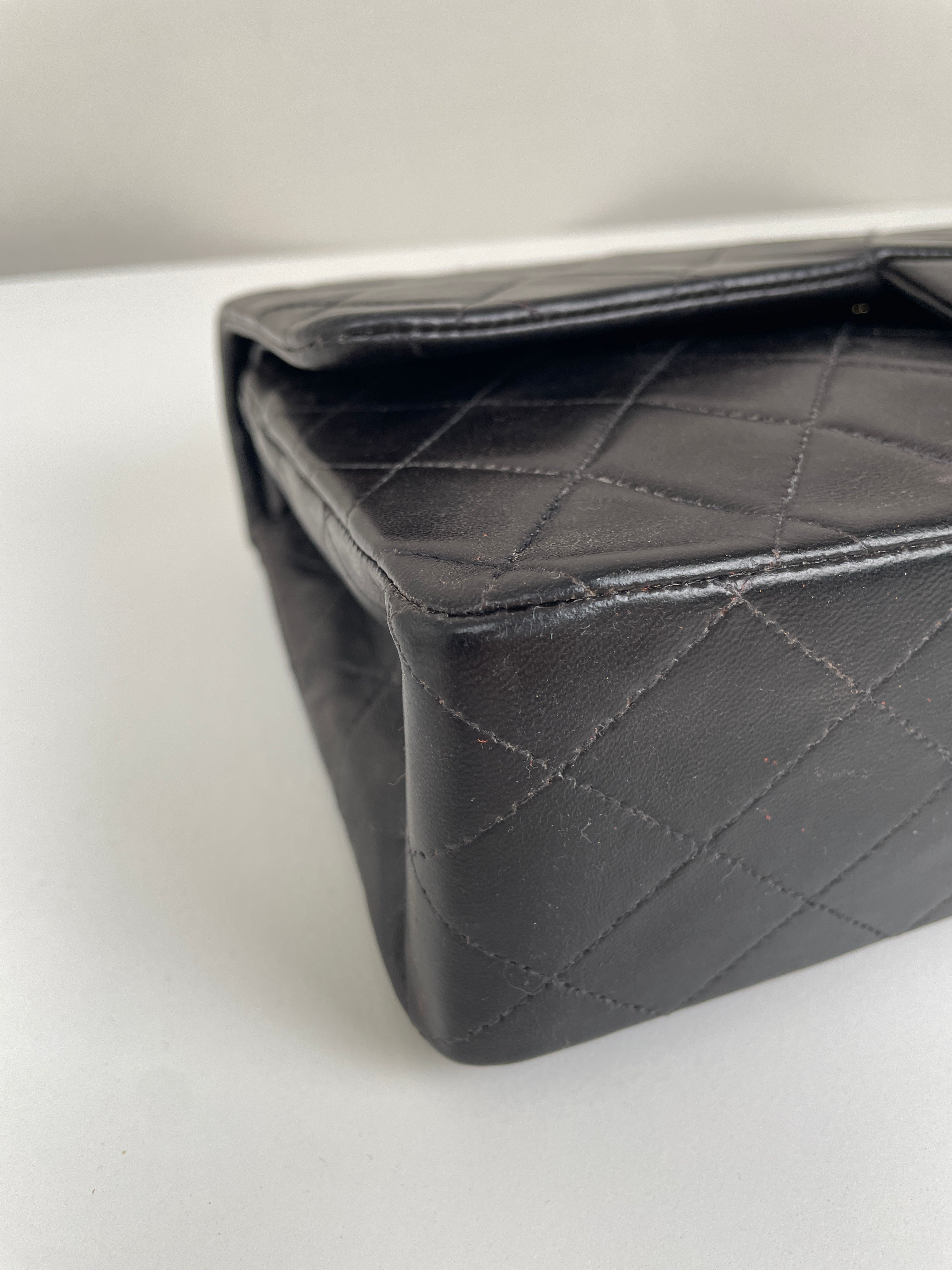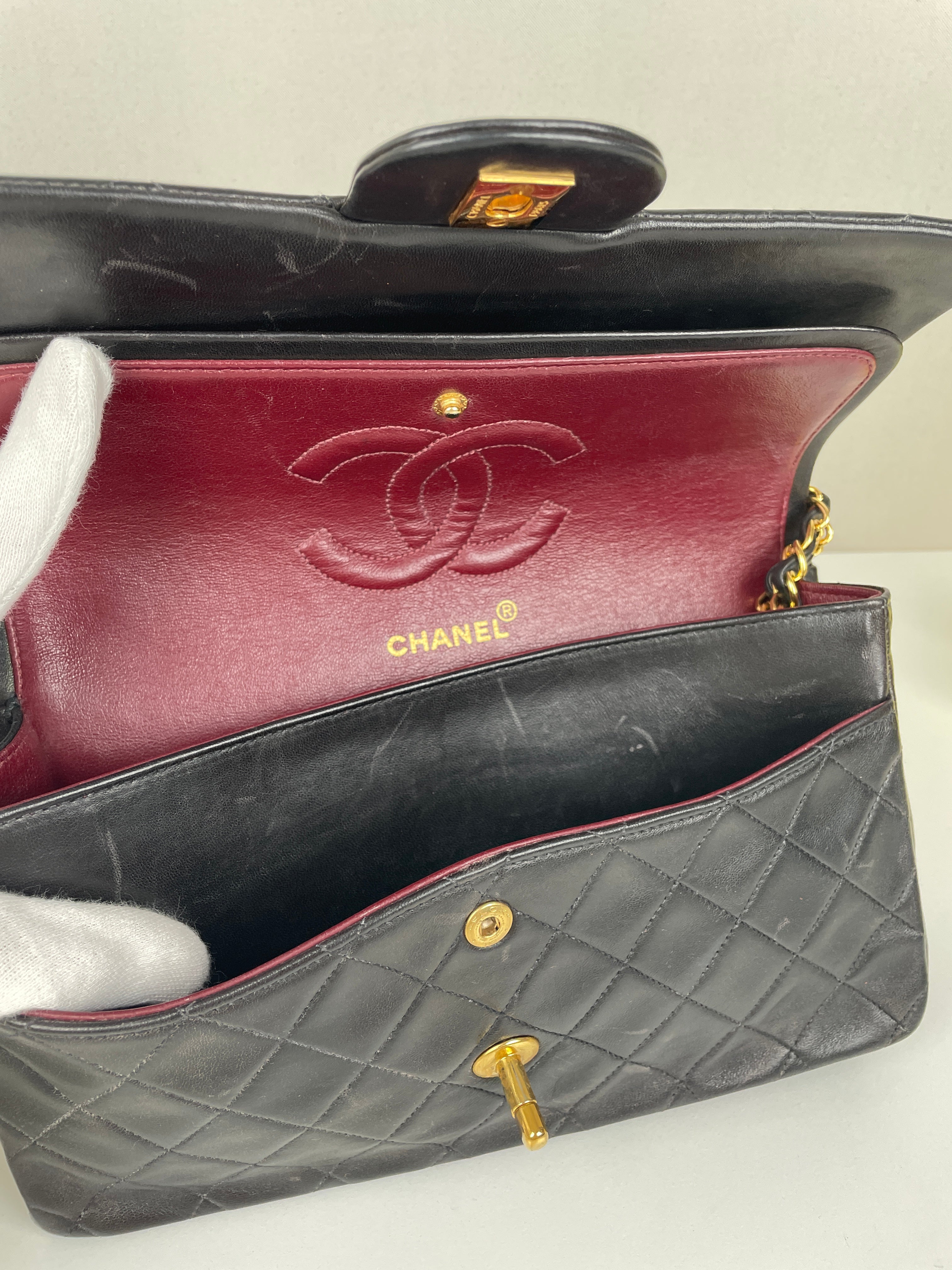 This Chanel Vintage Classic Flap is in good condition. The leather is in good condition, the bag was used and cared. The edges on the sides are in very good condition so as the corners. The hardware is in good condition, gold plated. The interior has some traces on the first flap inside due to the zipper. The other parts of the inside are in very good condition. Very good condition in general.