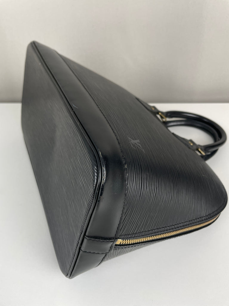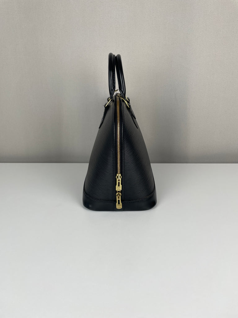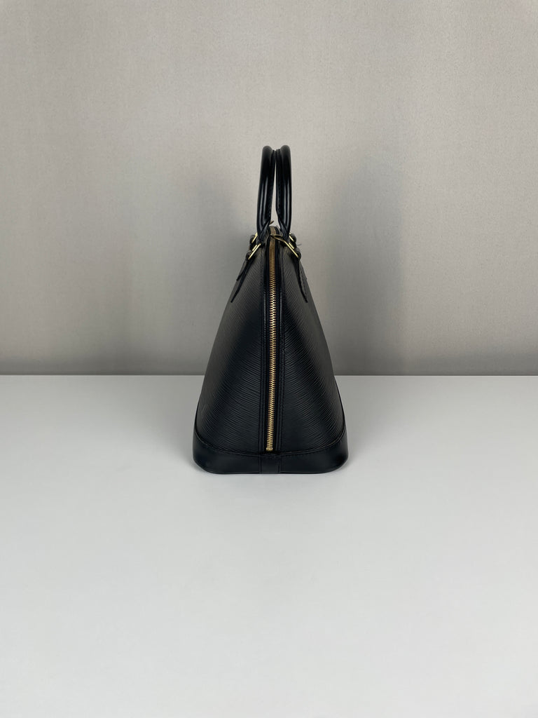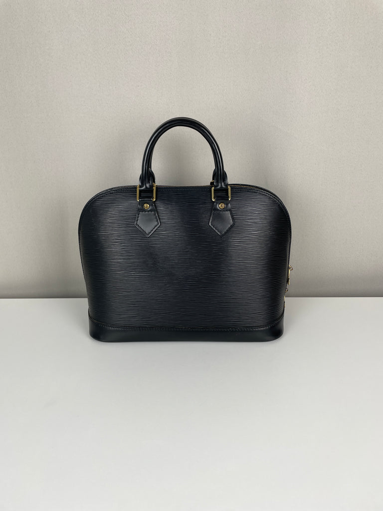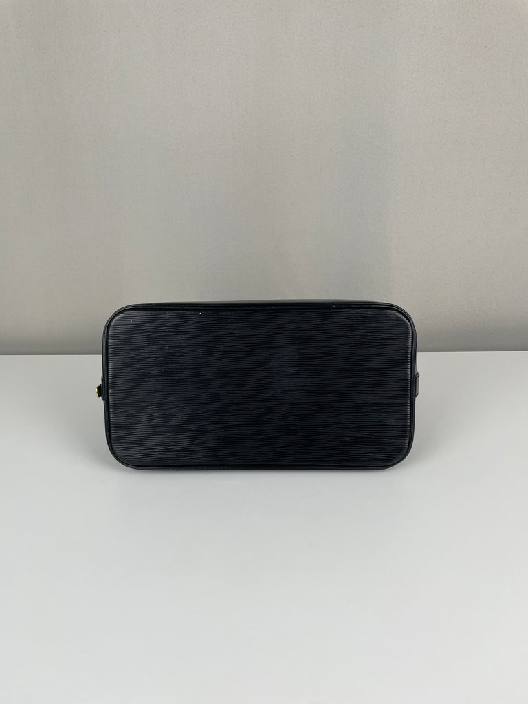 This Louis Vuitton Alma PM in iconic black Epi leather is a timeless vintage piece from 1996. Sleek, structured, and effortlessly elegant, it's the perfect handbag for day or evening. The textured Epi leather and classic silhouette make it a discreet luxury statement.