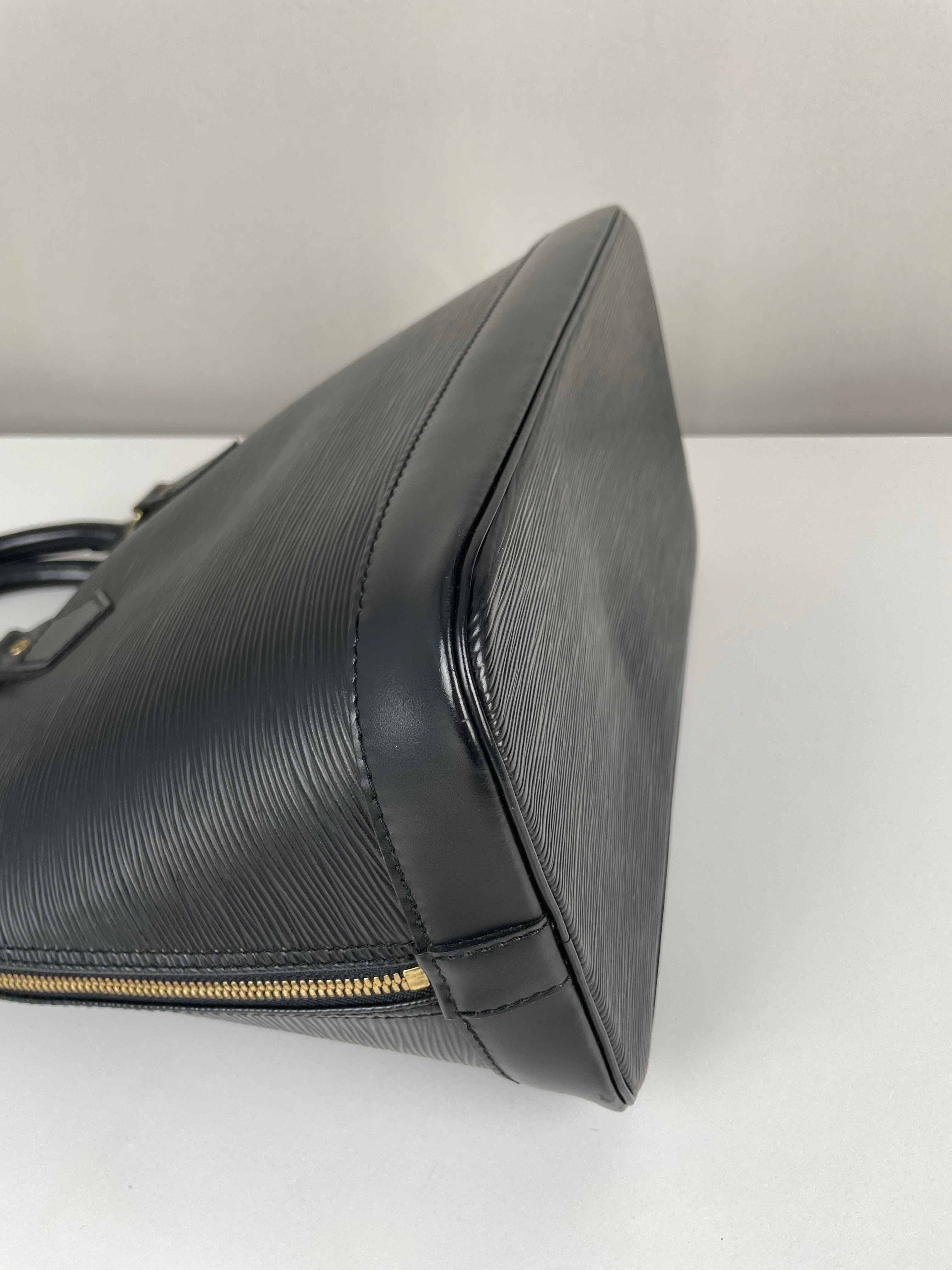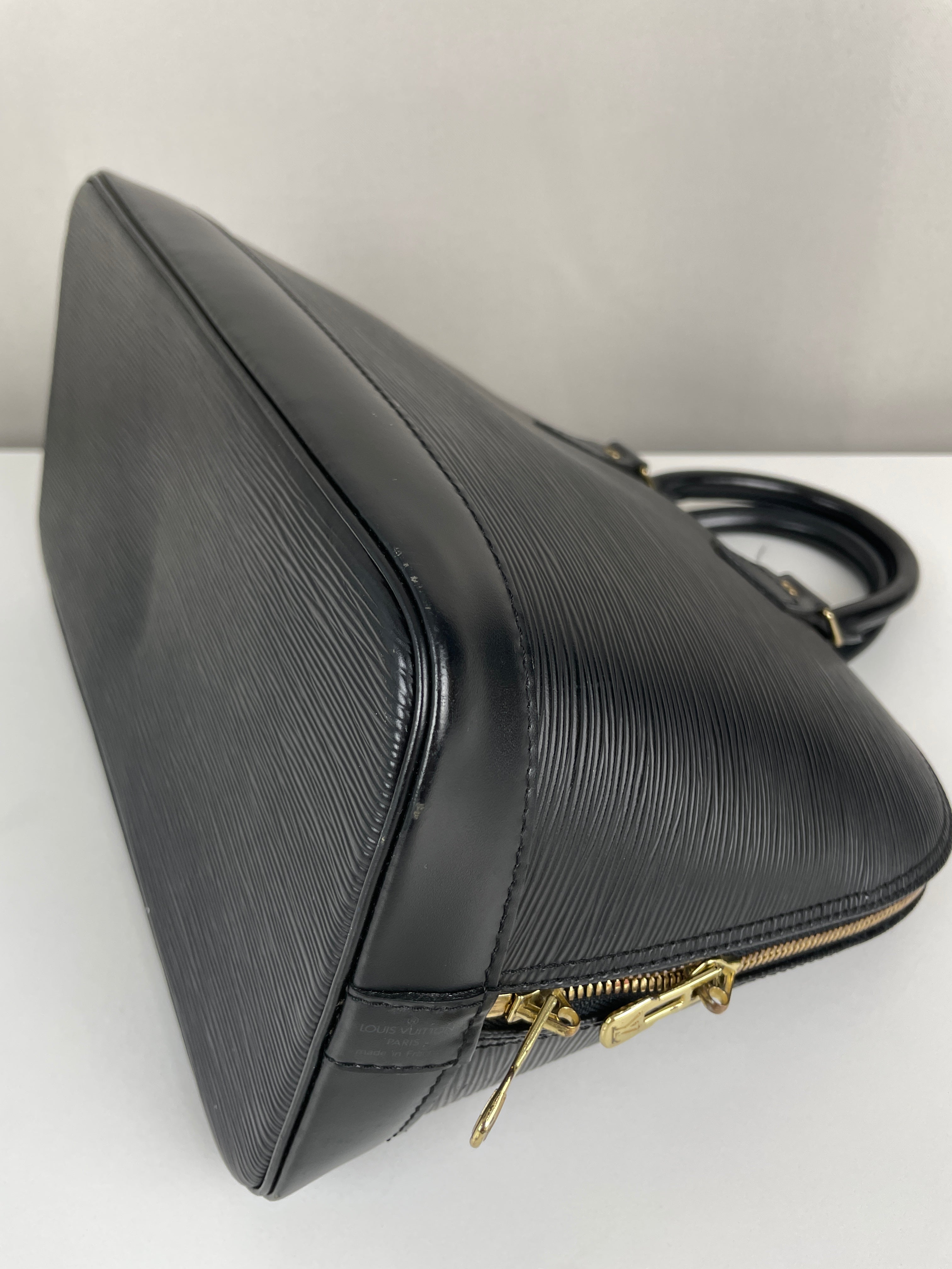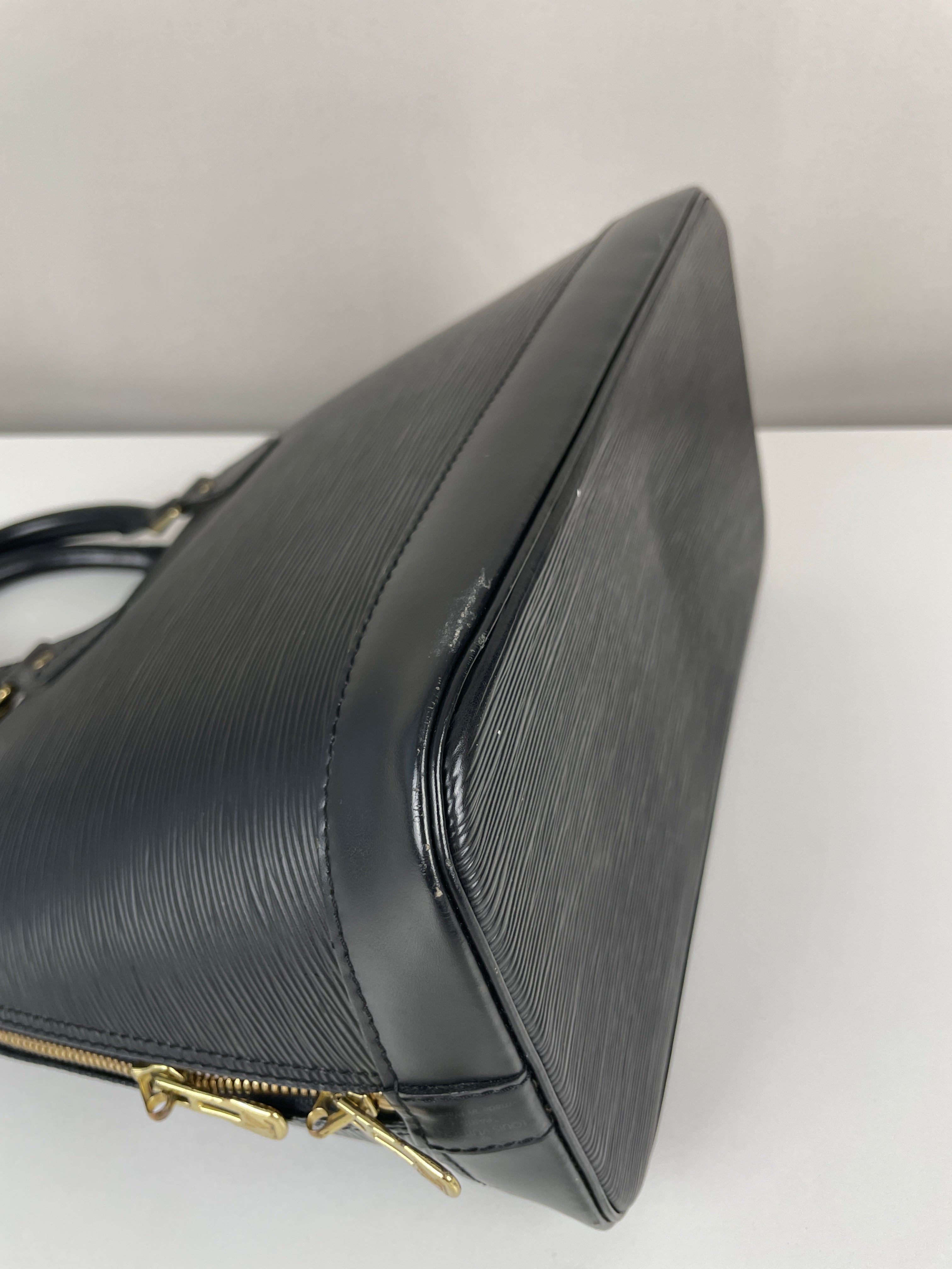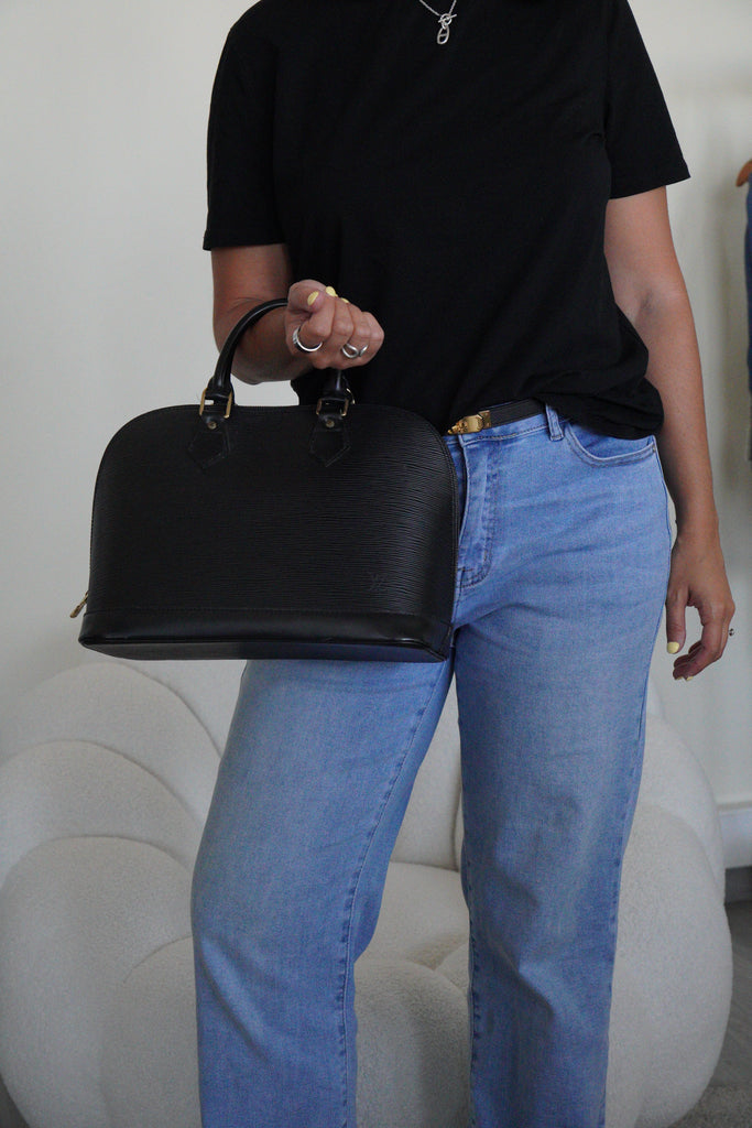 This Louis Vuitton Alma PM in iconic black Epi leather is a timeless vintage piece from 1996. Sleek, structured, and effortlessly elegant, it's the perfect handbag for day or evening. The textured Epi leather and classic silhouette make it a discreet luxury statement.