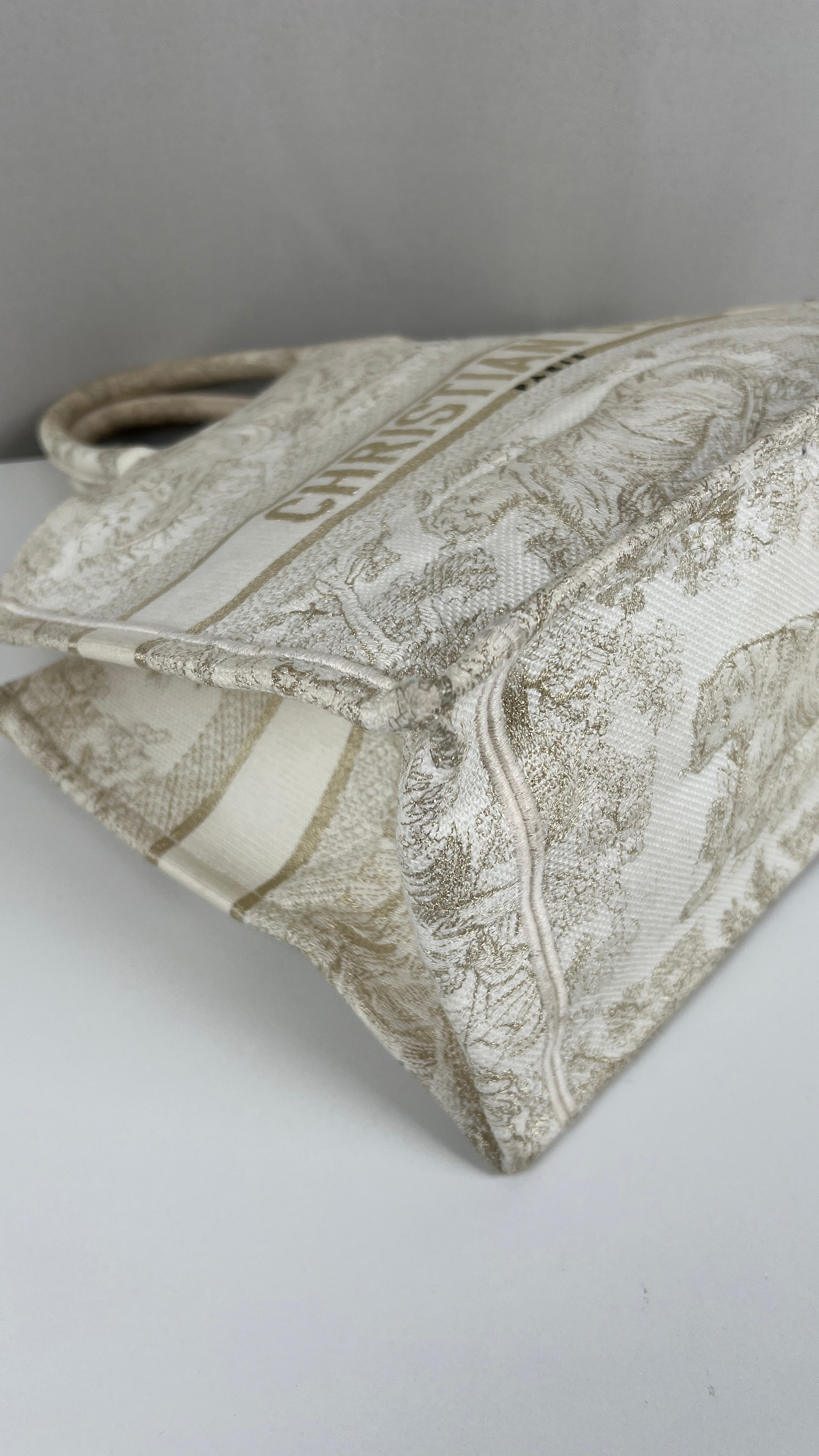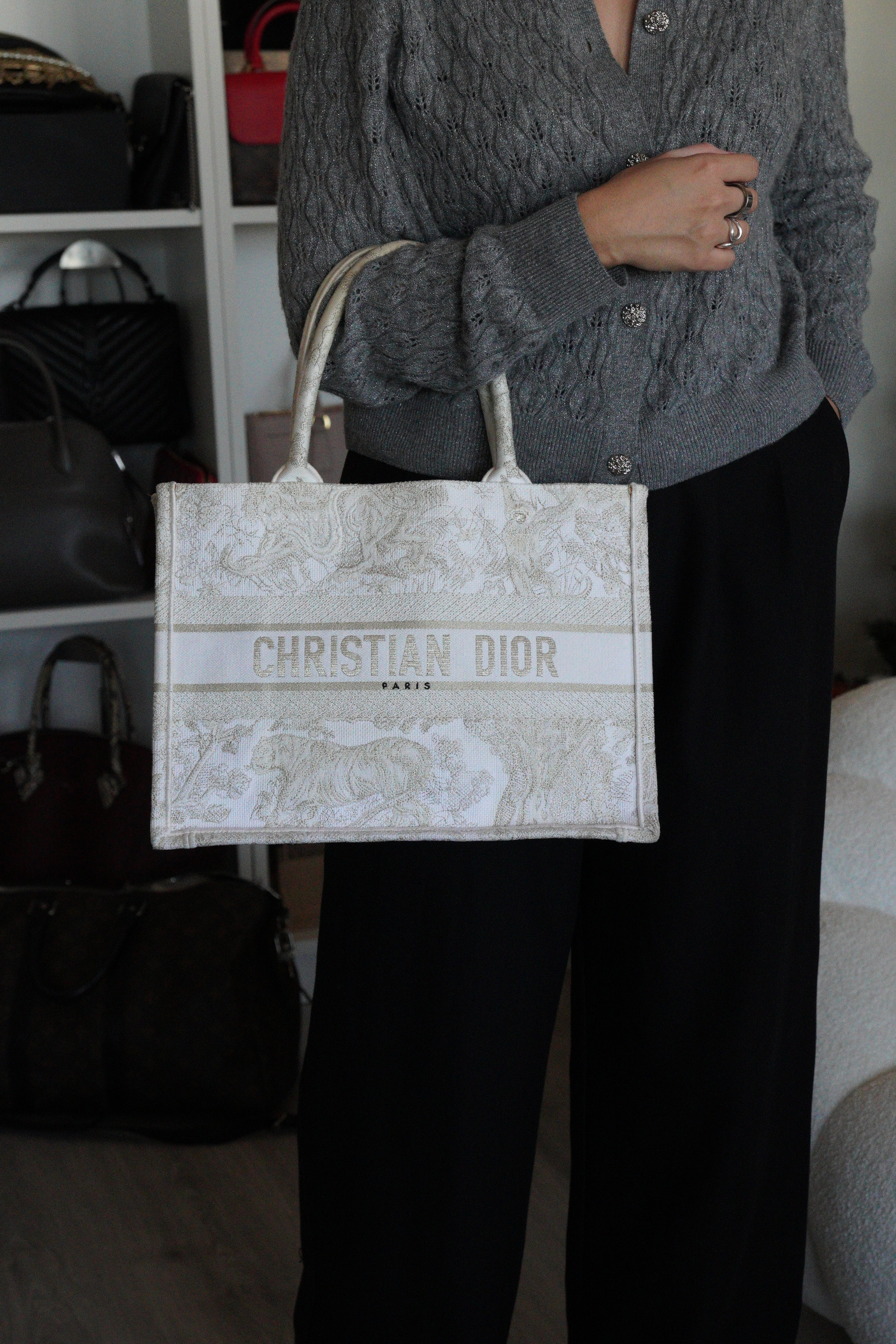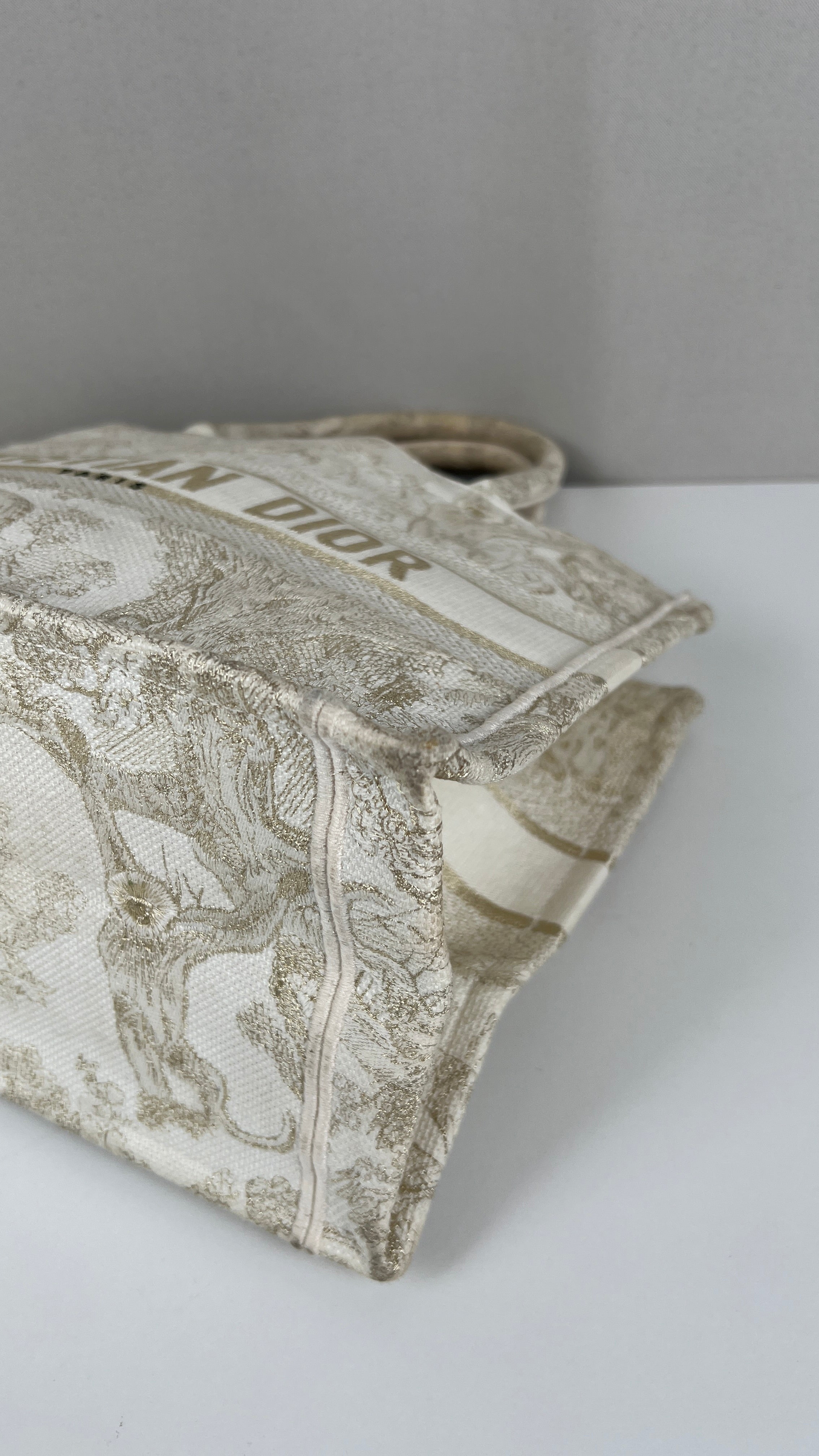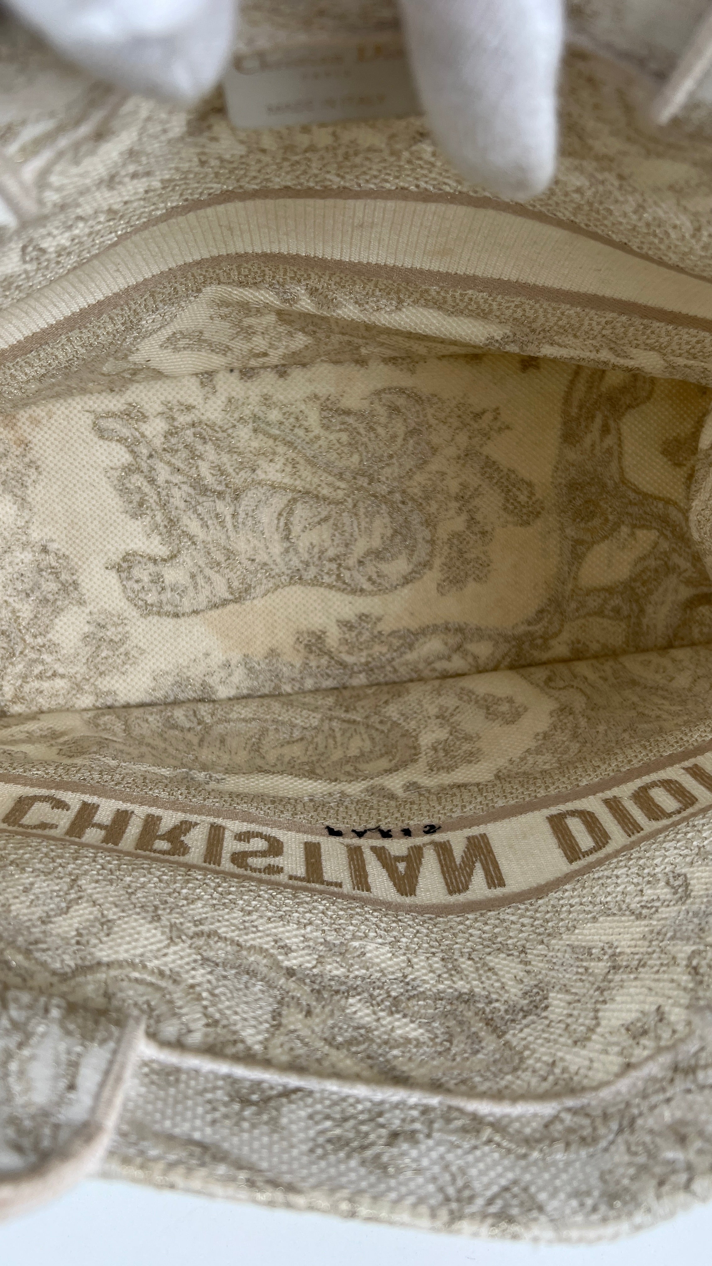 Ce sac Dior Book Tote est en bon/très bon état. Il y a des traces de porté sur la poignée, naturelles. Le tissu est en très bon état. Les coins sont en bon état quelques petites traces d'utilisation. L'intérieur est en bon état, on peut voir quelques petites taches, très mineures. A l'extérieur presque aucune tache, très peu, légères près des côtés en raison des matériaux utilisés. Un peu brillant, c'est une collection limitée, très beau sac !