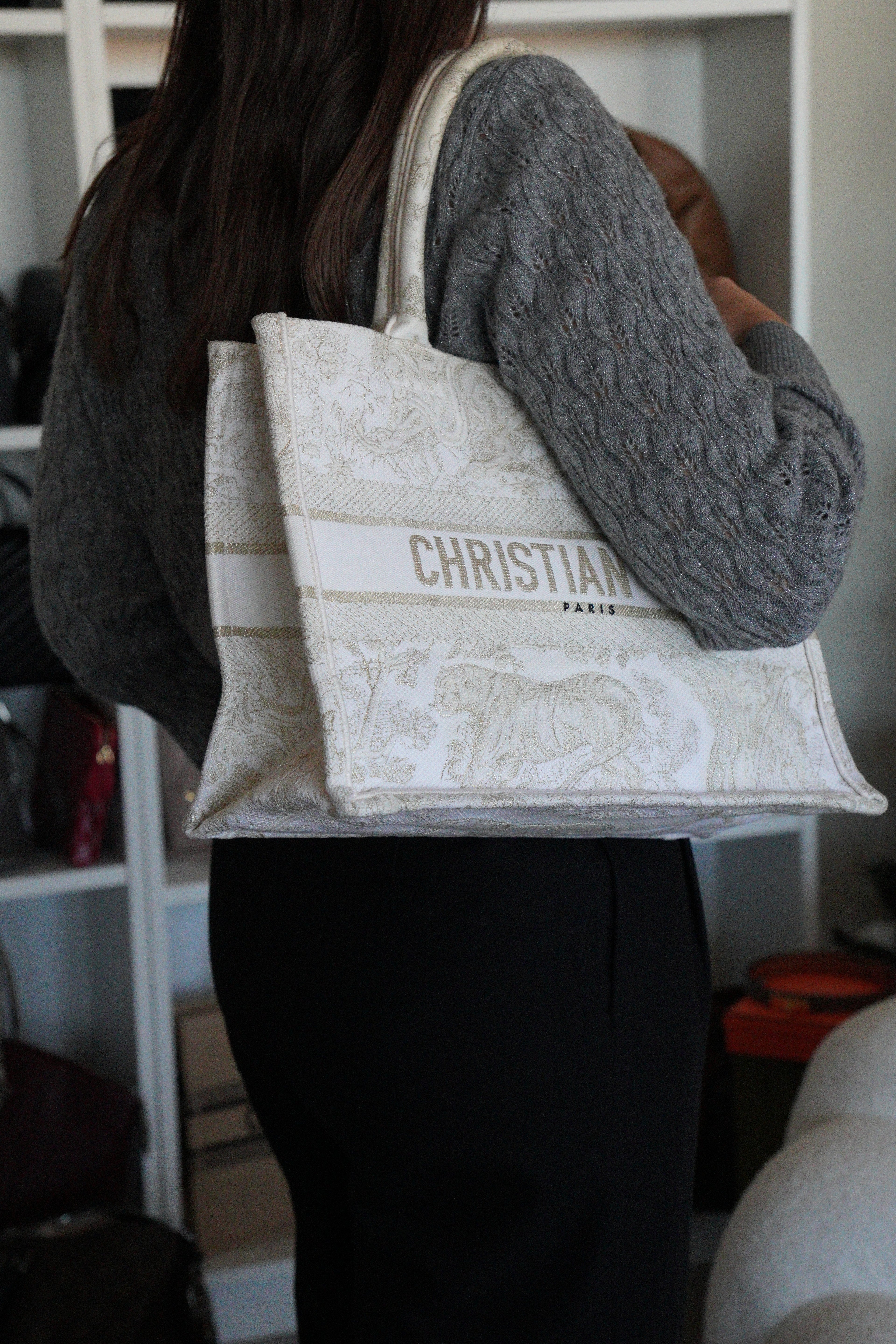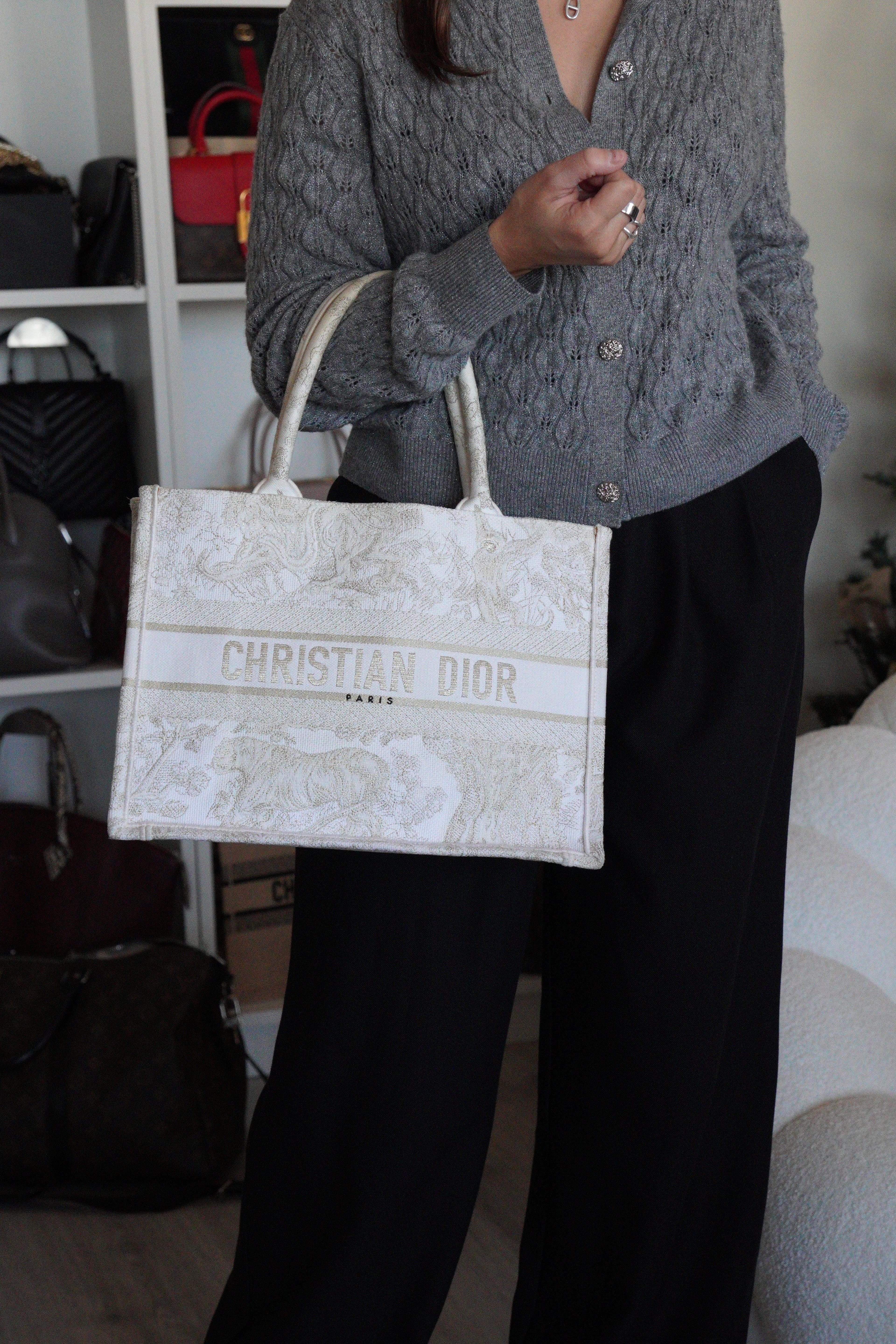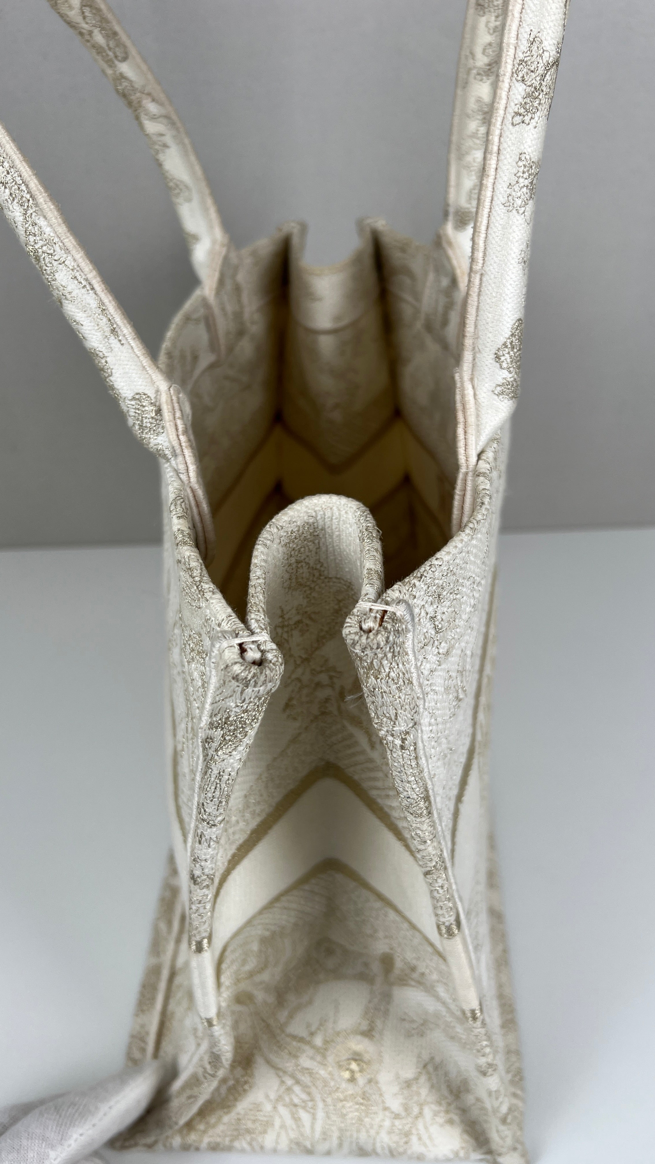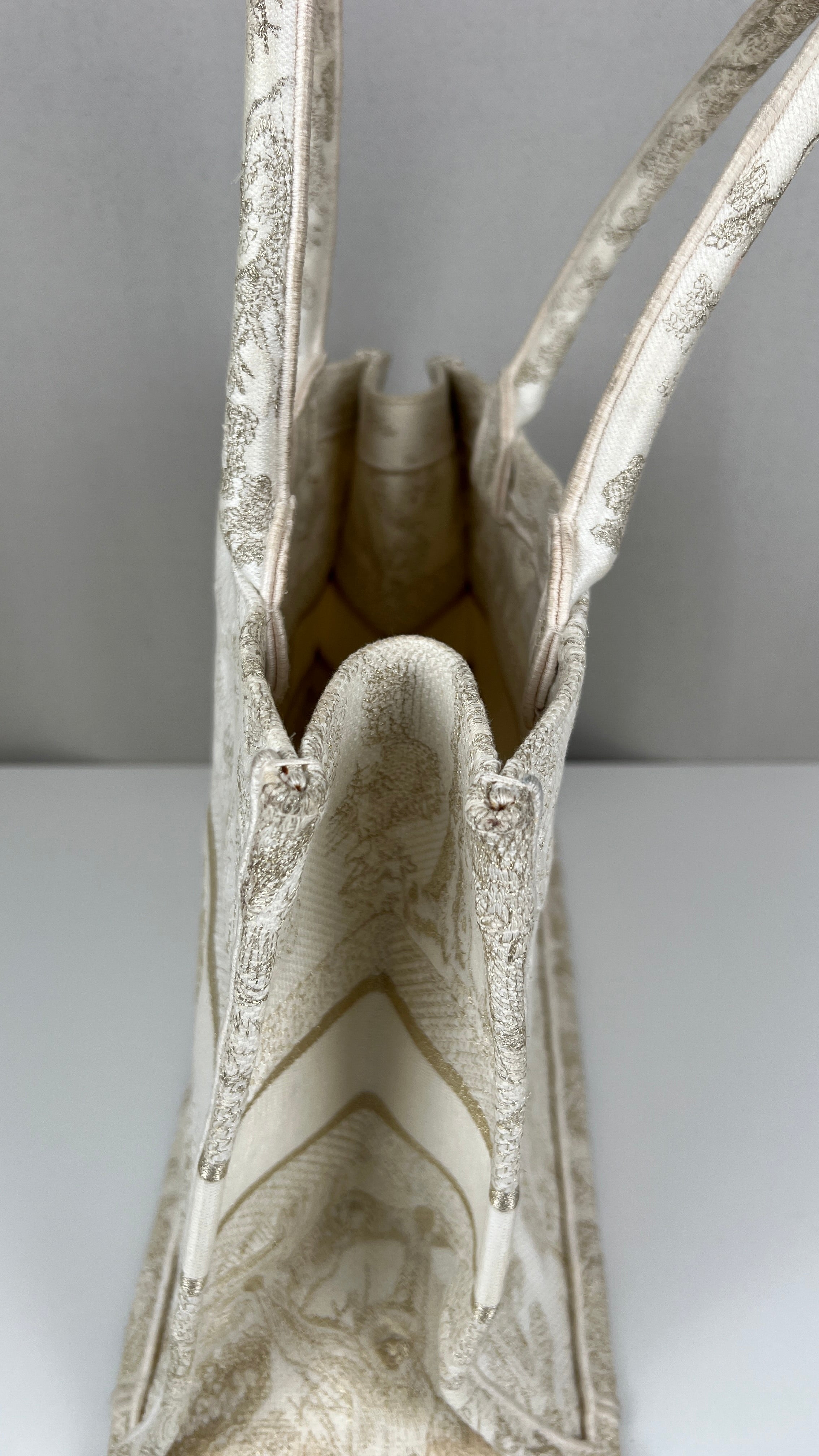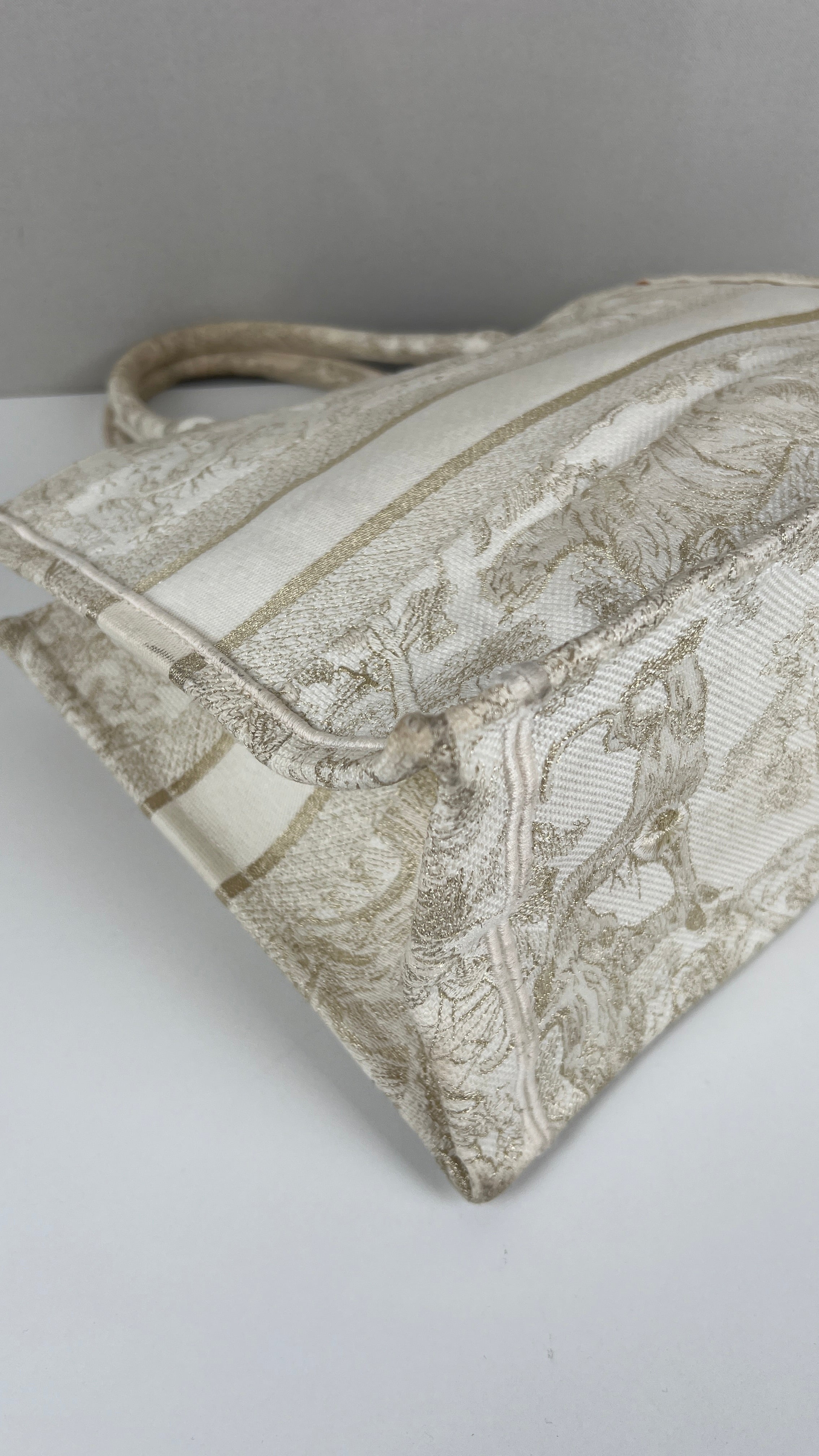Ce sac Dior Book Tote est en bon/très bon état. Il y a des traces de porté sur la poignée, naturelles. Le tissu est en très bon état. Les coins sont en bon état quelques petites traces d'utilisation. L'intérieur est en bon état, on peut voir quelques petites taches, très mineures. A l'extérieur presque aucune tache, très peu, légères près des côtés en raison des matériaux utilisés. Un peu brillant, c'est une collection limitée, très beau sac !