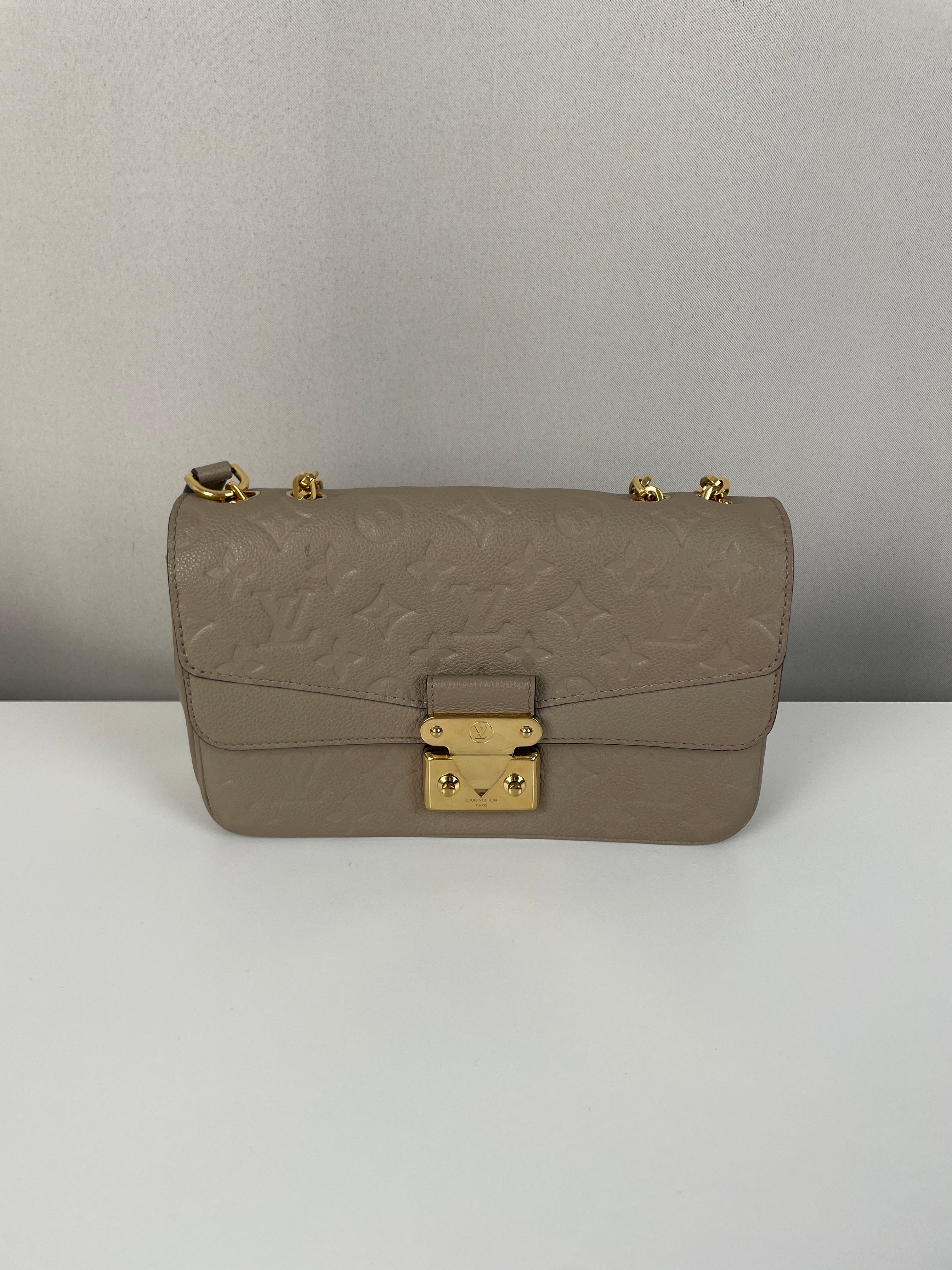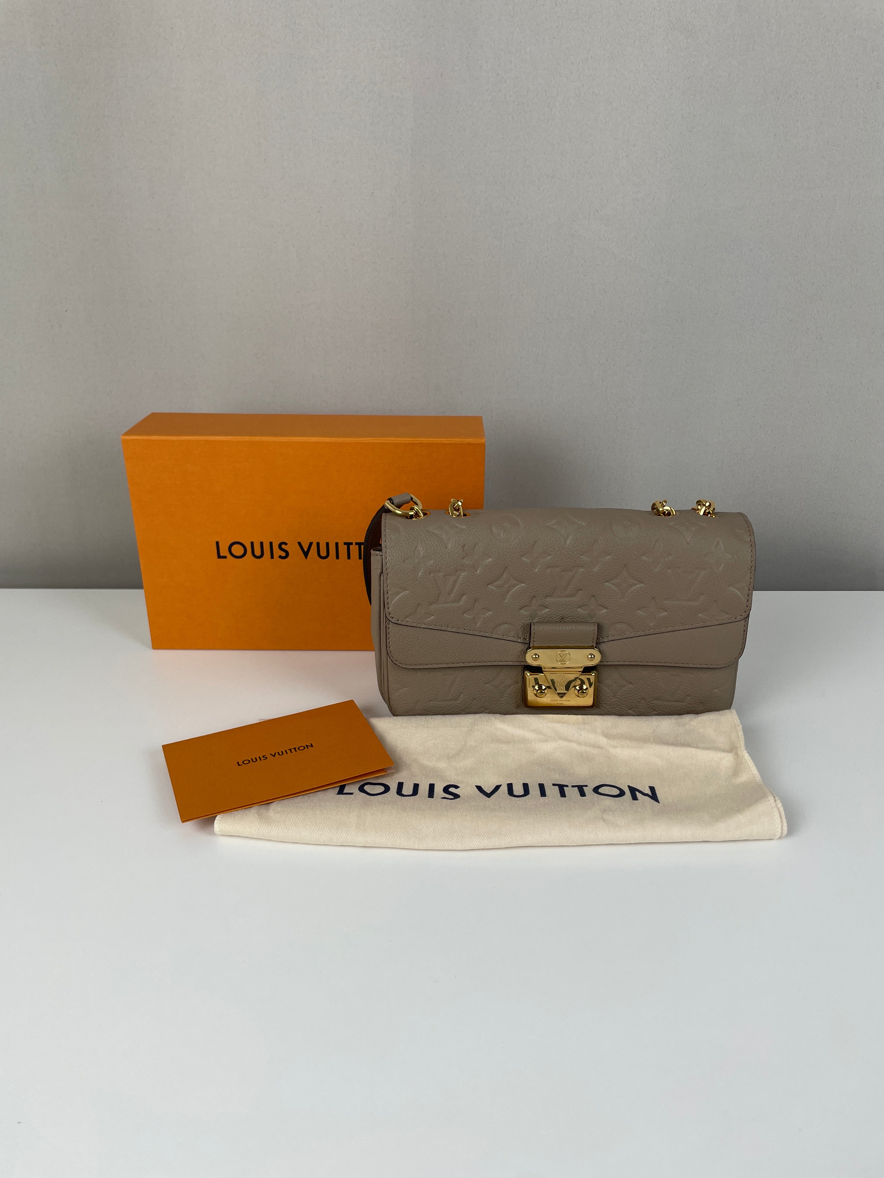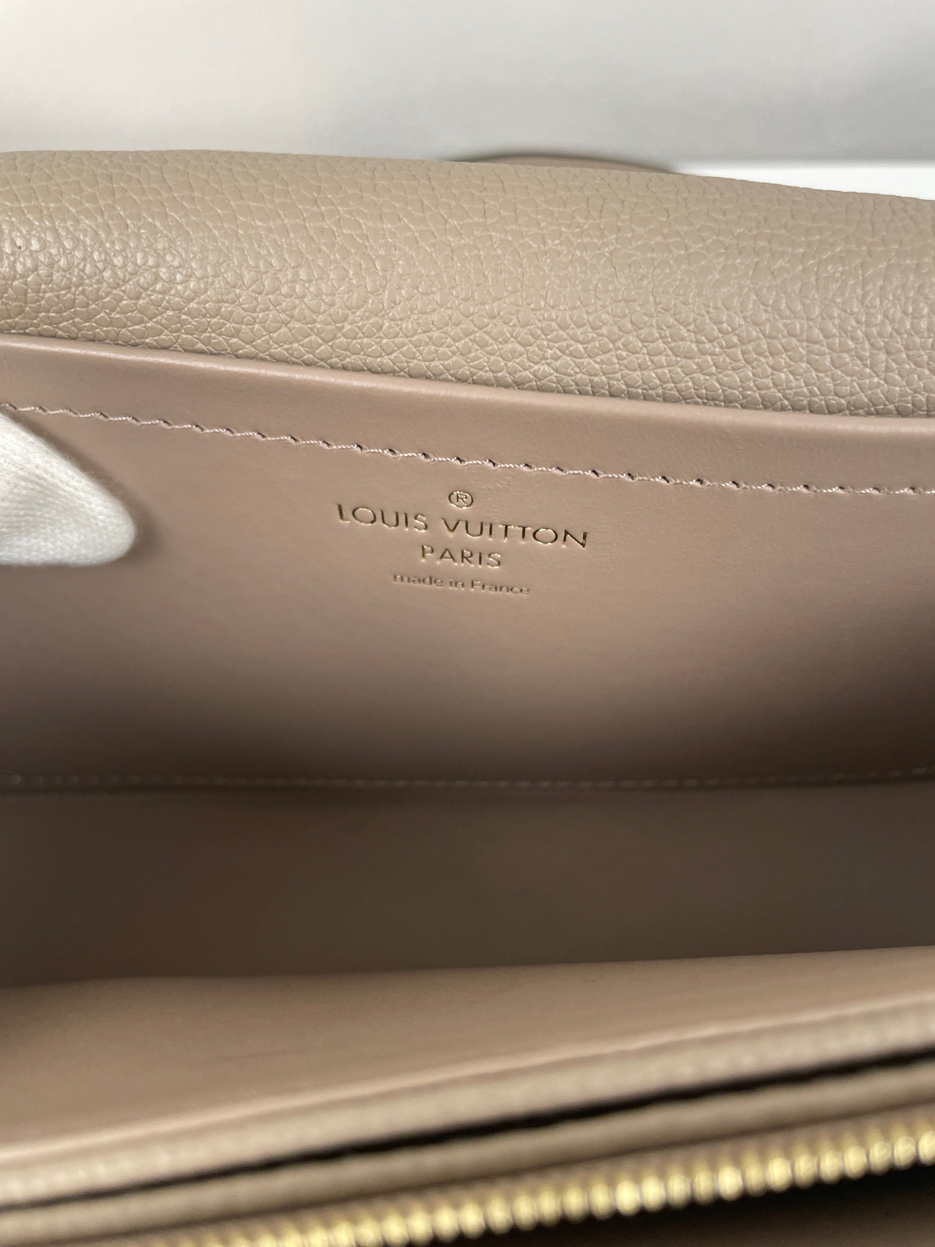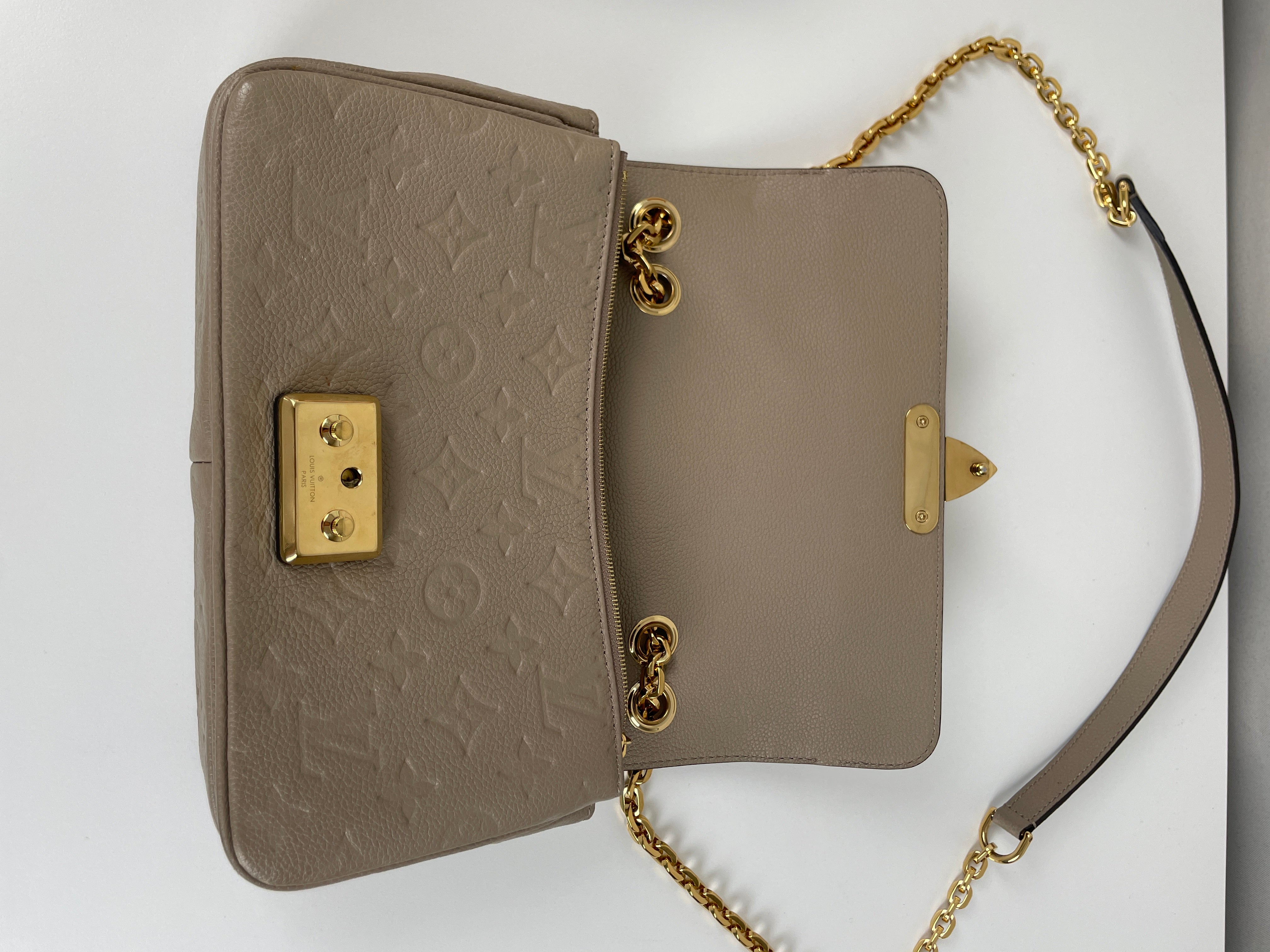 Ce sac Louis Vuitton Marceau est en très bon état. Le cuir est en très bon état, c'est un cuir empreinte couleur dune, beige taupe. La bandoulière est en très bon état. L'intérieur est en très bon état, une seule trace mineure, c'est totalement en cuir à l'intérieur. Les coins sont un peu frottés presque pas. La bijouterie sur le devant a de petites rayures naturelles. Très beau sac Louis Vuitton, en cuir superbe.