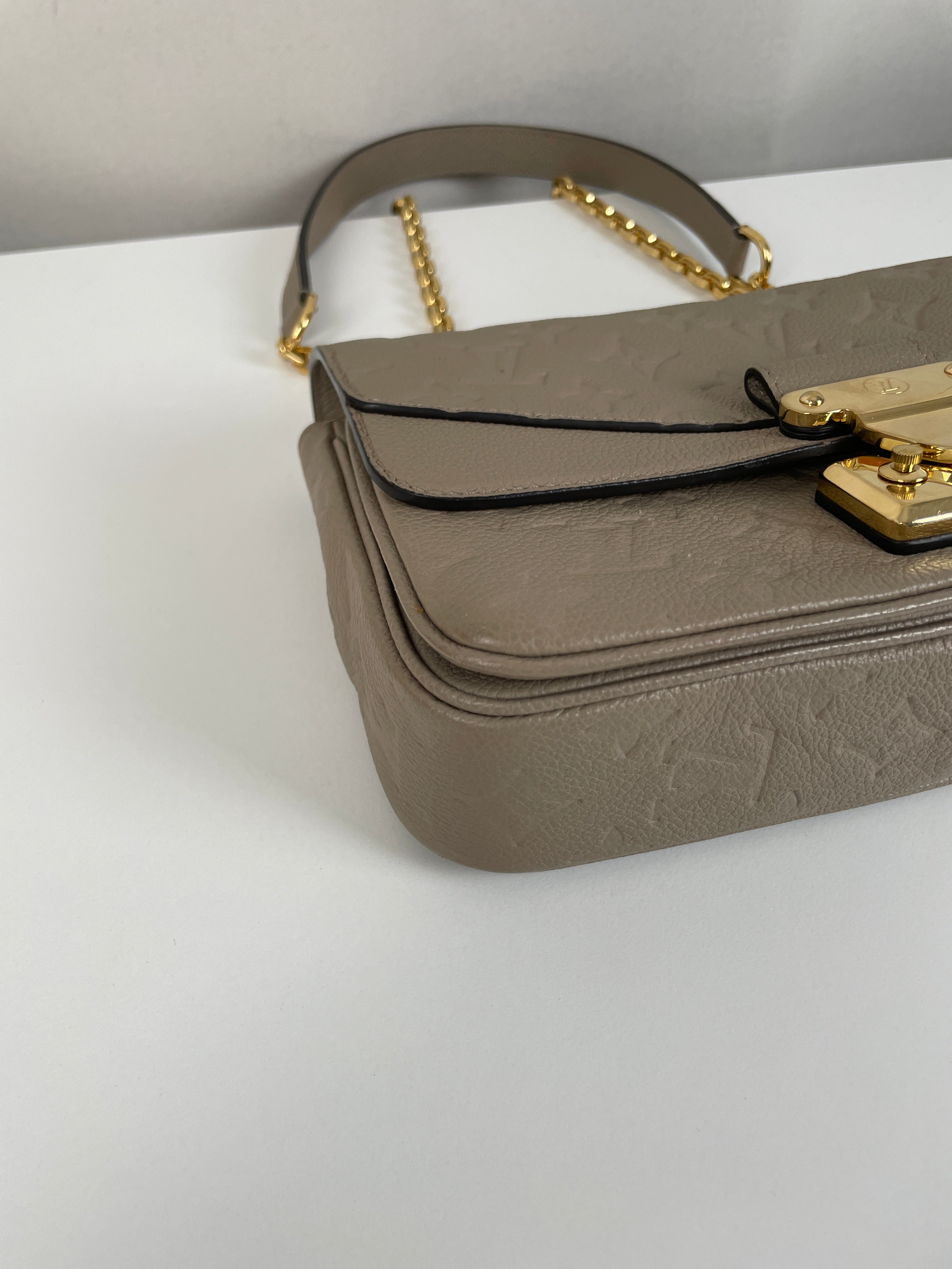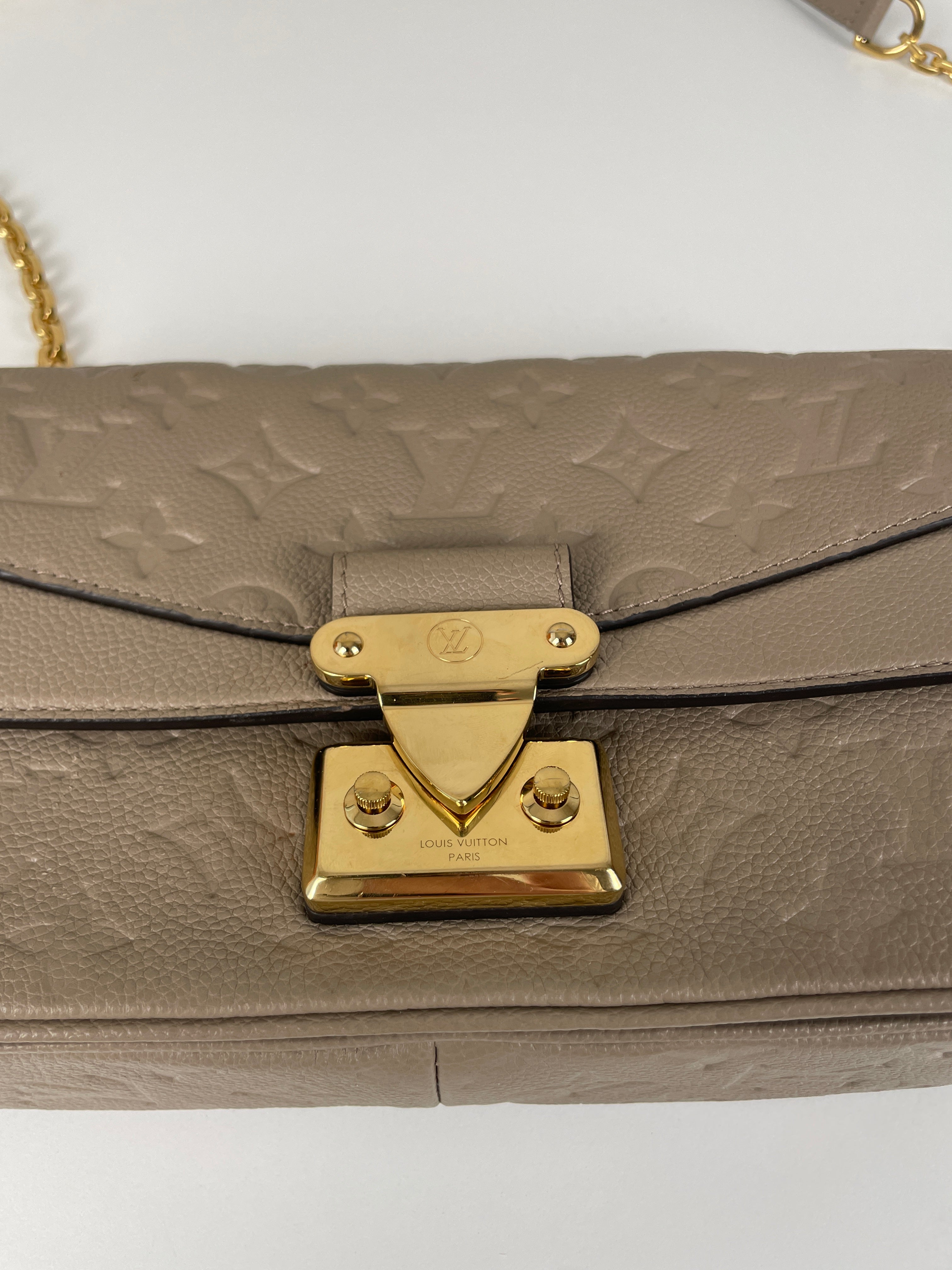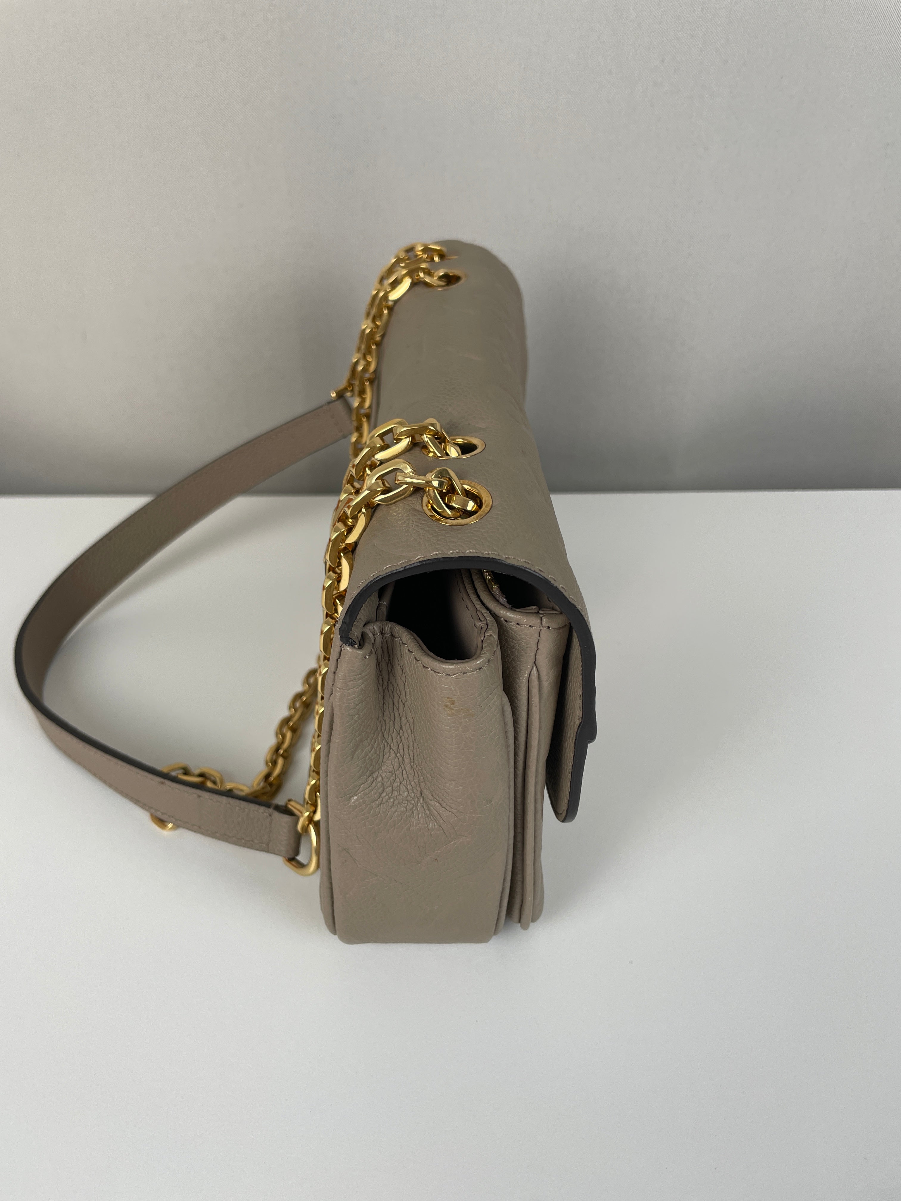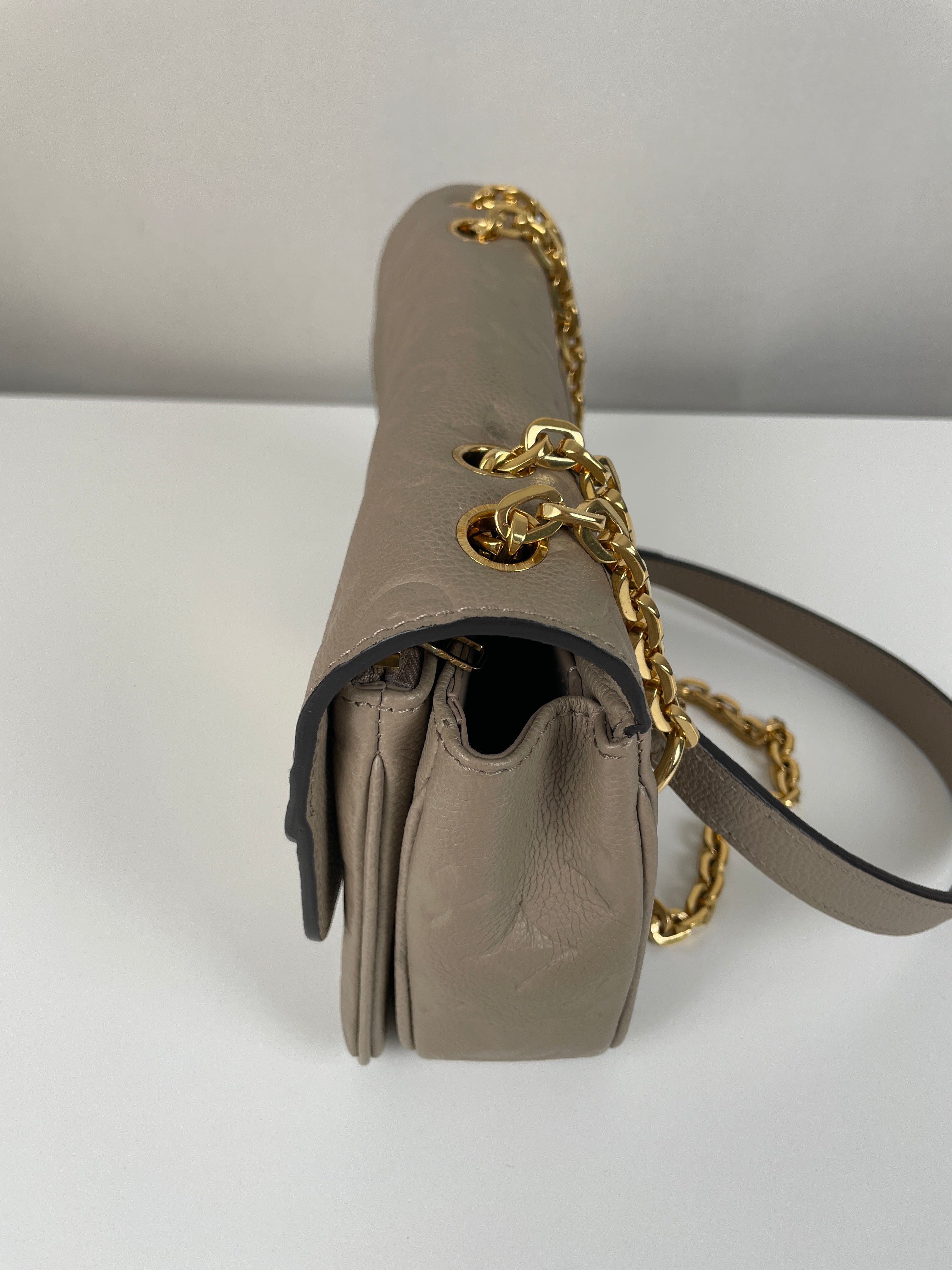 Ce sac Louis Vuitton Marceau est en très bon état. Le cuir est en très bon état, c'est un cuir empreinte couleur dune, beige taupe. La bandoulière est en très bon état. L'intérieur est en très bon état, une seule trace mineure, c'est totalement en cuir à l'intérieur. Les coins sont un peu frottés presque pas. La bijouterie sur le devant a de petites rayures naturelles. Très beau sac Louis Vuitton, en cuir superbe.