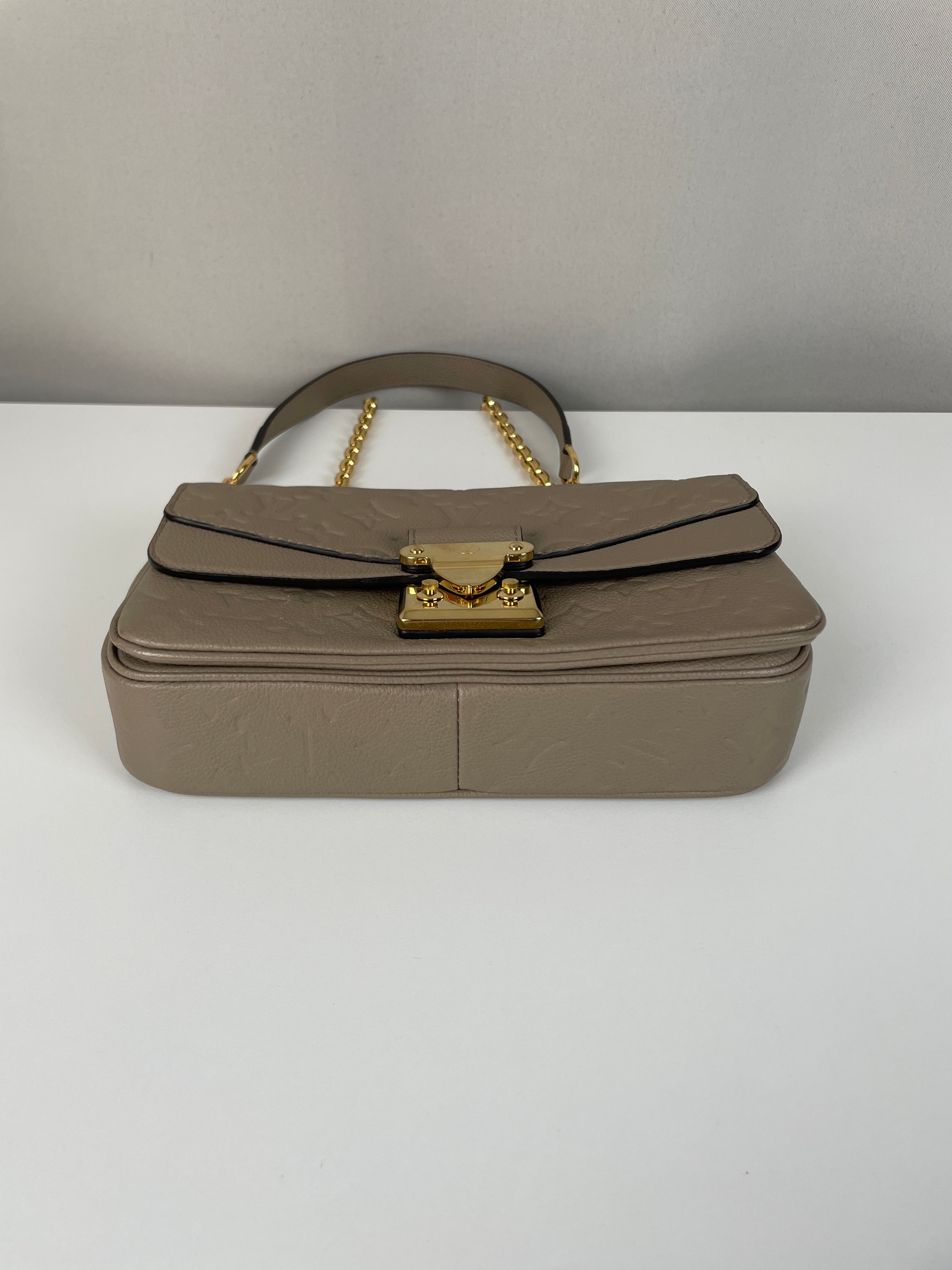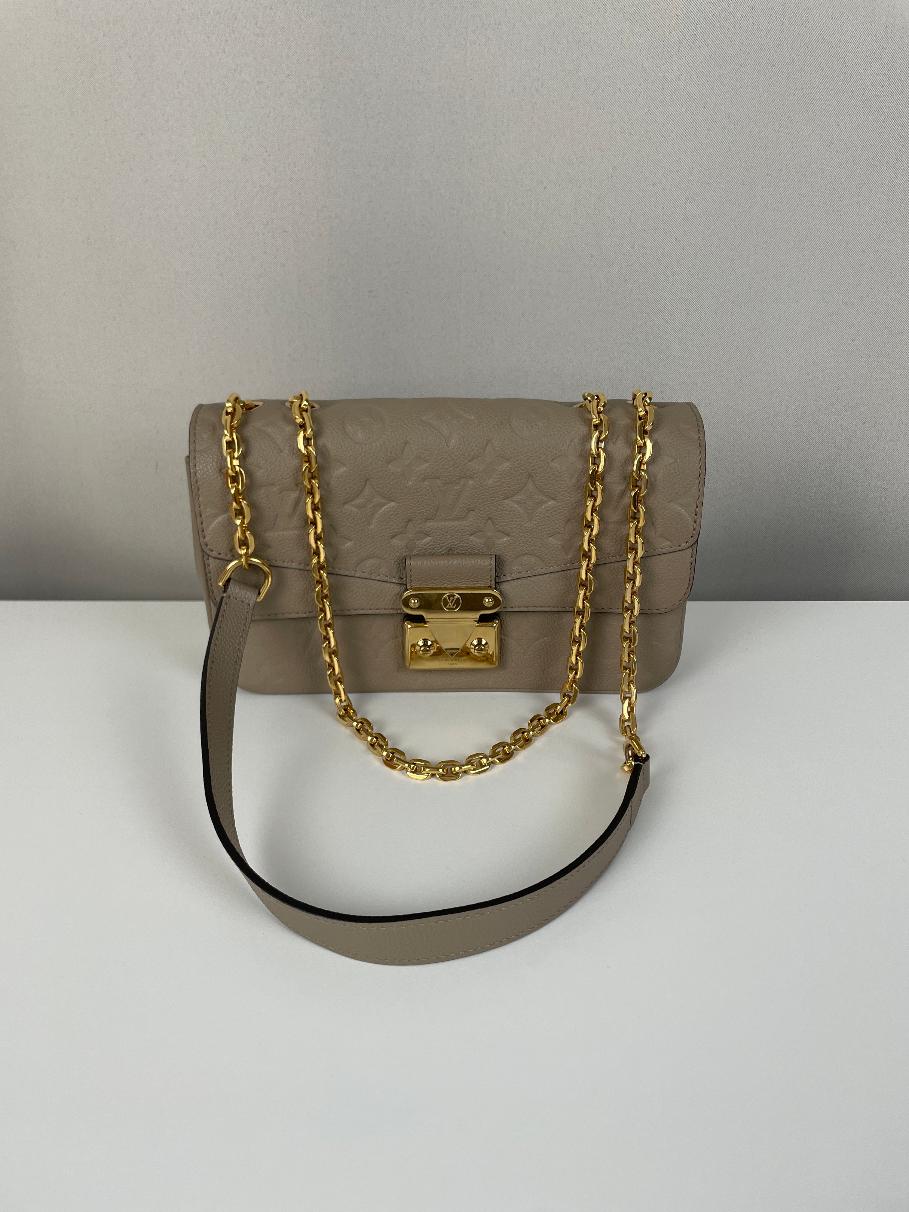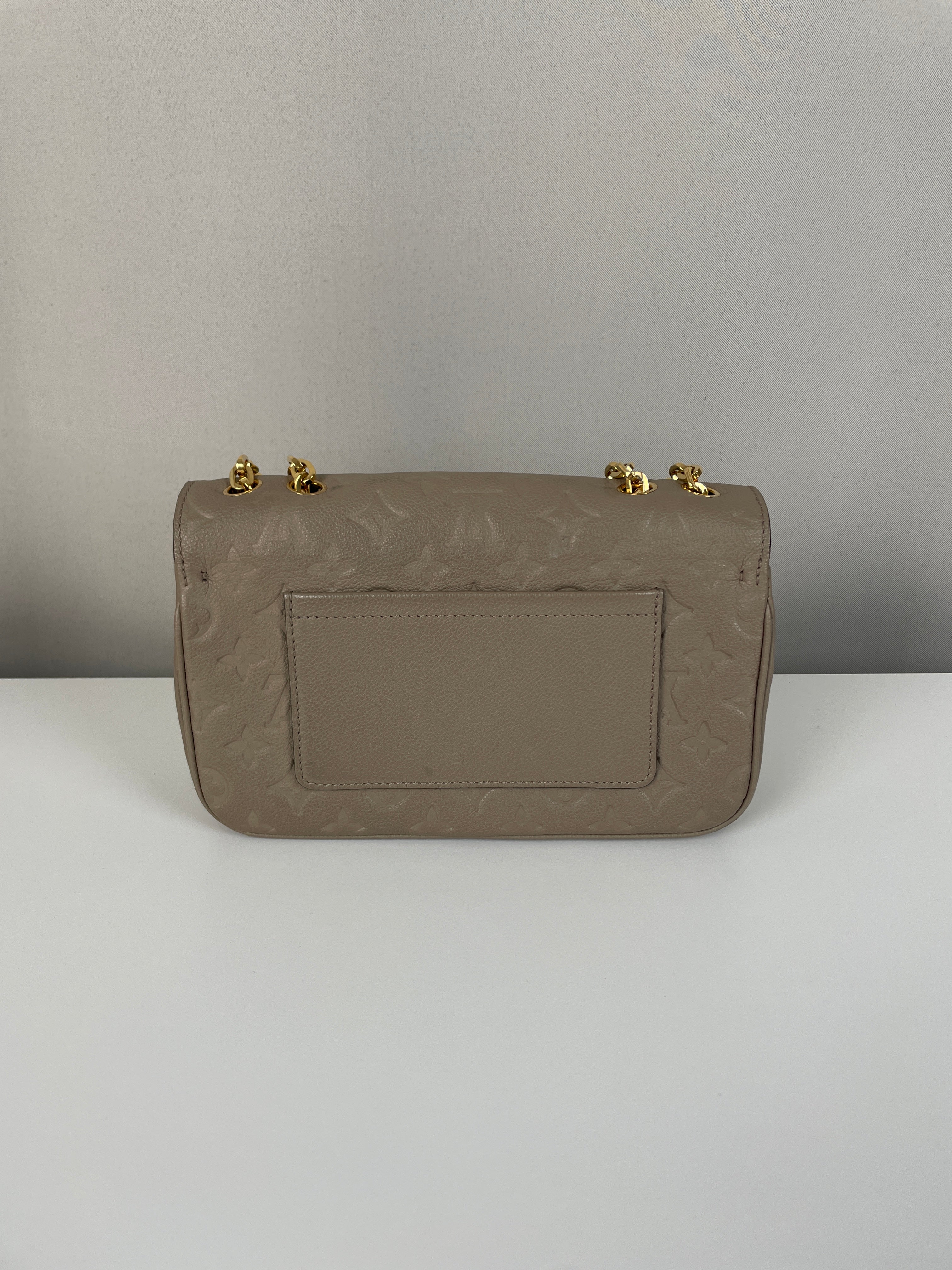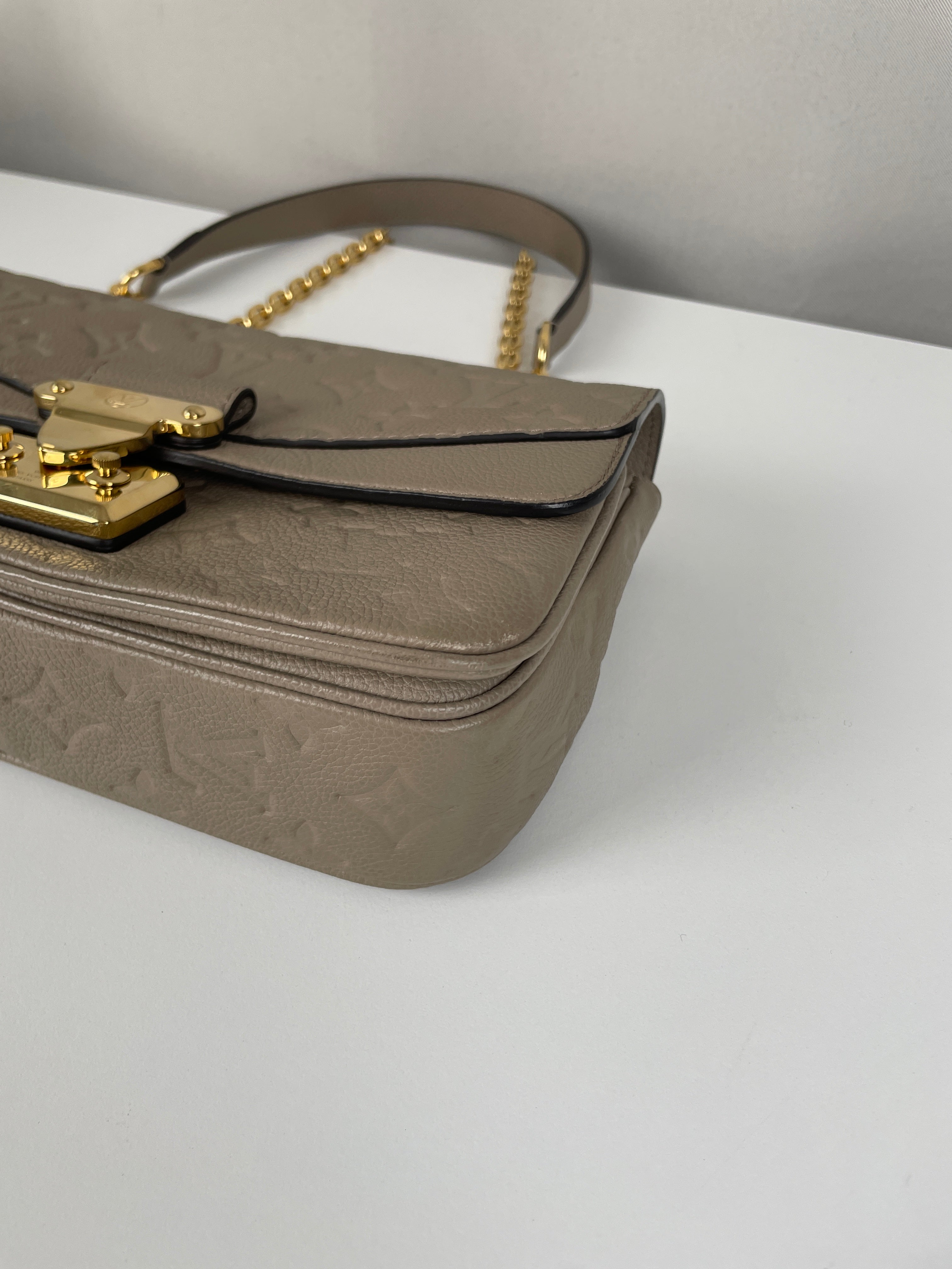 Ce sac Louis Vuitton Marceau est en très bon état. Le cuir est en très bon état, c'est un cuir empreinte couleur dune, beige taupe. La bandoulière est en très bon état. L'intérieur est en très bon état, une seule trace mineure, c'est totalement en cuir à l'intérieur. Les coins sont un peu frottés presque pas. La bijouterie sur le devant a de petites rayures naturelles. Très beau sac Louis Vuitton, en cuir superbe.