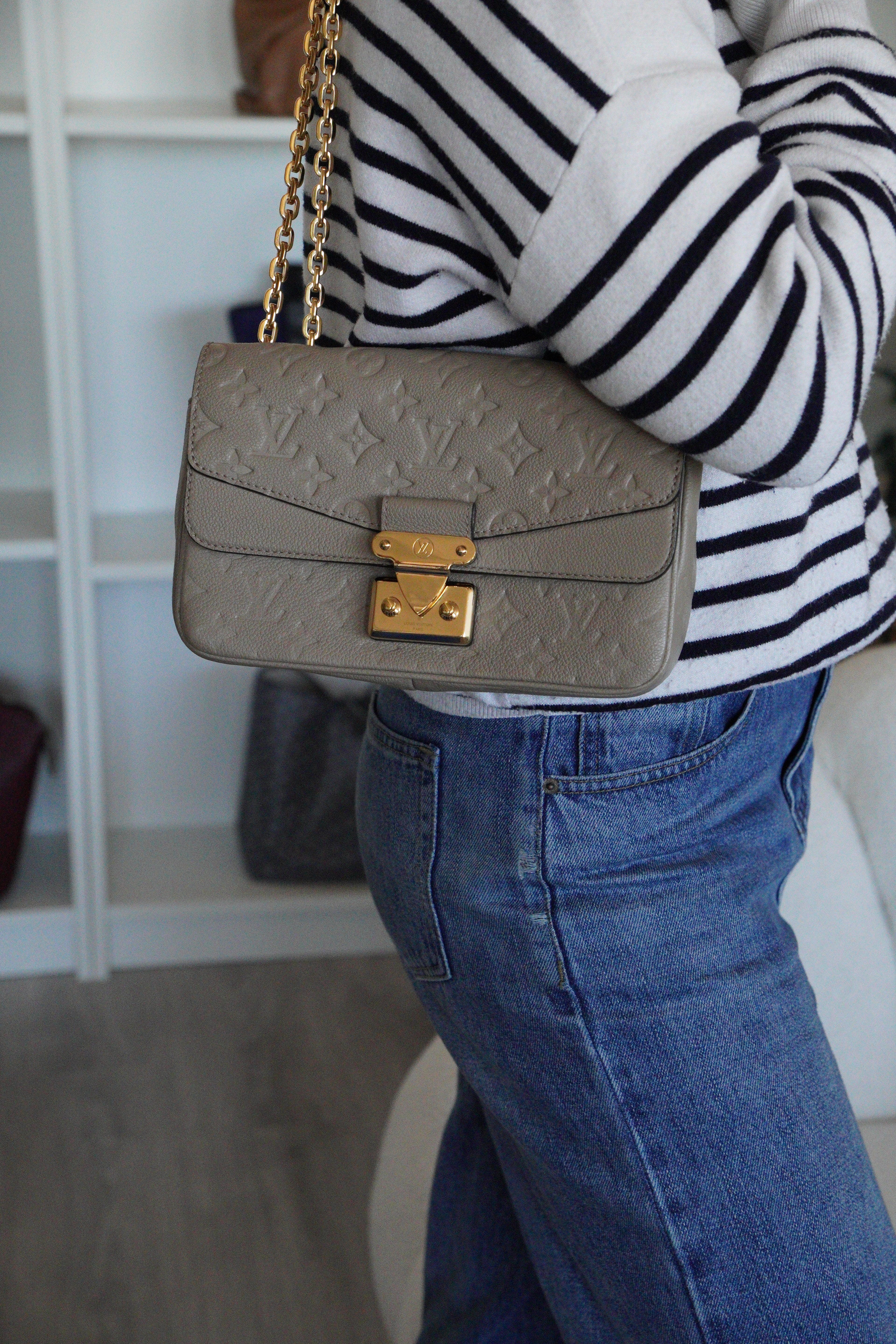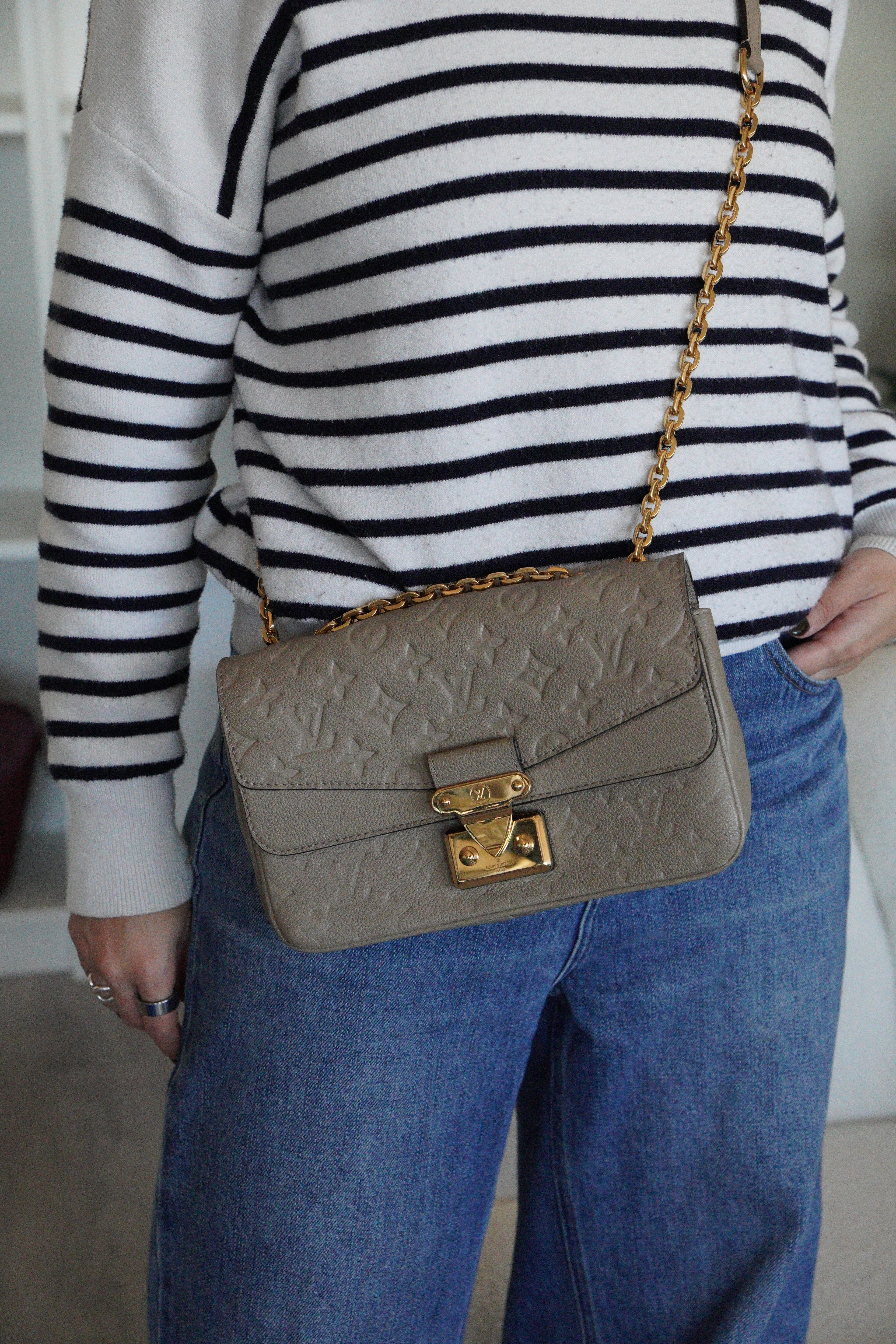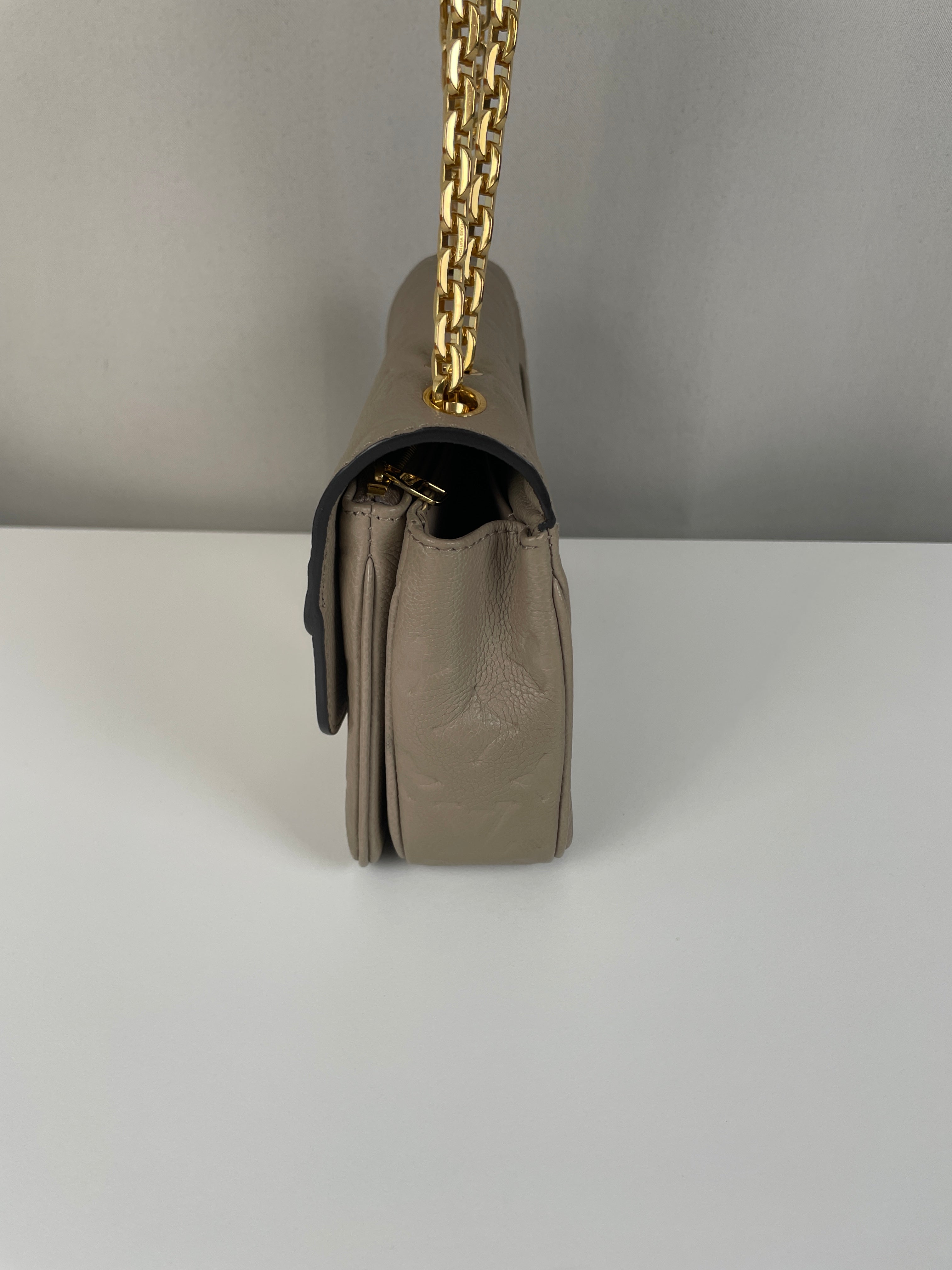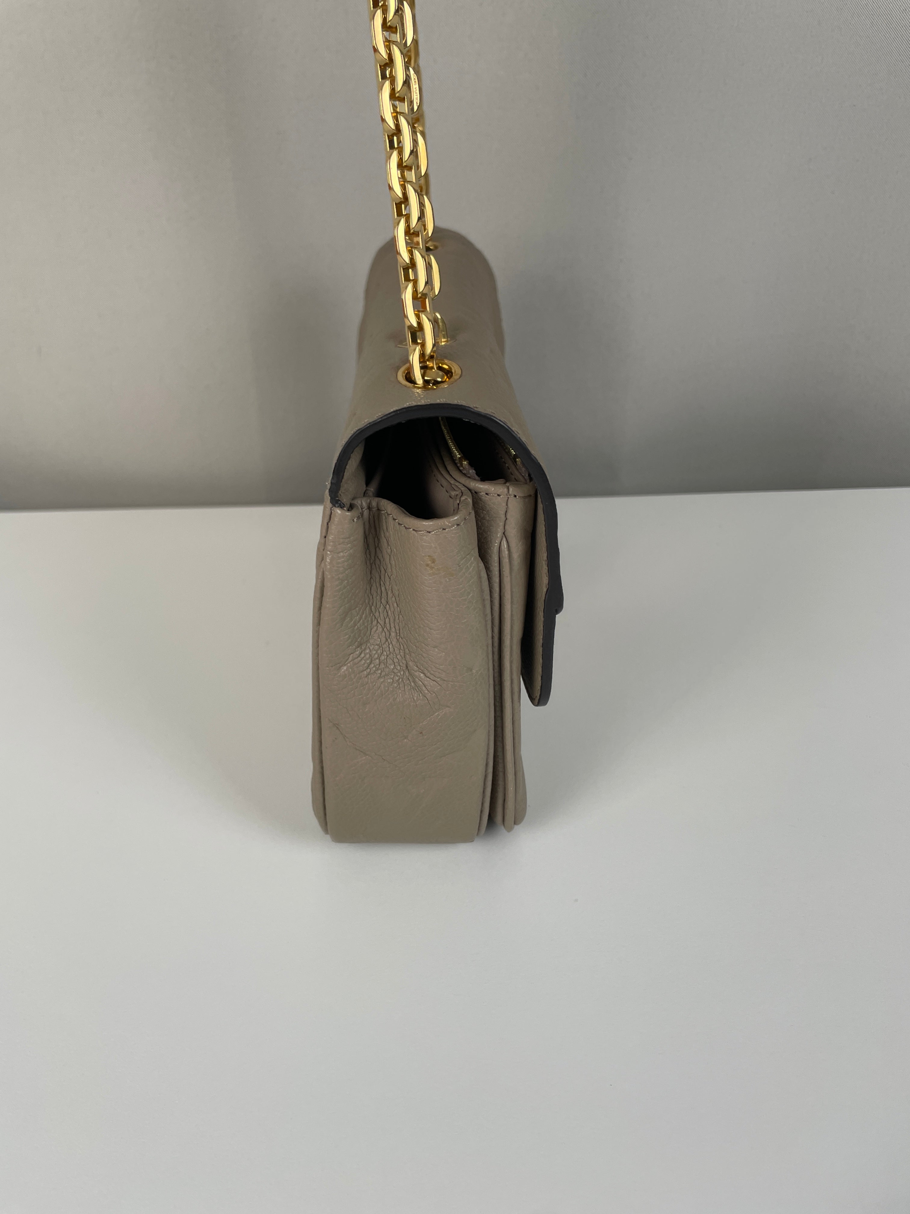 Ce sac Louis Vuitton Marceau est en très bon état. Le cuir est en très bon état, c'est un cuir empreinte couleur dune, beige taupe. La bandoulière est en très bon état. L'intérieur est en très bon état, une seule trace mineure, c'est totalement en cuir à l'intérieur. Les coins sont un peu frottés presque pas. La bijouterie sur le devant a de petites rayures naturelles. Très beau sac Louis Vuitton, en cuir superbe.