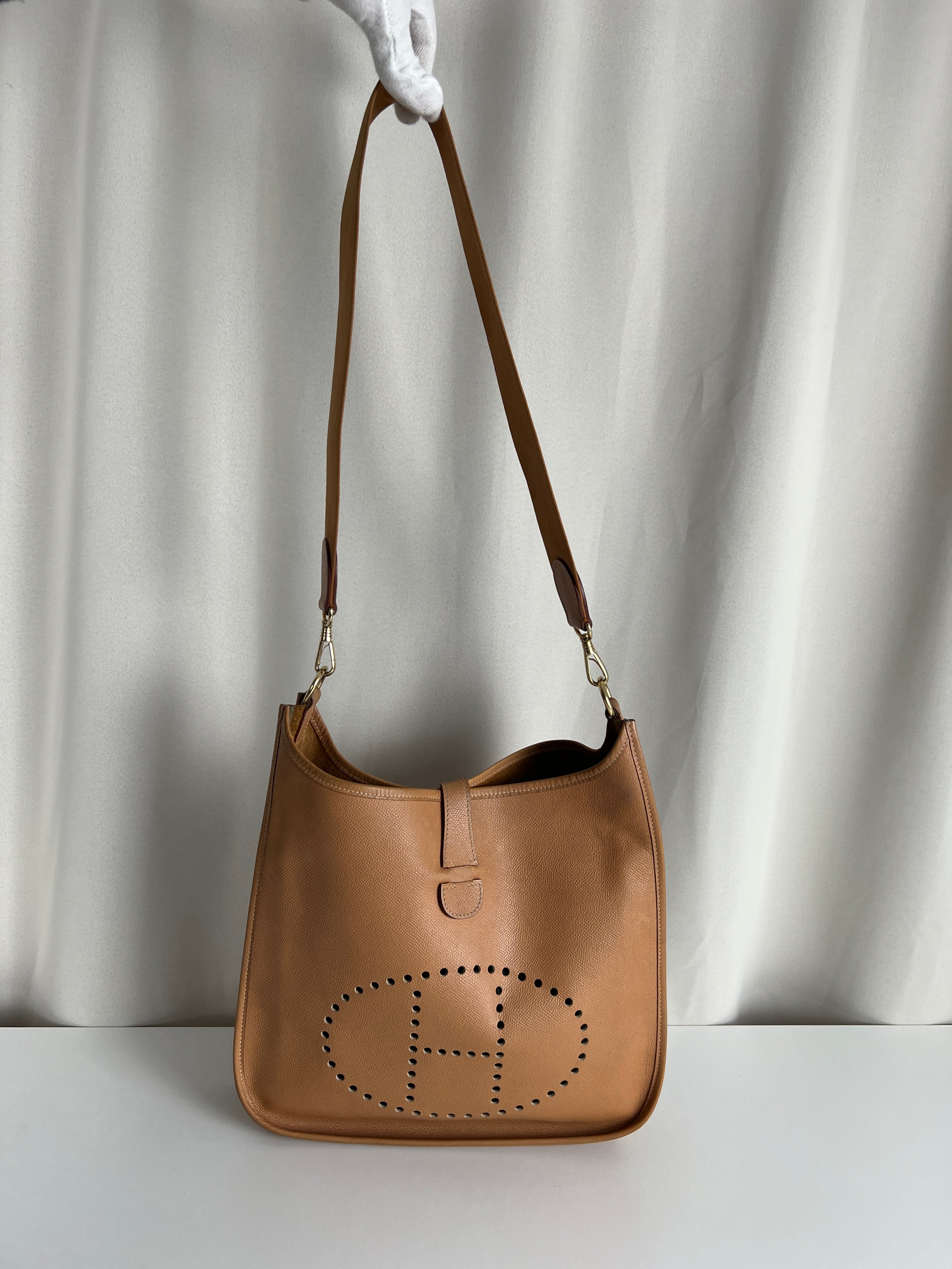 Sac Hermès Evelyne GM en cuir couleur biscuit bijouterie doré