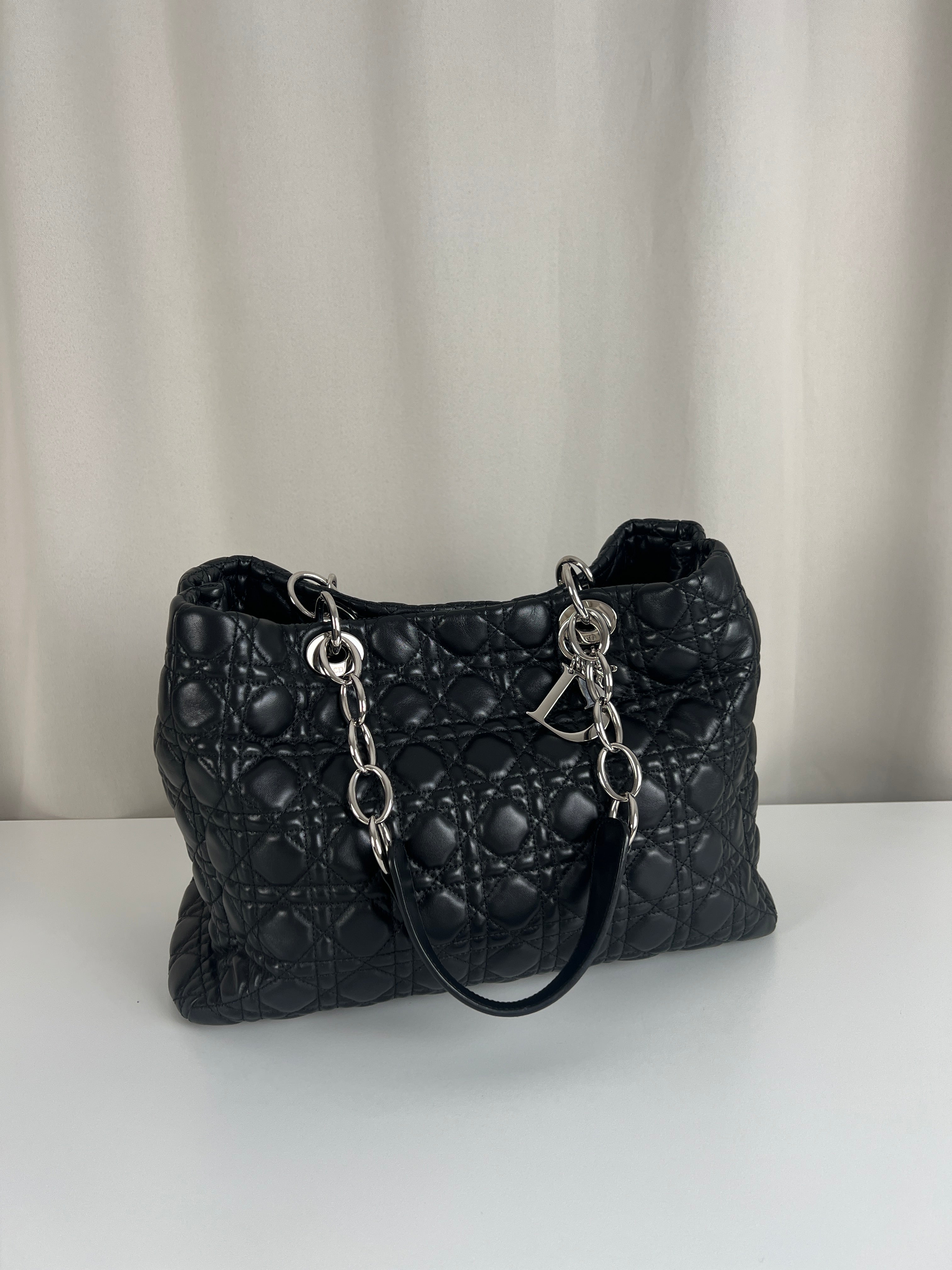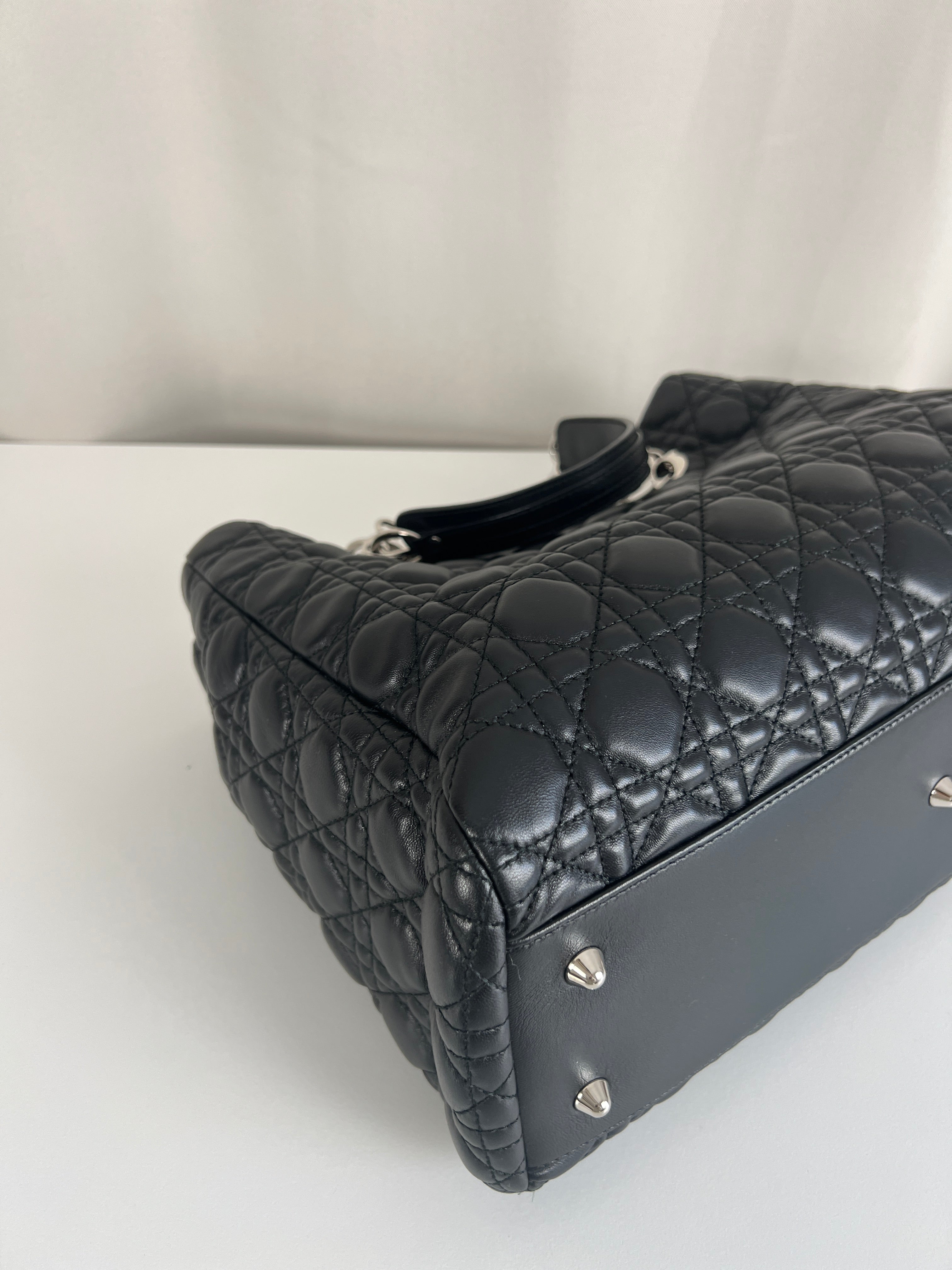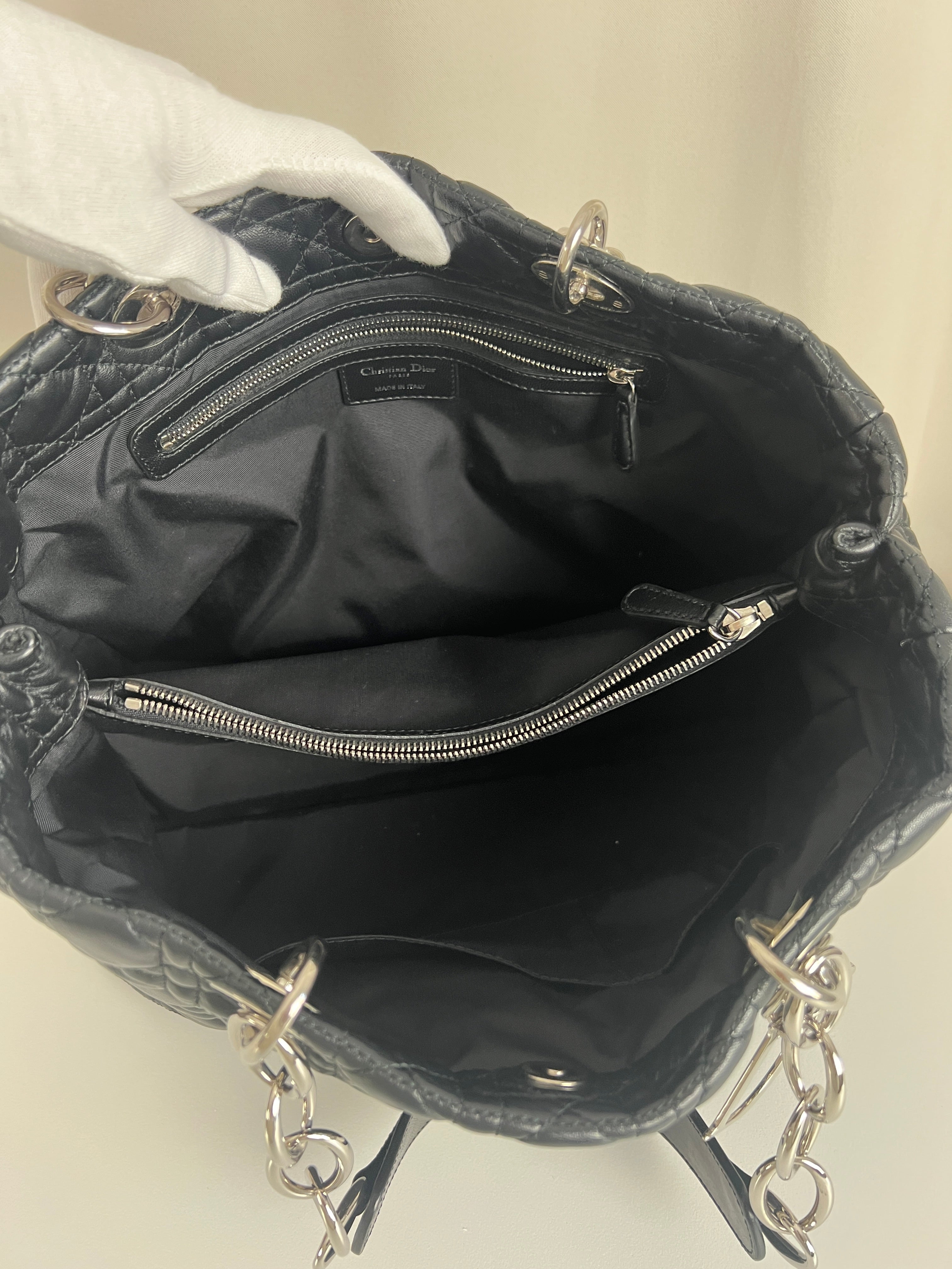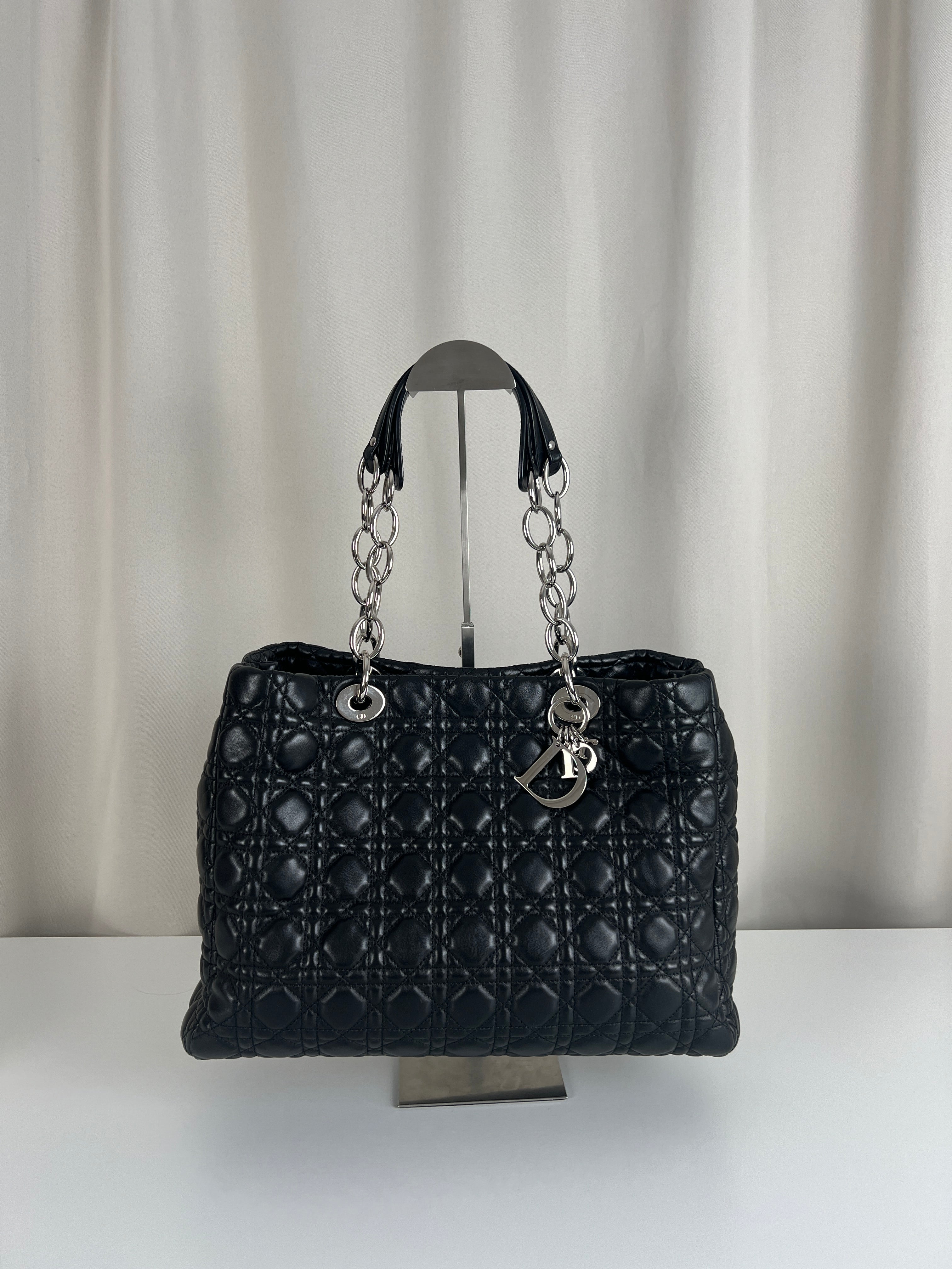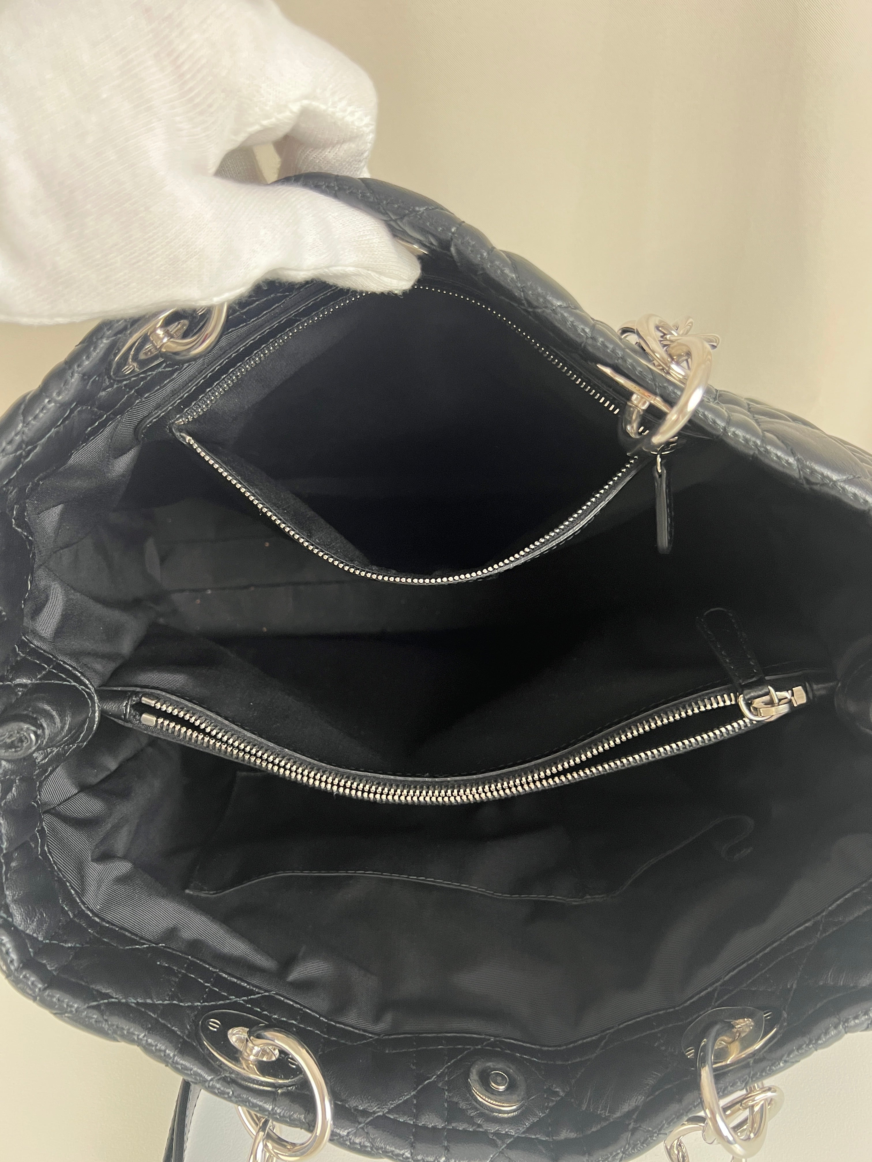 Ce cabas en cuir Dior Soft est de couleur noir avec bijouterie argentée. L'état du sac est très bon. Il est livré avec un dustbag et un certificat Entrupy. L'extérieur est très bien, le cuir est très bien. Les coins sont également très bons. Les poignées sont très bonnes. La bijouterie a de petites rayures mais c'est naturel. L'intérieur est également en super état. L'intérieur est assez grand avec divers espaces de rangement pochettes, c'est un sac parfait au quotidien !