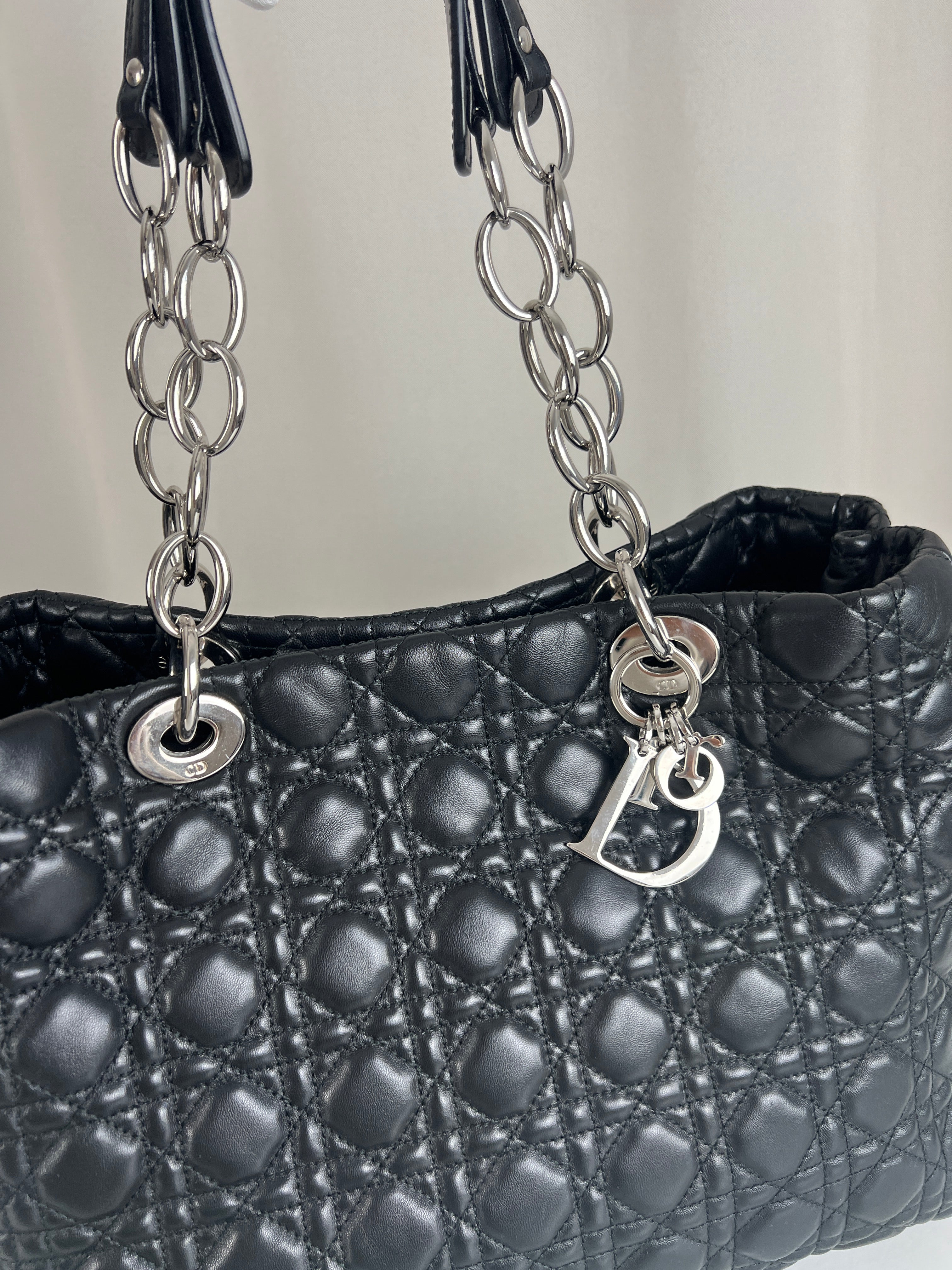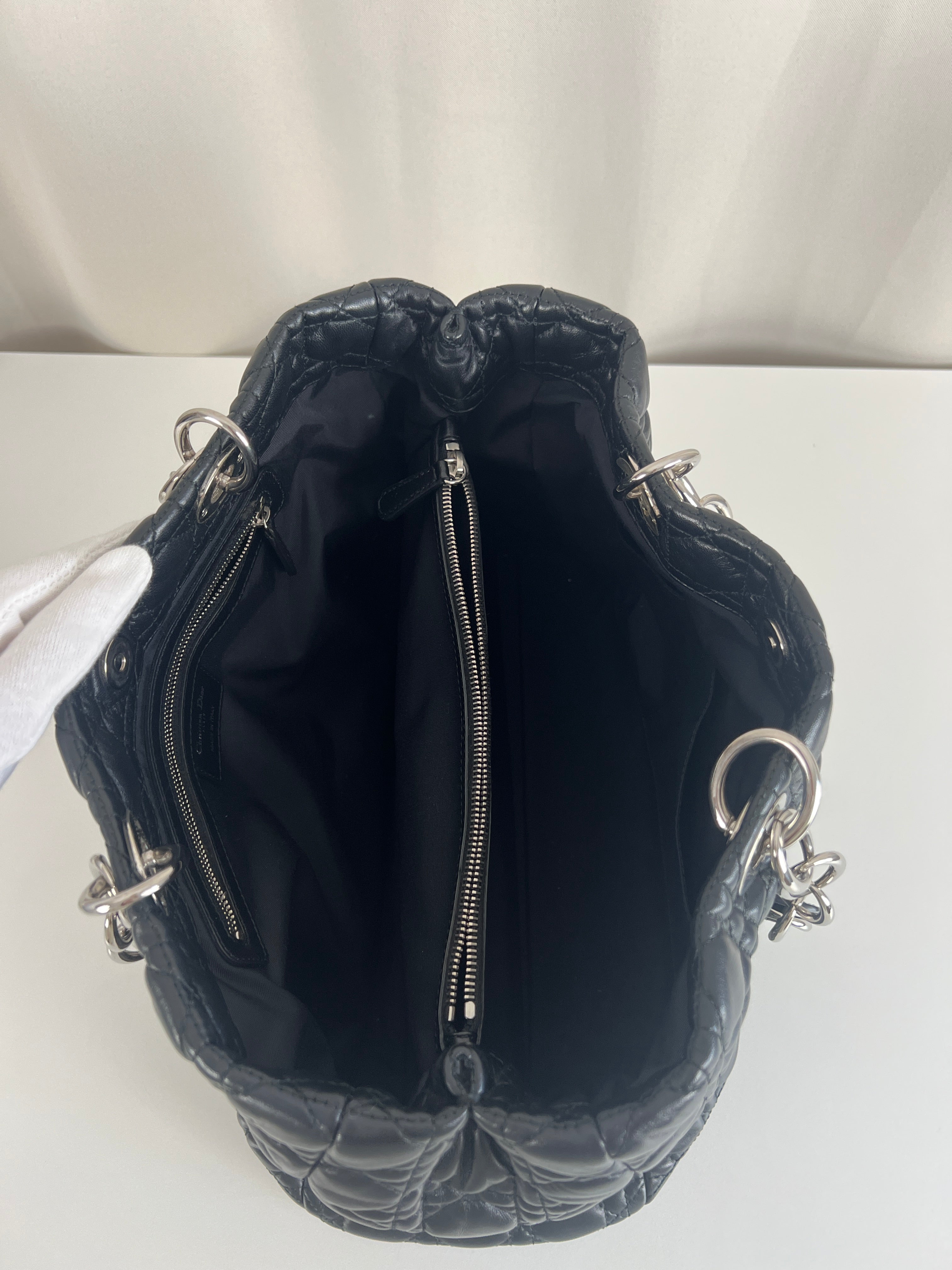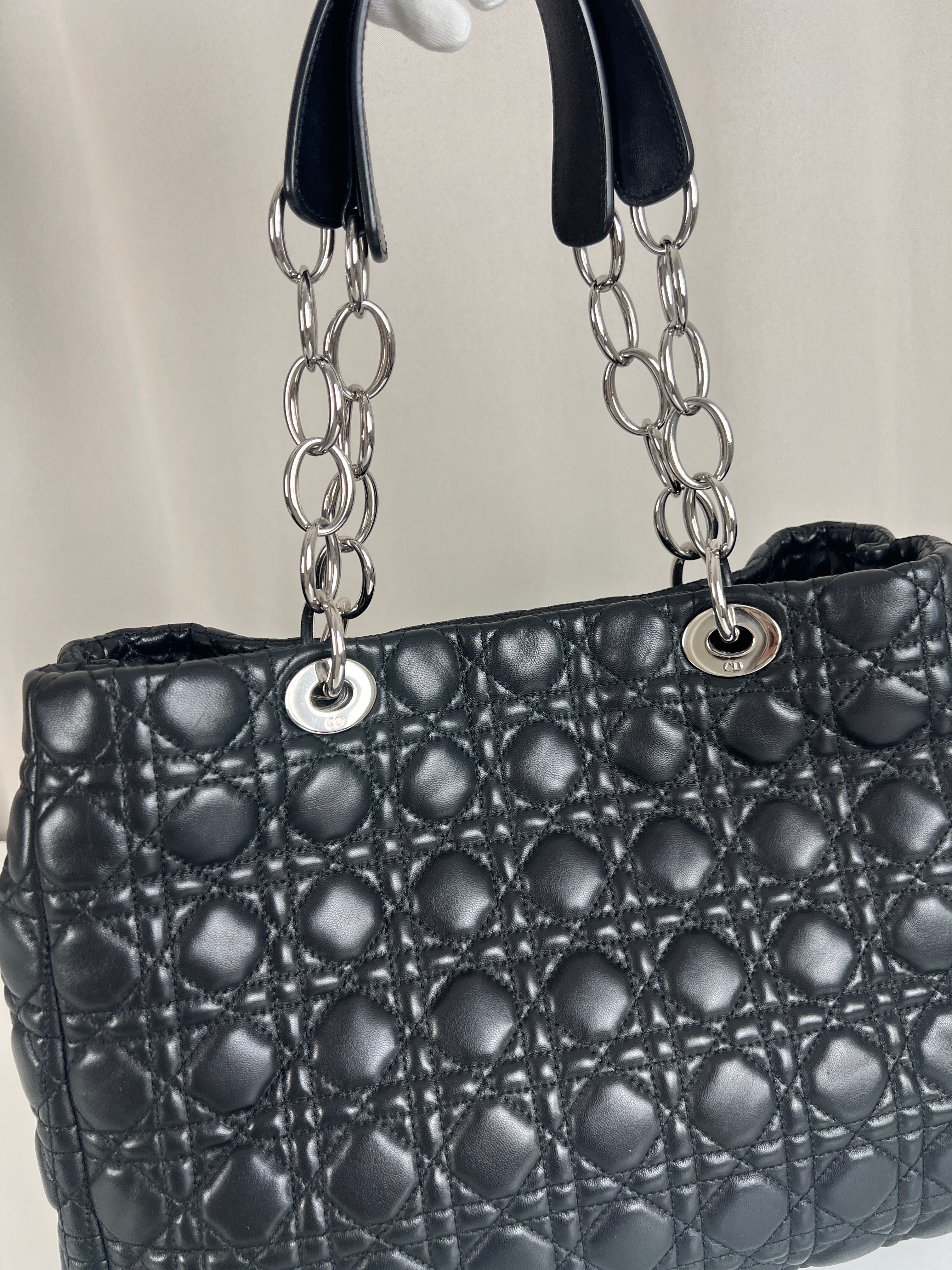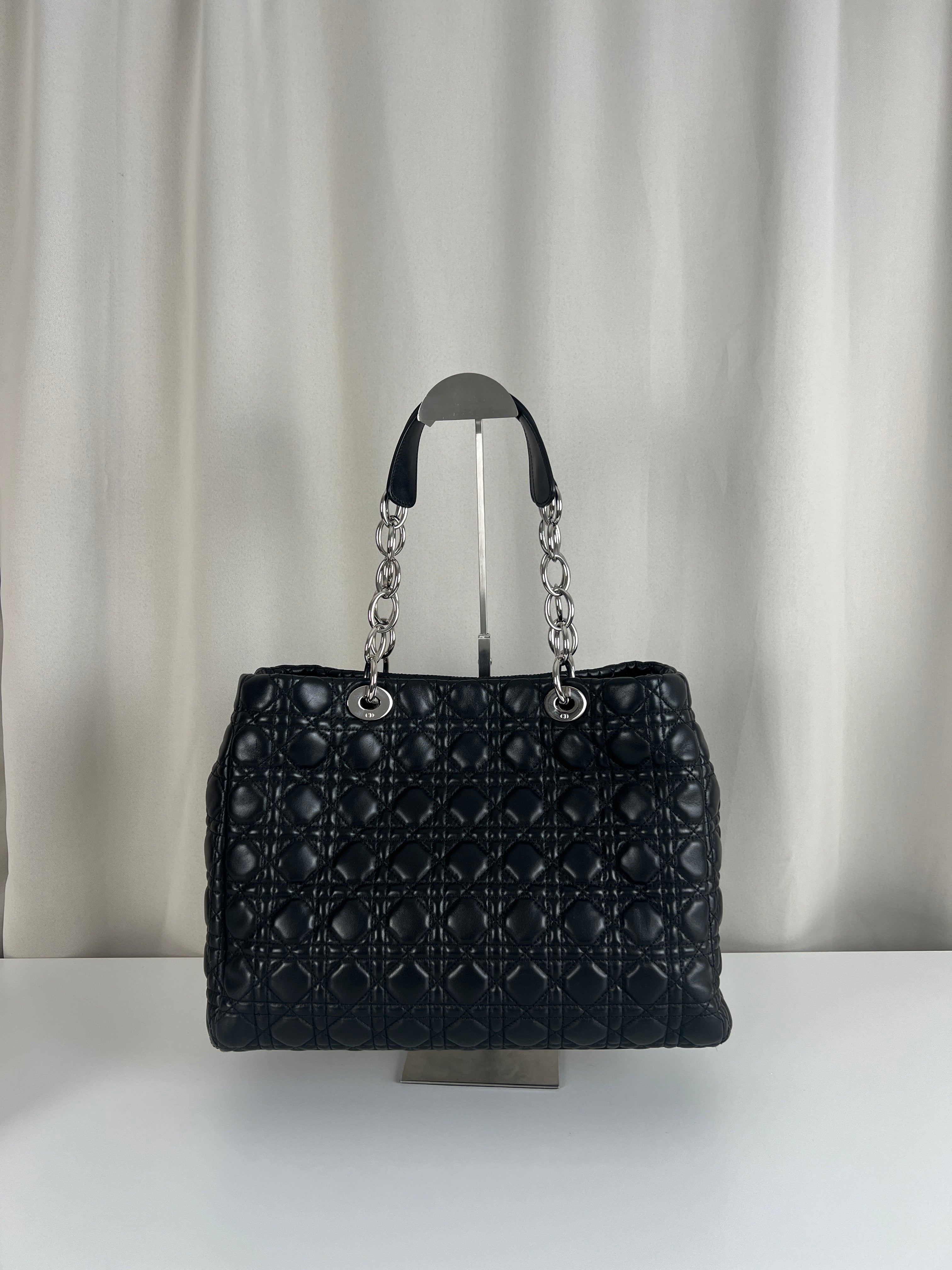 Ce cabas en cuir Dior Soft est de couleur noir avec bijouterie argentée. L'état du sac est très bon. Il est livré avec un dustbag et un certificat Entrupy. L'extérieur est très bien, le cuir est très bien. Les coins sont également très bons. Les poignées sont très bonnes. La bijouterie a de petites rayures mais c'est naturel. L'intérieur est également en super état. L'intérieur est assez grand avec divers espaces de rangement pochettes, c'est un sac parfait au quotidien !