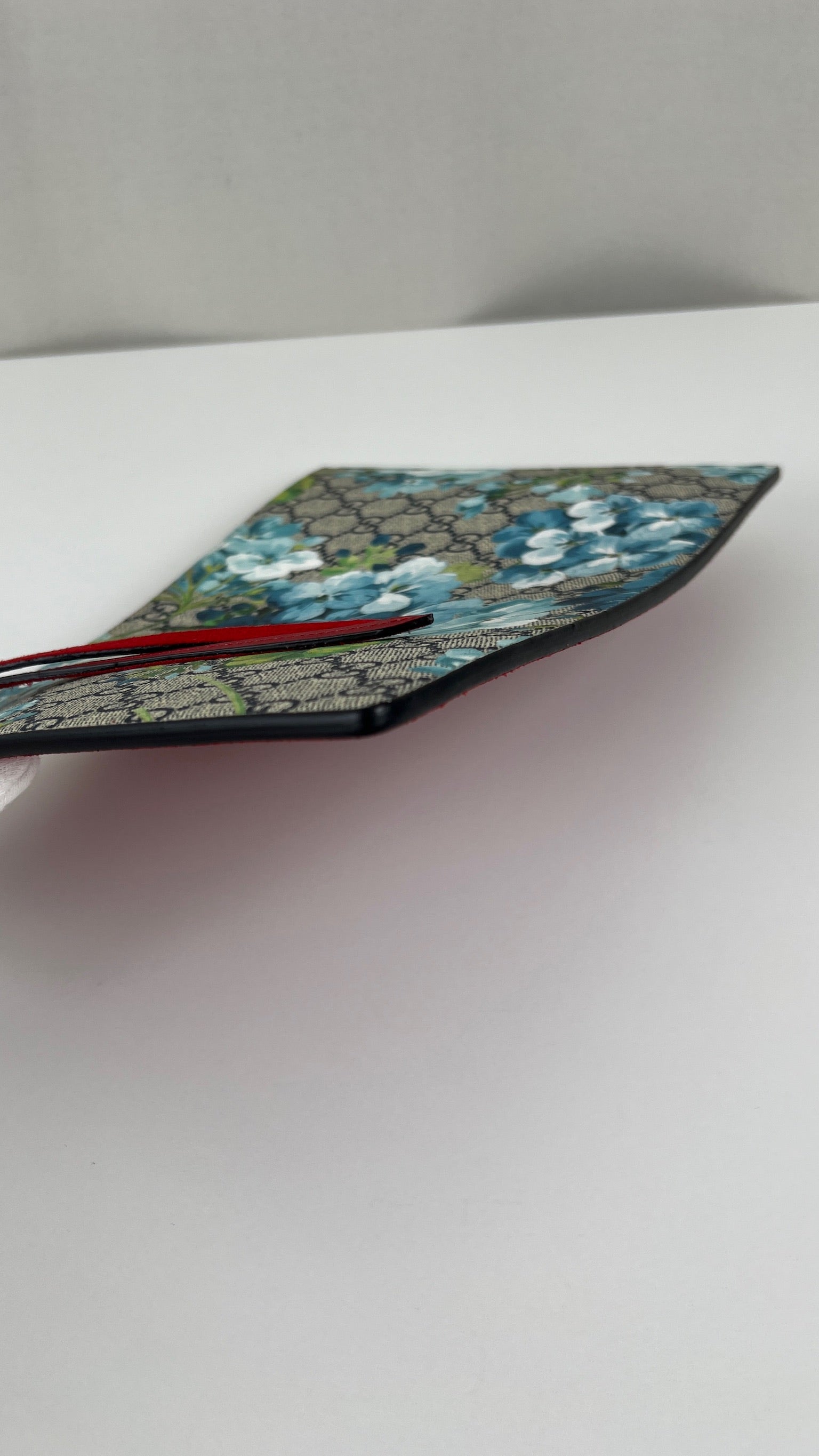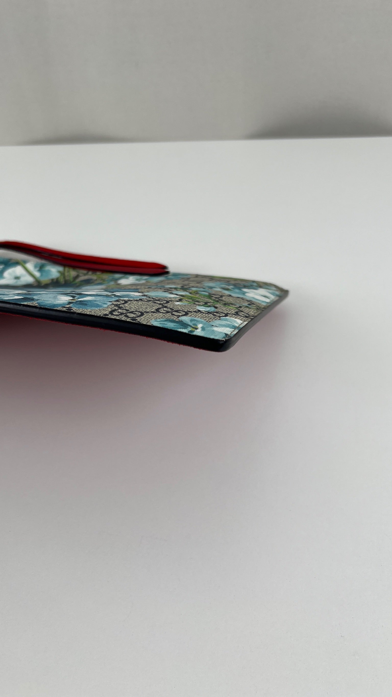 Cette Pochette Gucci Bloom à Fleurs Bleues est en parfait état. La toile et le daim sont en très bon état. L'intérieur présente de très petites traces.