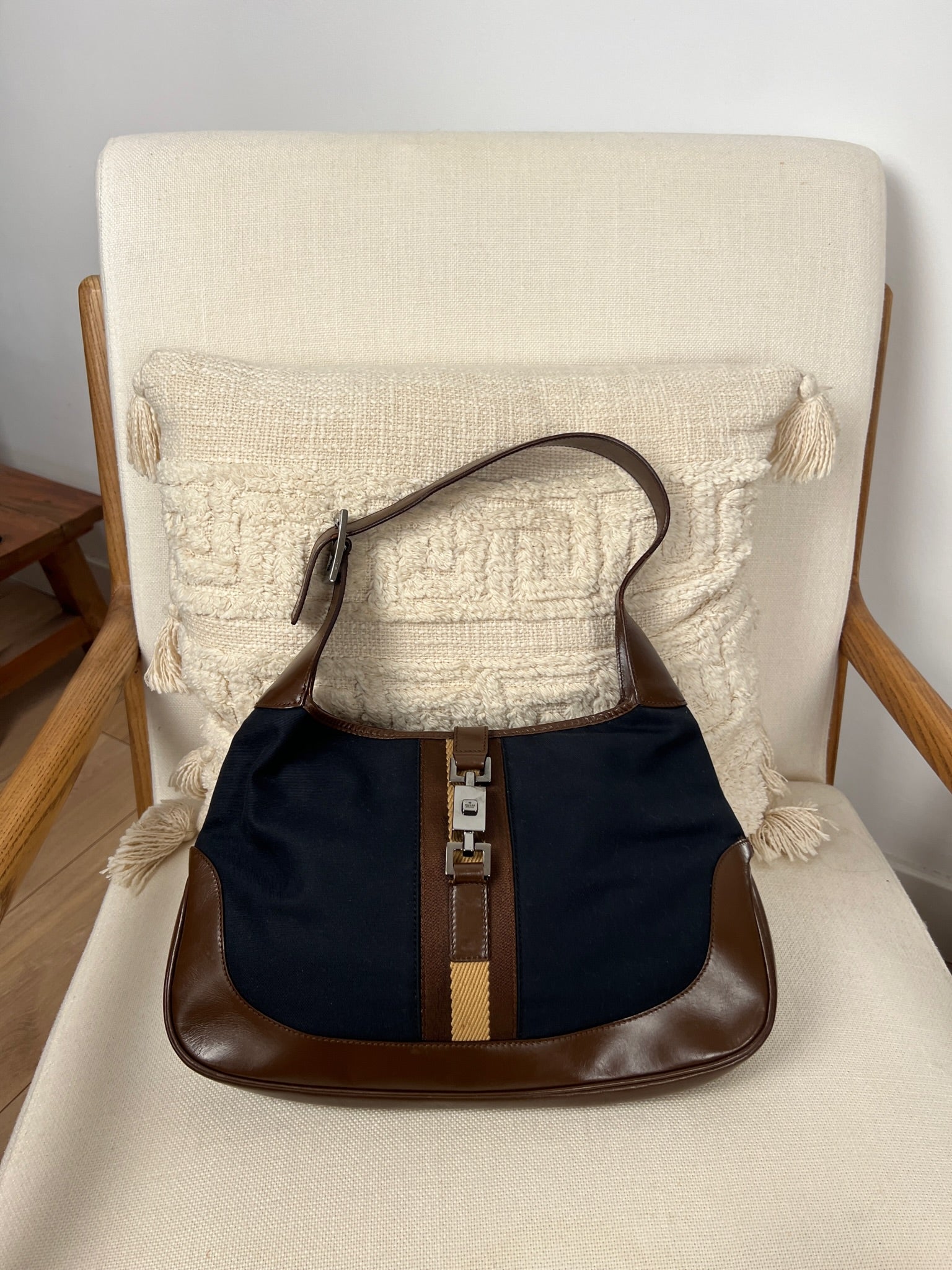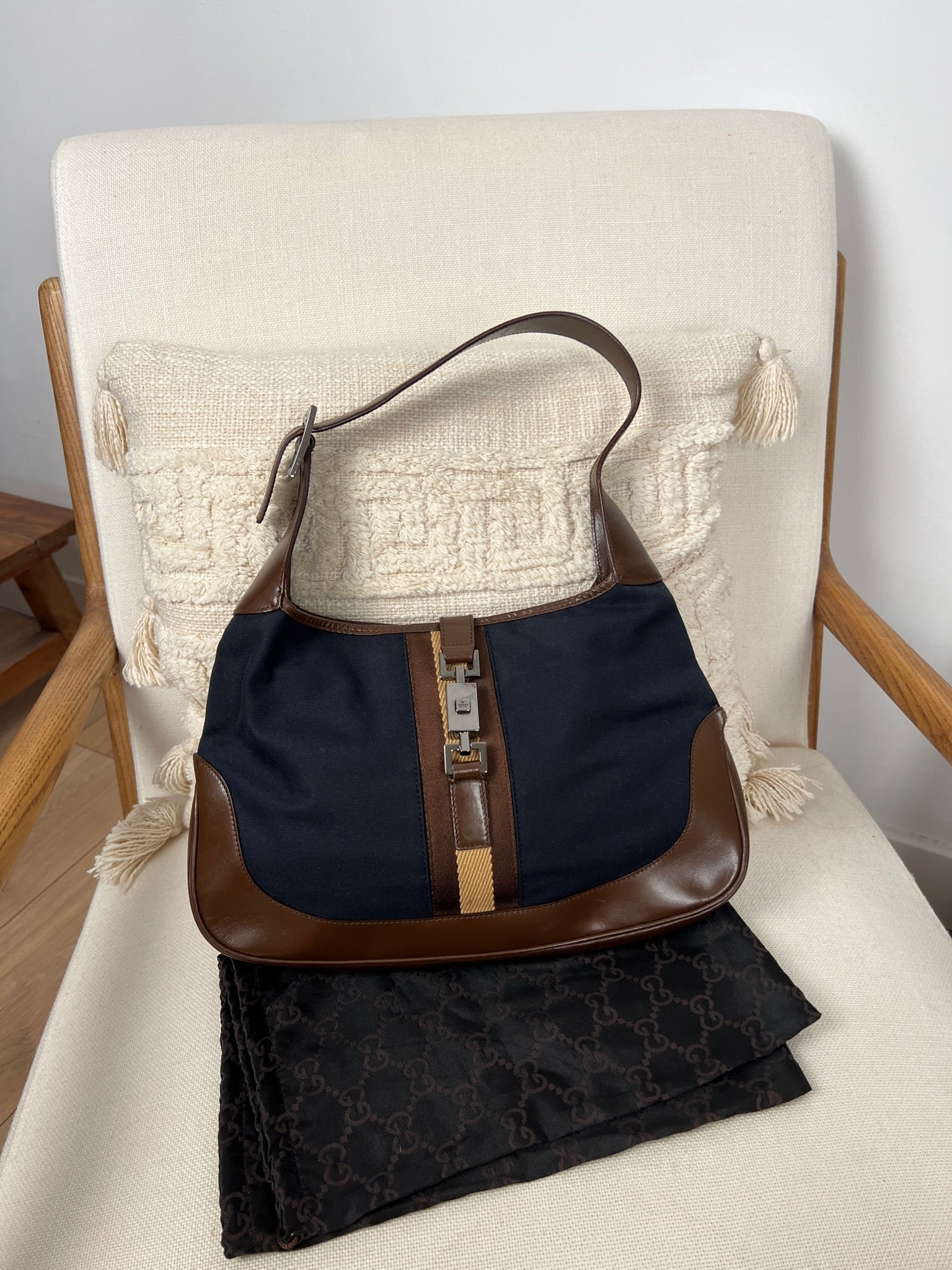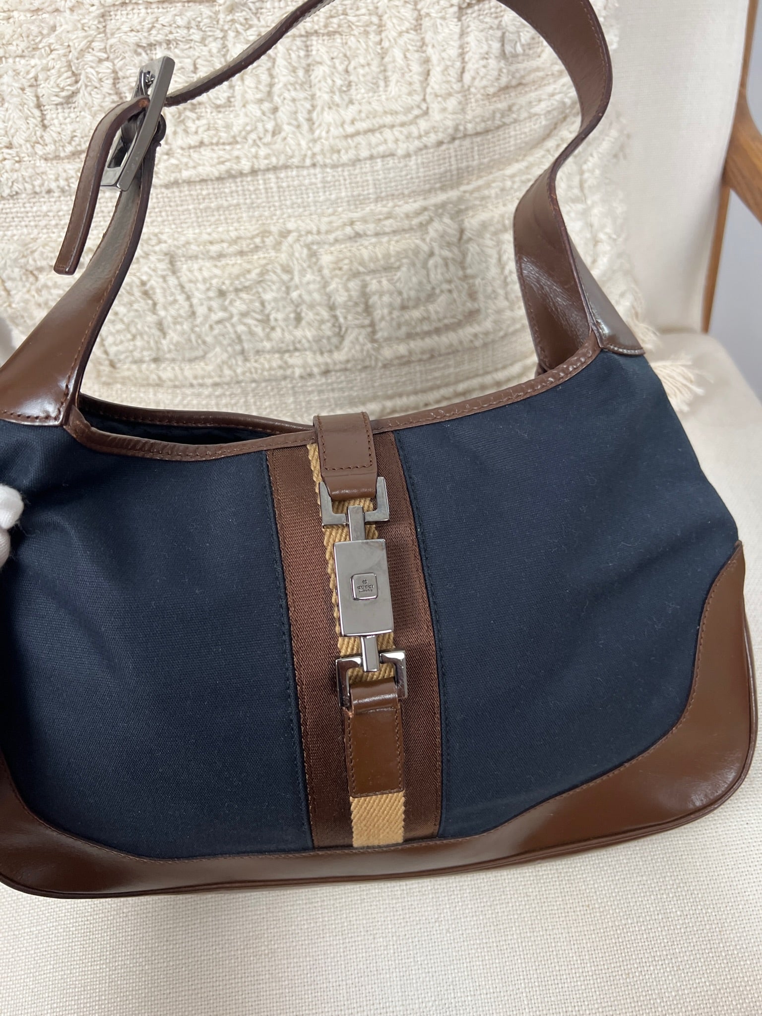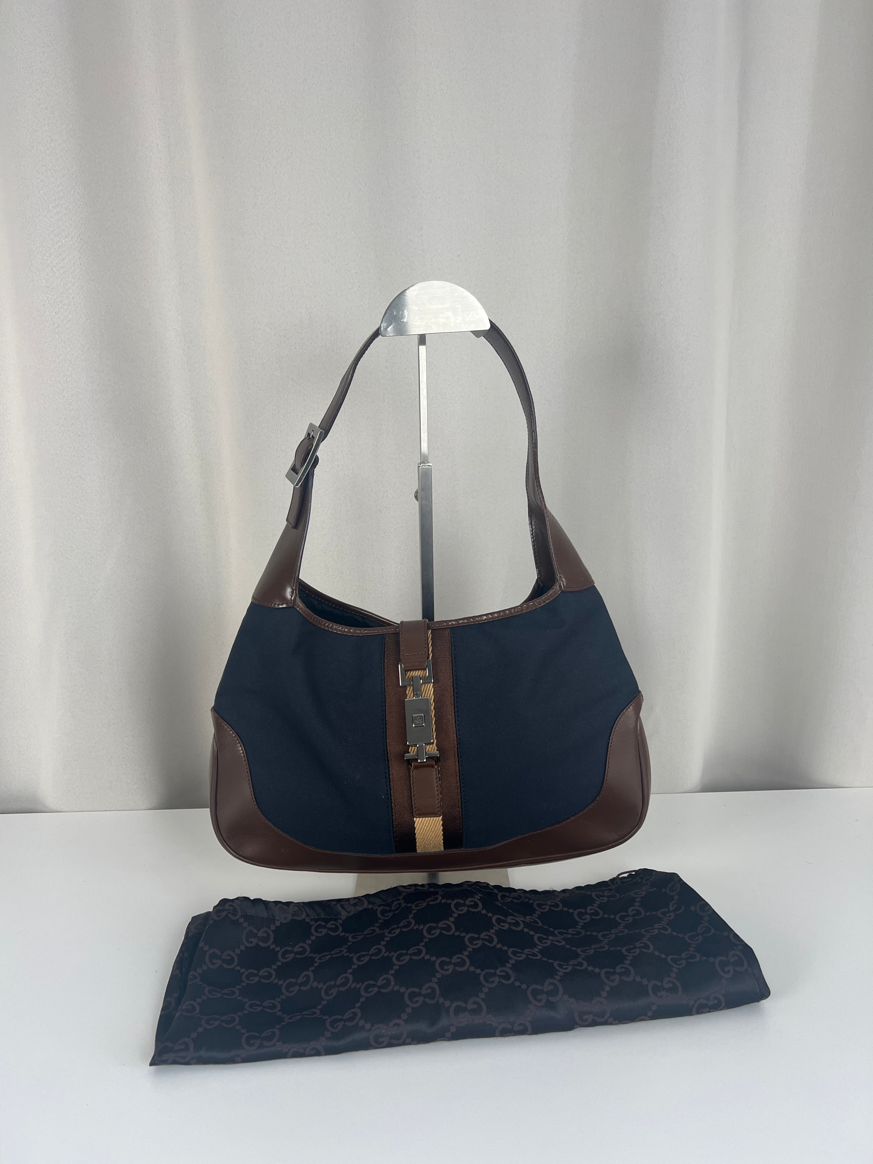 Ce sac Gucci Jackie est en très bon état. Les parties en cuir sont en bon état, seuls le bas et les coins présentent de petites traces d'usure. Le tissu est également en très bon état. L'intérieur est en bon état avec seulement une petite tache. La bijouterie est usé en raison d'une utilisation normale.