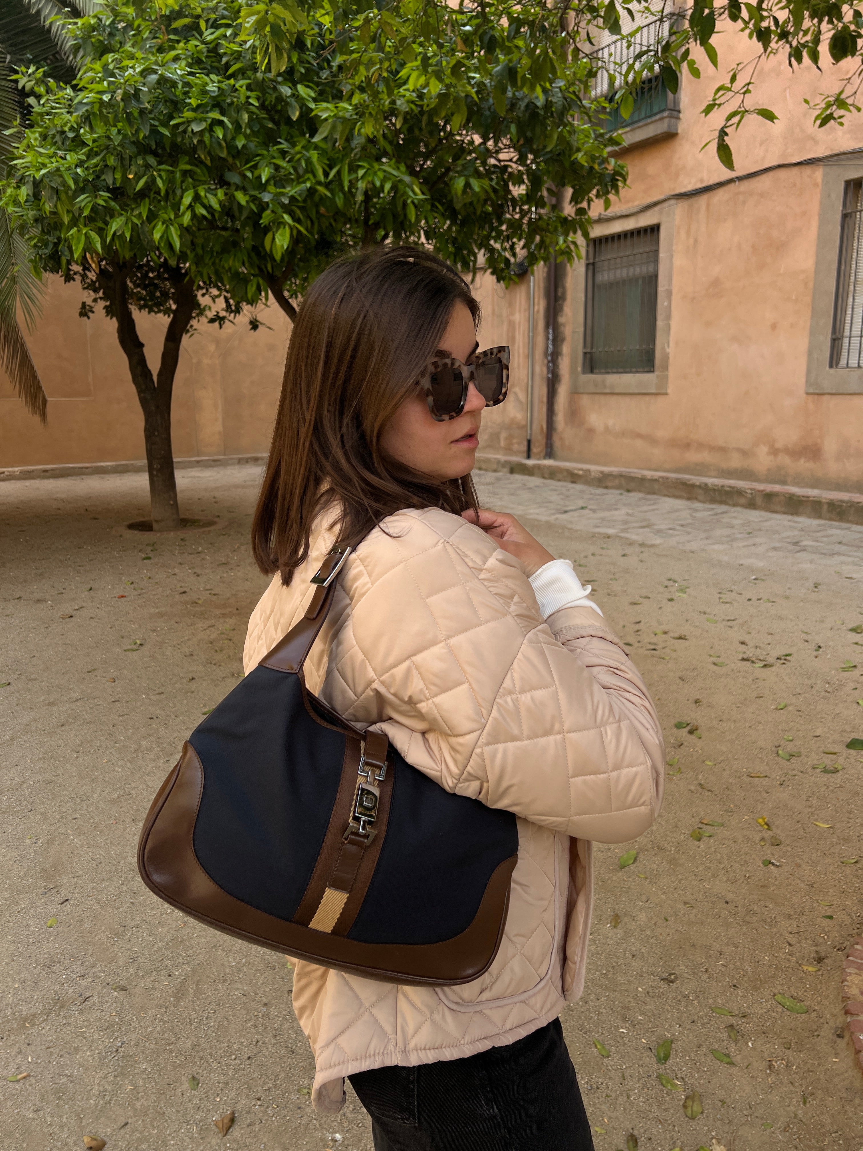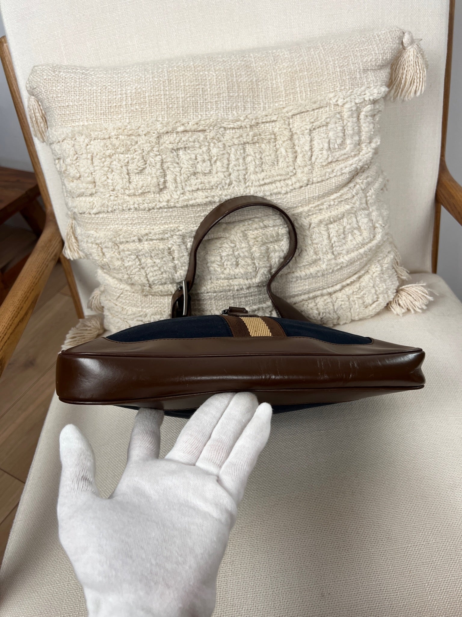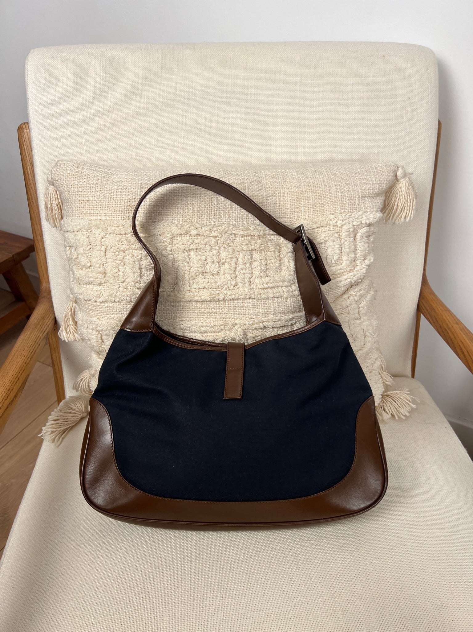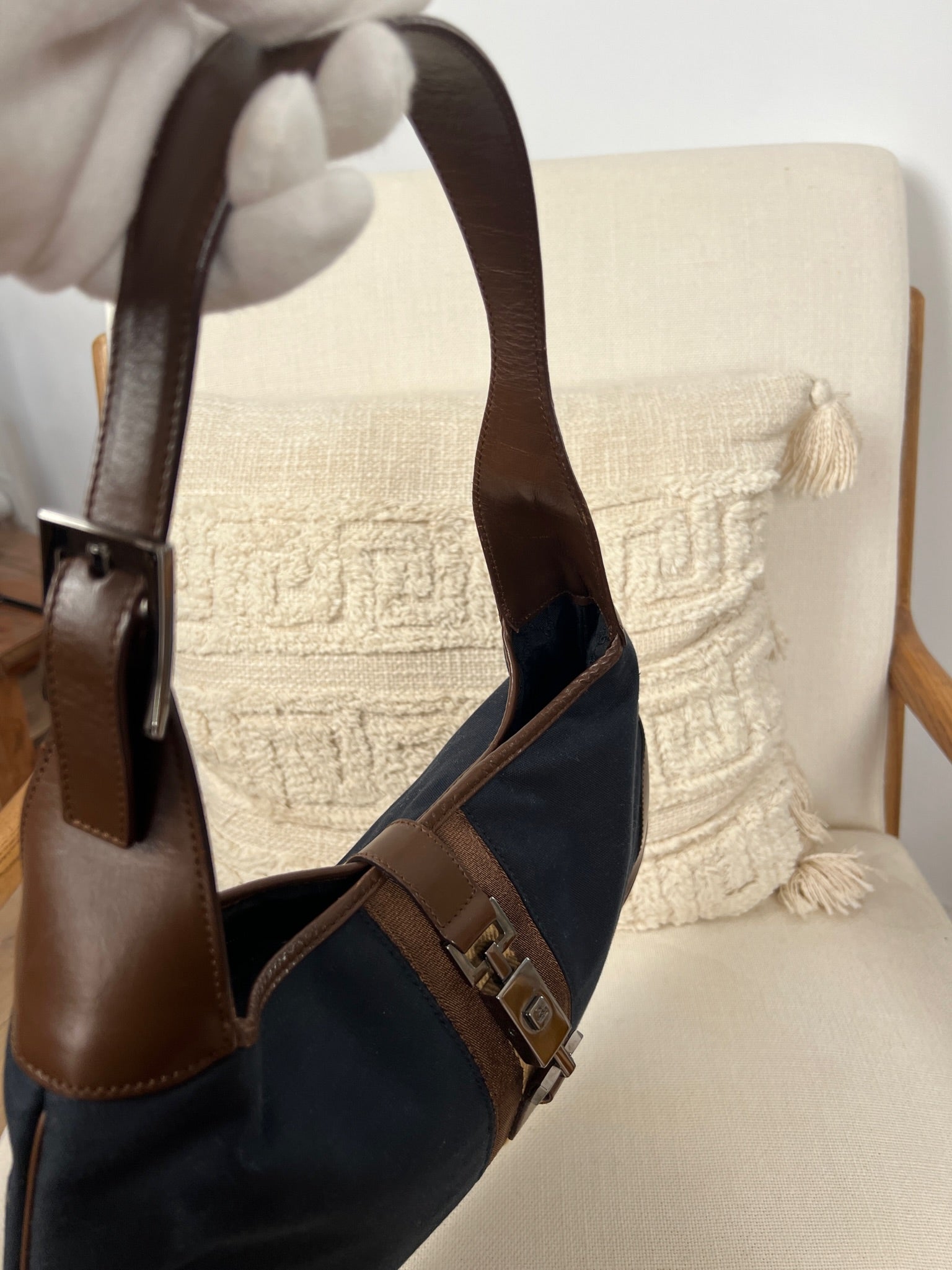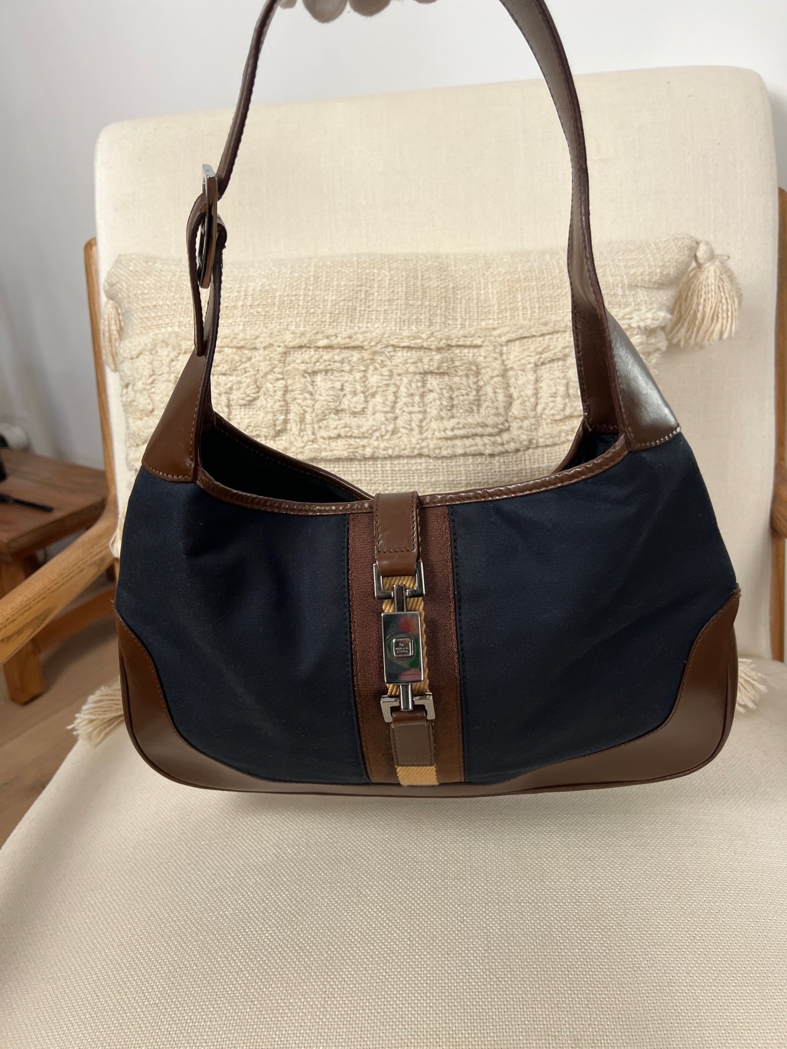 Ce sac Gucci Jackie est en très bon état. Les parties en cuir sont en bon état, seuls le bas et les coins présentent de petites traces d'usure. Le tissu est également en très bon état. L'intérieur est en bon état avec seulement une petite tache. La bijouterie est usé en raison d'une utilisation normale.