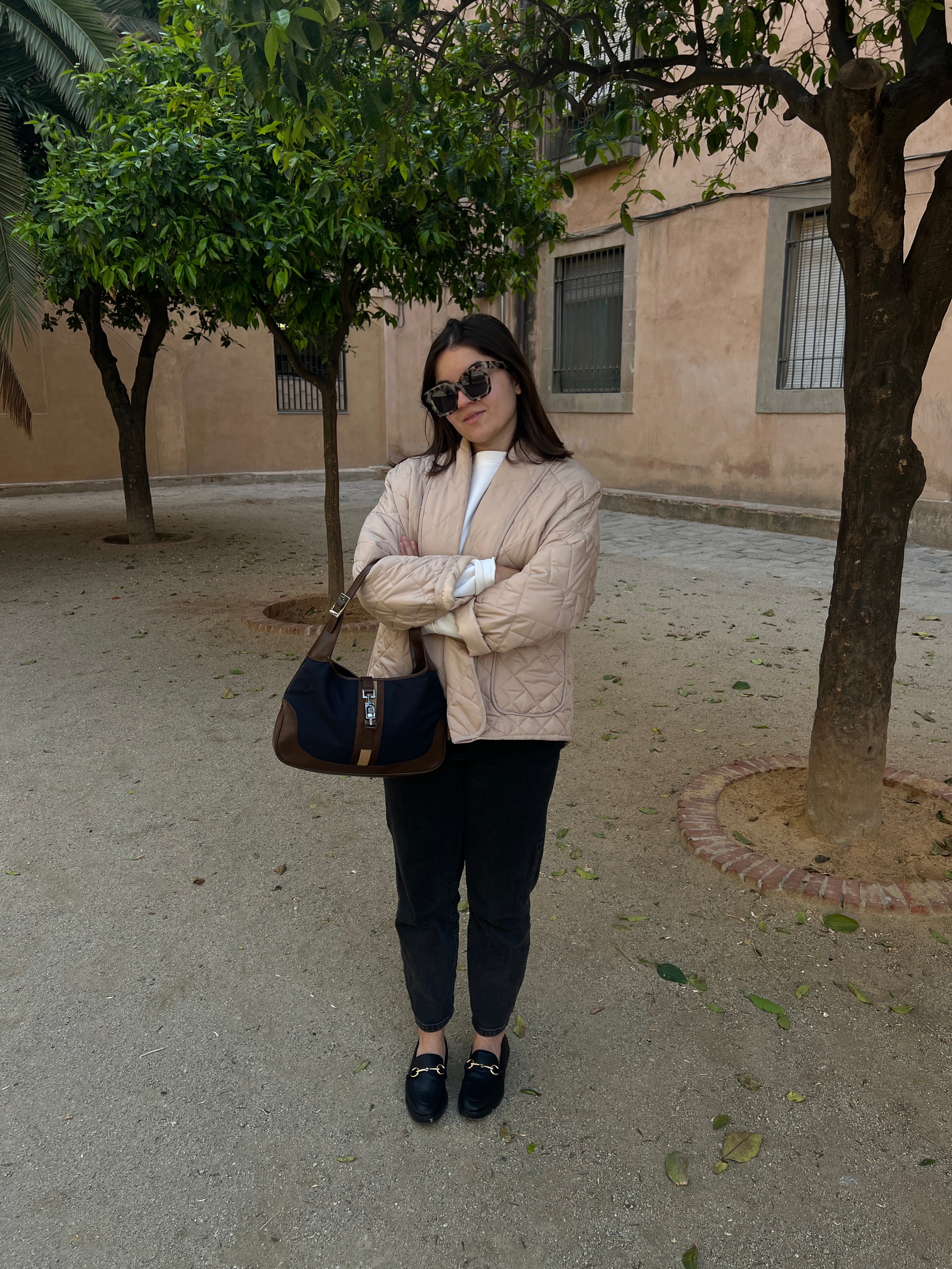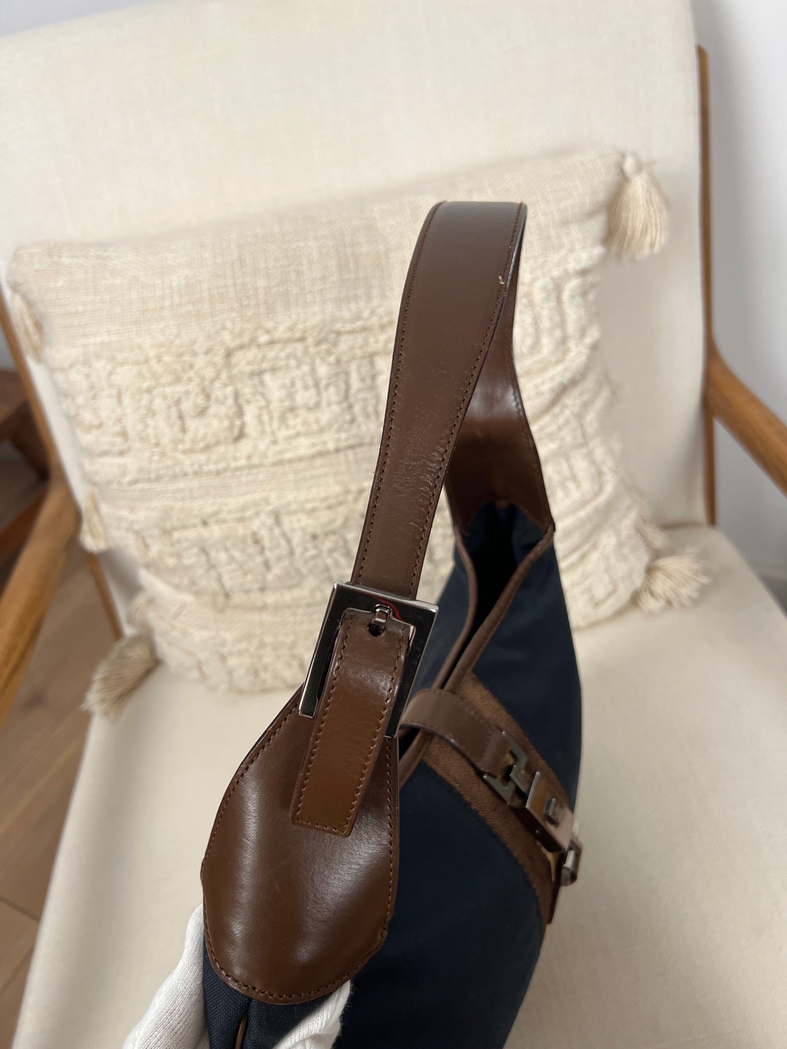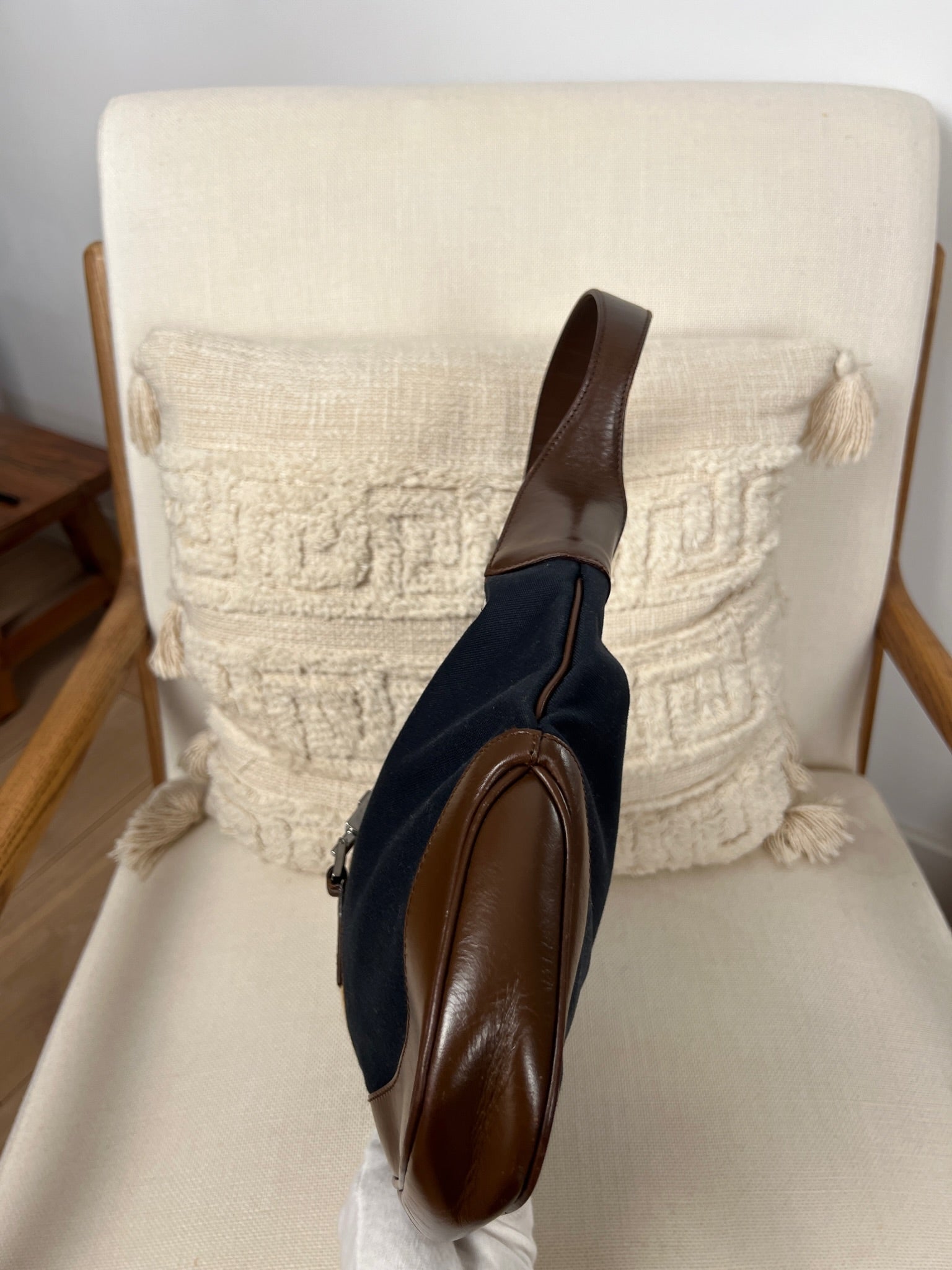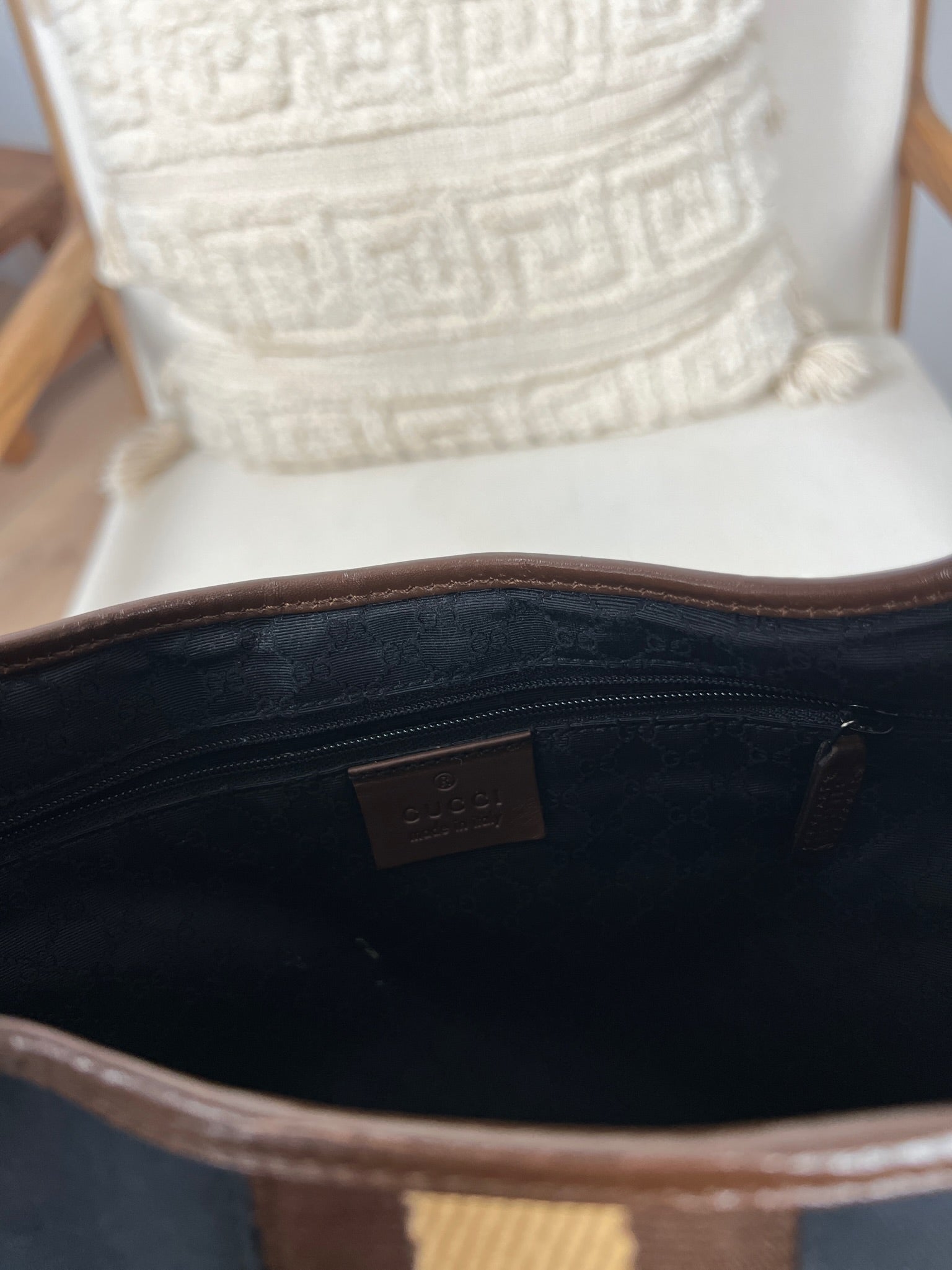 Ce sac Gucci Jackie est en très bon état. Les parties en cuir sont en bon état, seuls le bas et les coins présentent de petites traces d'usure. Le tissu est également en très bon état. L'intérieur est en bon état avec seulement une petite tache. La bijouterie est usé en raison d'une utilisation normale.