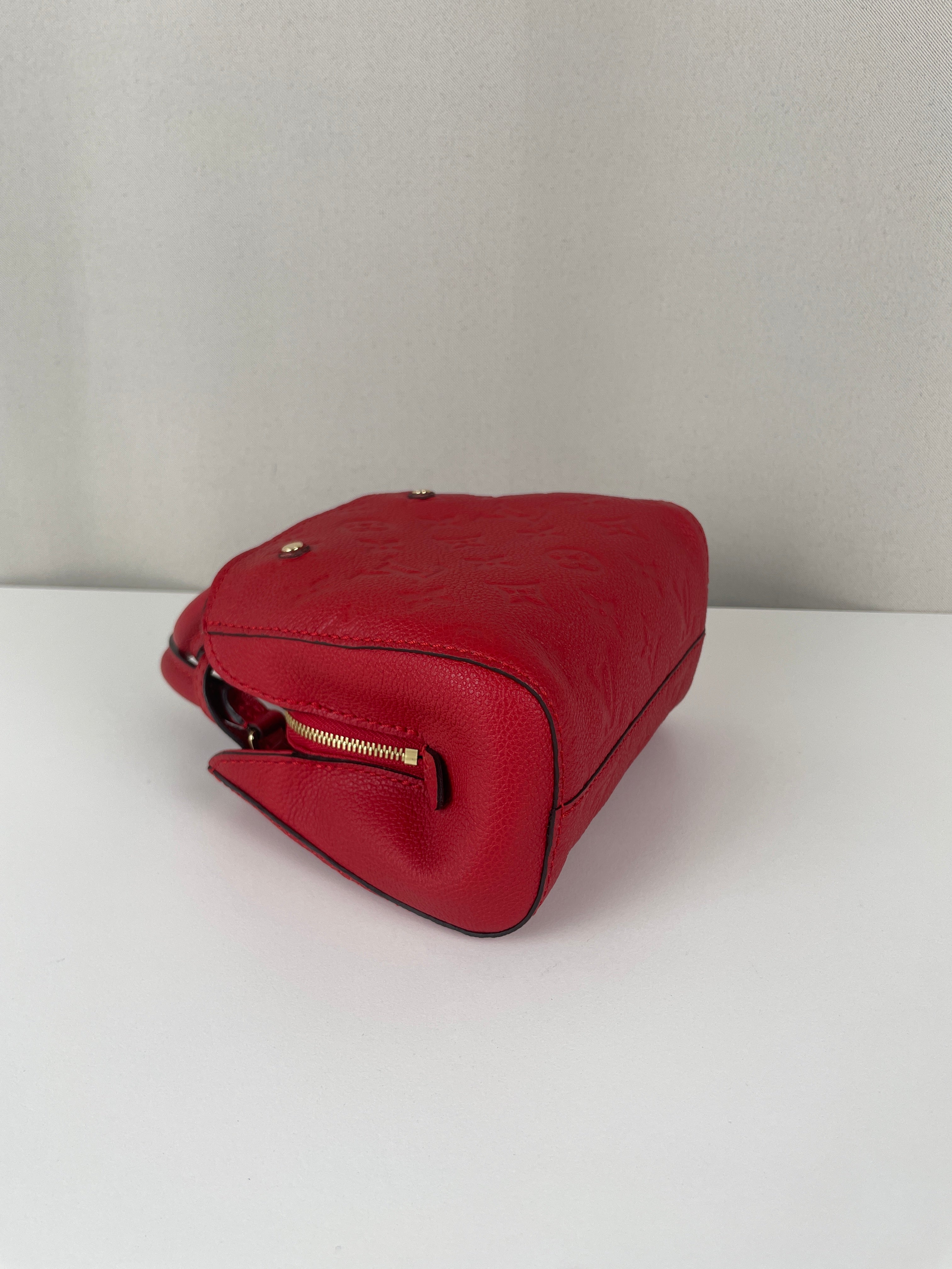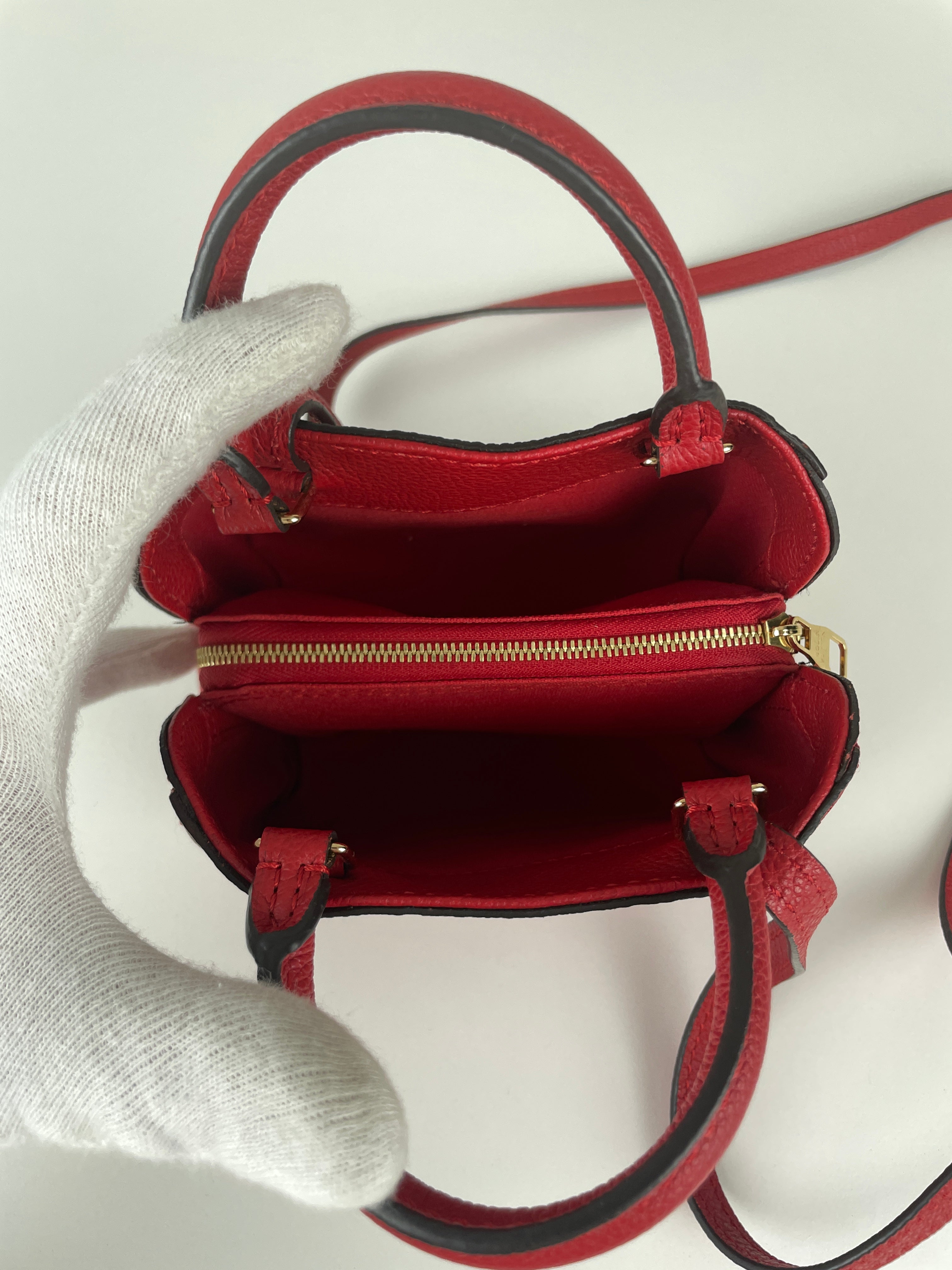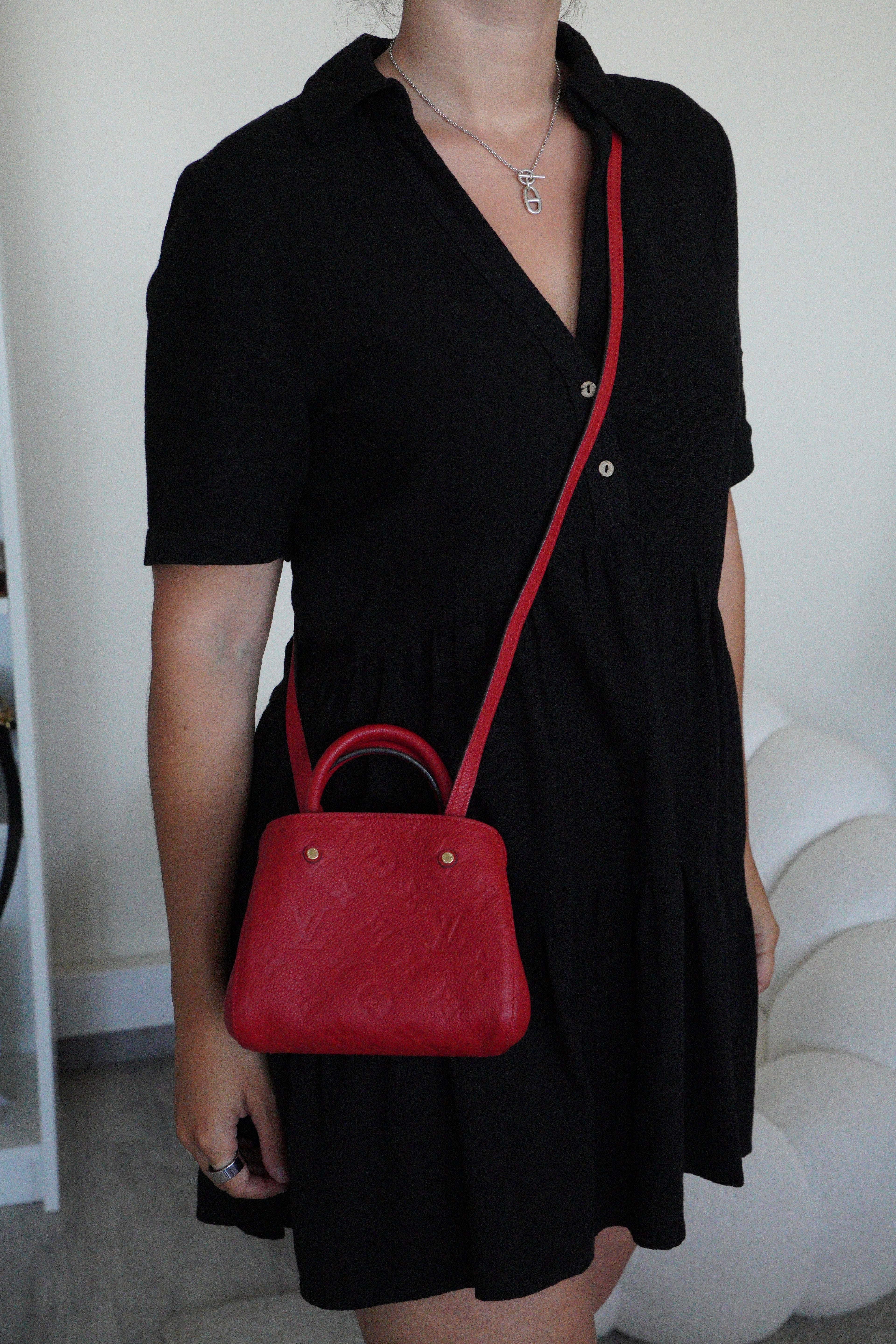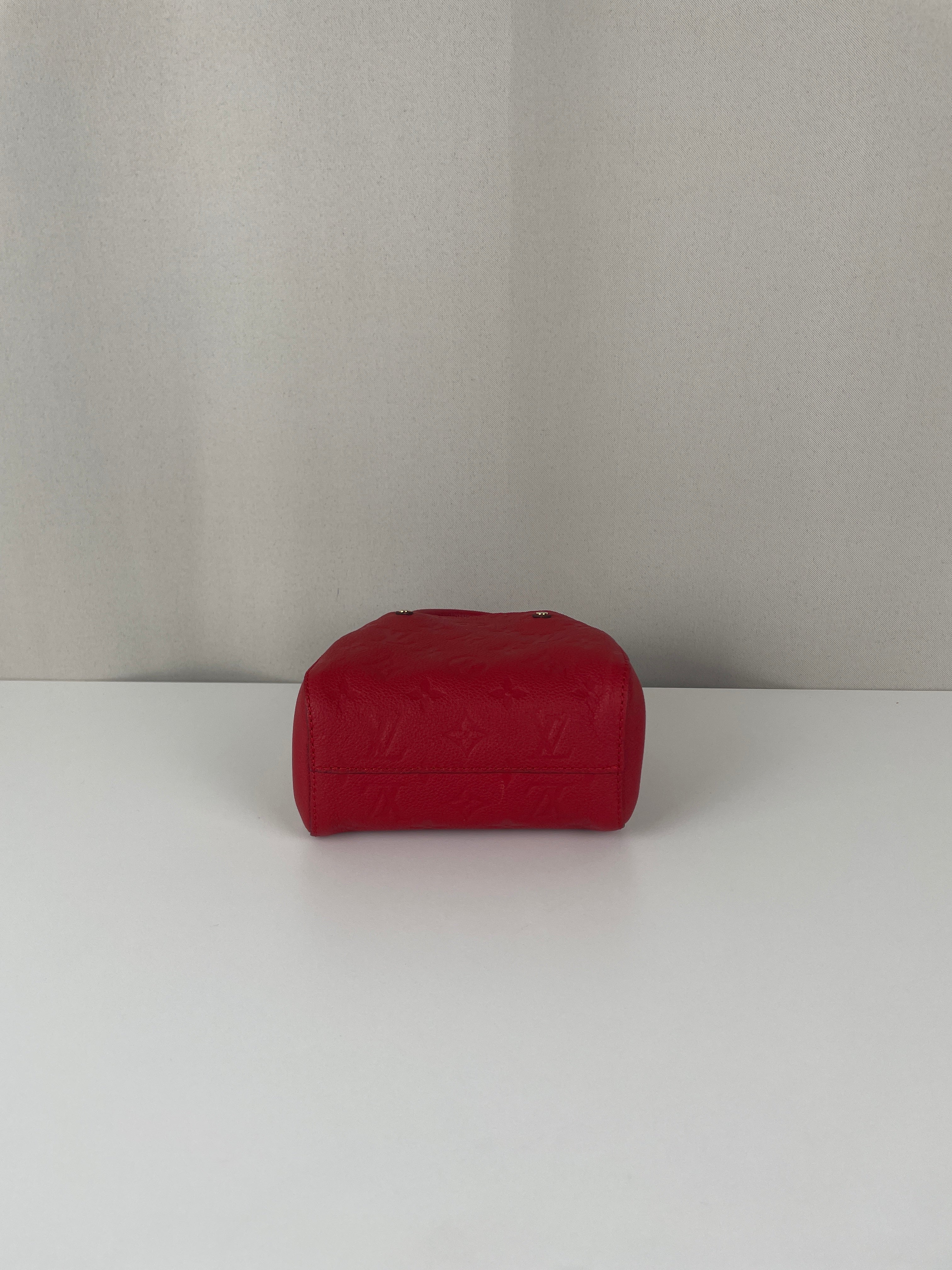 Ce Louis Vuitton Nano Montaigne en cuir Monogram Empreinte rouge est en très bon état. Avec sa forme compacte, sa silhouette structurée et ses élégantes poignées supérieures, c'est le mini sac idéal pour une utilisation quotidienne comme en soirée. Sa longue bandoulière permet un porté croisé facile. Une pièce rare et charmante pour les collectionneurs ou les amateurs de Louis Vuitton aux couleurs vives.