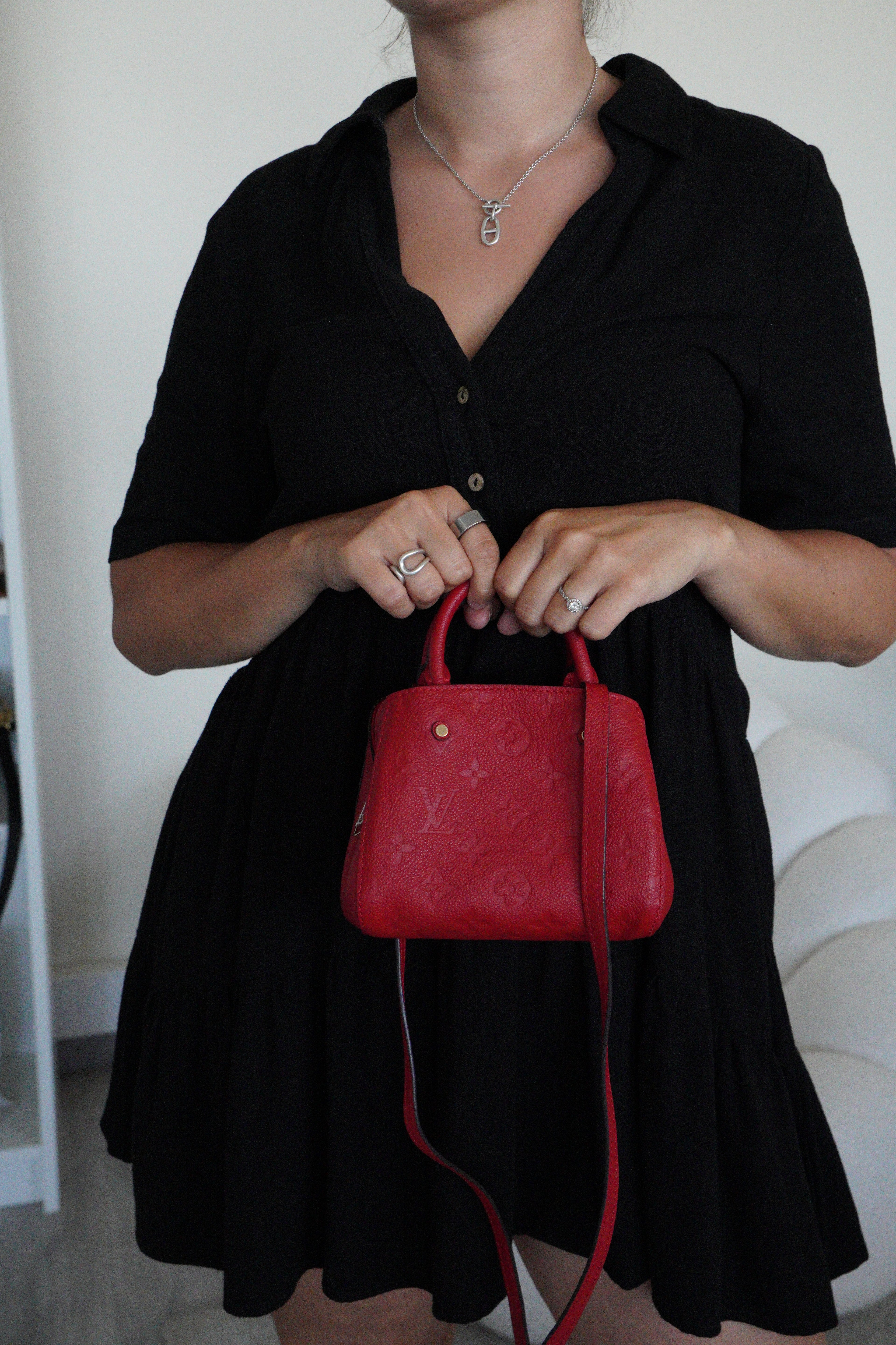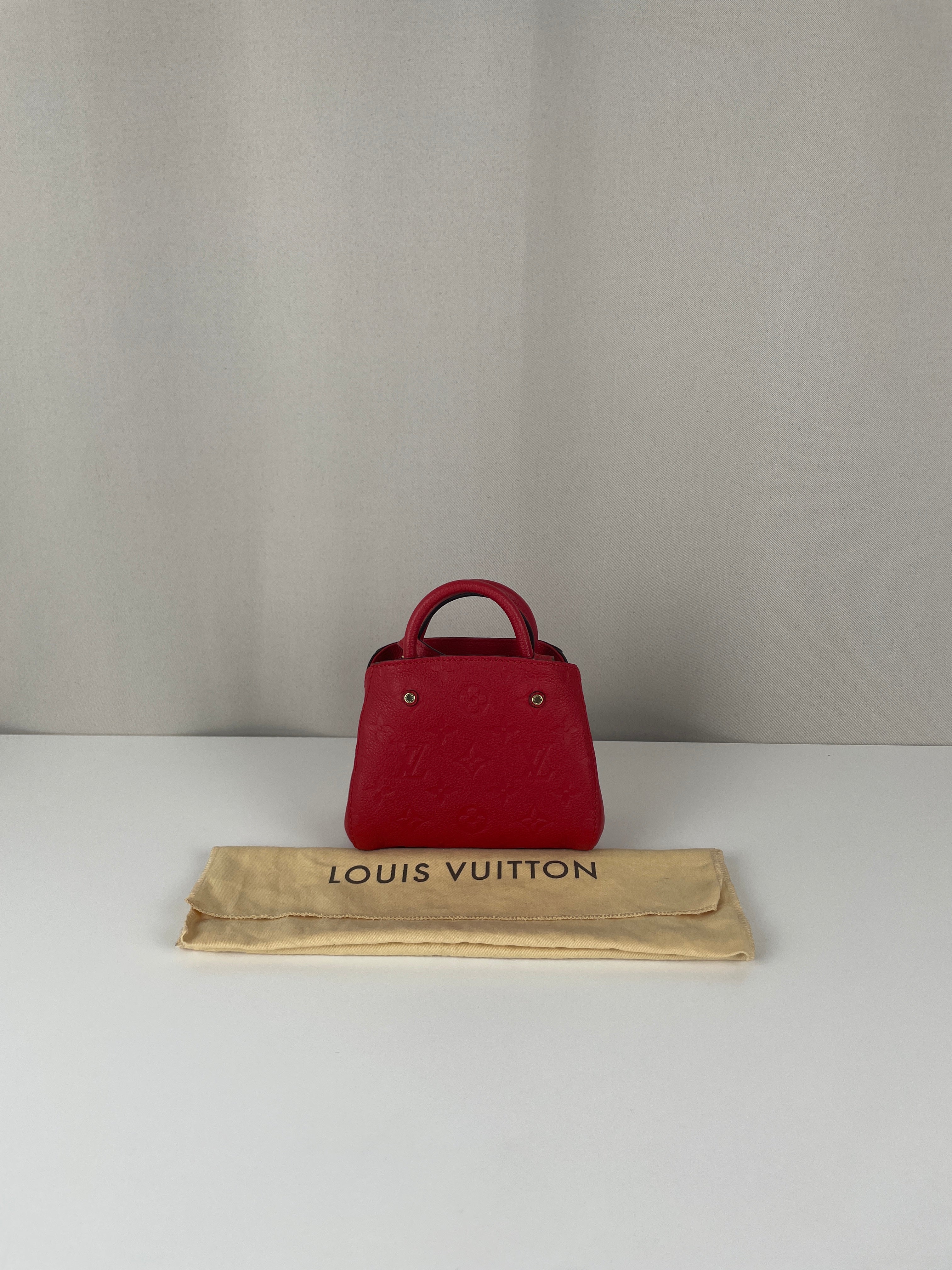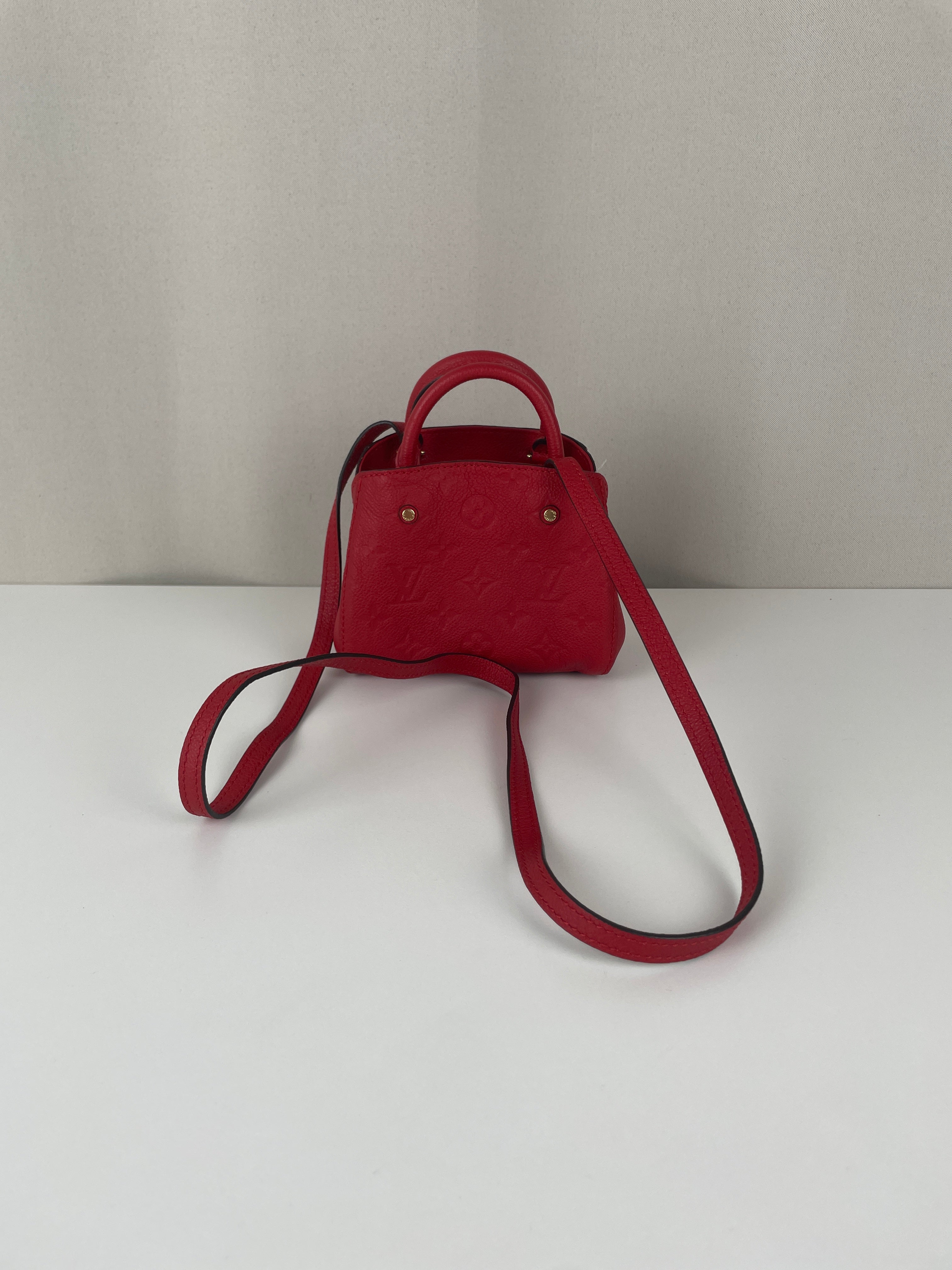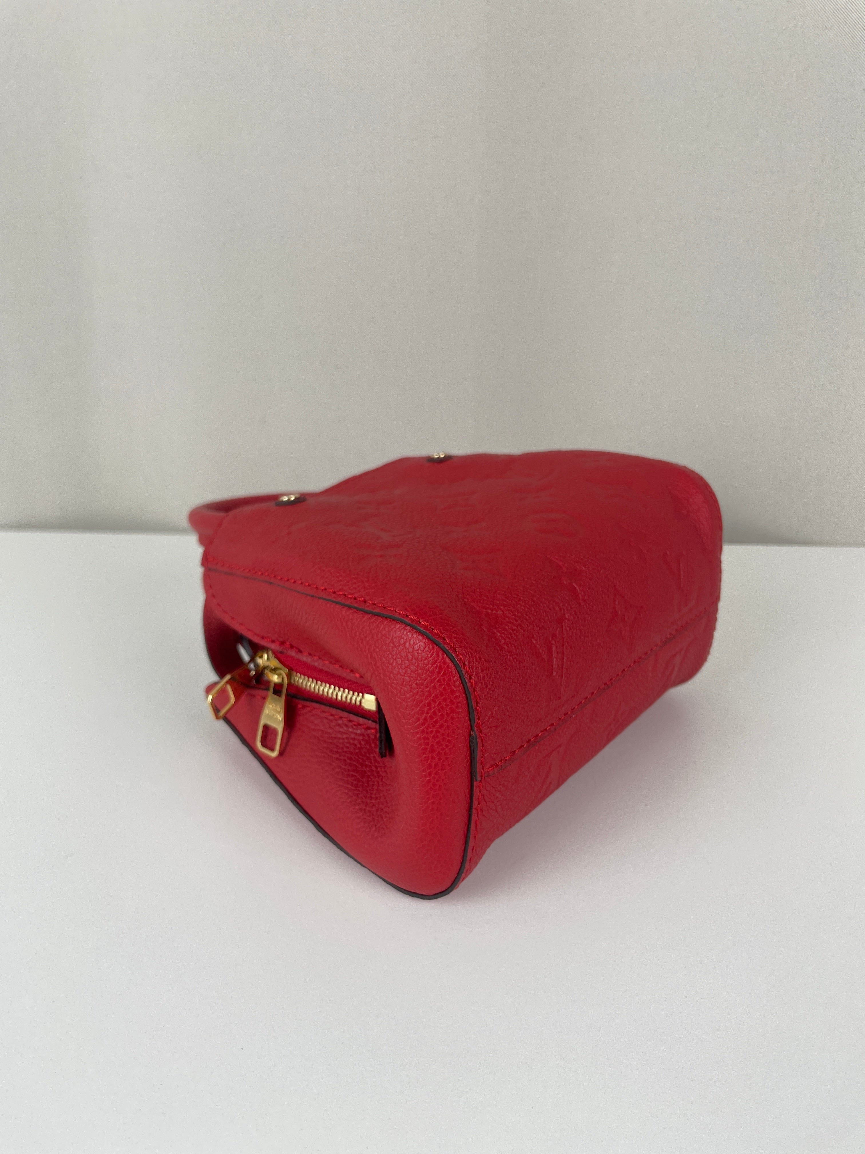 Ce Louis Vuitton Nano Montaigne en cuir Monogram Empreinte rouge est en très bon état. Avec sa forme compacte, sa silhouette structurée et ses élégantes poignées supérieures, c'est le mini sac idéal pour une utilisation quotidienne comme en soirée. Sa longue bandoulière permet un porté croisé facile. Une pièce rare et charmante pour les collectionneurs ou les amateurs de Louis Vuitton aux couleurs vives.