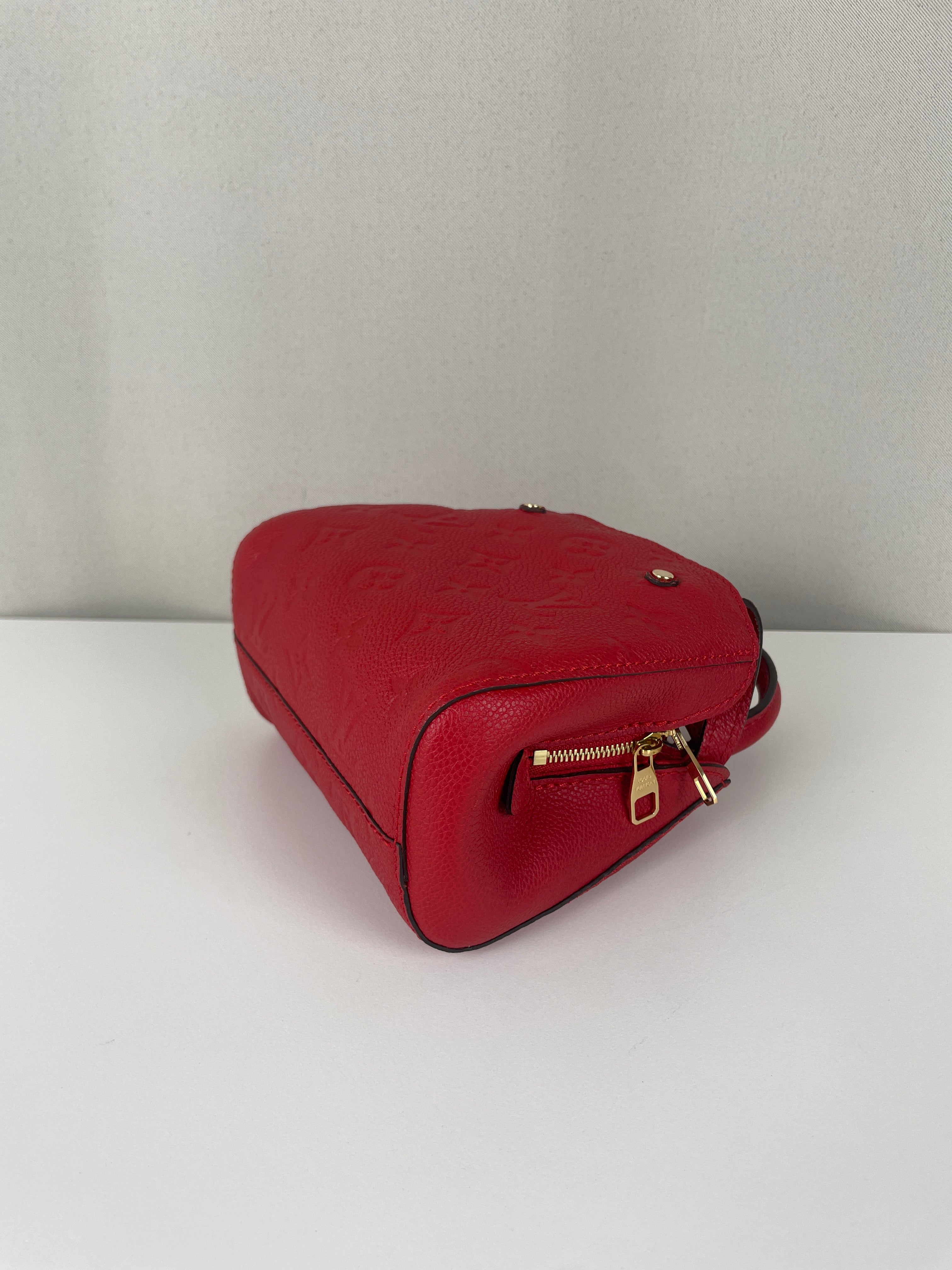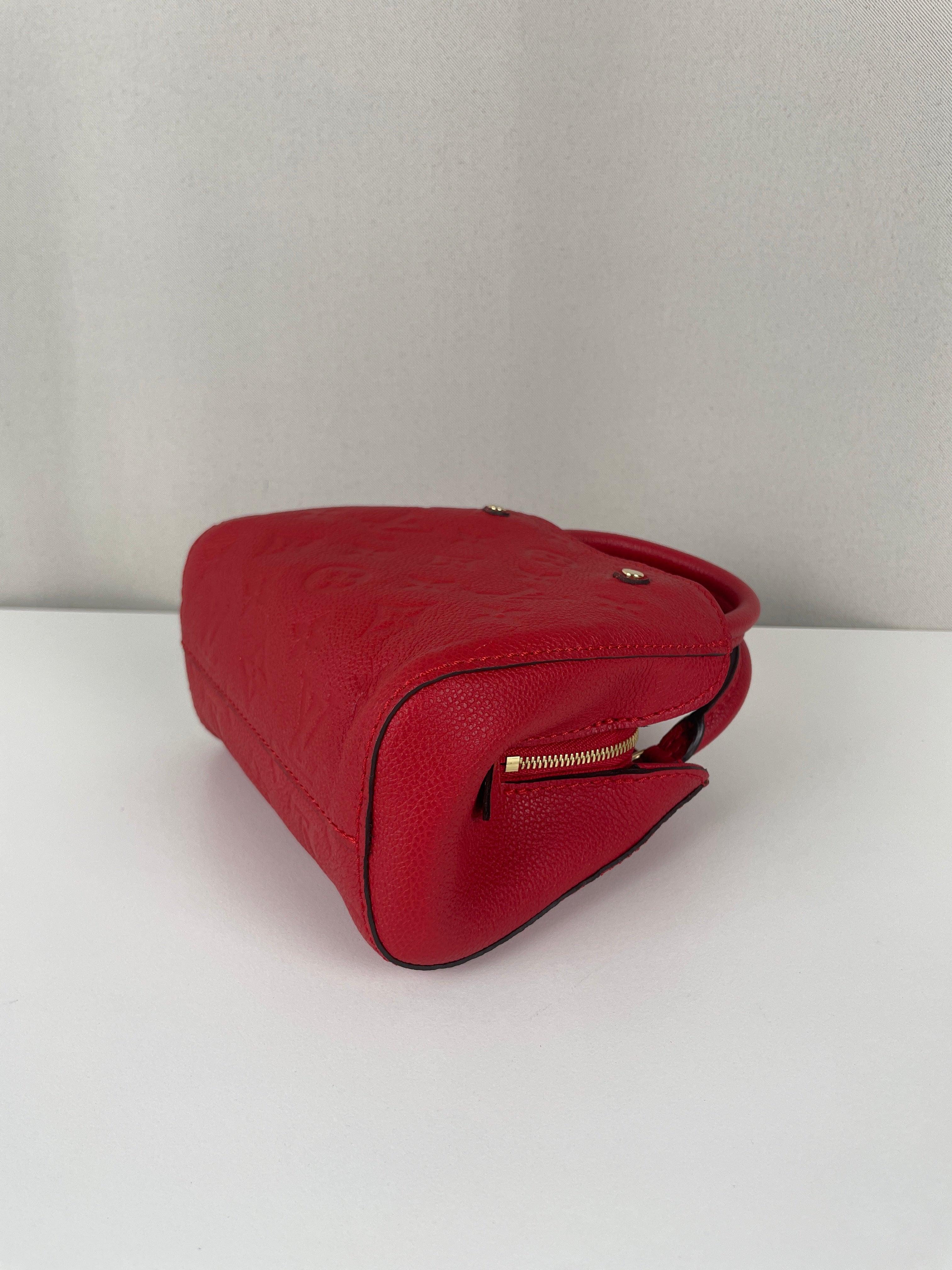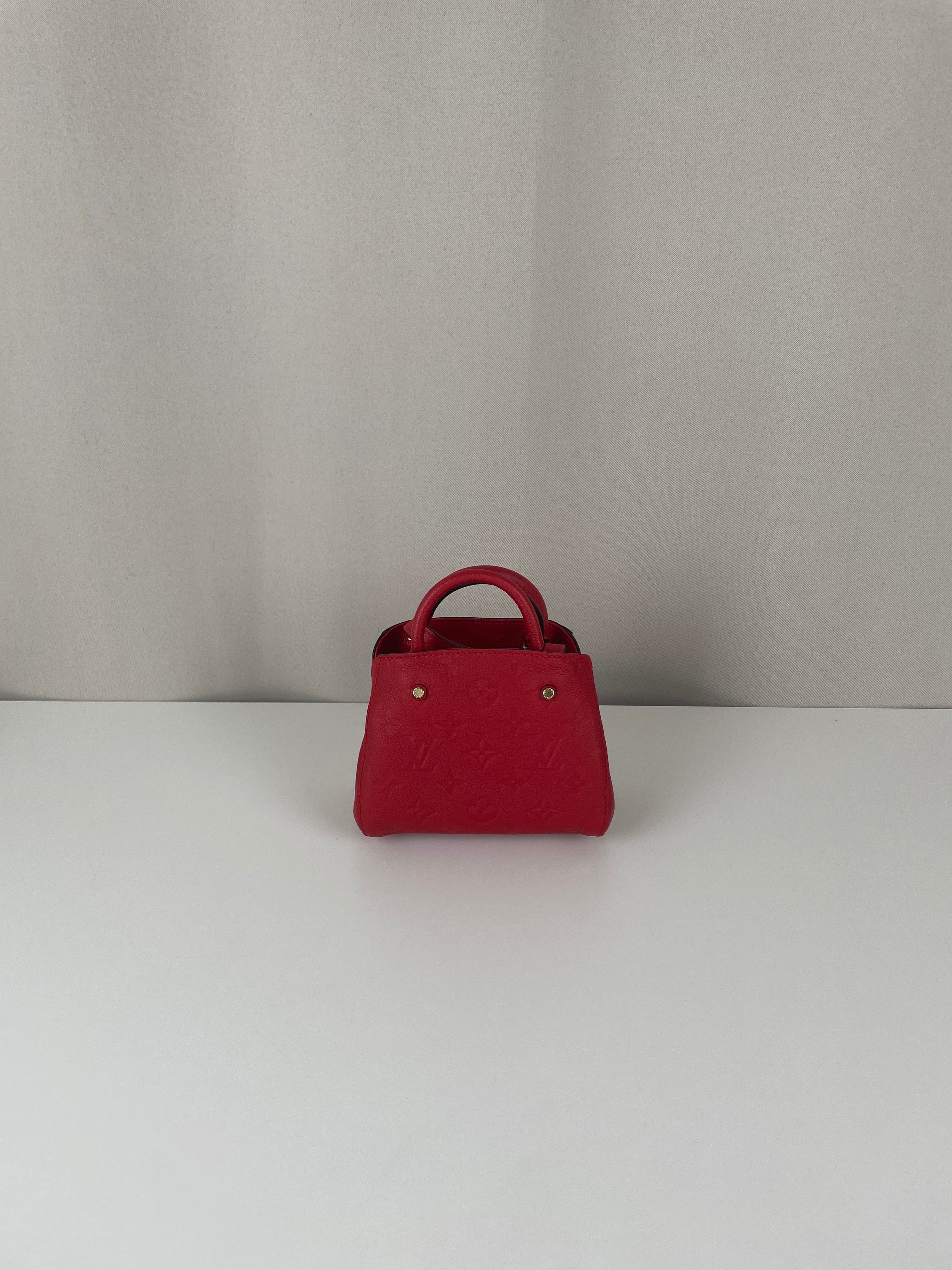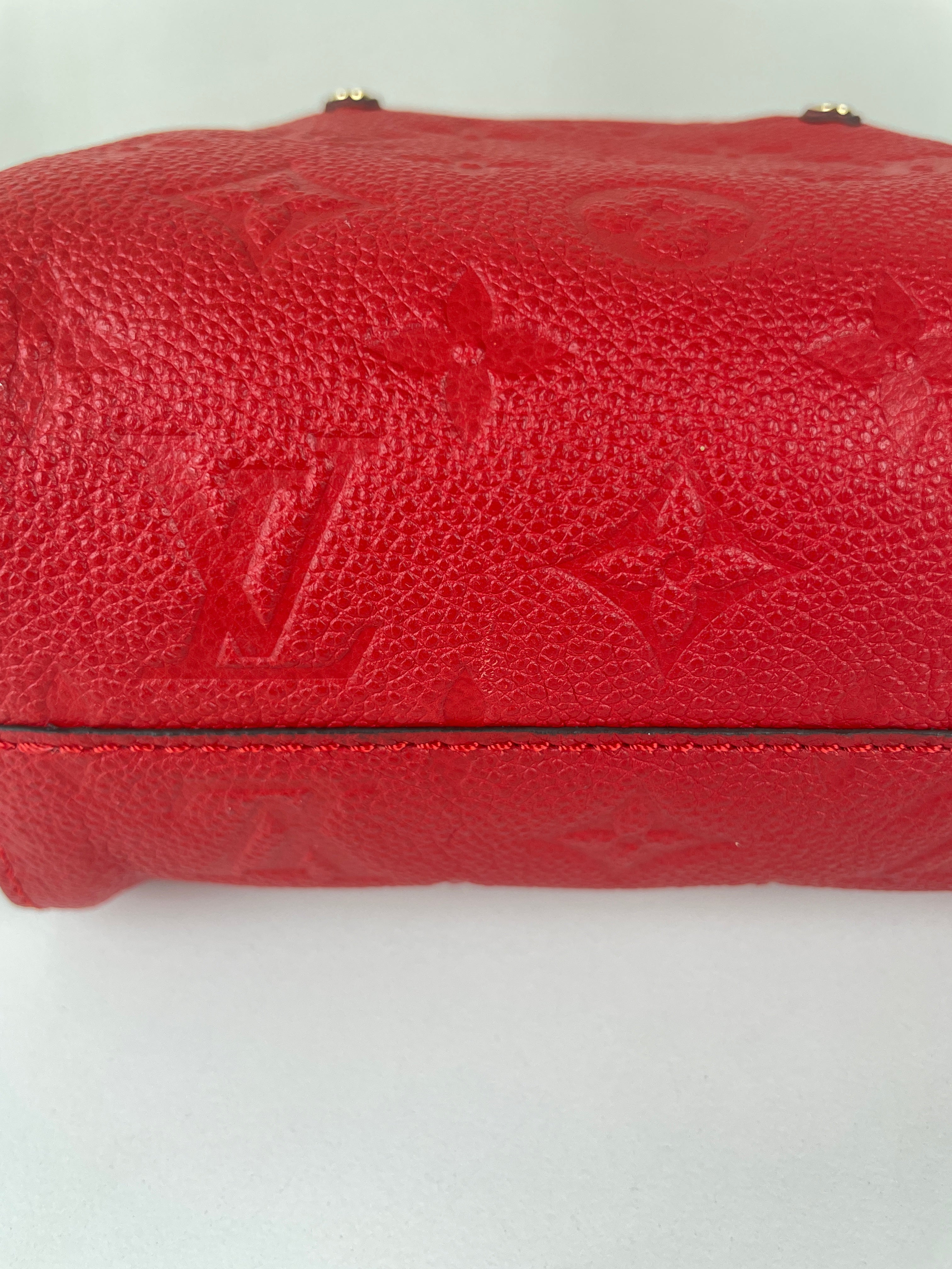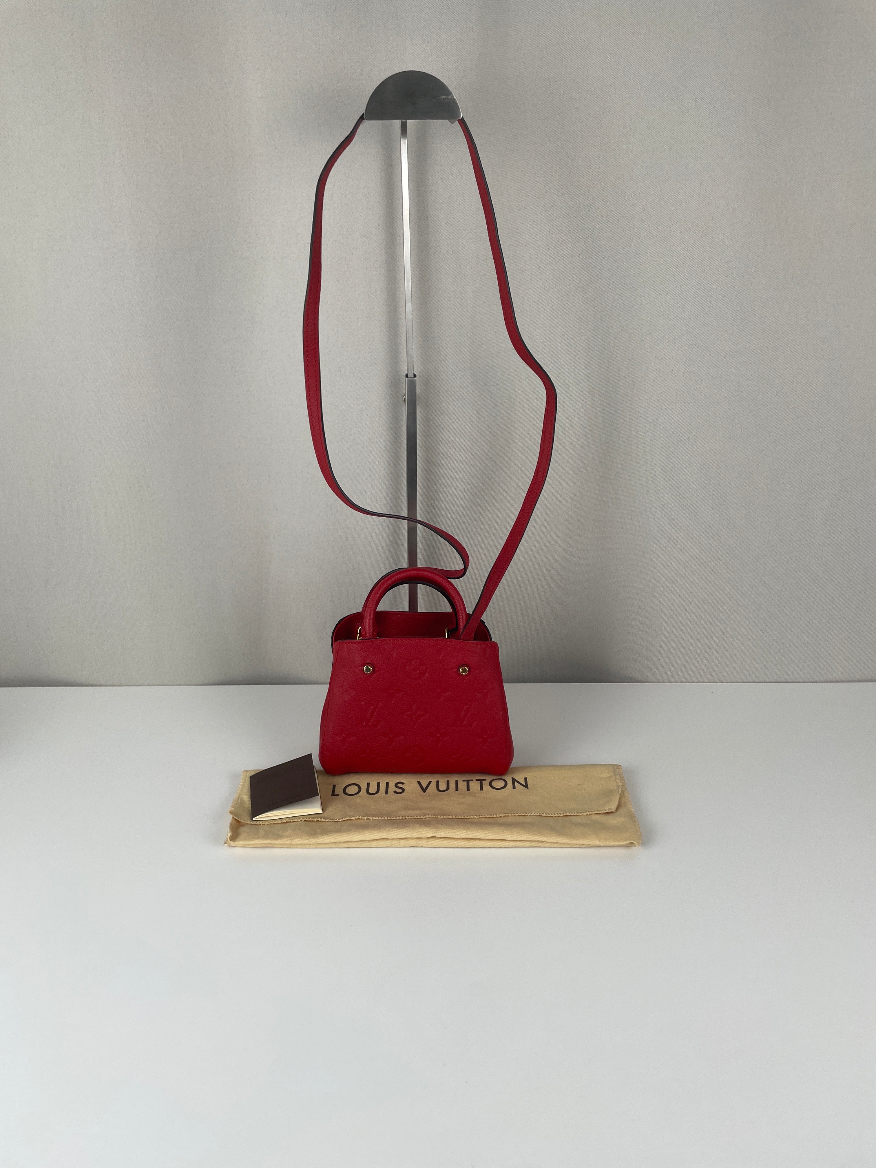 Ce Louis Vuitton Nano Montaigne en cuir Monogram Empreinte rouge est en très bon état. Avec sa forme compacte, sa silhouette structurée et ses élégantes poignées supérieures, c'est le mini sac idéal pour une utilisation quotidienne comme en soirée. Sa longue bandoulière permet un porté croisé facile. Une pièce rare et charmante pour les collectionneurs ou les amateurs de Louis Vuitton aux couleurs vives.