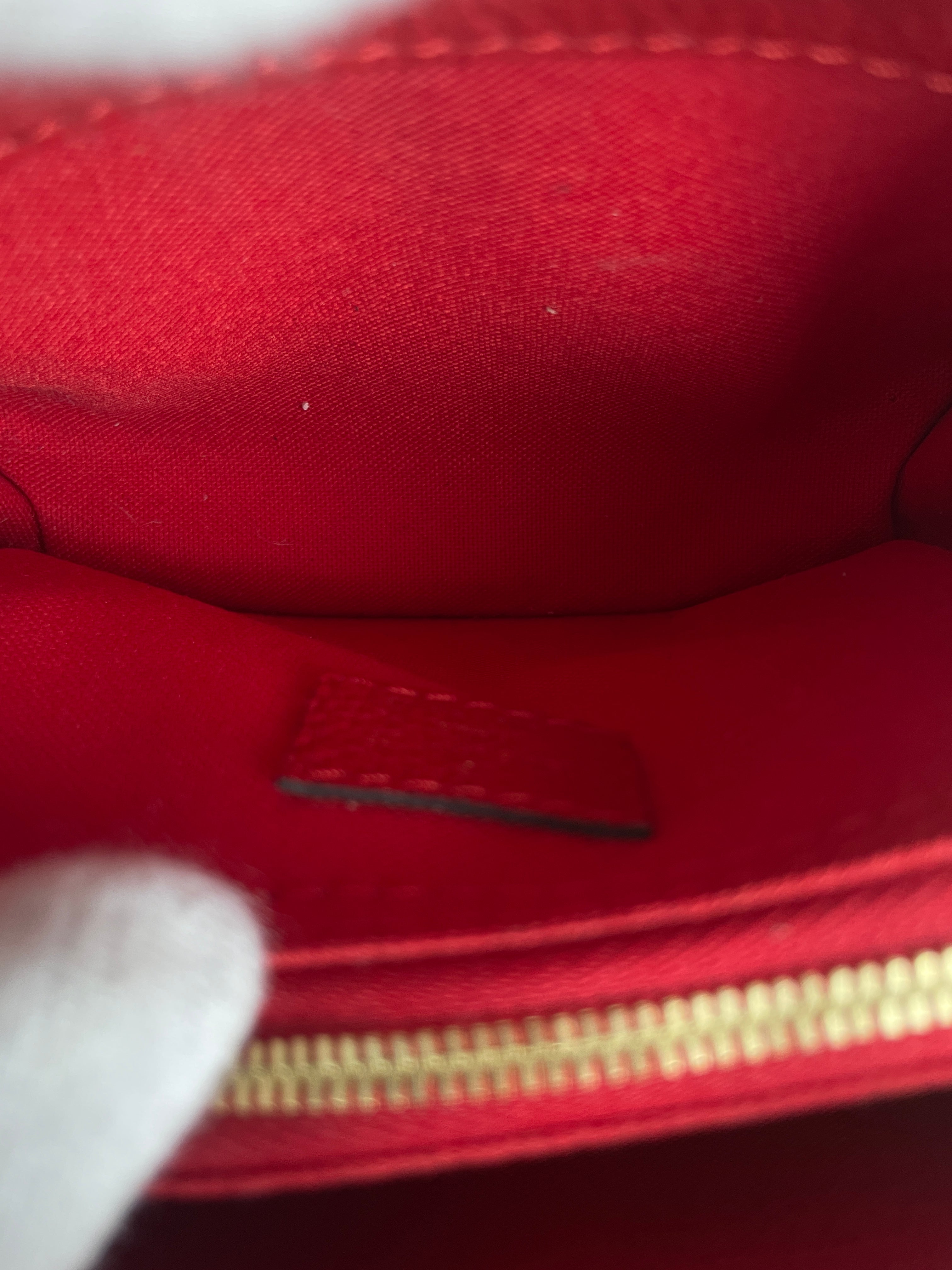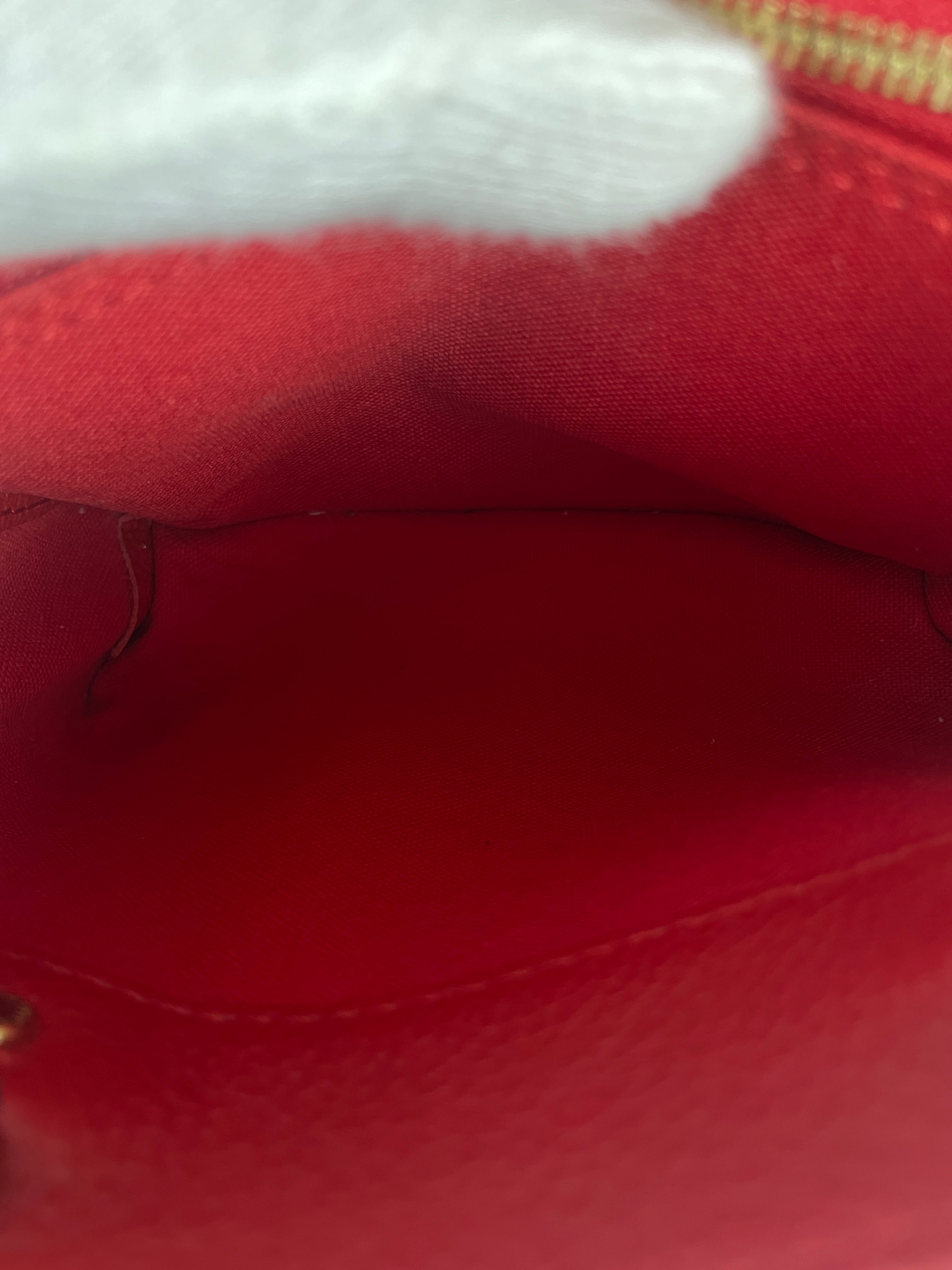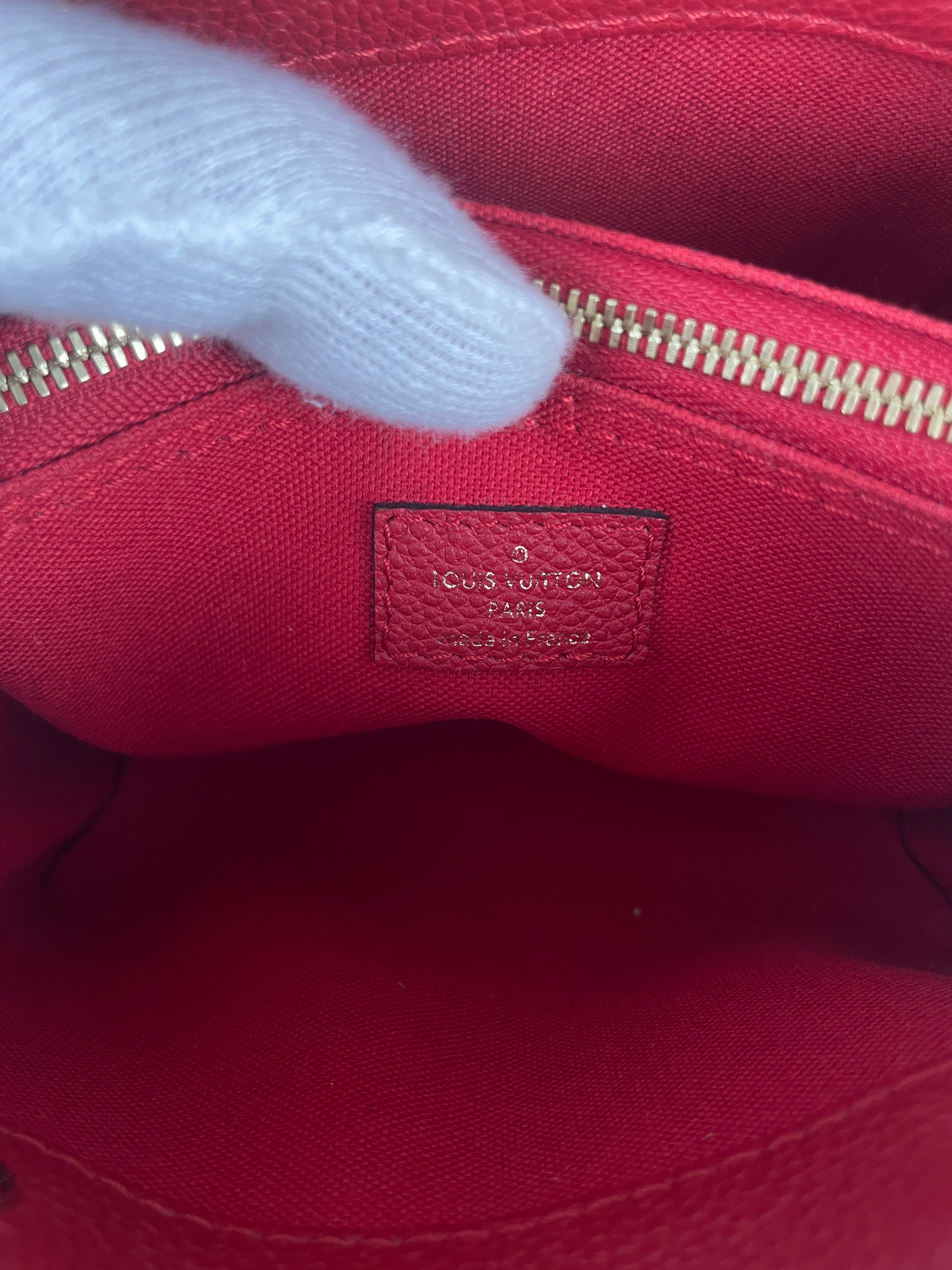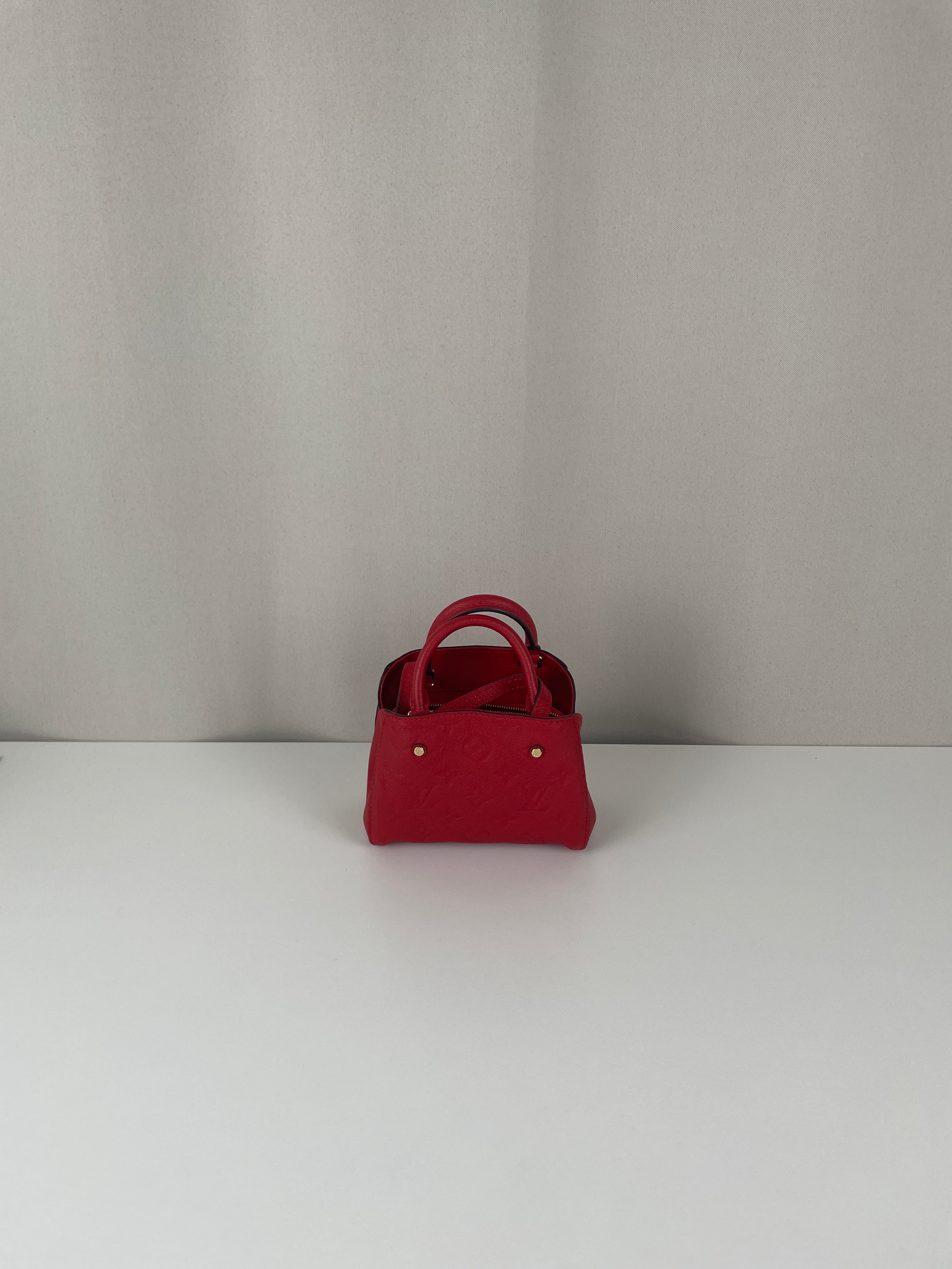 Ce Louis Vuitton Nano Montaigne en cuir Monogram Empreinte rouge est en très bon état. Avec sa forme compacte, sa silhouette structurée et ses élégantes poignées supérieures, c'est le mini sac idéal pour une utilisation quotidienne comme en soirée. Sa longue bandoulière permet un porté croisé facile. Une pièce rare et charmante pour les collectionneurs ou les amateurs de Louis Vuitton aux couleurs vives.