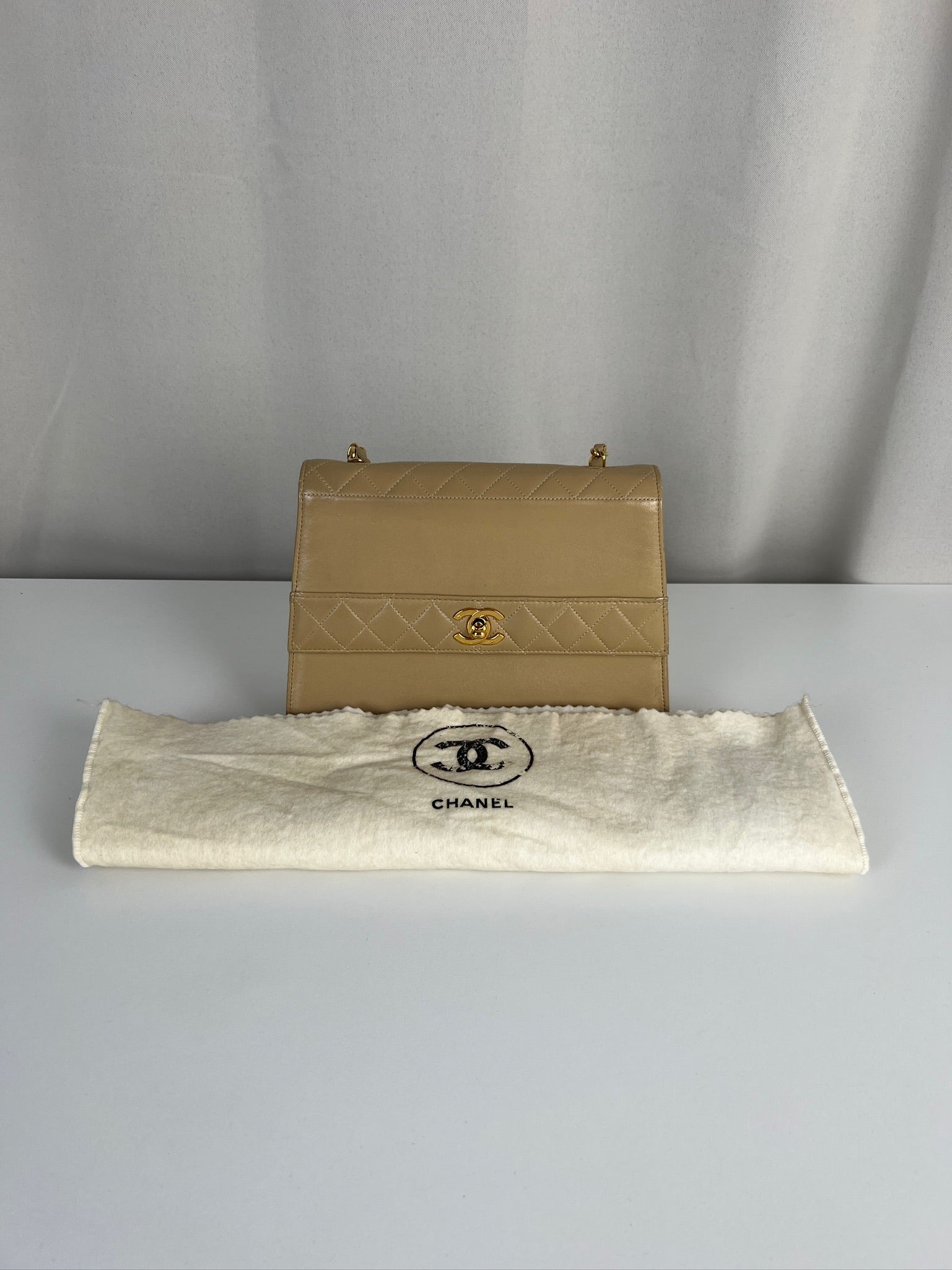 Sac trapèze beige Chanel à rabat simple et bijouterie dorés