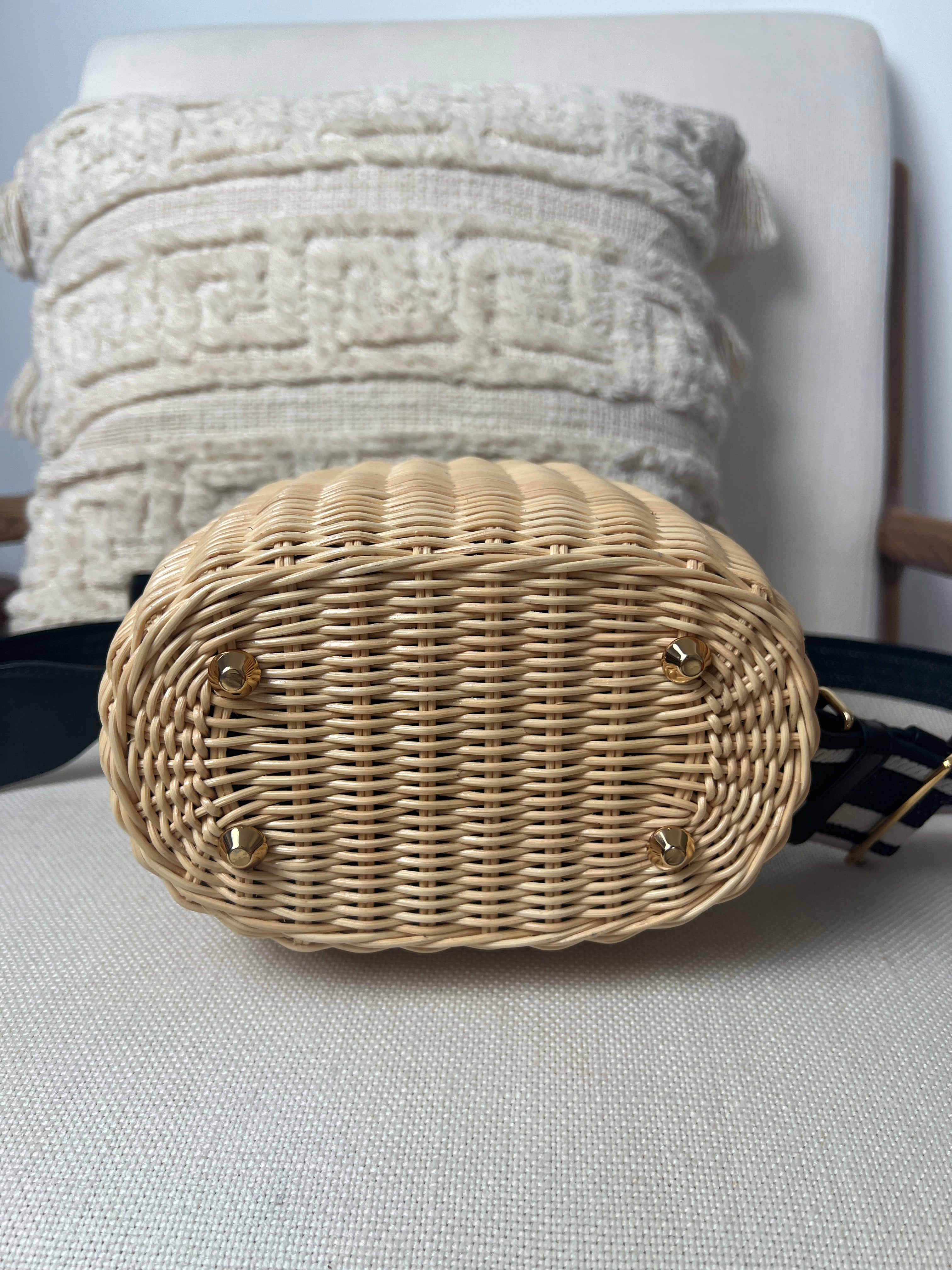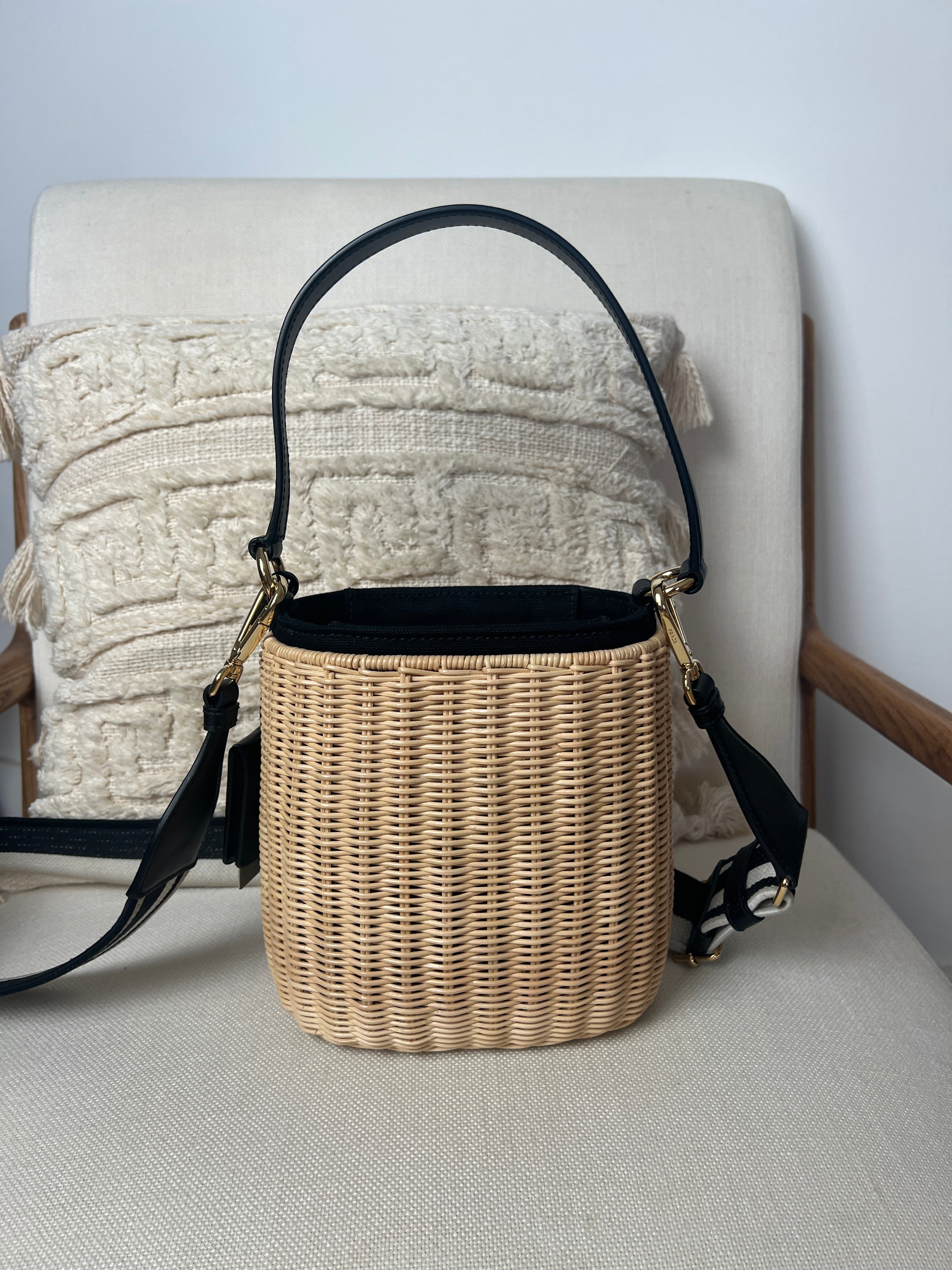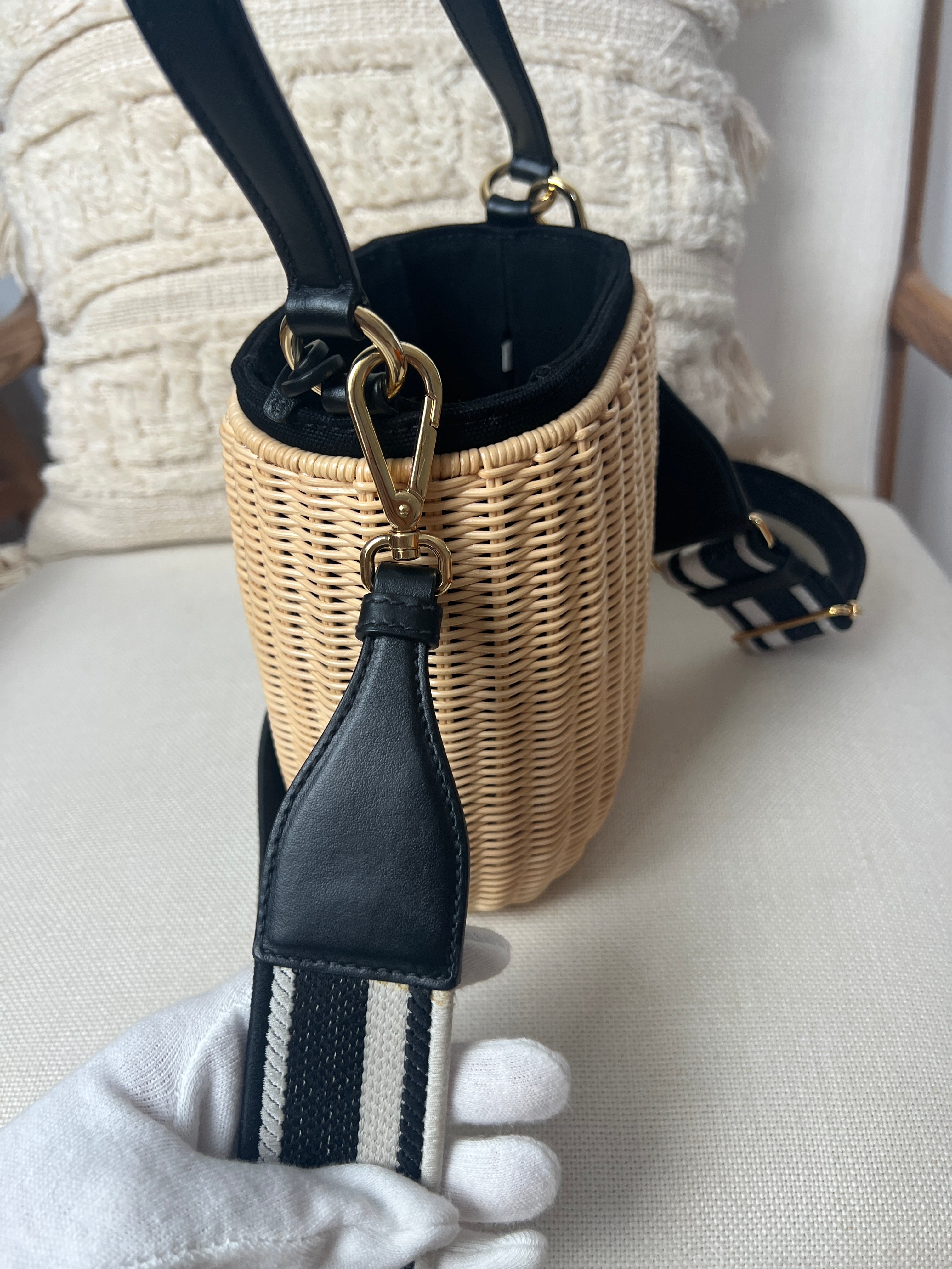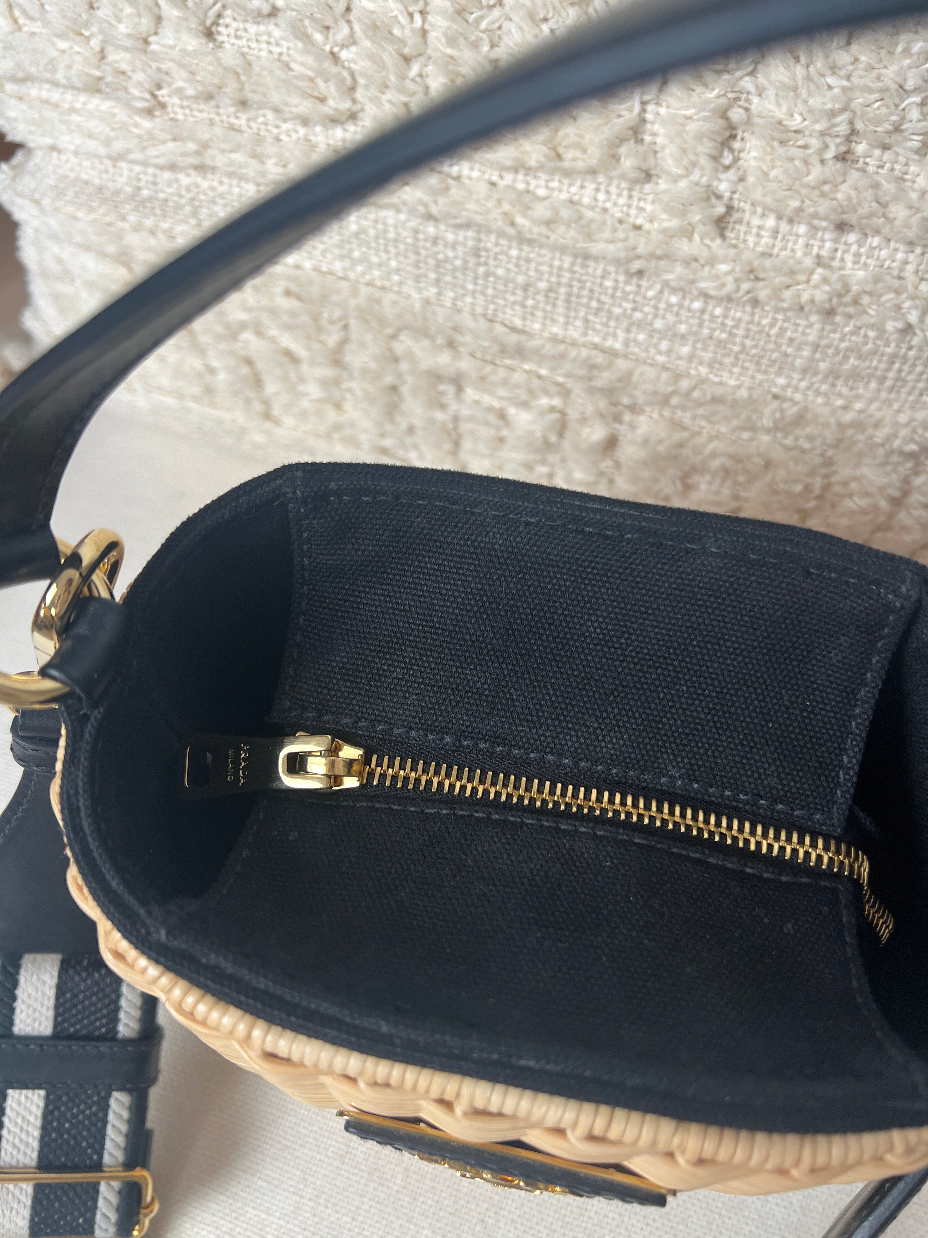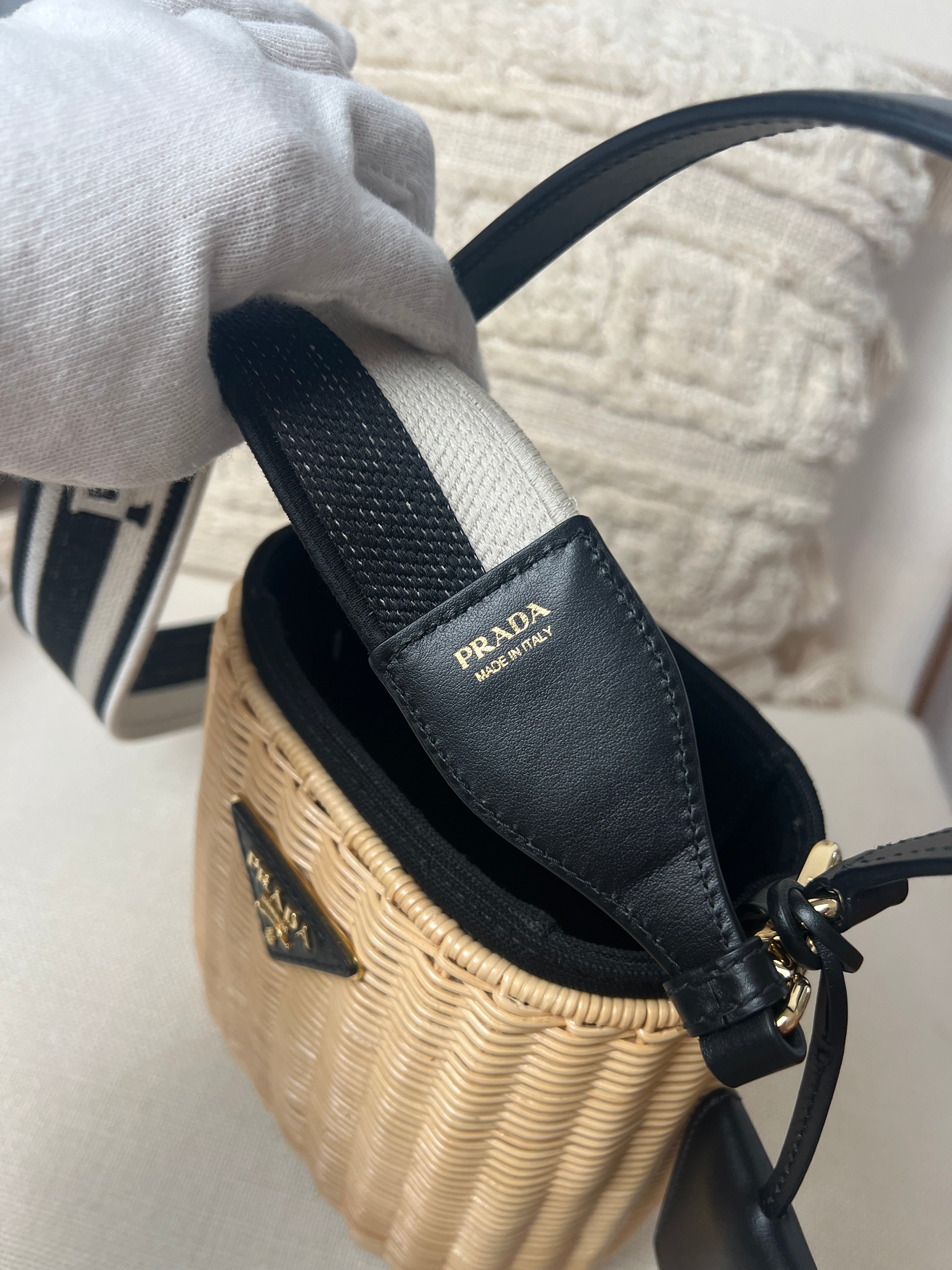 Ce sac Prada Panier est comme neuf. Il possède une bandoulière brodée amovible et est orné du logo. Il est également livré avec un étui en cuir amovible avec miroir. Les parties en cuir sont en parfait état. Les pièces métalliques sont également en parfait état. L'intérieur est super. Vous avez les papiers et le dustbag. L'osier présente une certaine décoloration naturelle mais presque rien.