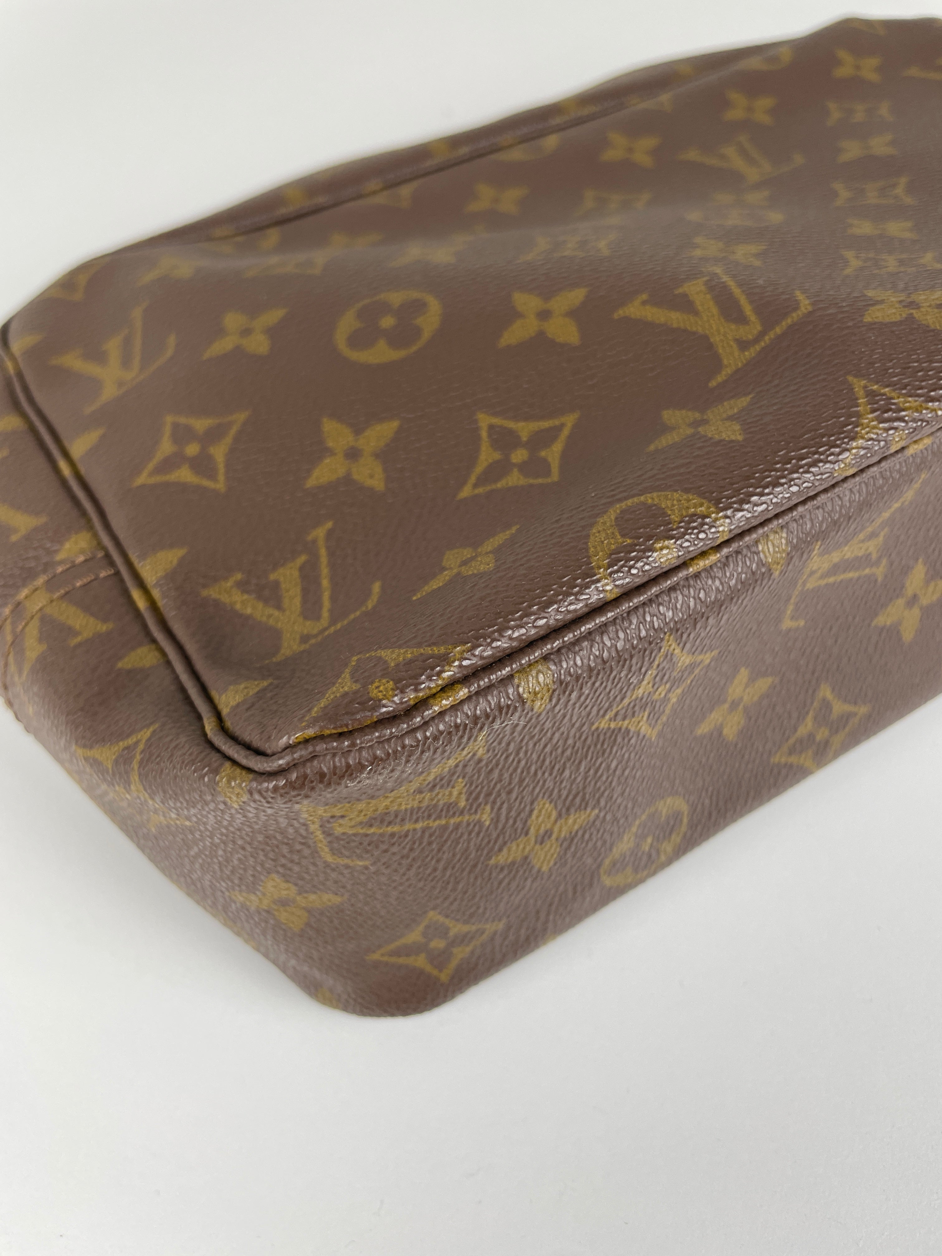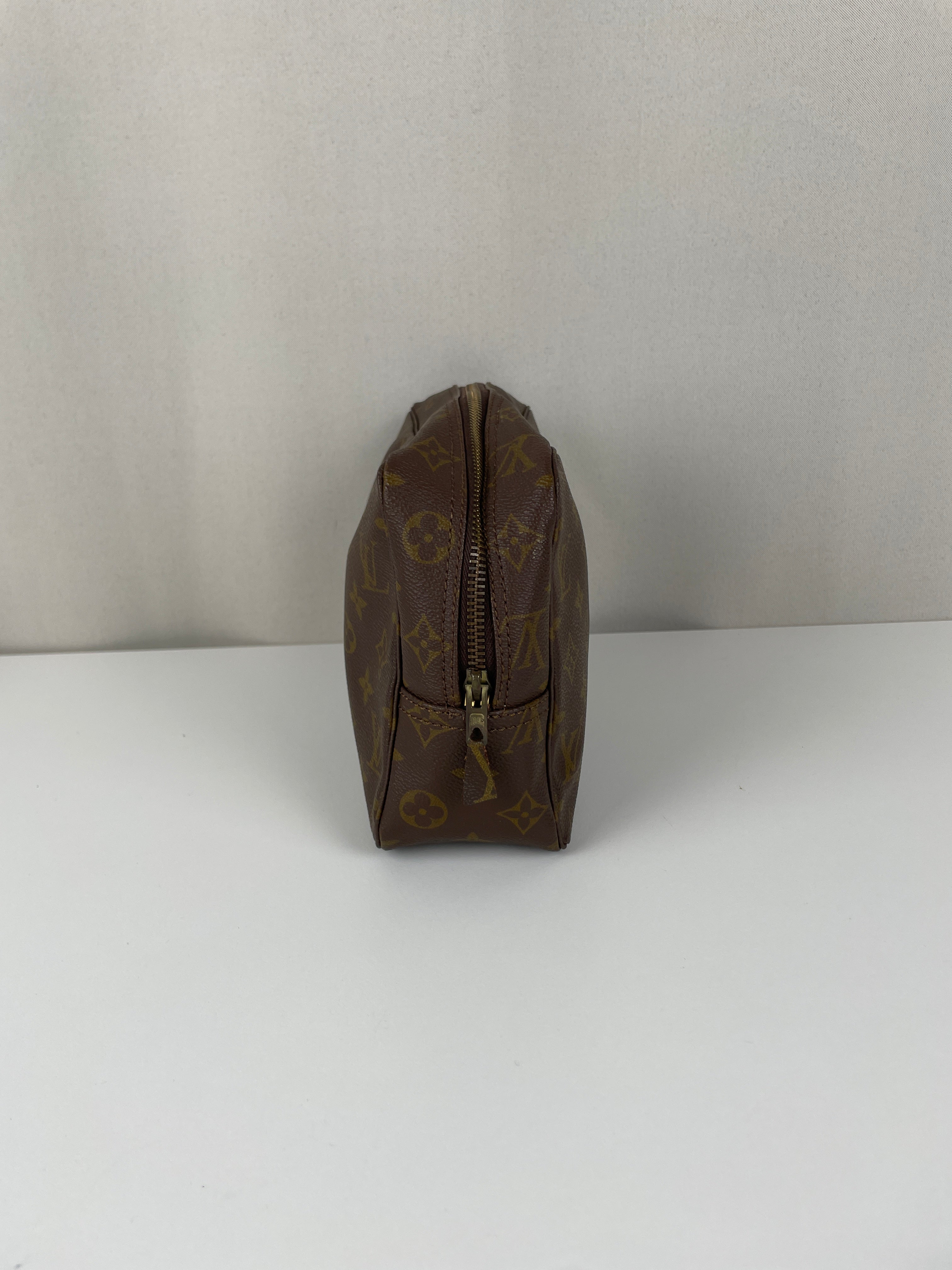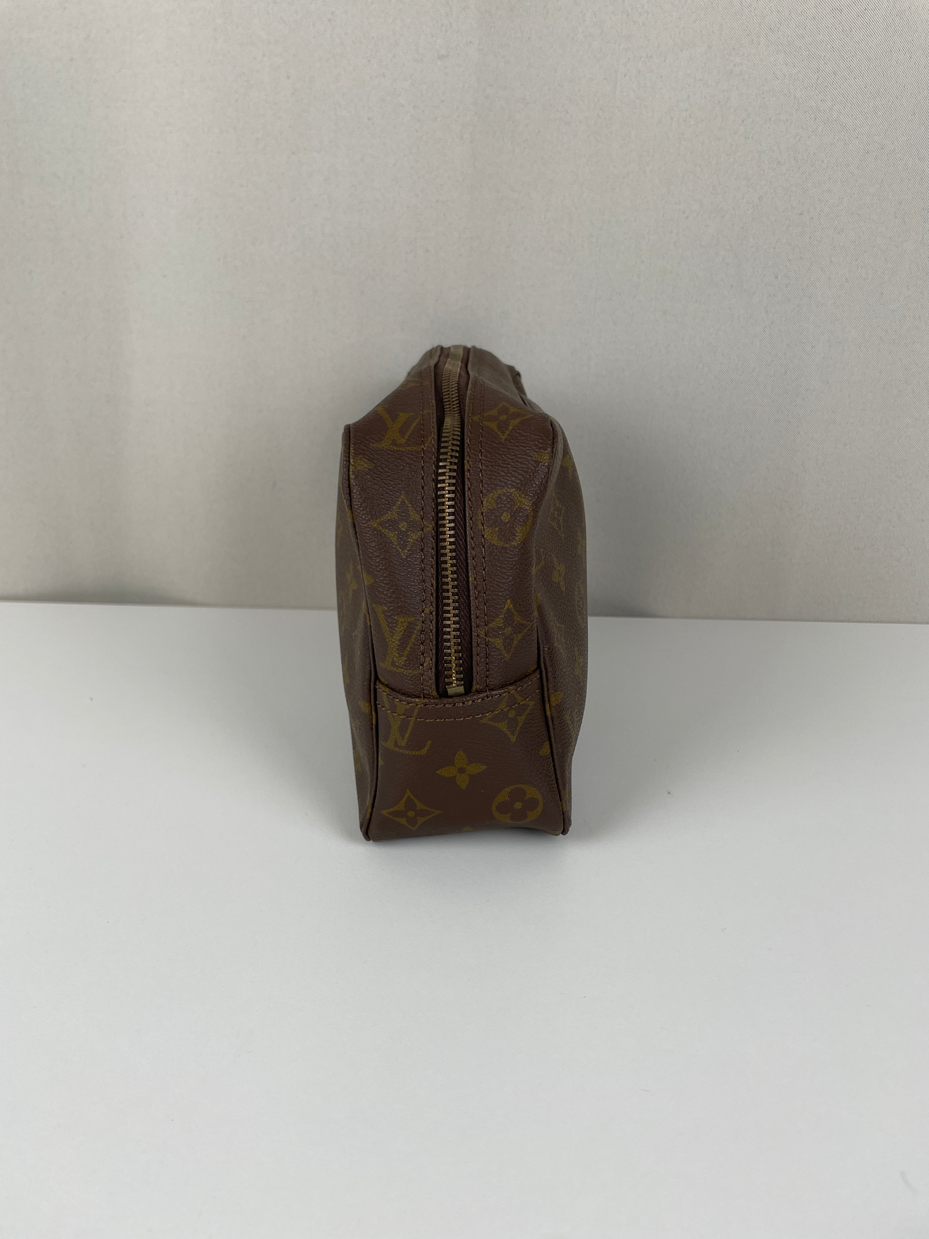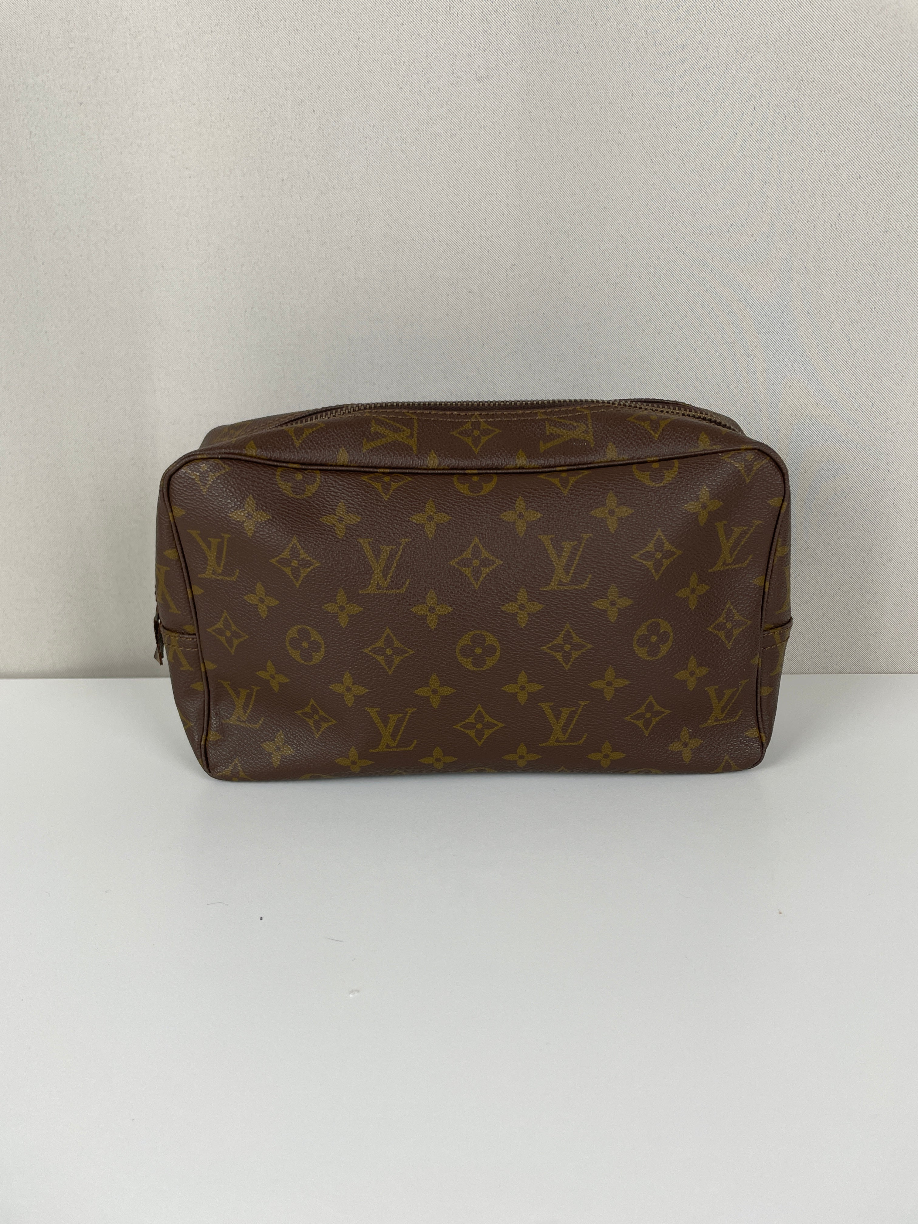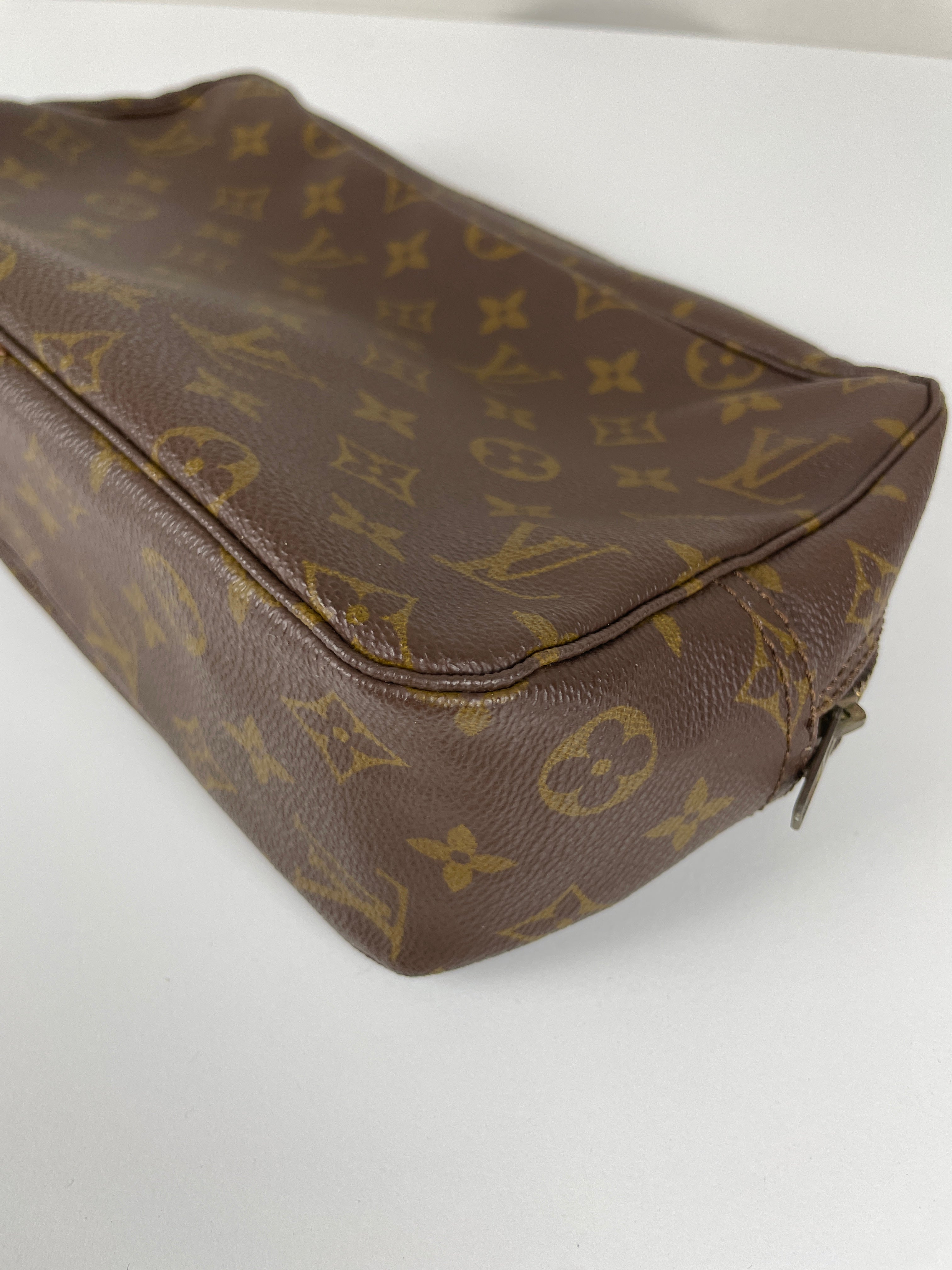 Cette trousse de toilette Louis Vuitton Monogram est en très bon état. L'intérieur est en très bon état avec quelques endroits noircis. La toile est en bon état. La fermeture éclair est frottée suite à une utilisation normale.